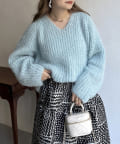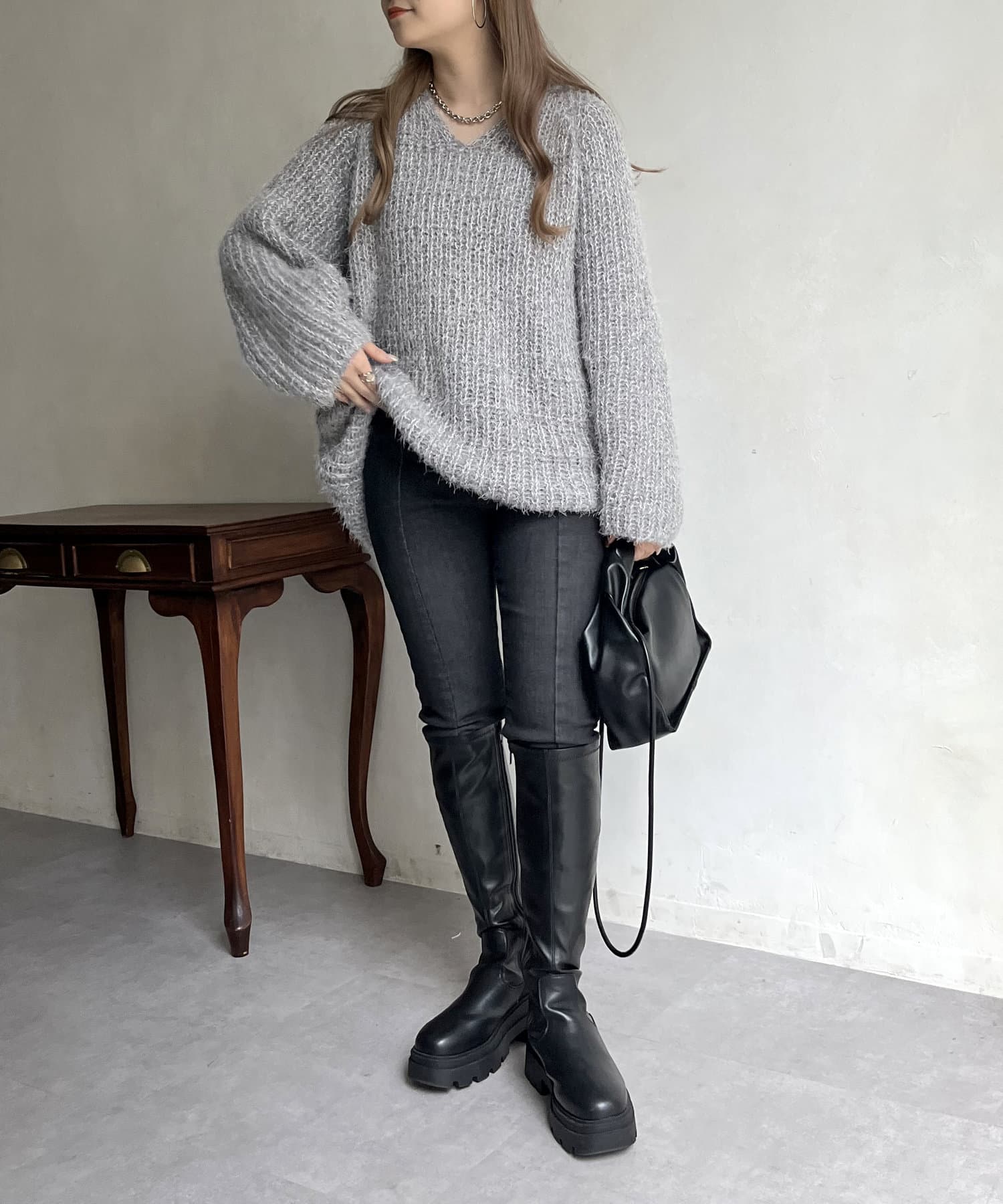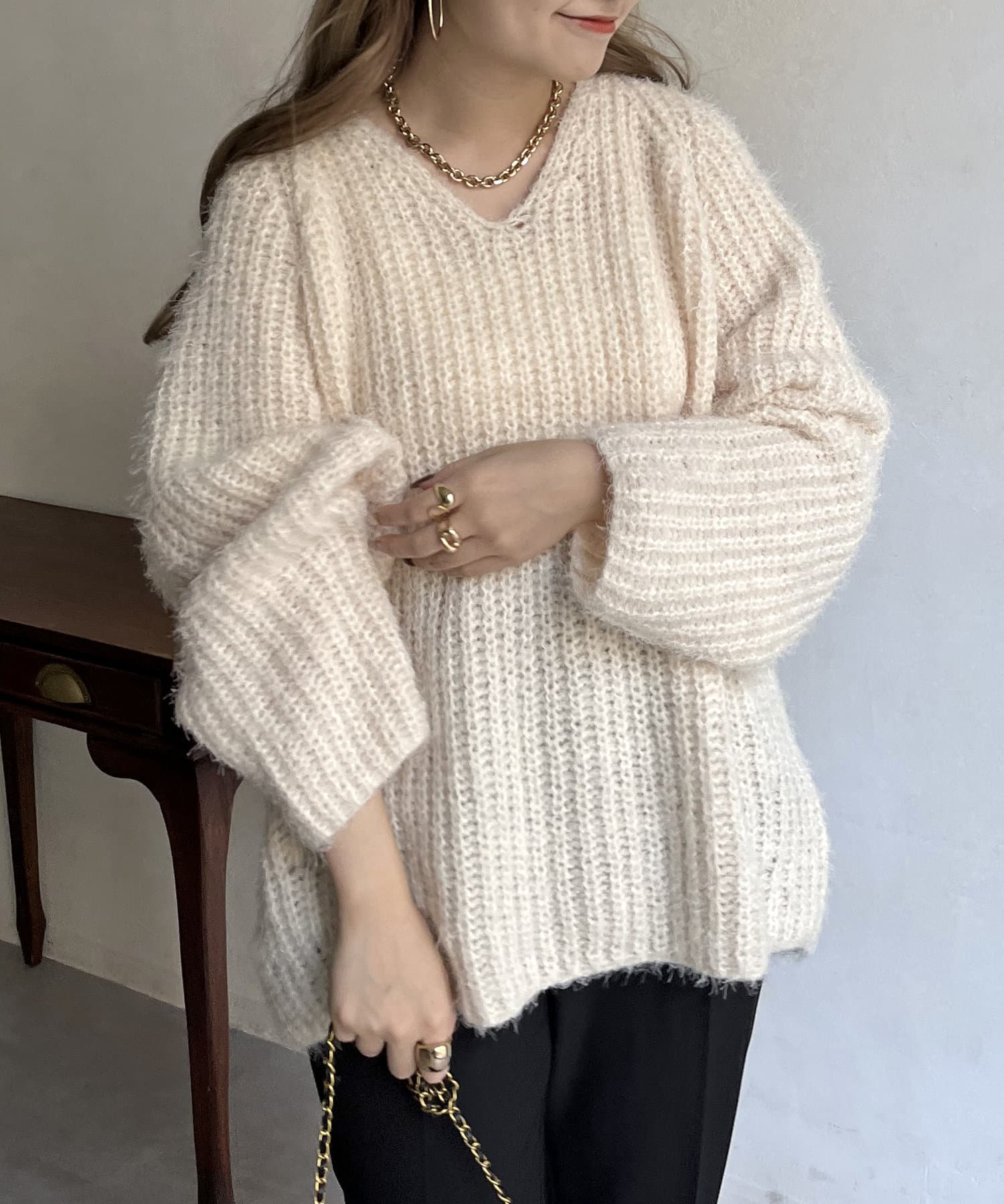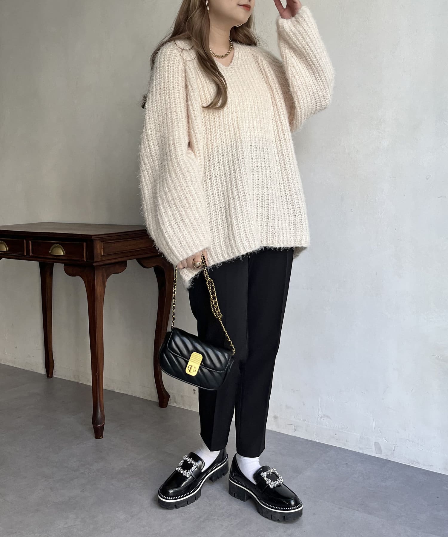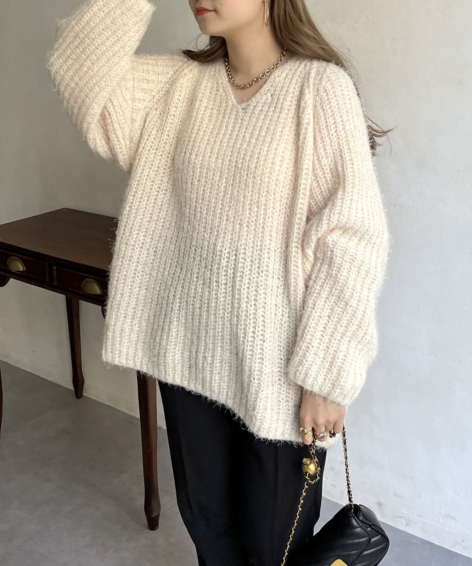 Vネック×フェザーで優しい大人な印象に見せてくれるニット
