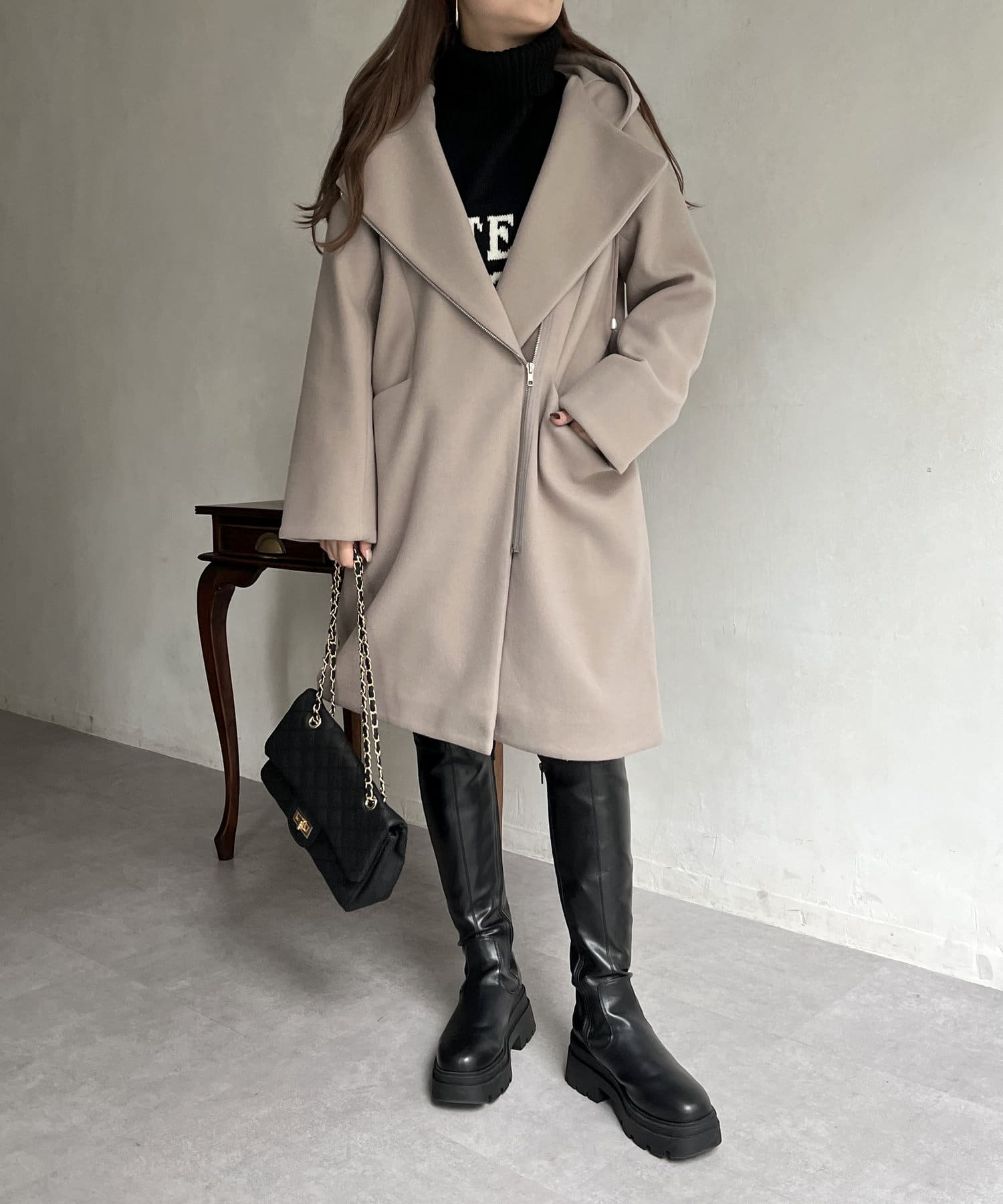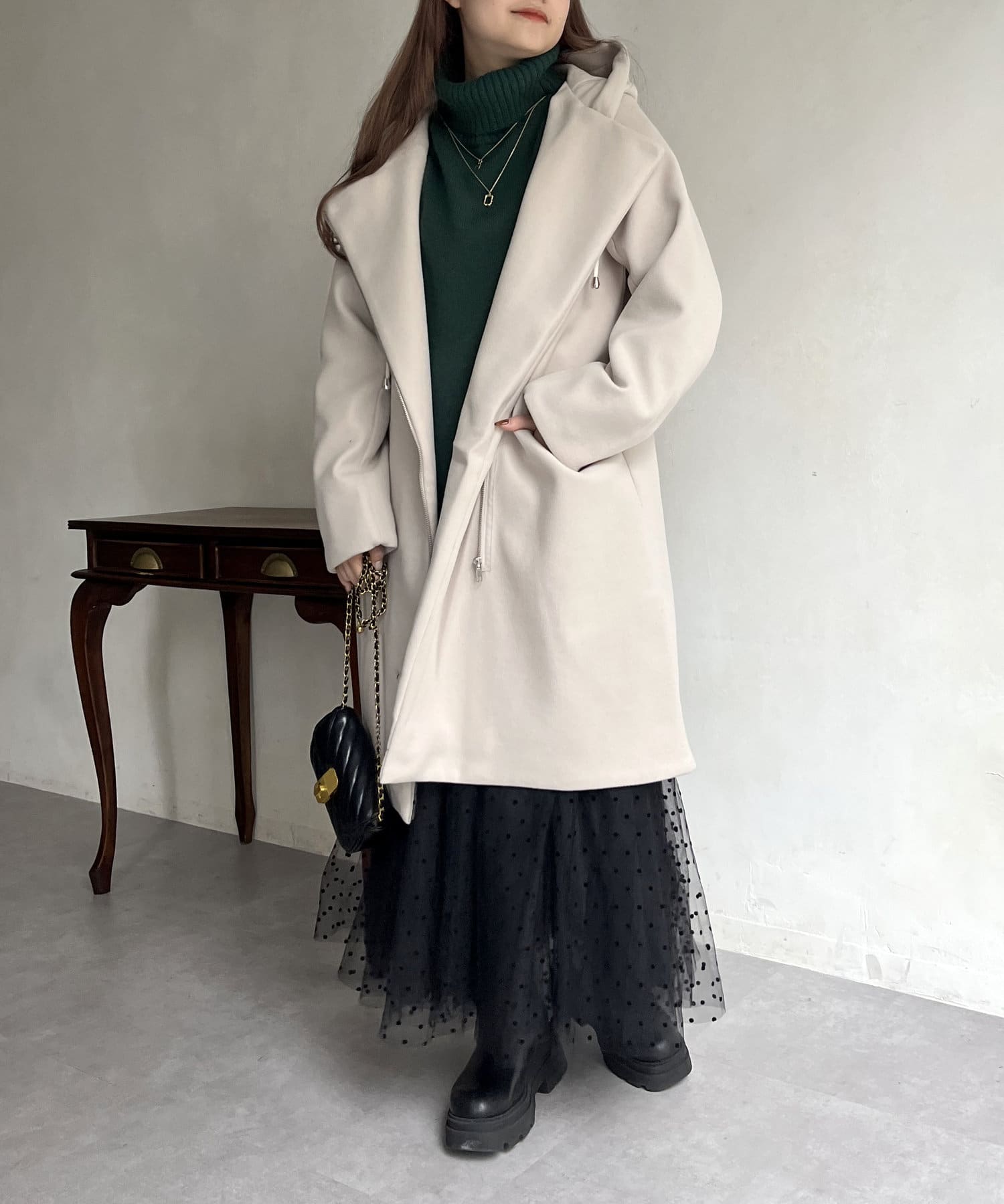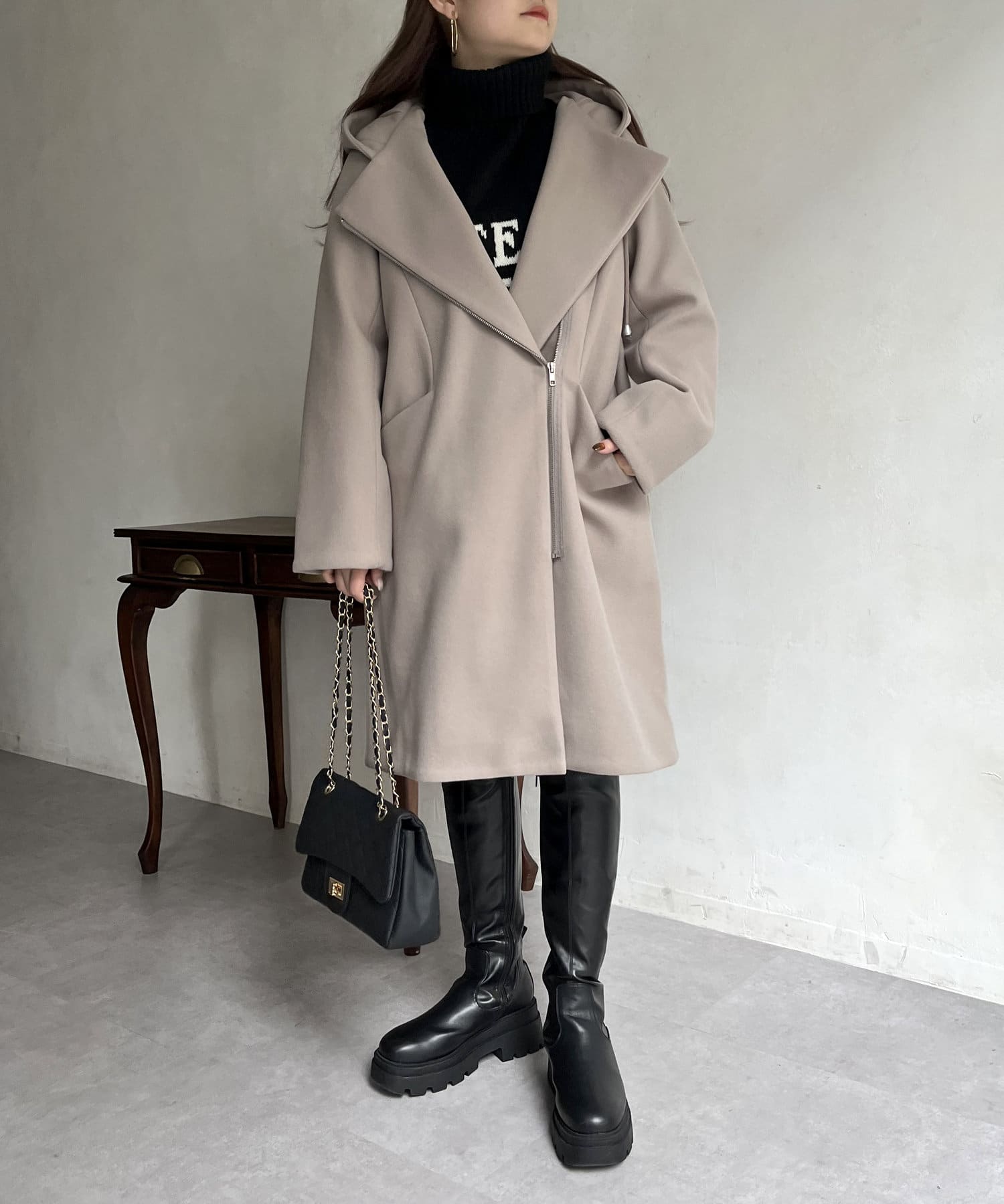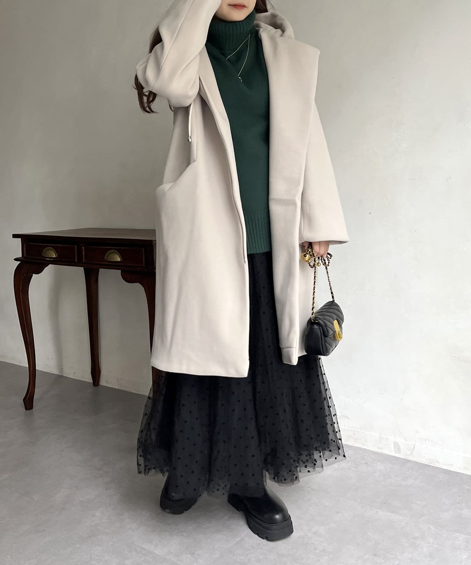 大人キレイめカジュアルな印象に見せてくれるフード付きZIPコート