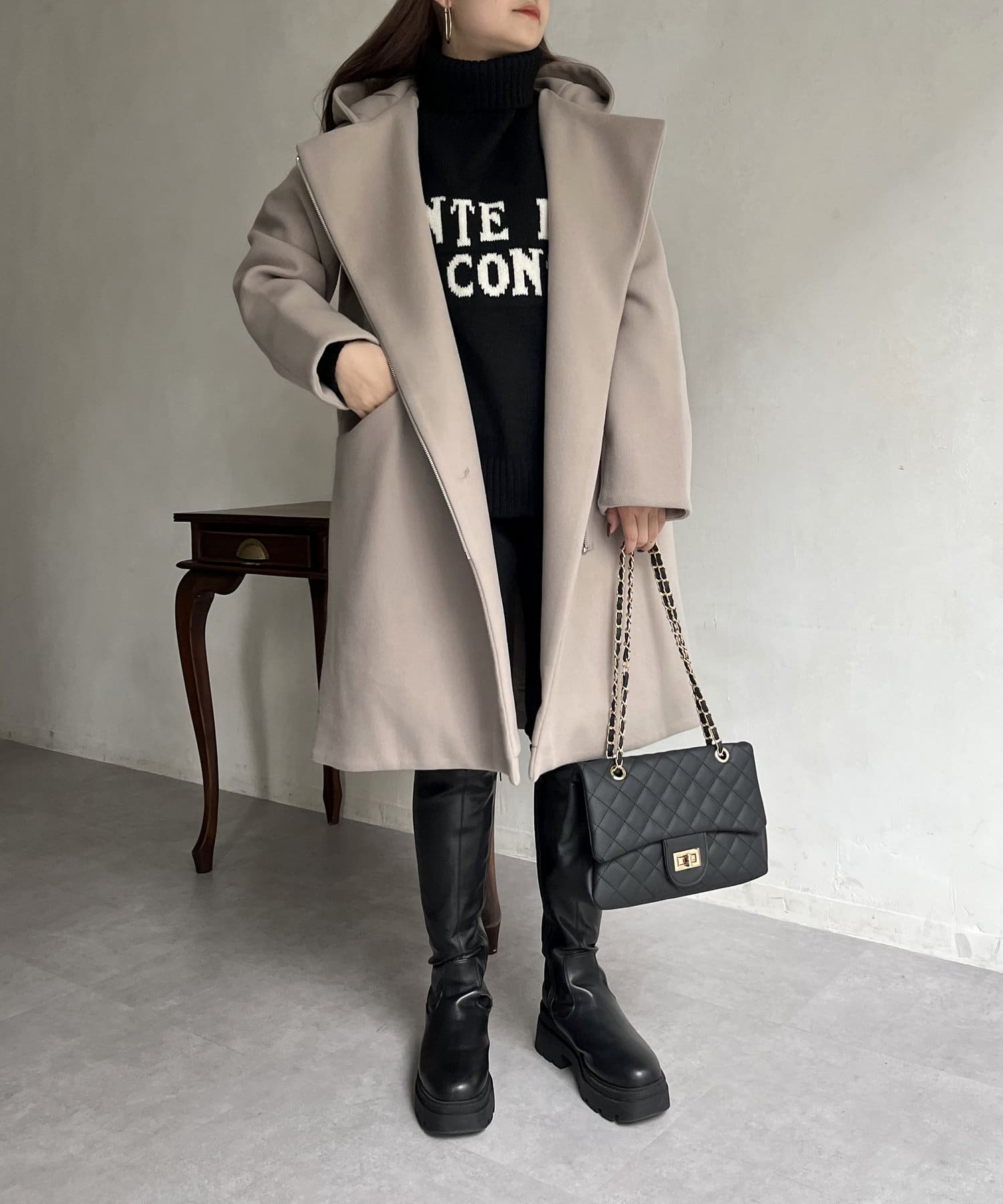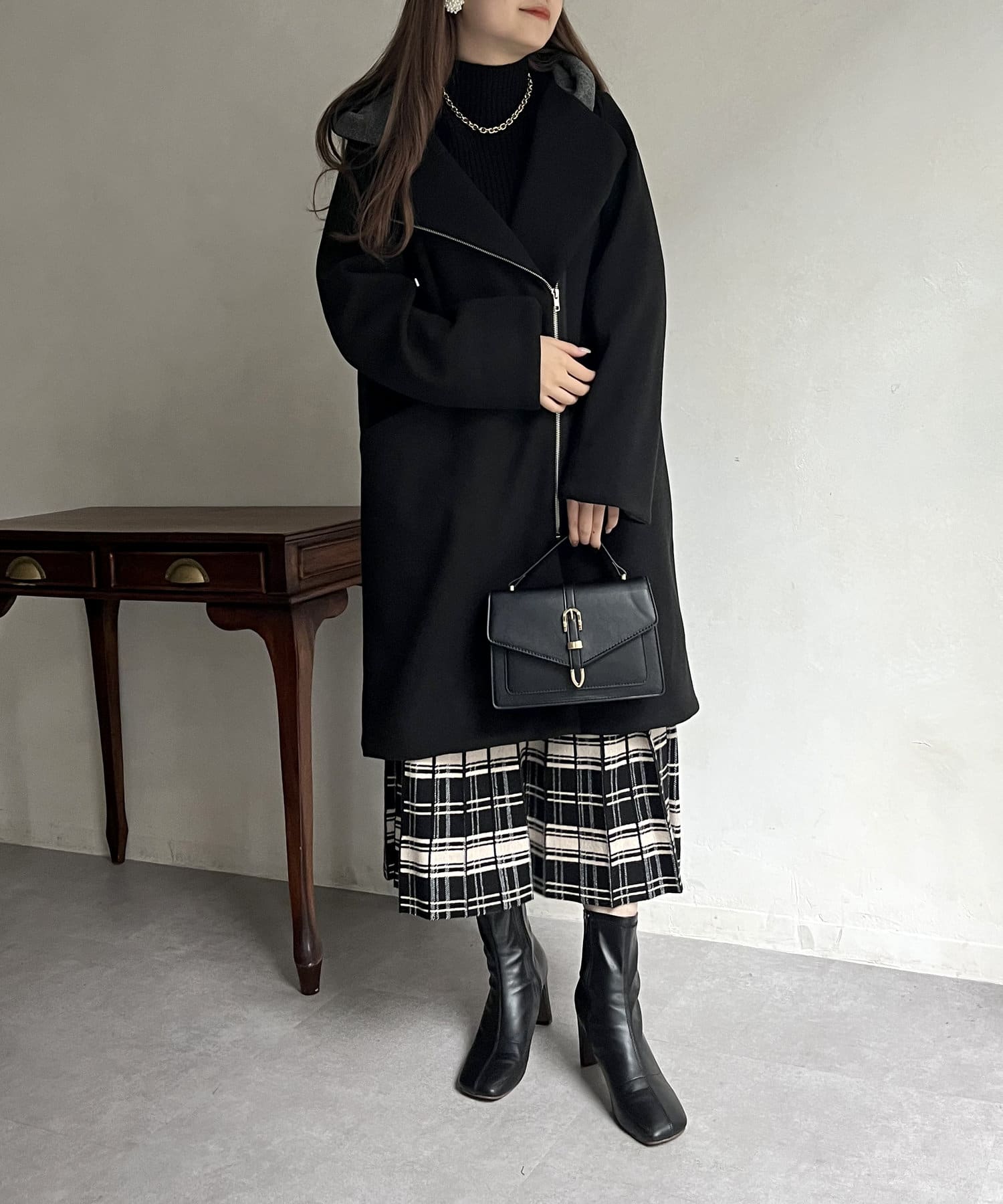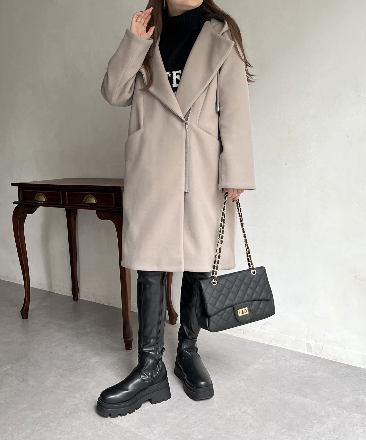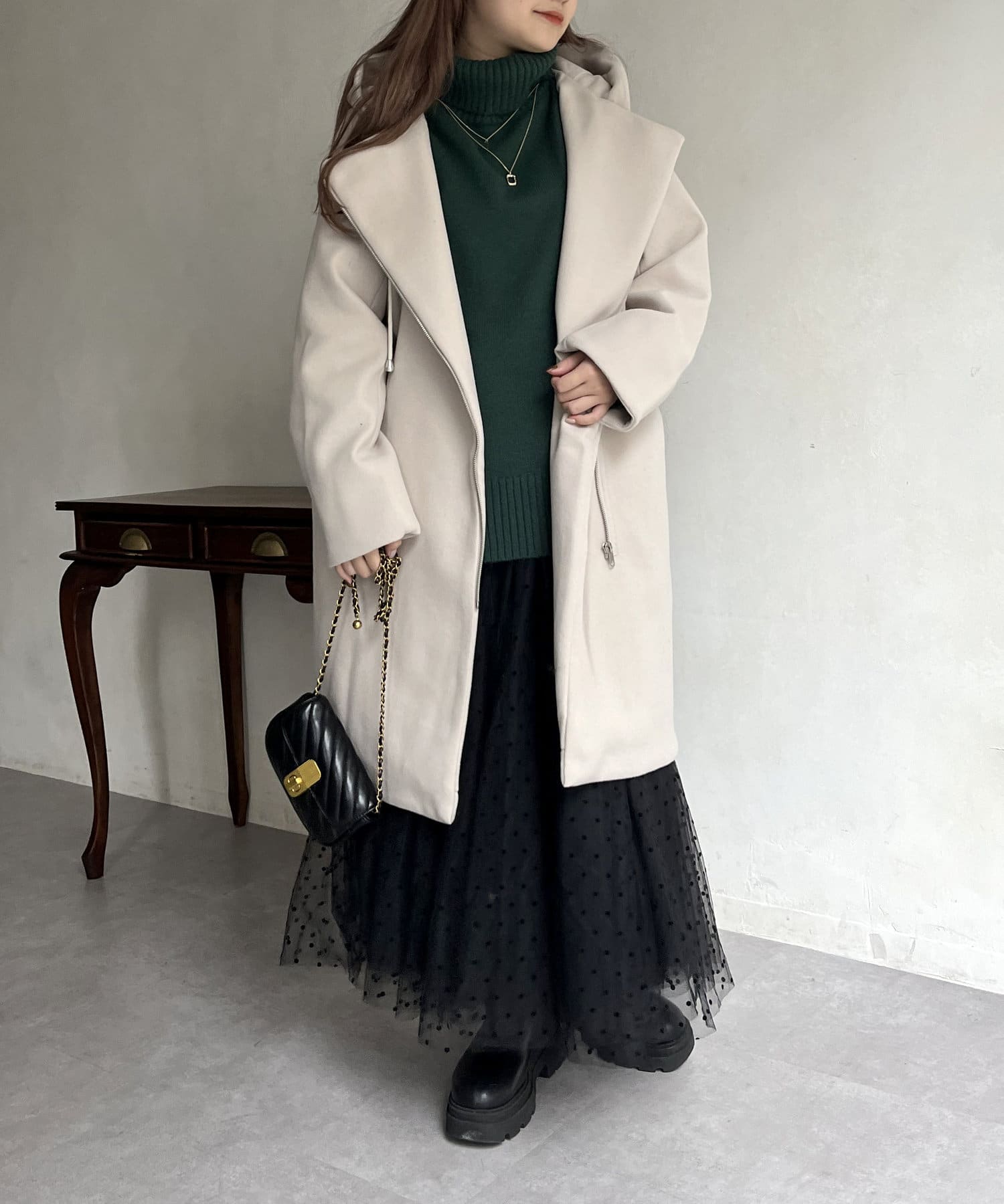 大人キレイめカジュアルな印象に見せてくれるフード付きZIPコート