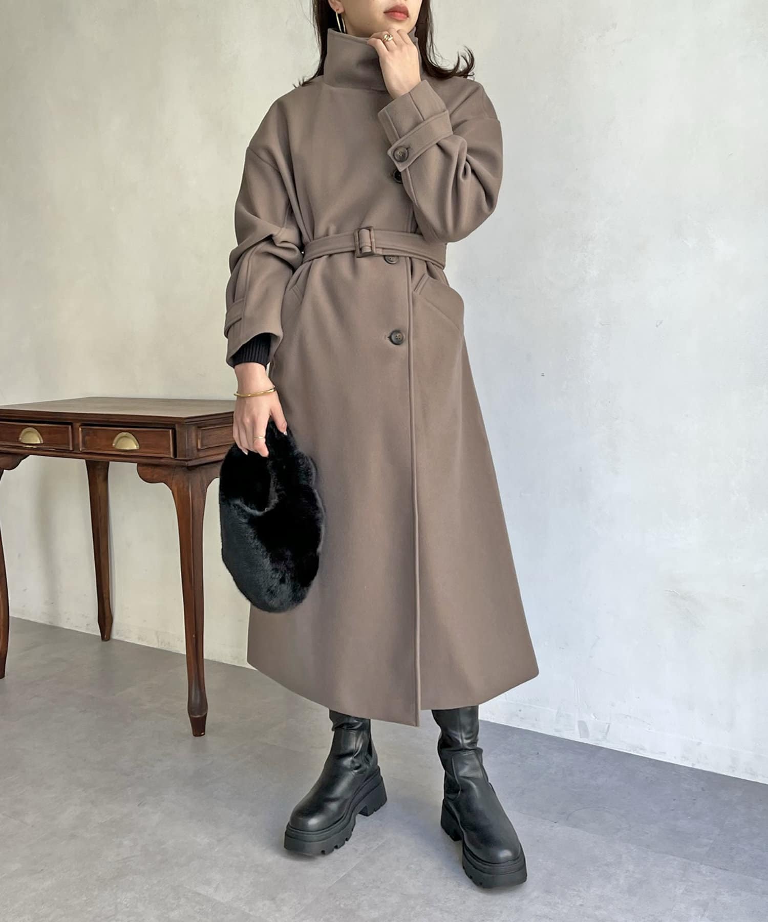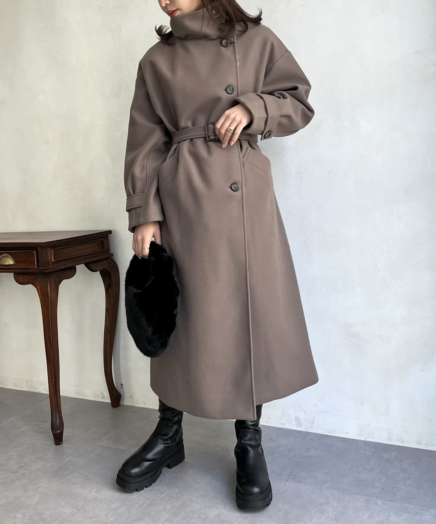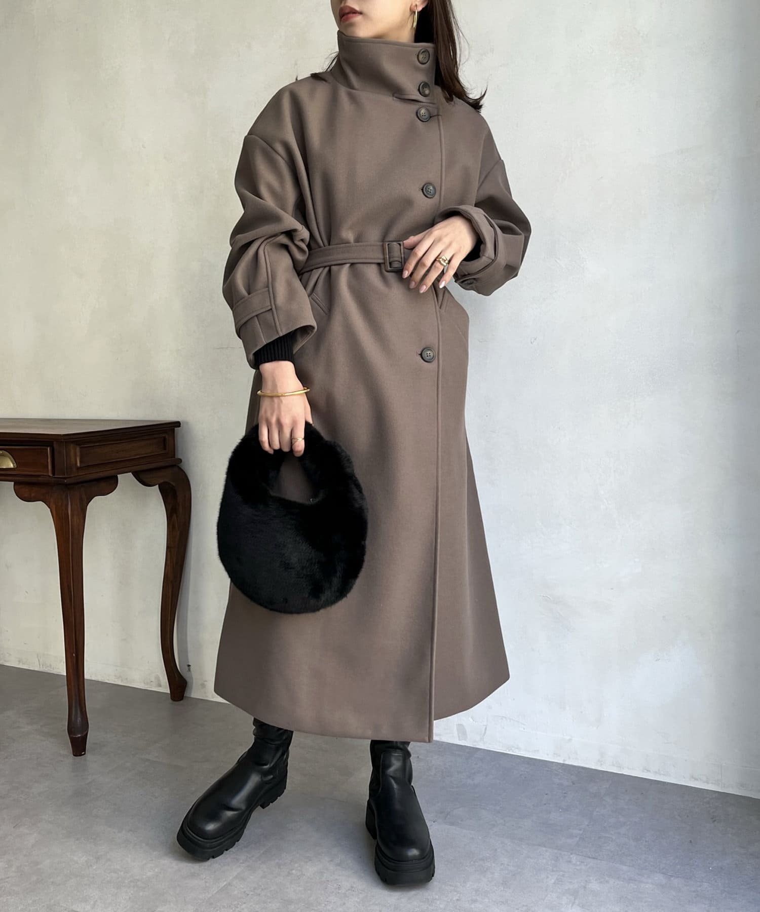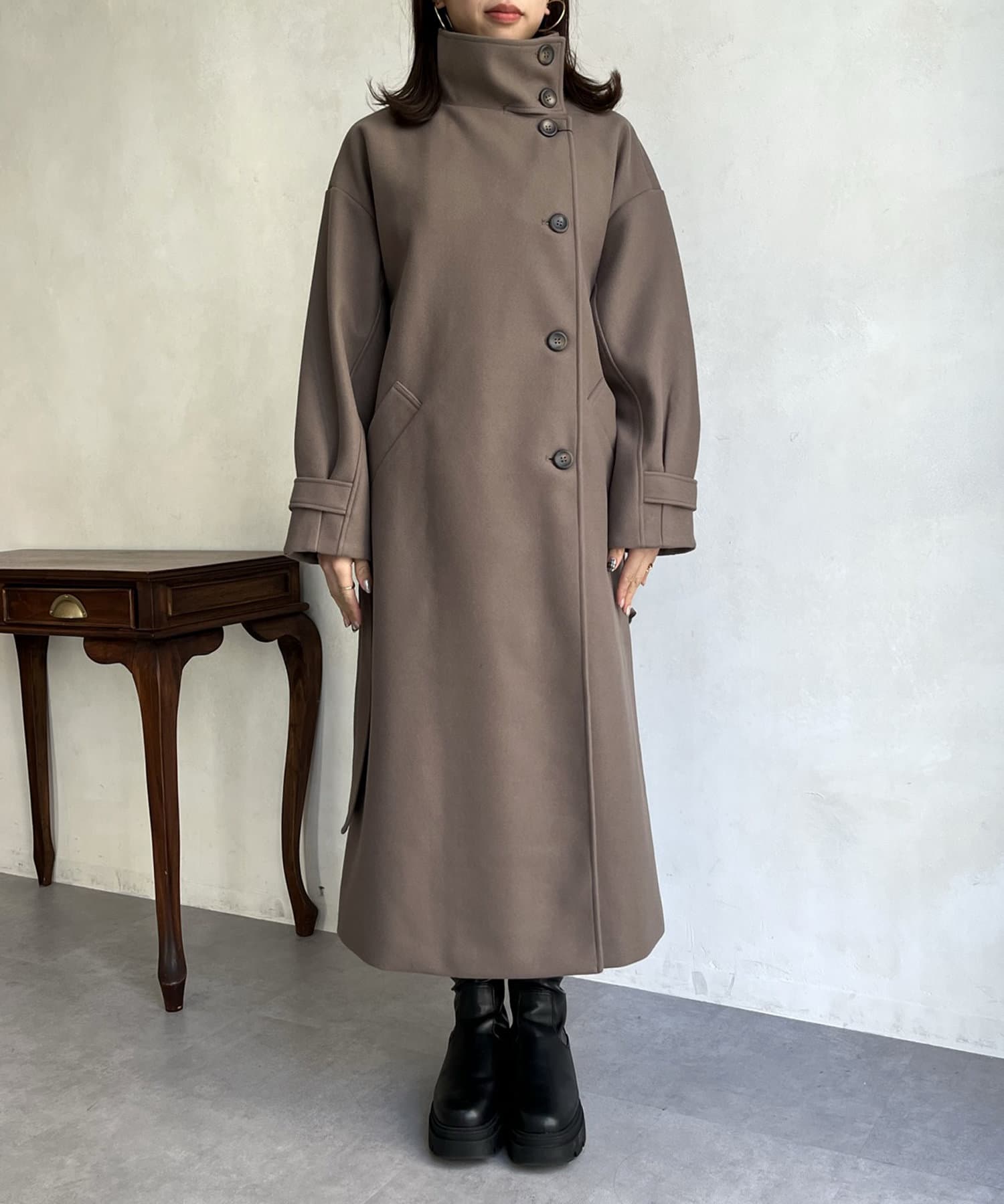 一枚で色んな着こなしができるスタンドカラーロングコート