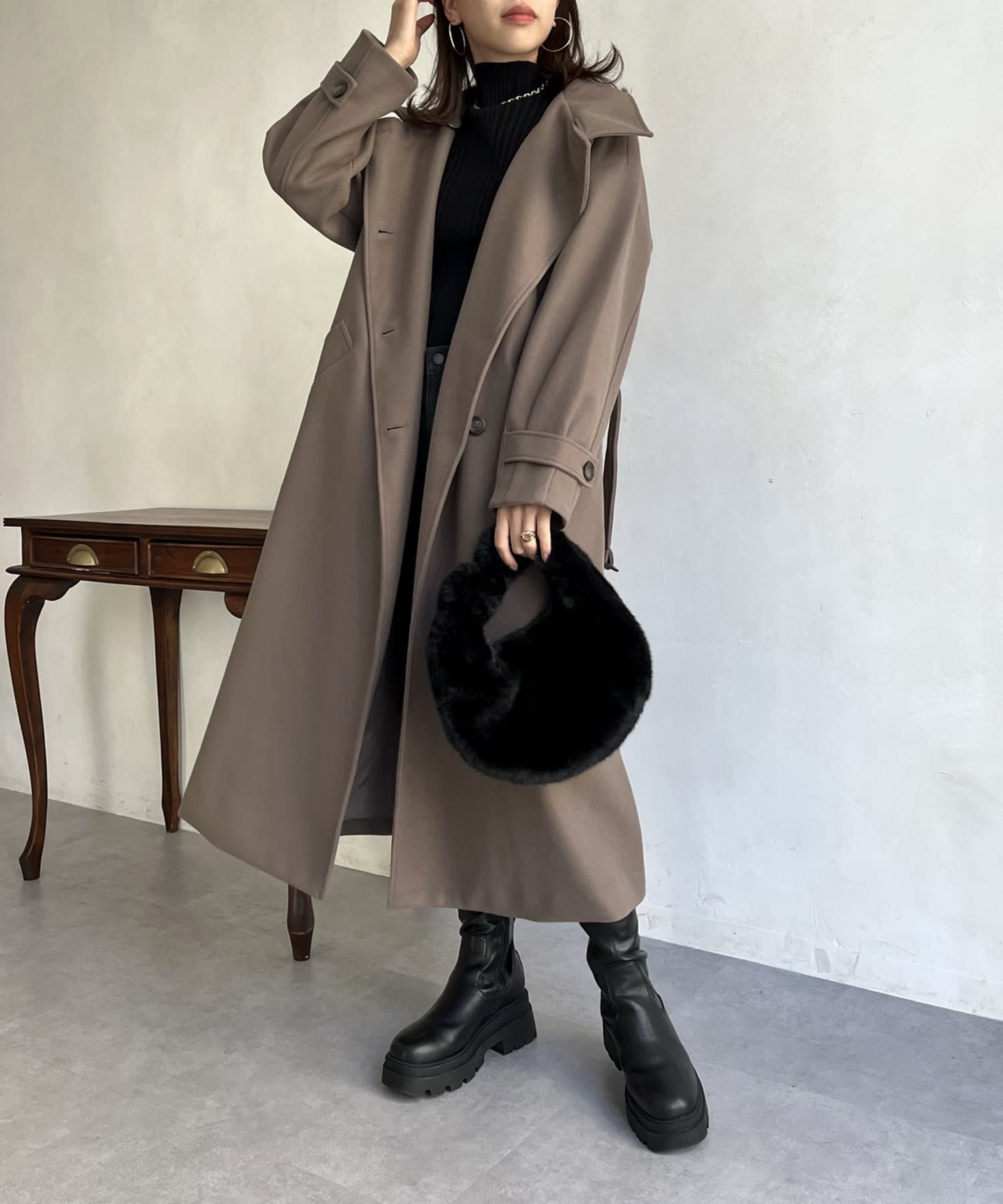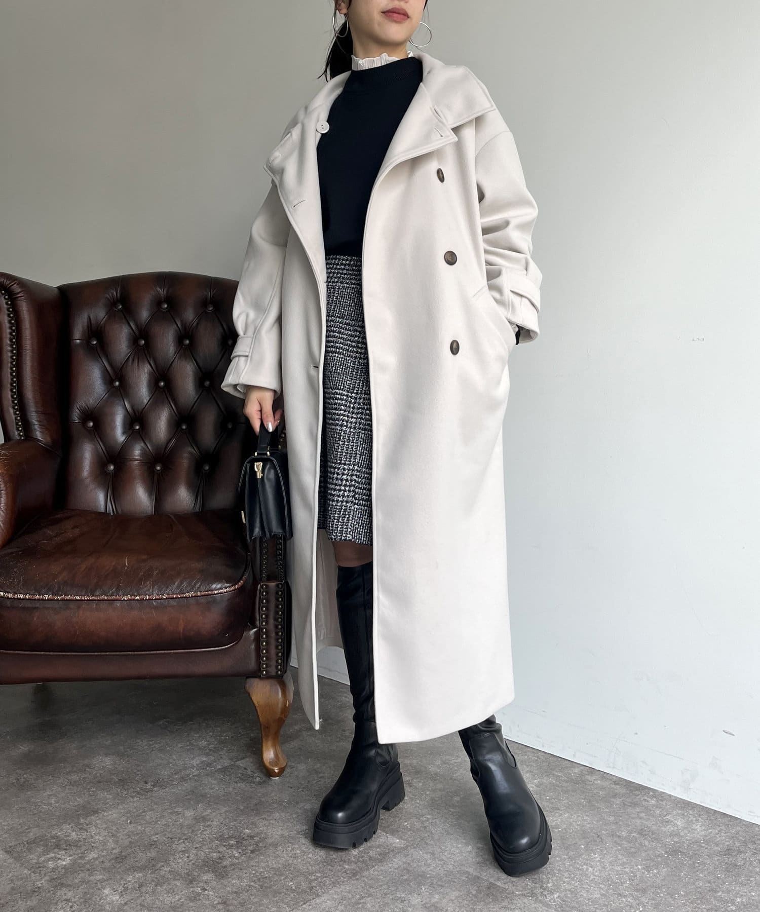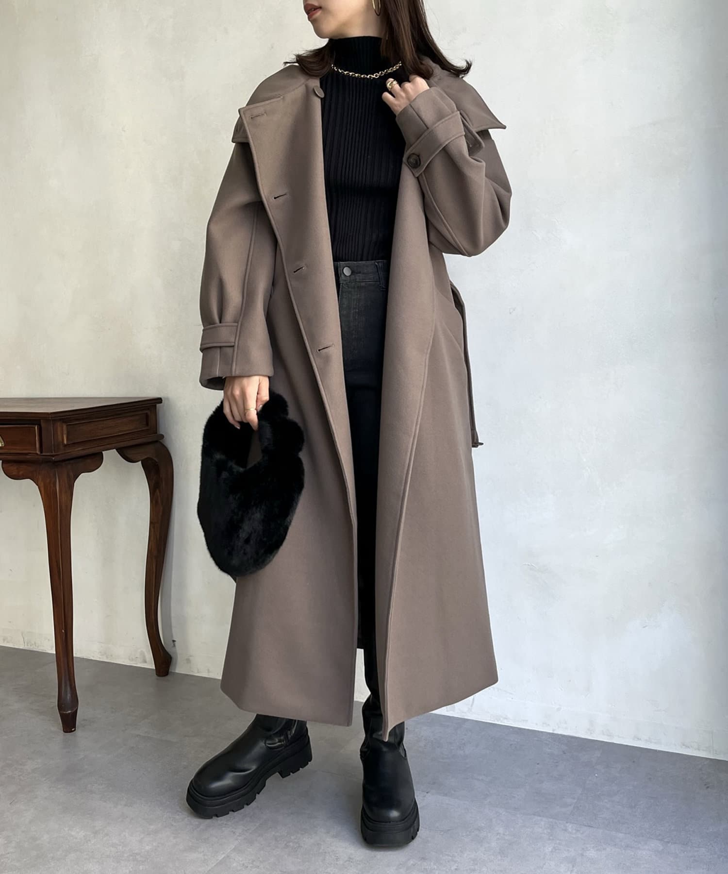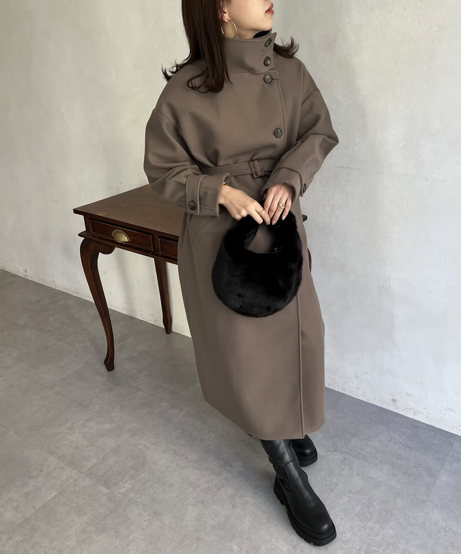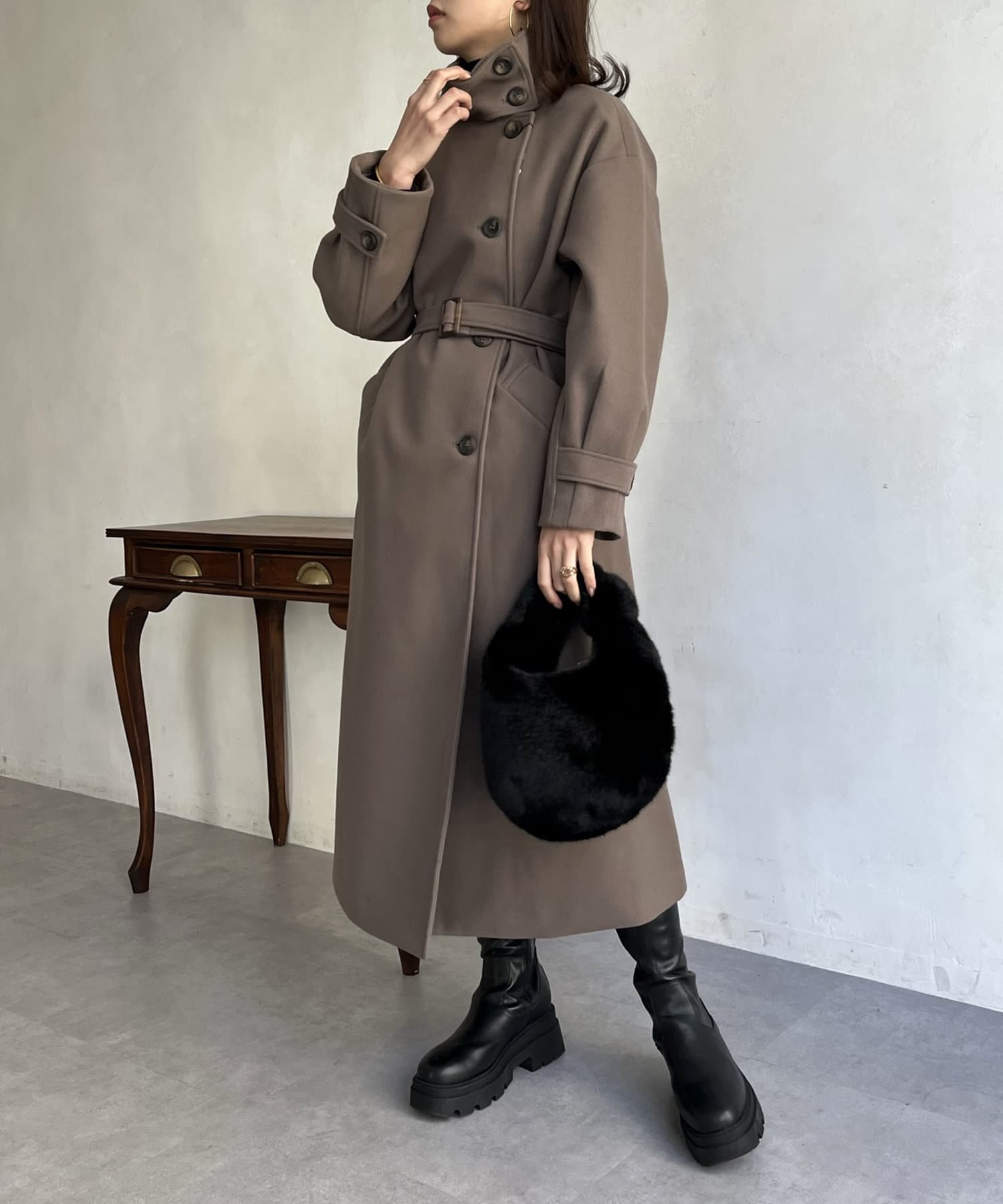 一枚で色んな着こなしができるスタンドカラーロングコート