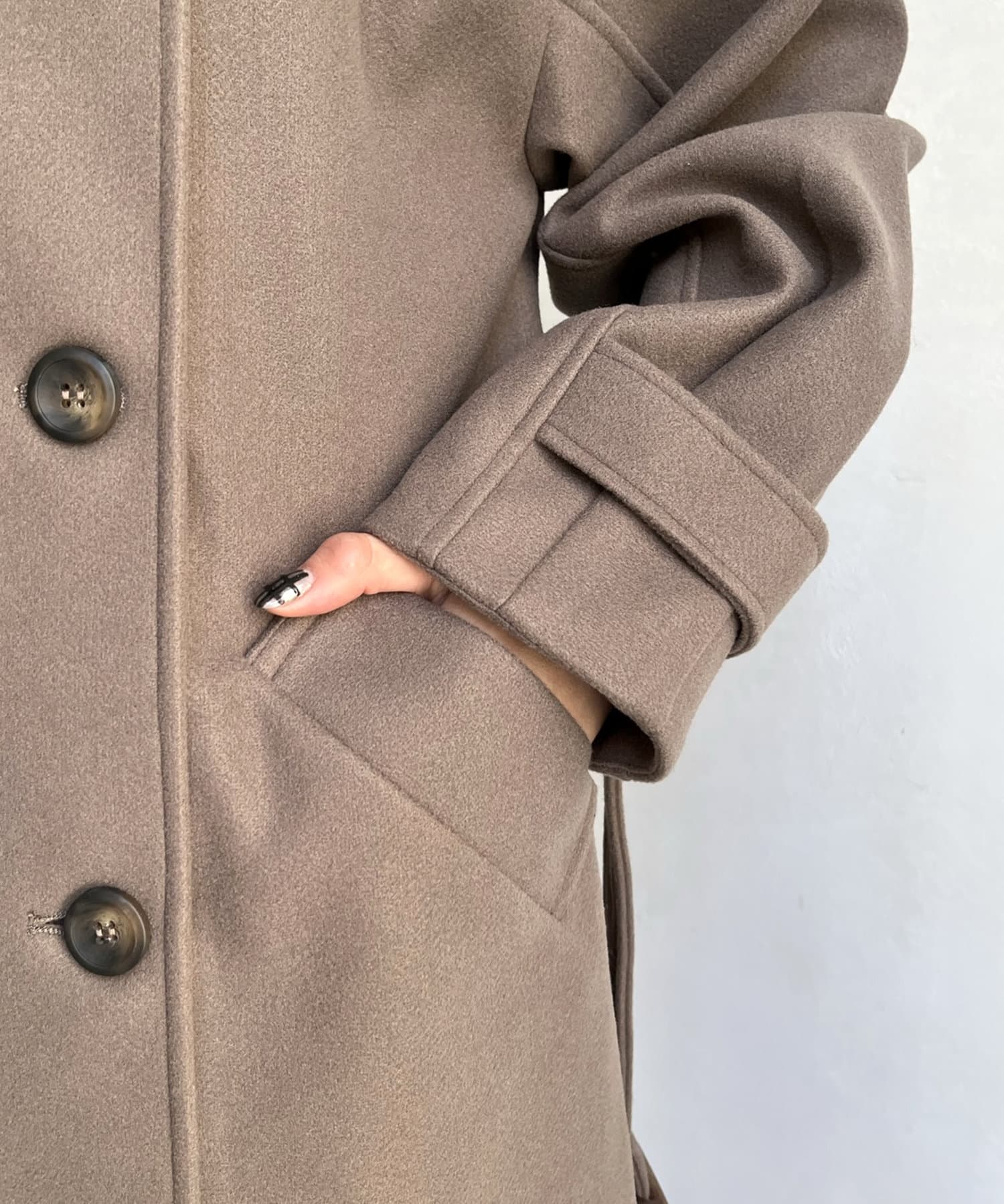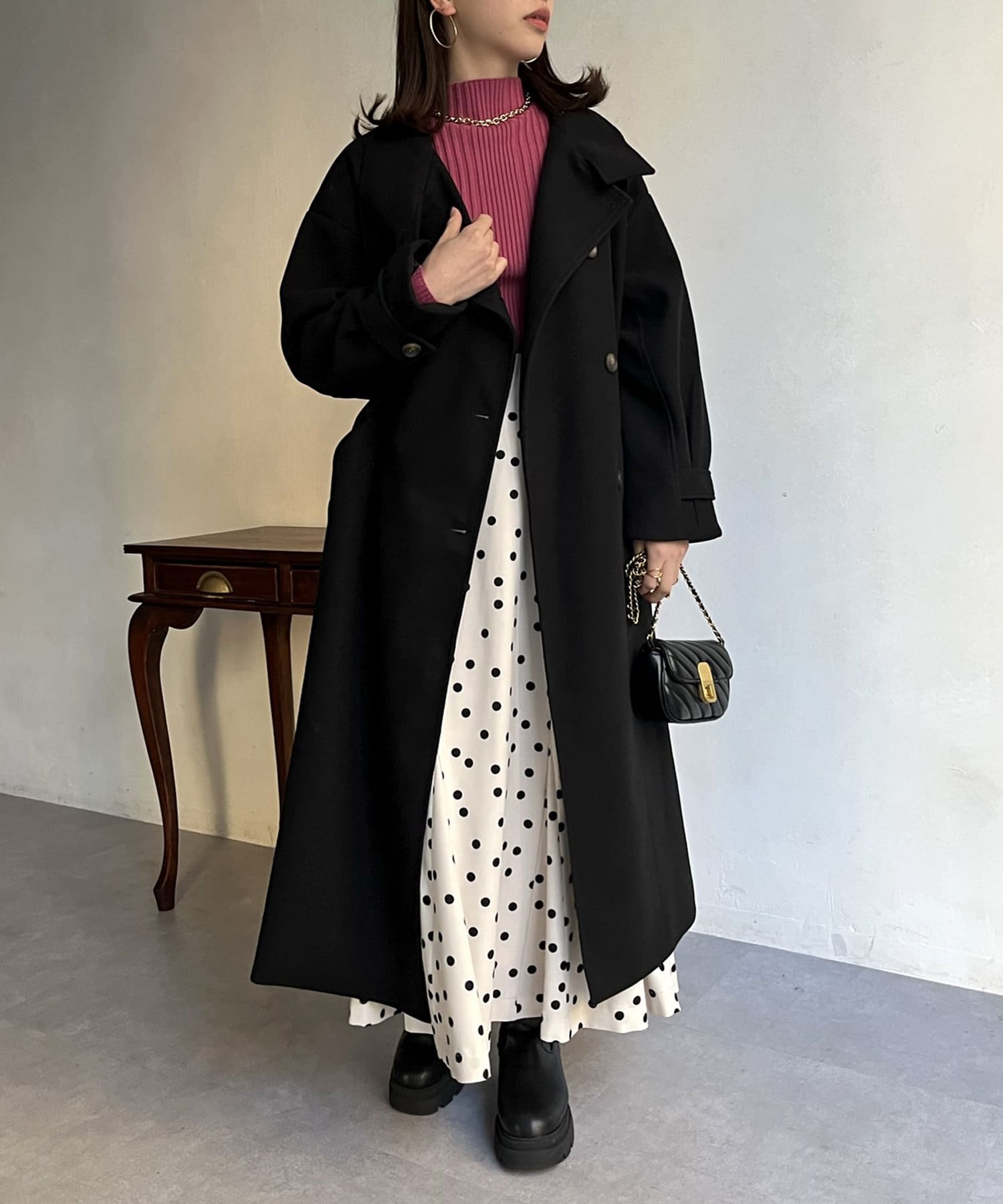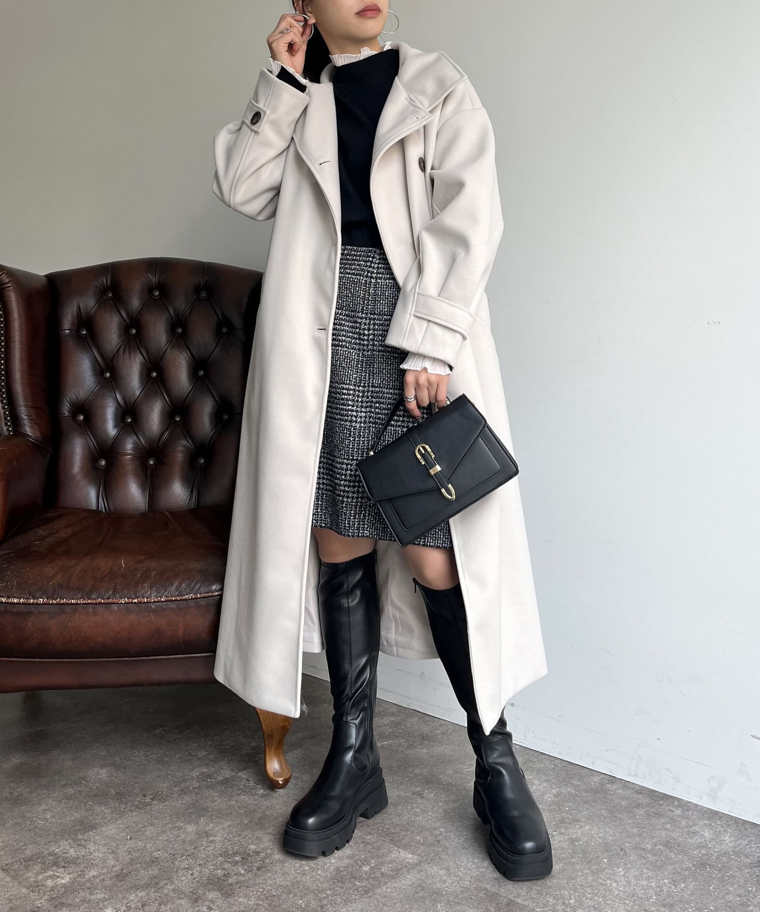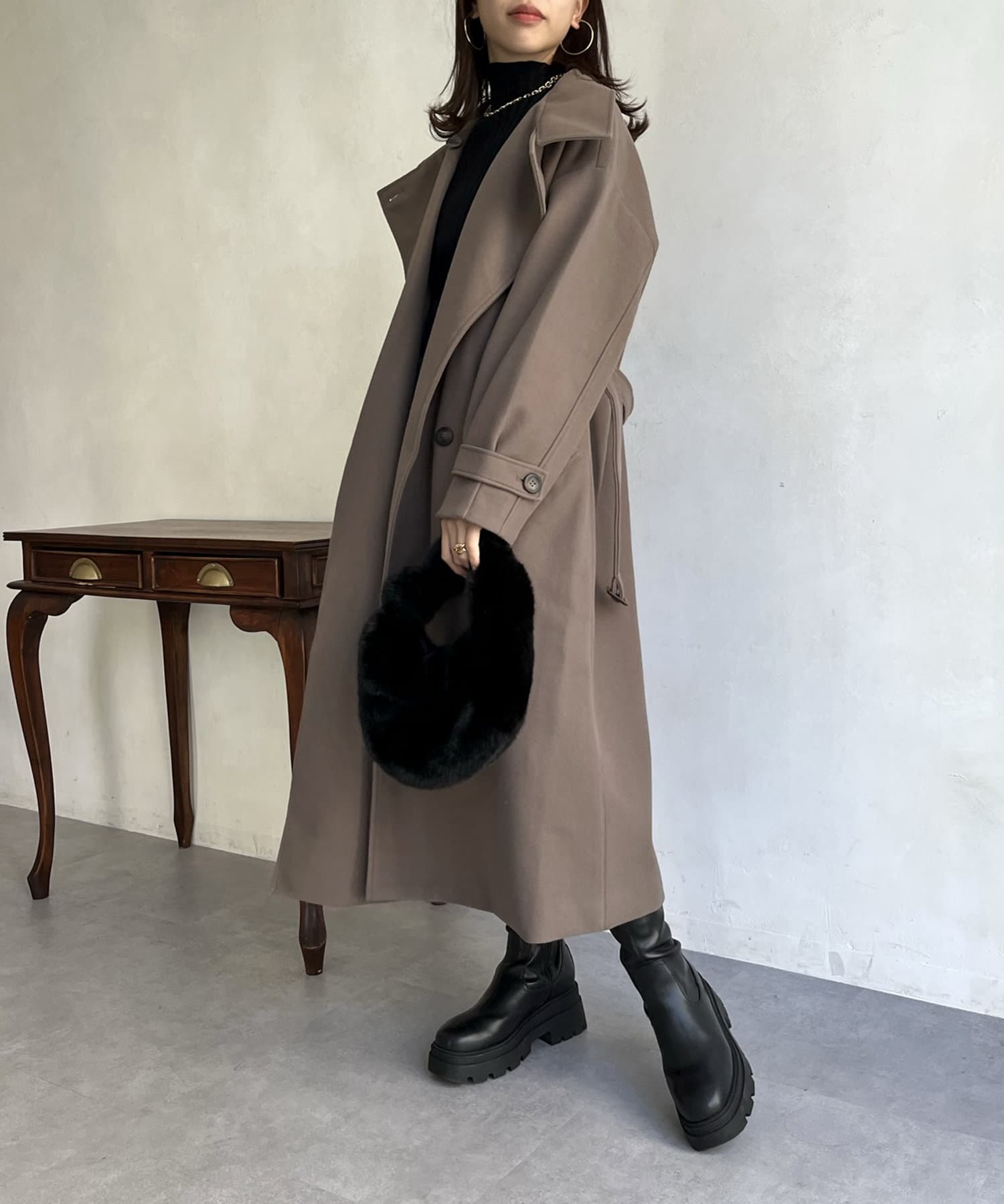一枚で色んな着こなしができるスタンドカラーロングコート