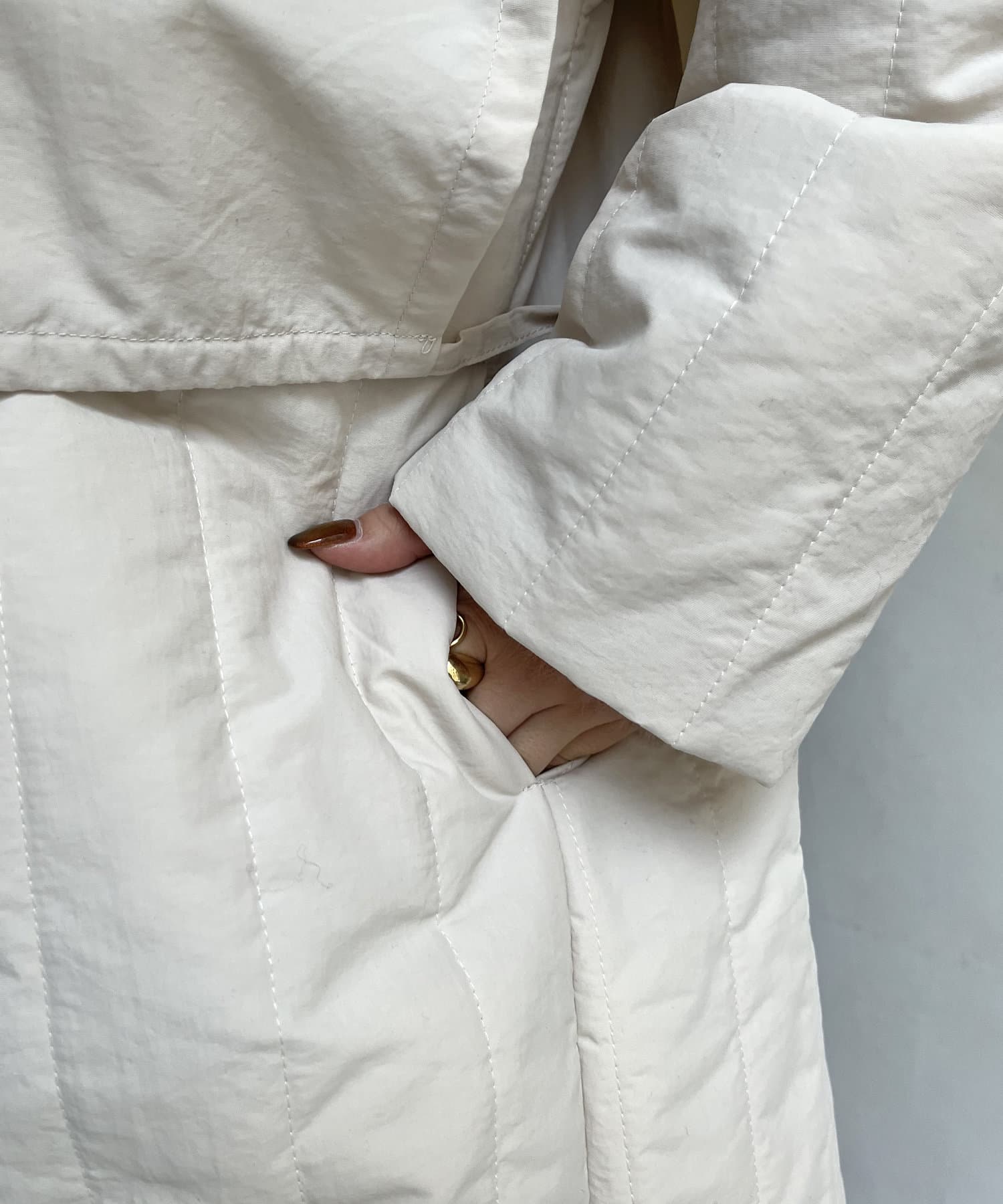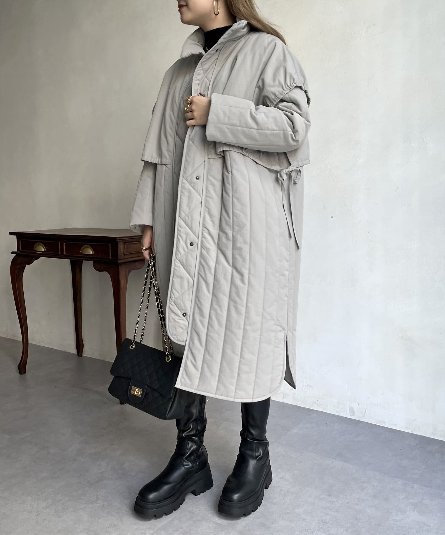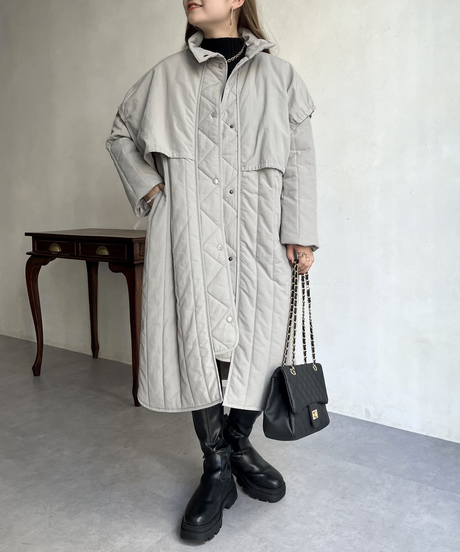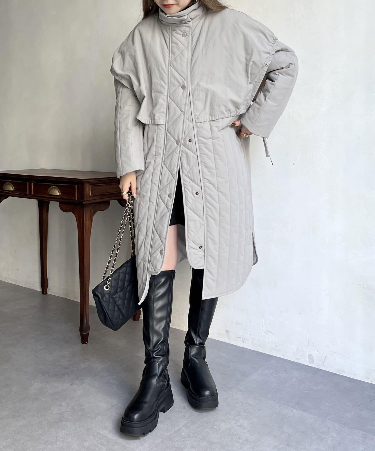 キルト切替が大人キレイめカジュアルに着こなせるスタンドネックコート