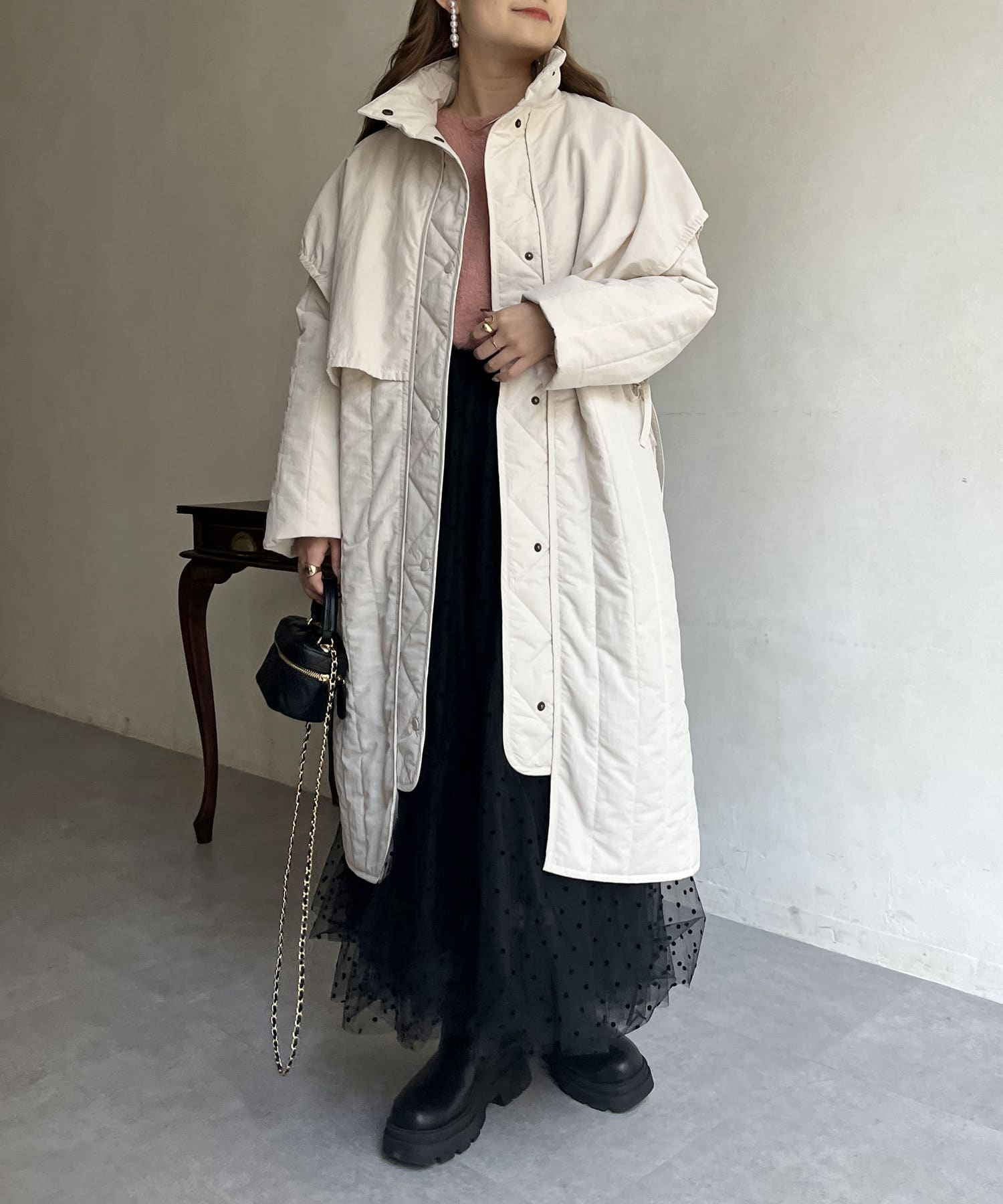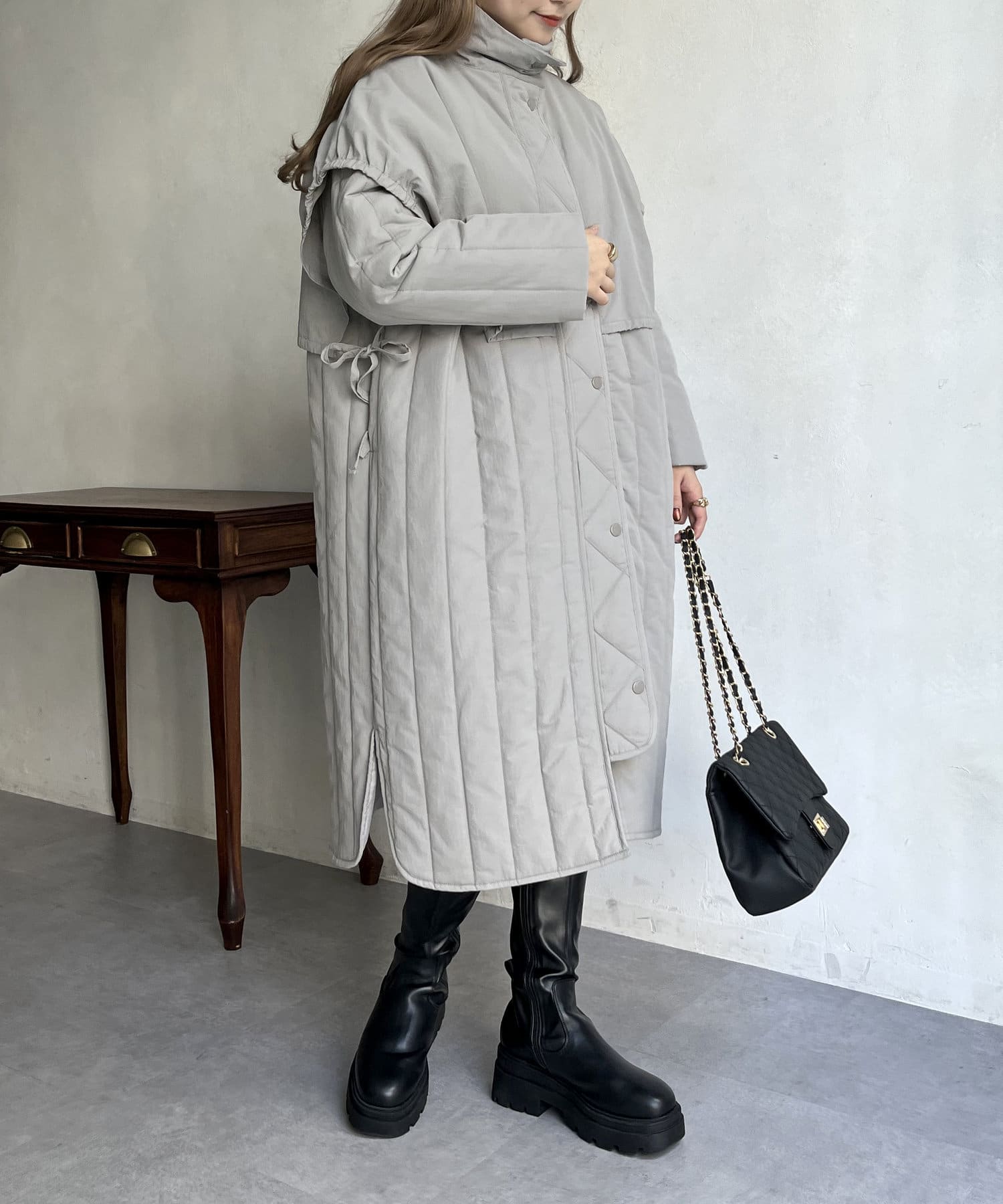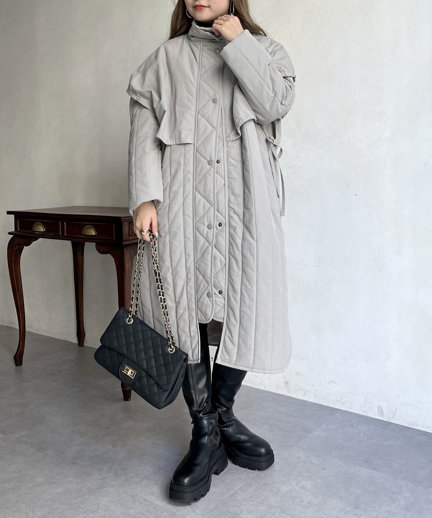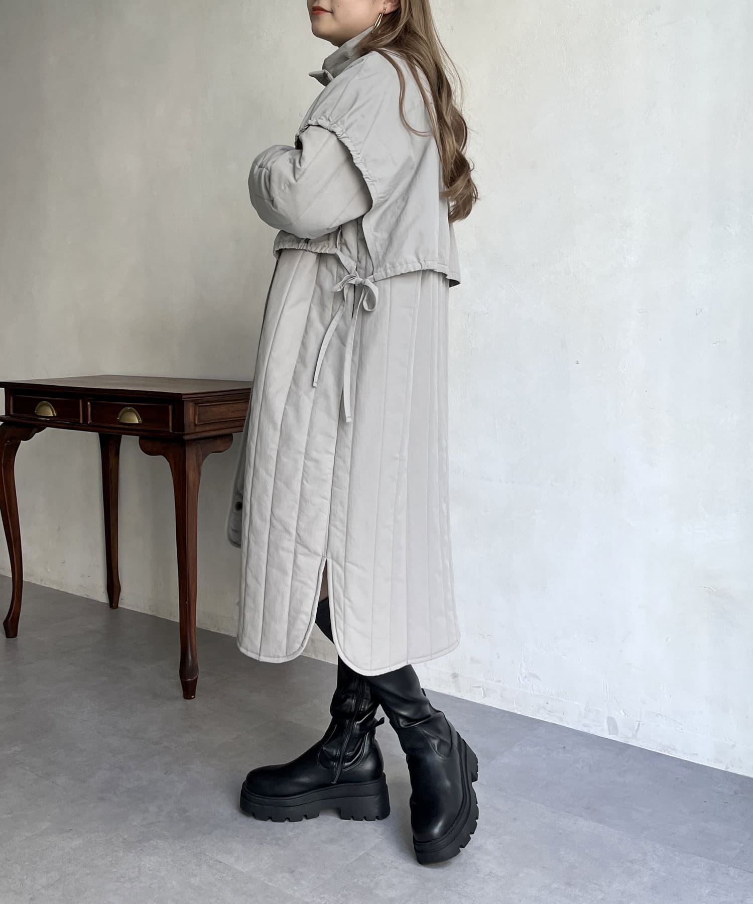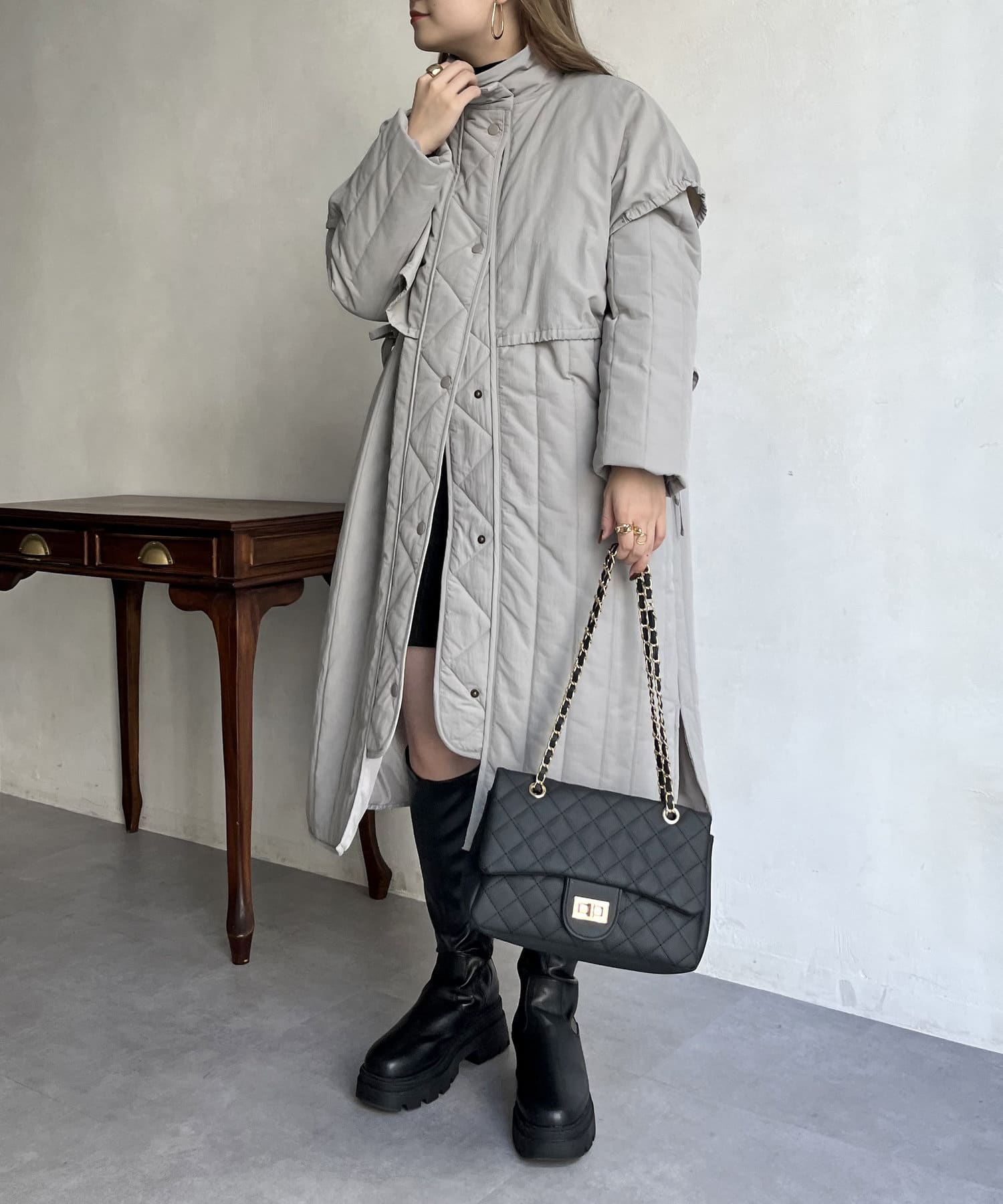 キルト切替が大人キレイめカジュアルに着こなせるスタンドネックコート