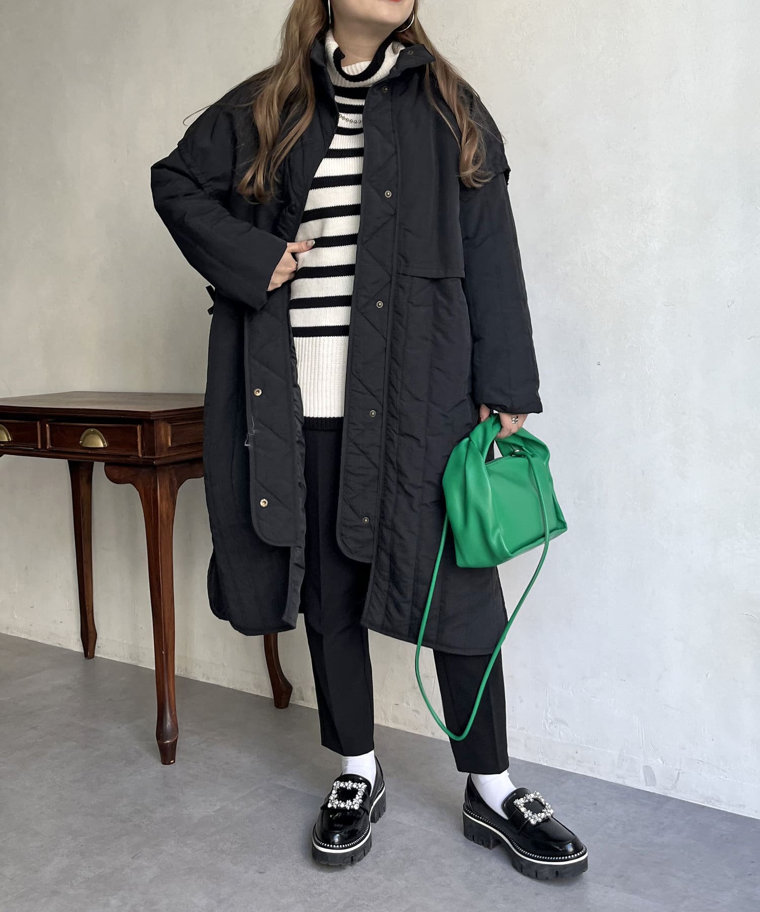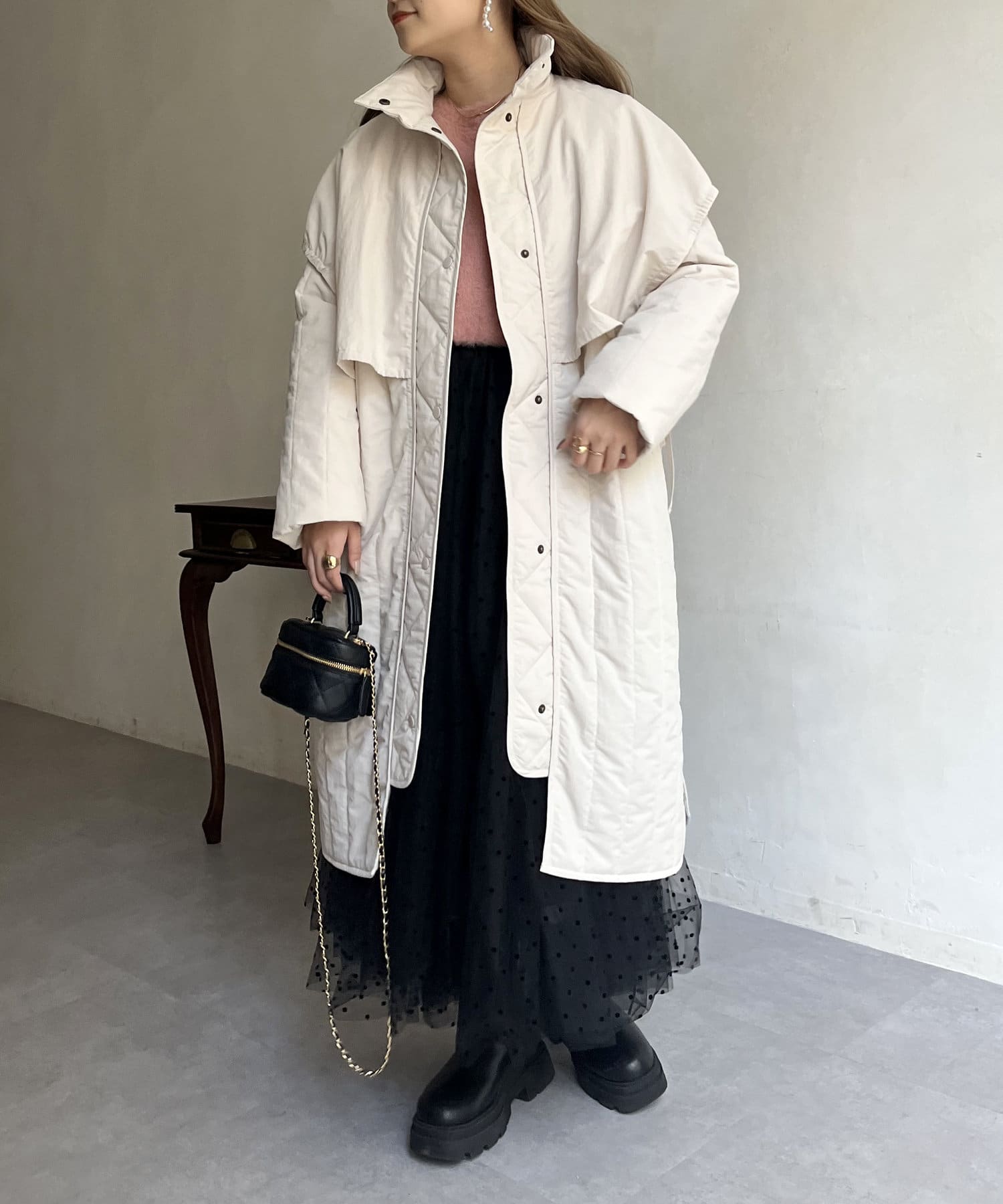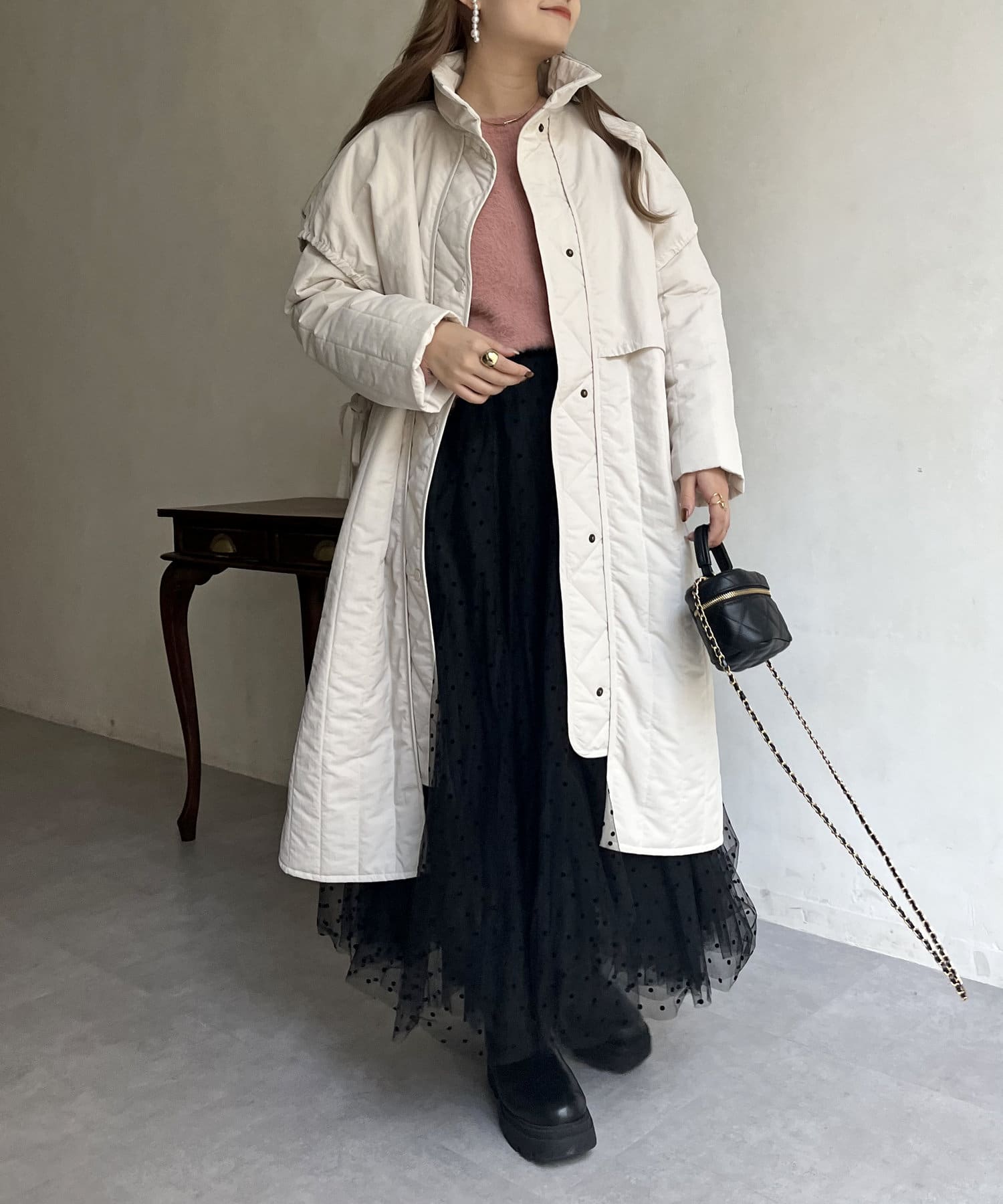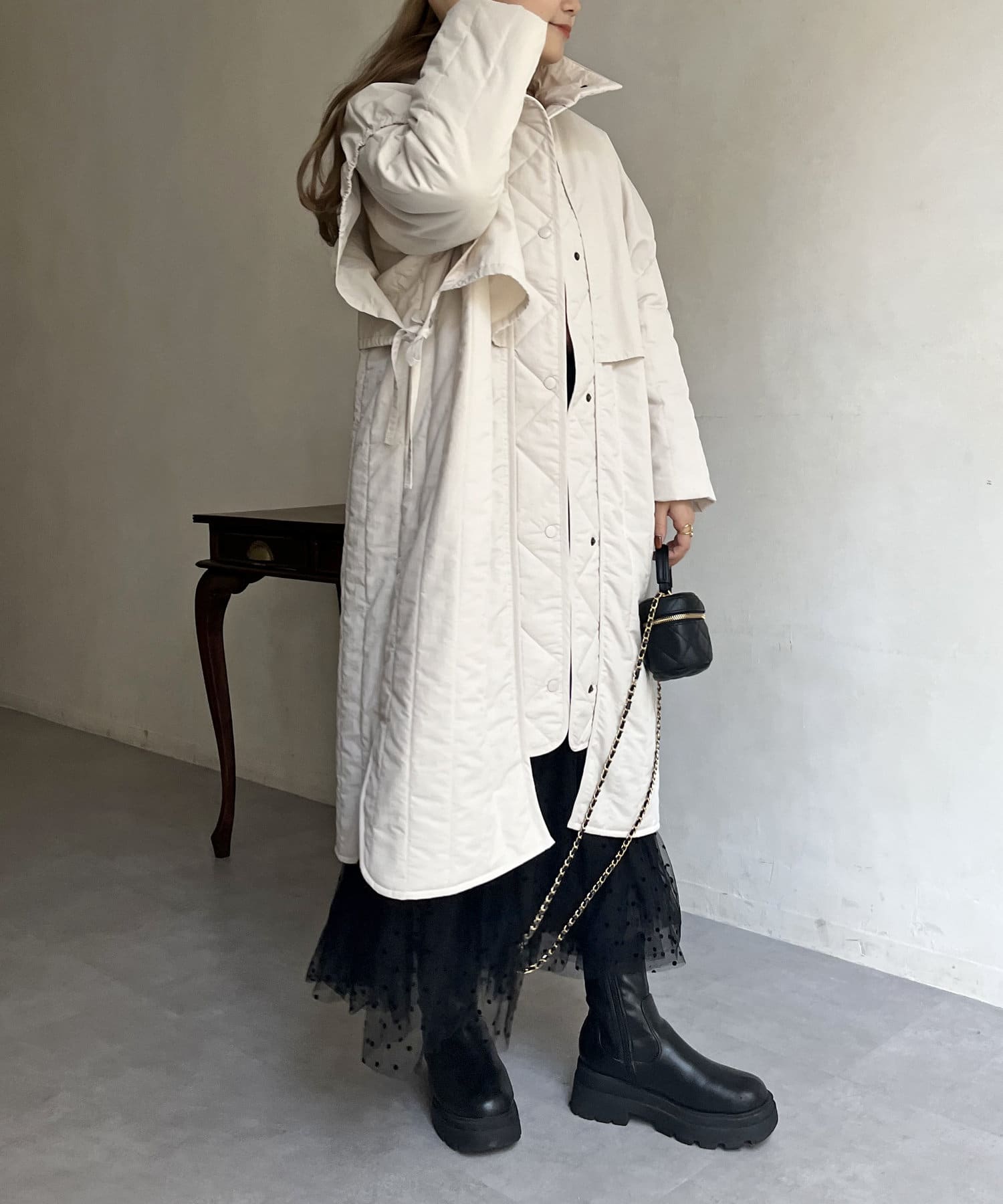 キルト切替が大人キレイめカジュアルに着こなせるスタンドネックコート