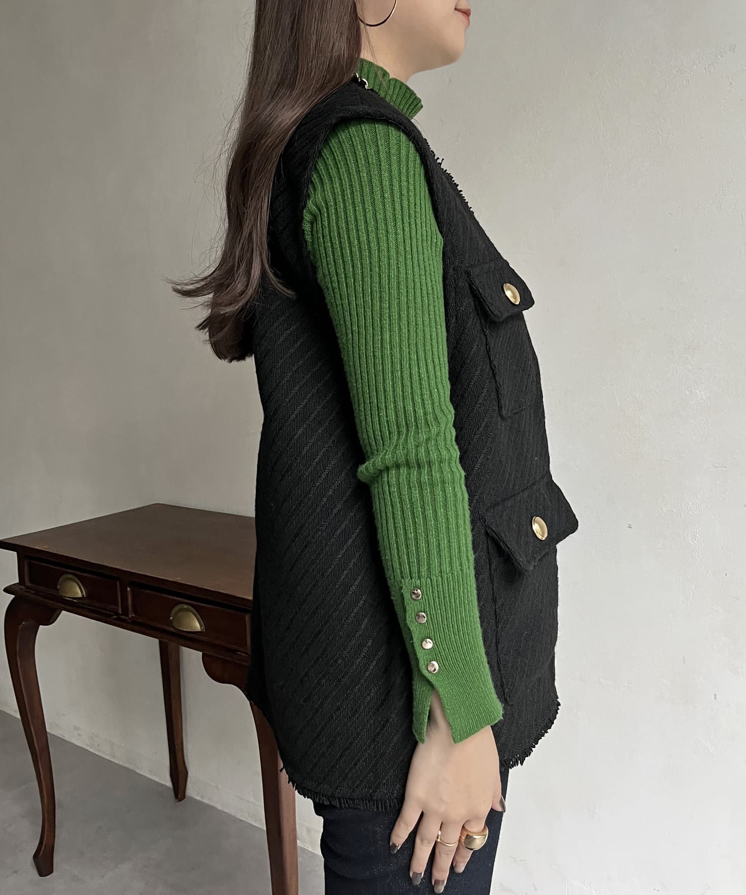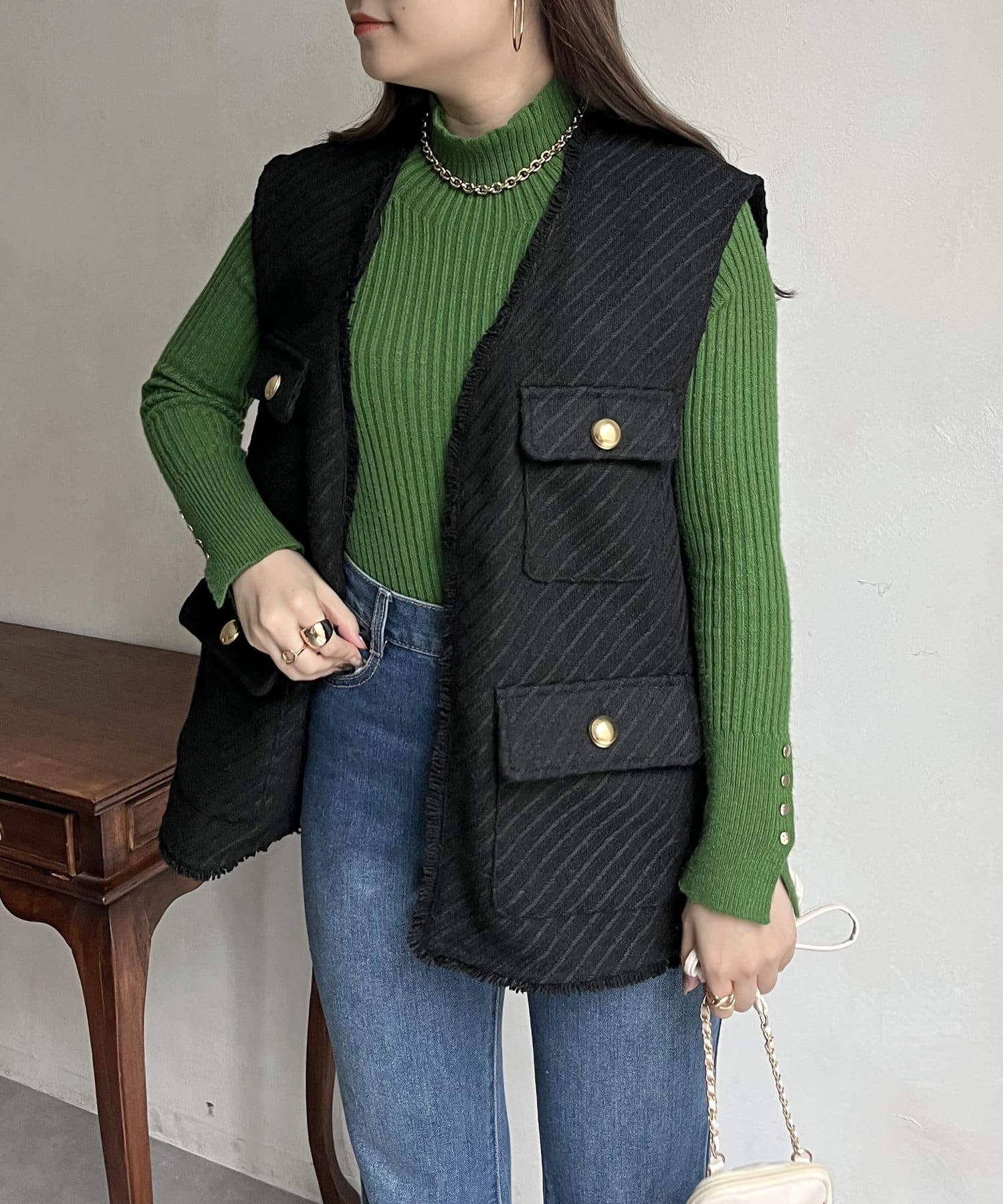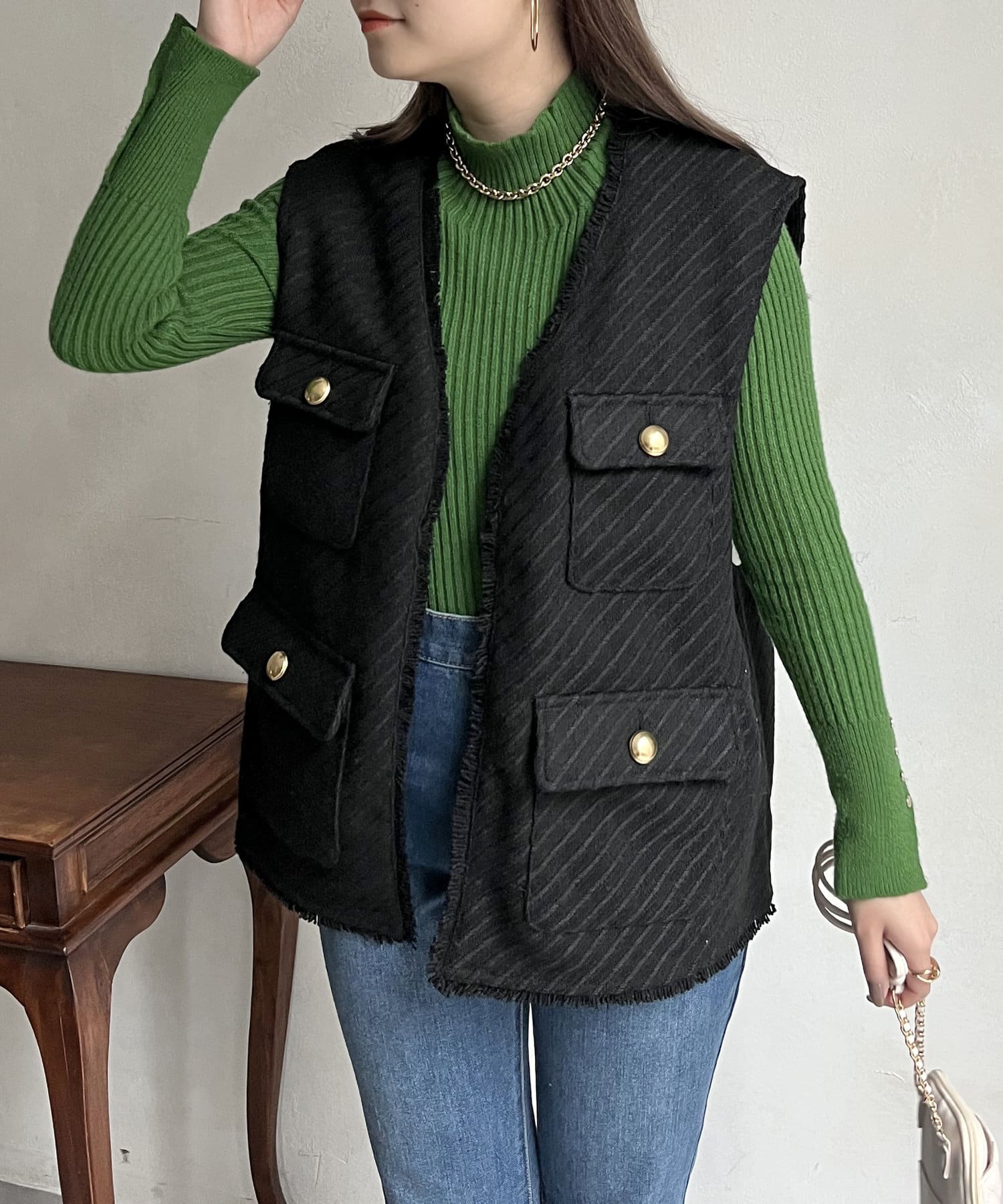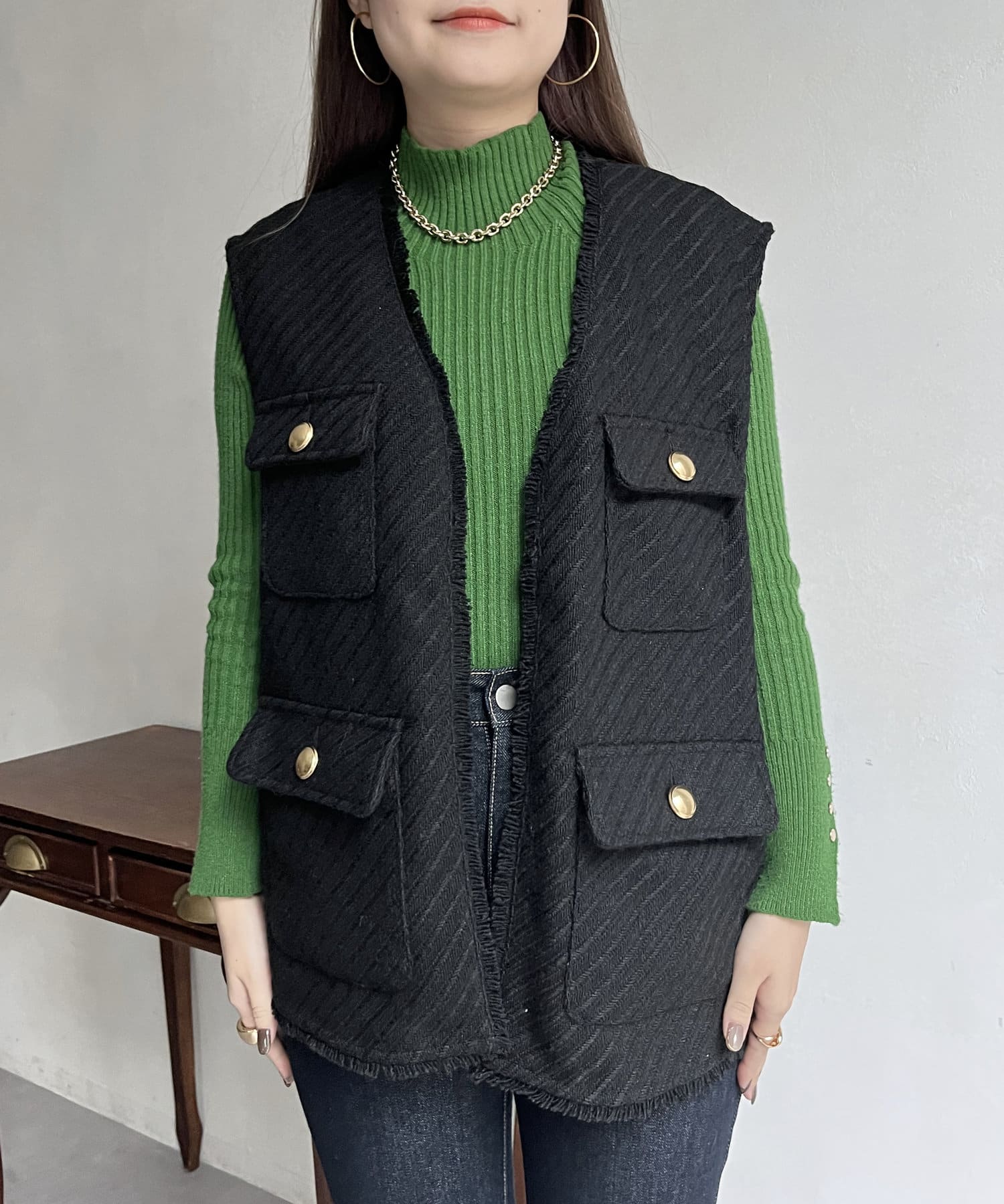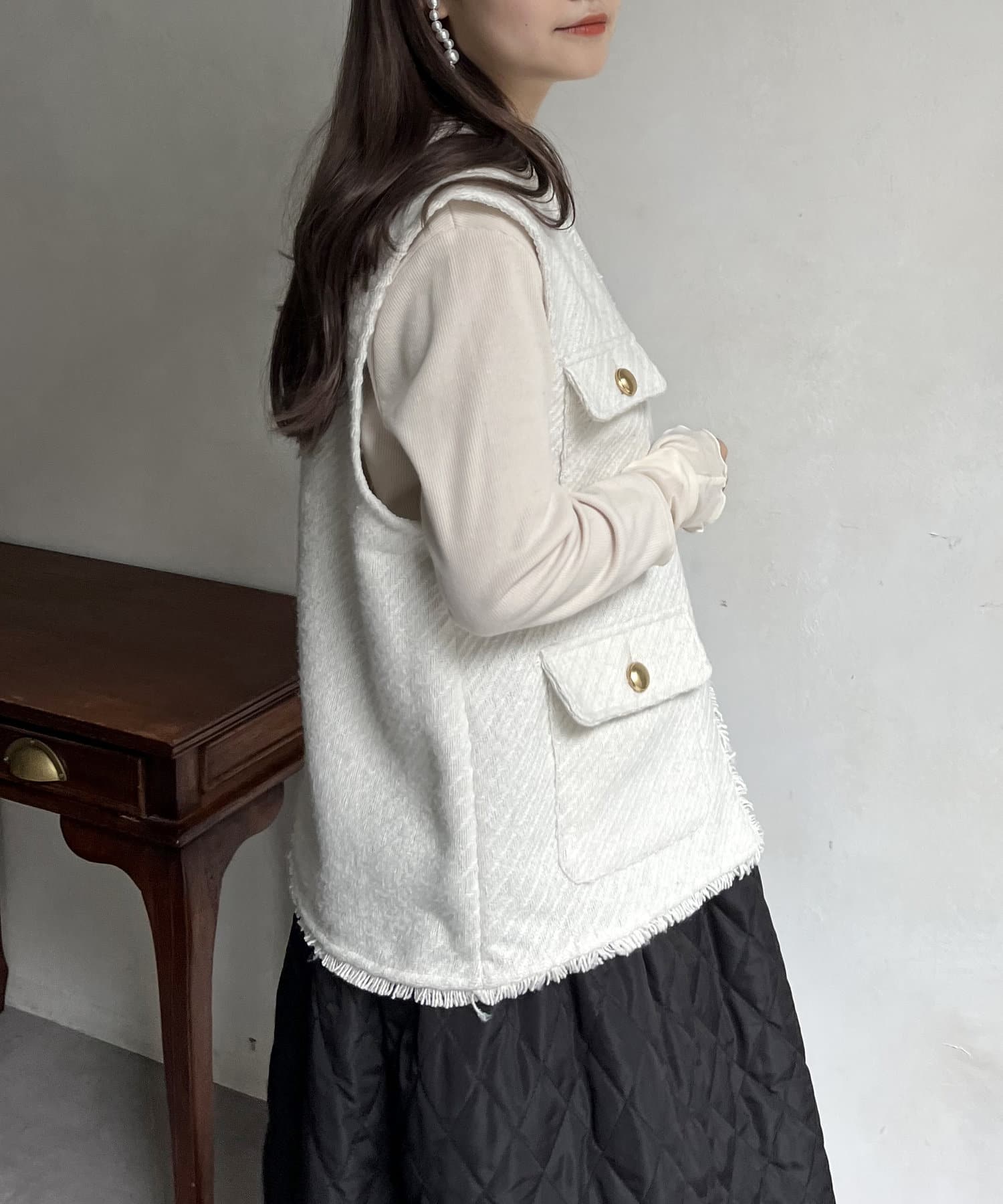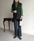 金ボタンがアクセントになるツイードフリンジベスト