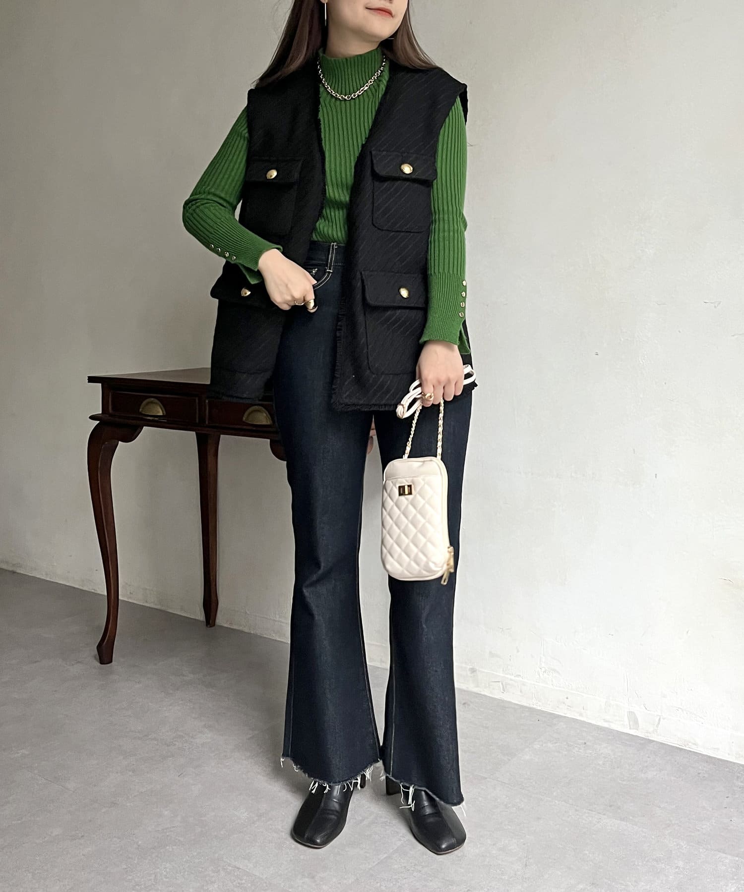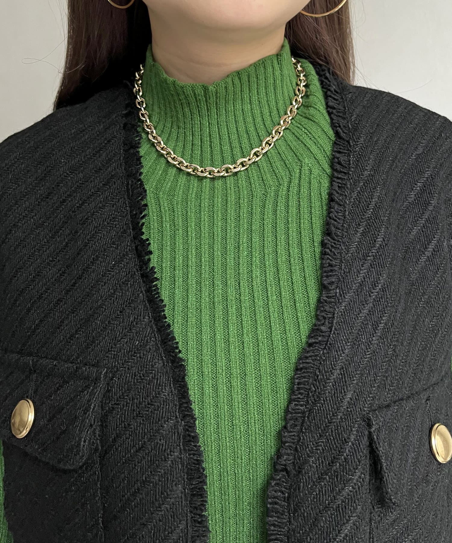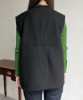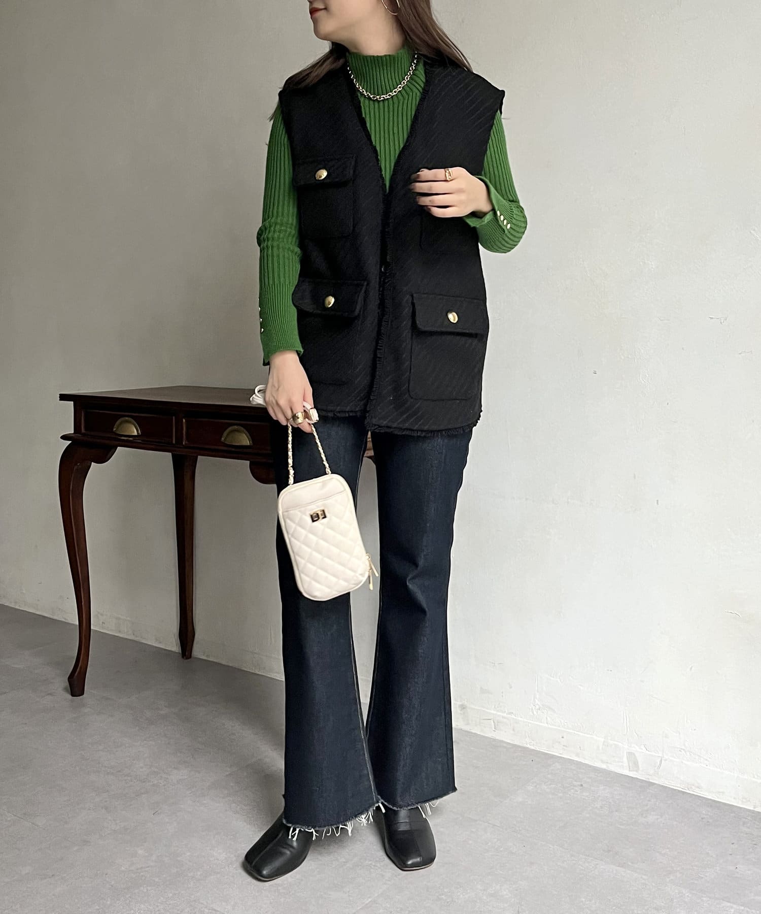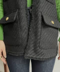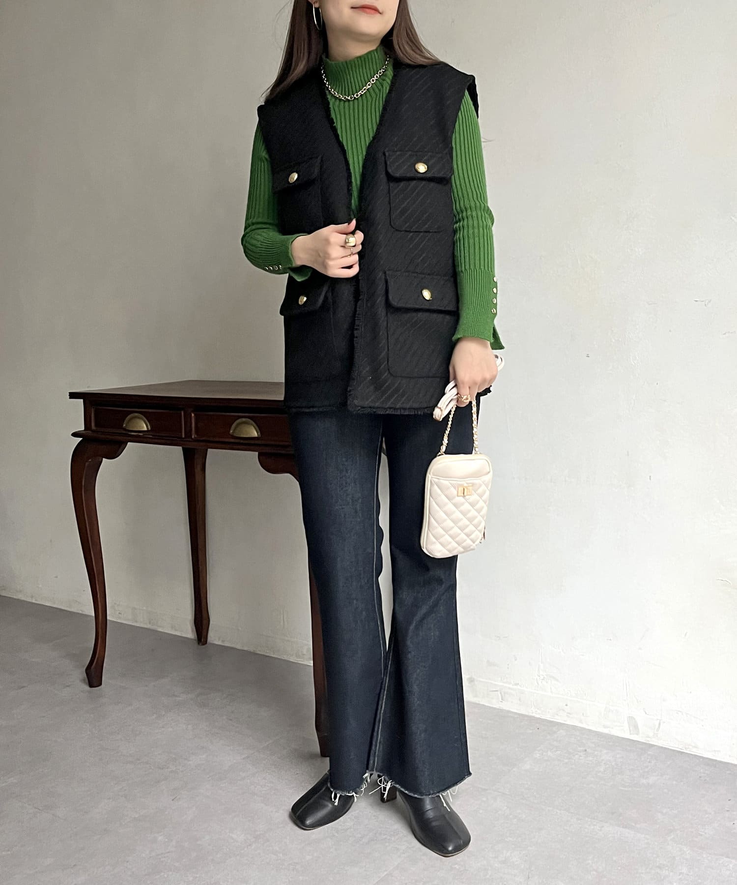 金ボタンがアクセントになるツイードフリンジベスト