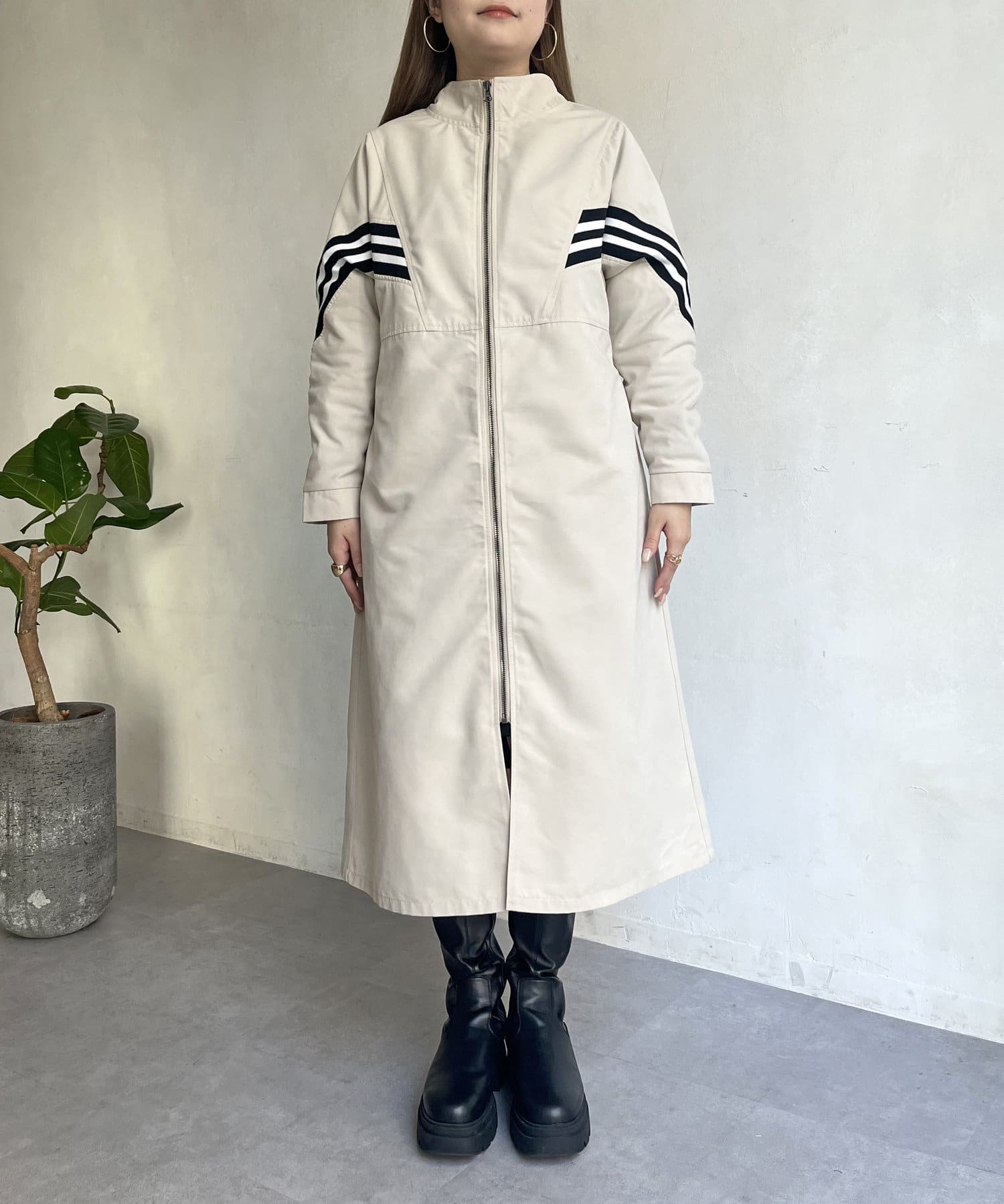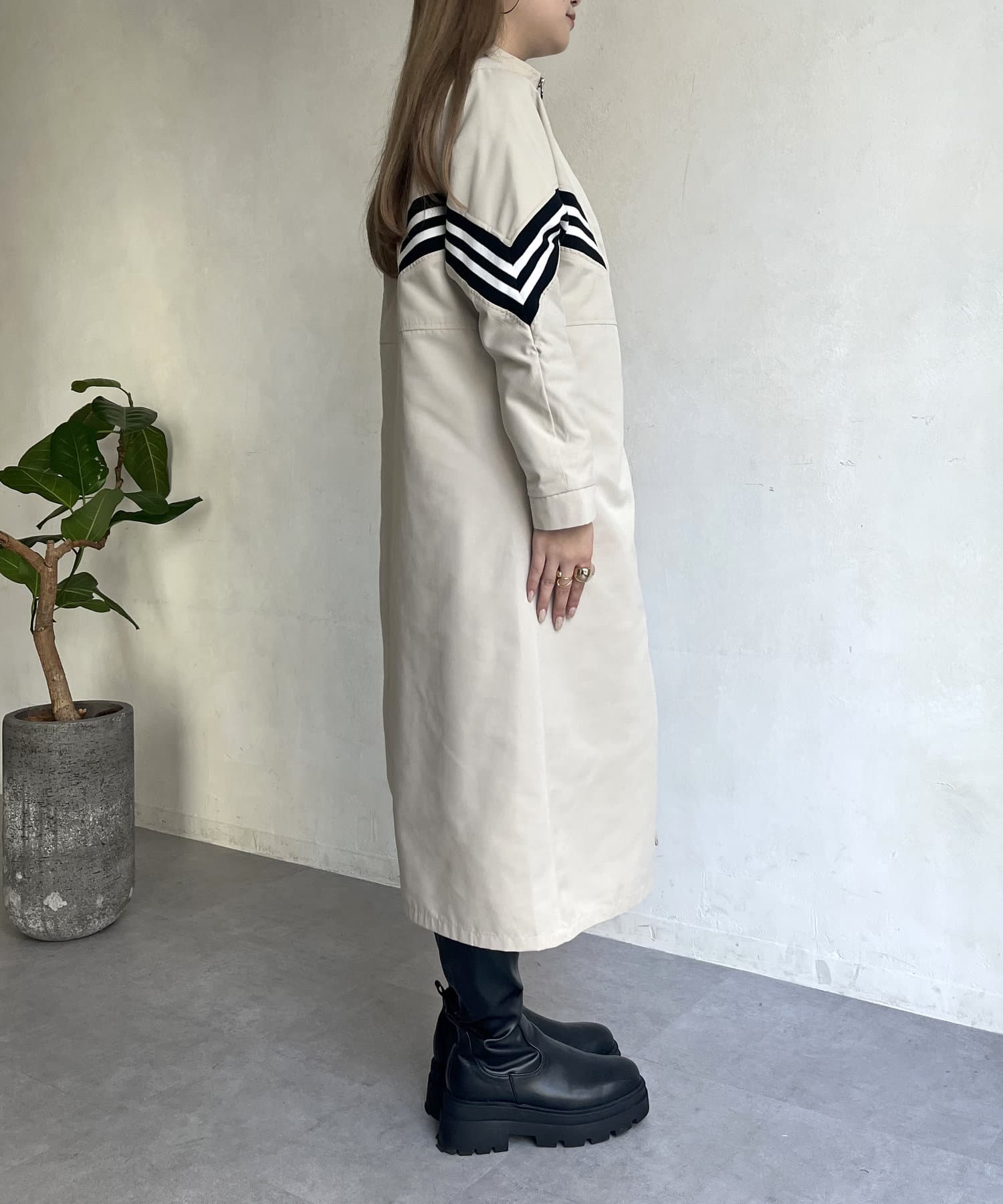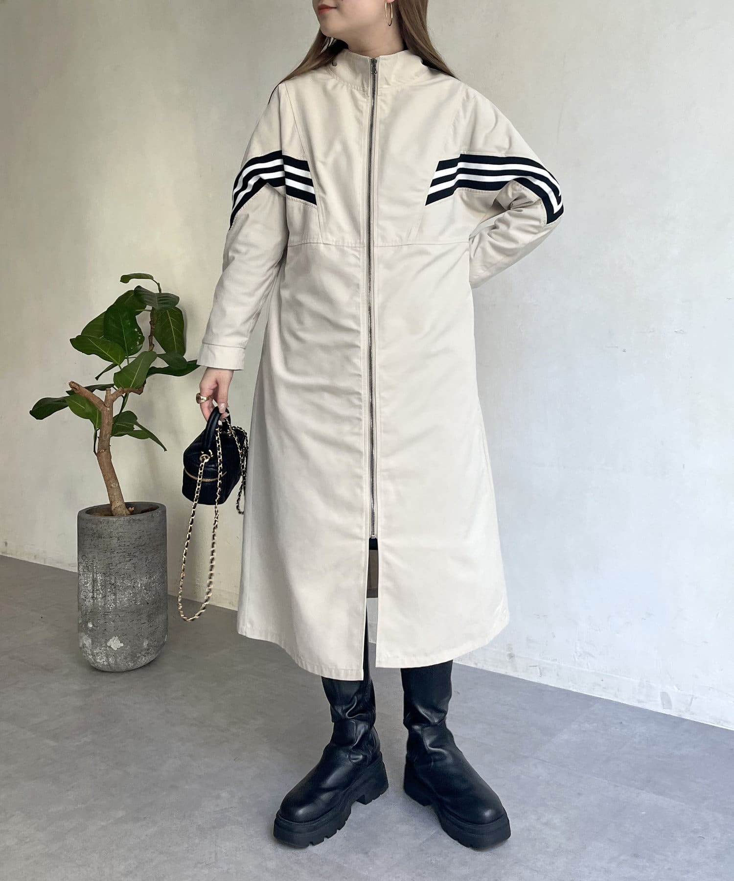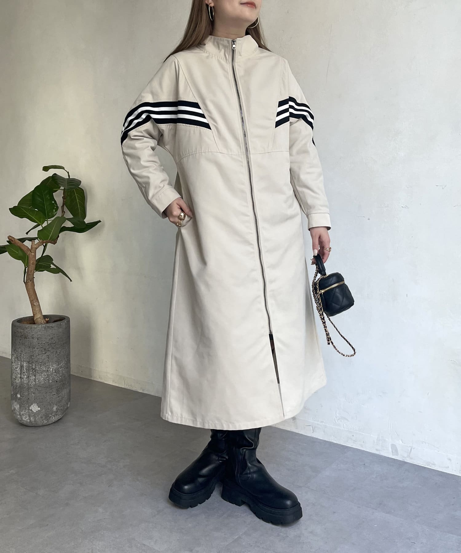 配色テープがアクセントになるスタンドネックロングコート