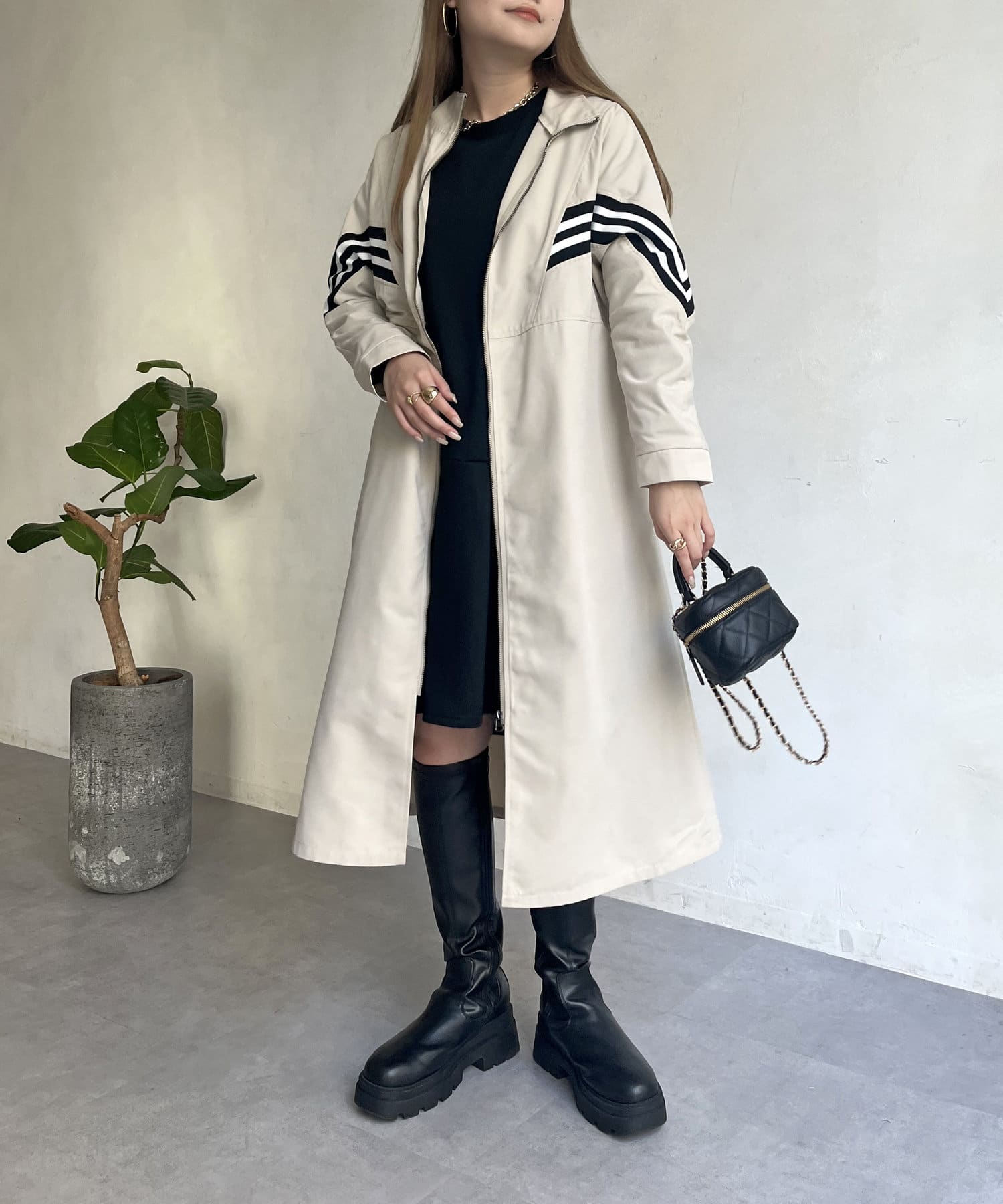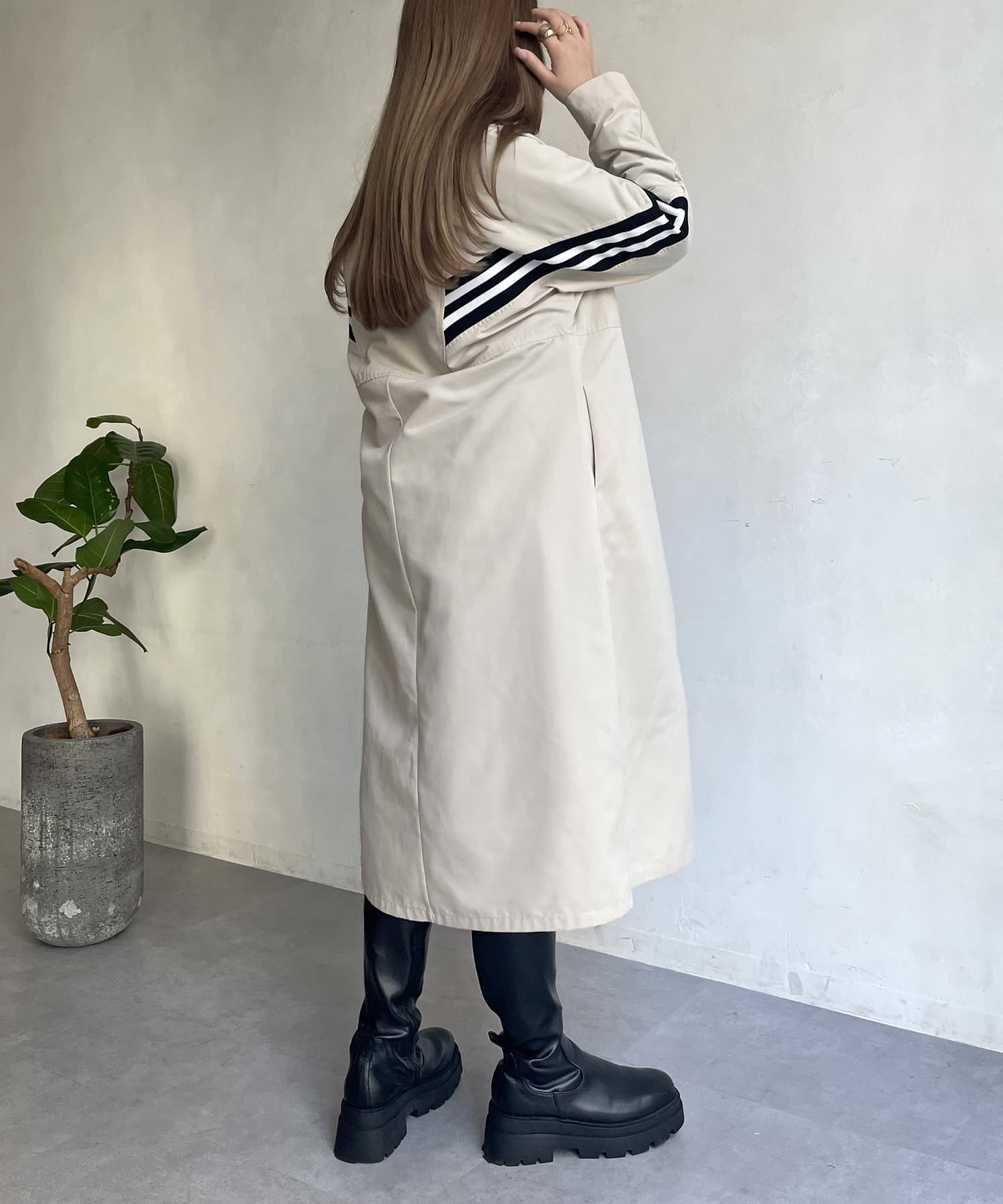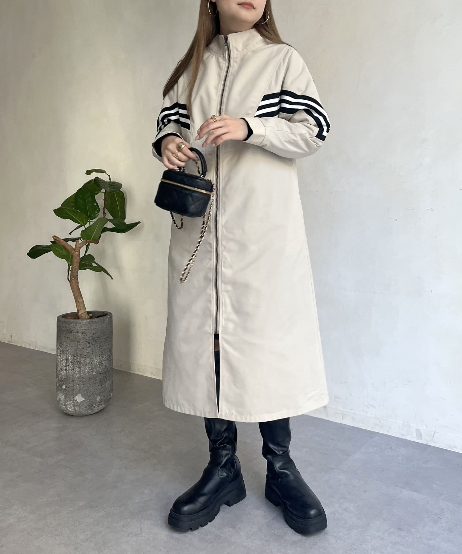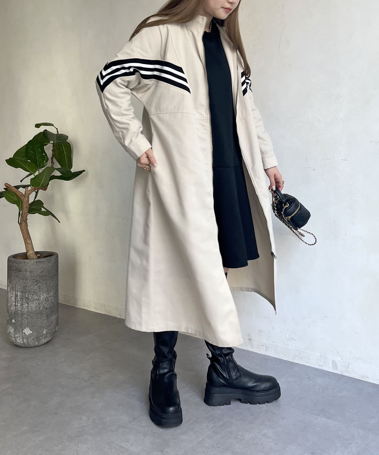 配色テープがアクセントになるスタンドネックロングコート