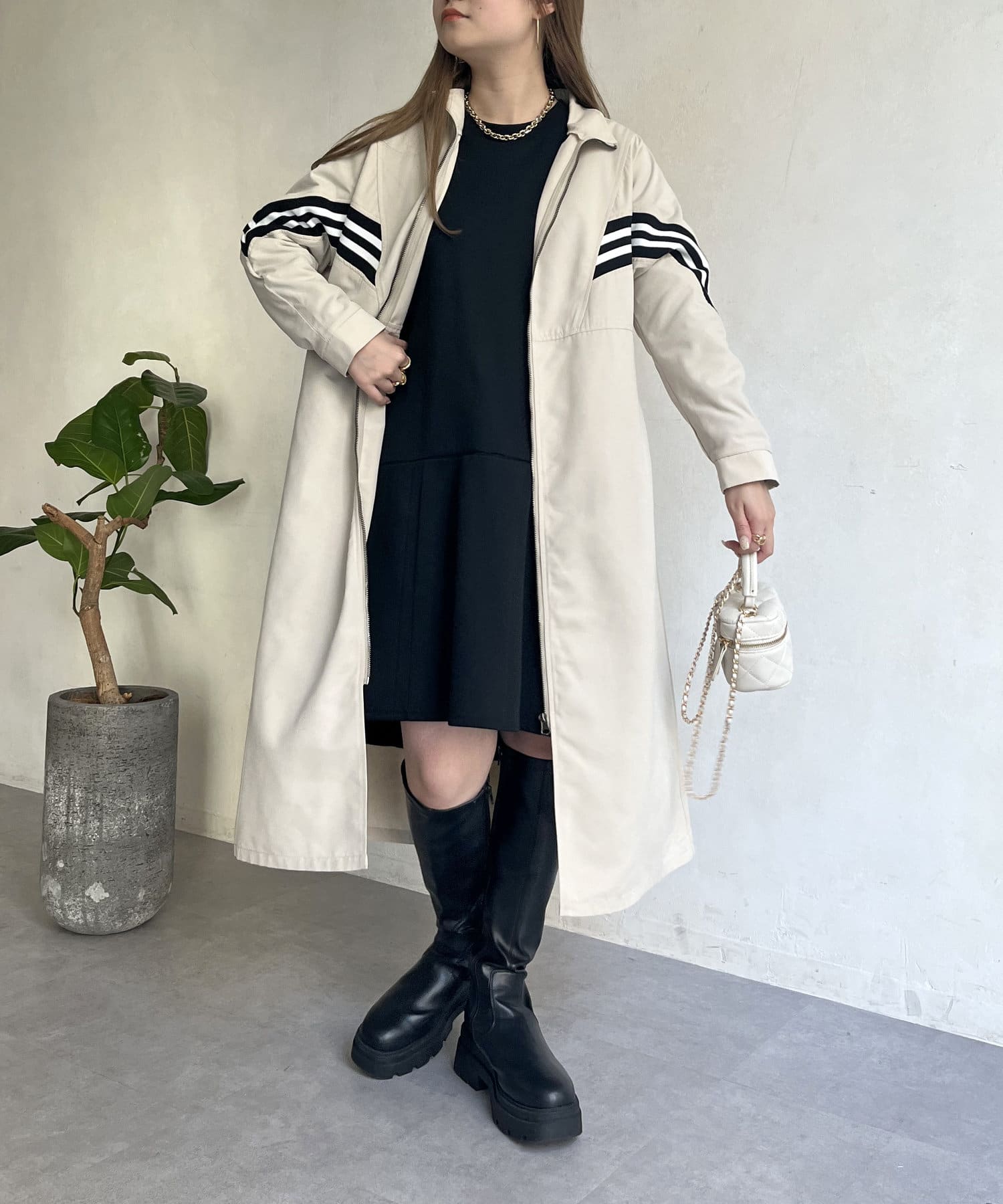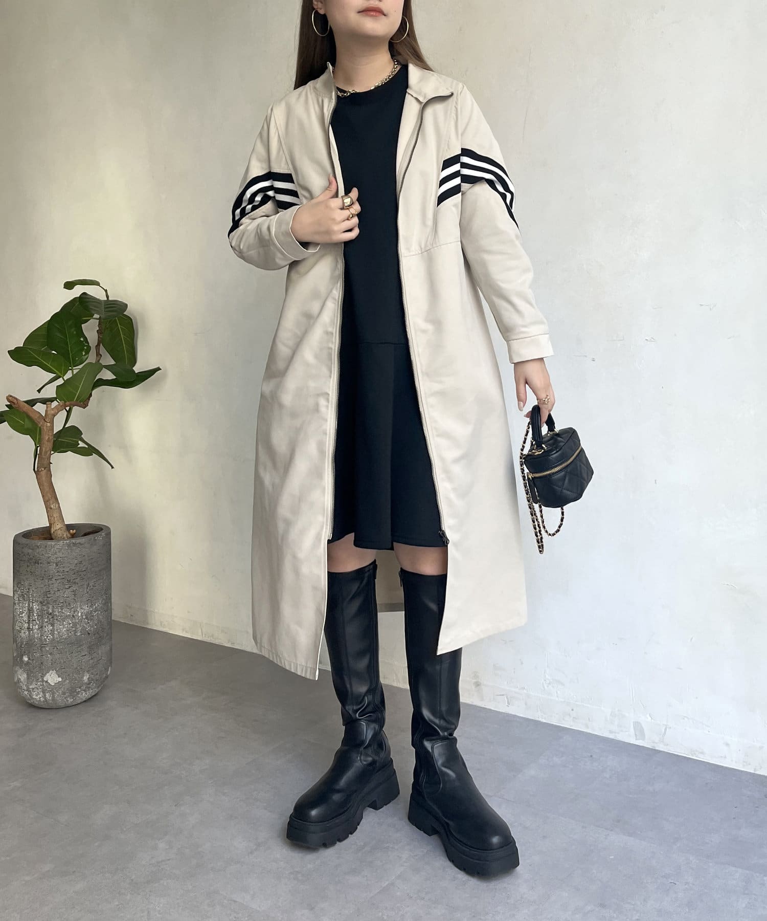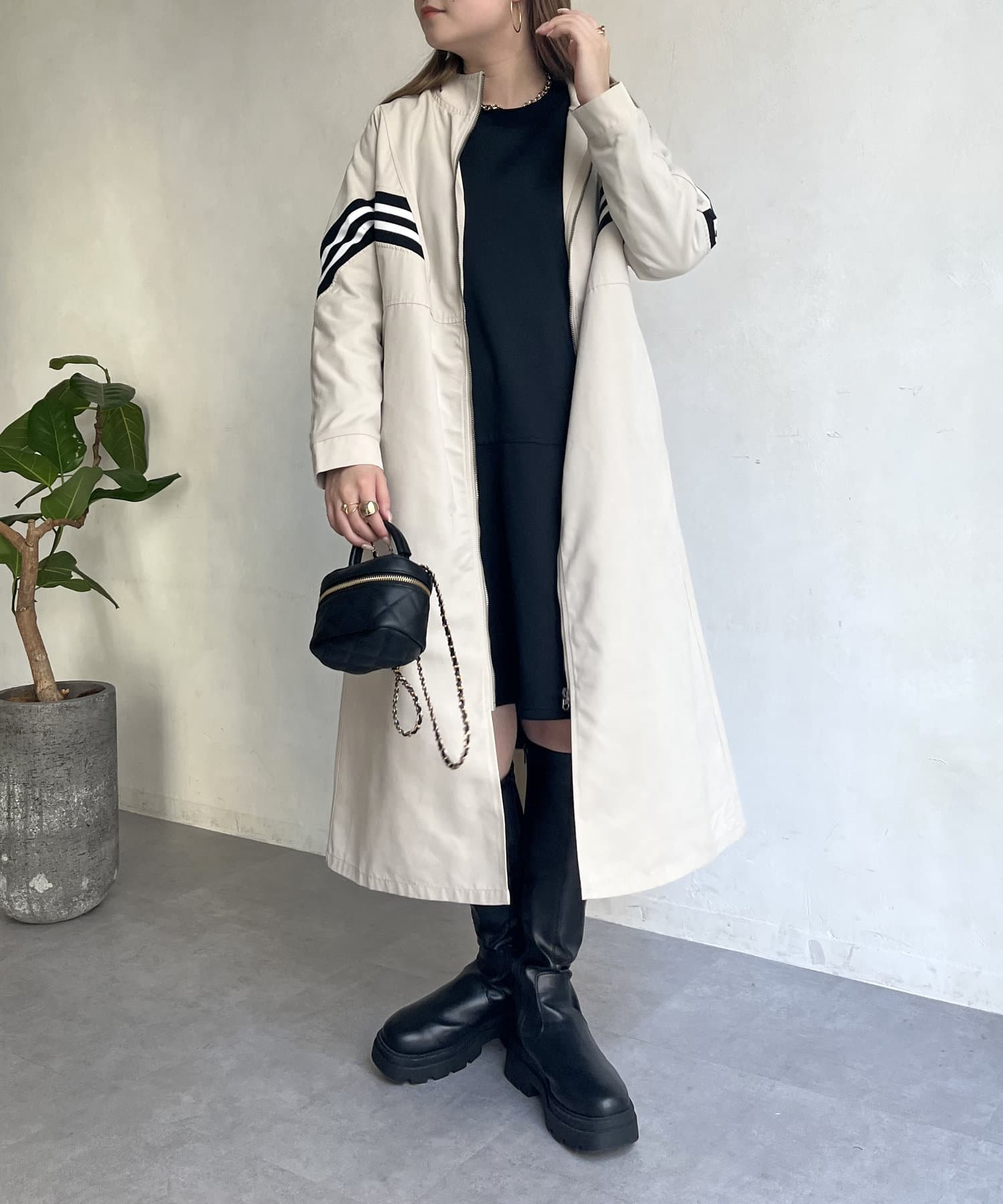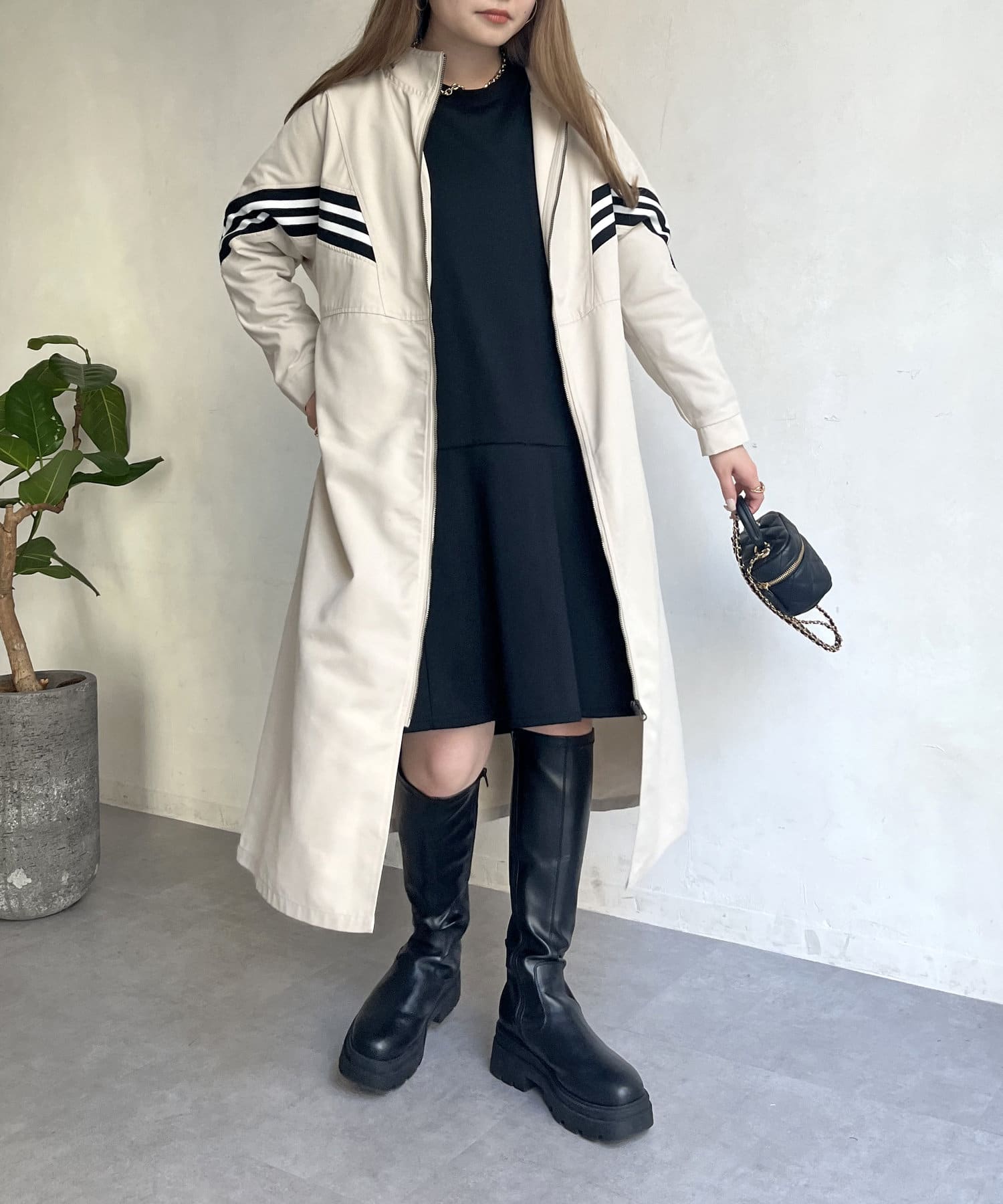 配色テープがアクセントになるスタンドネックロングコート