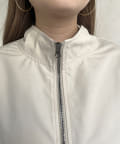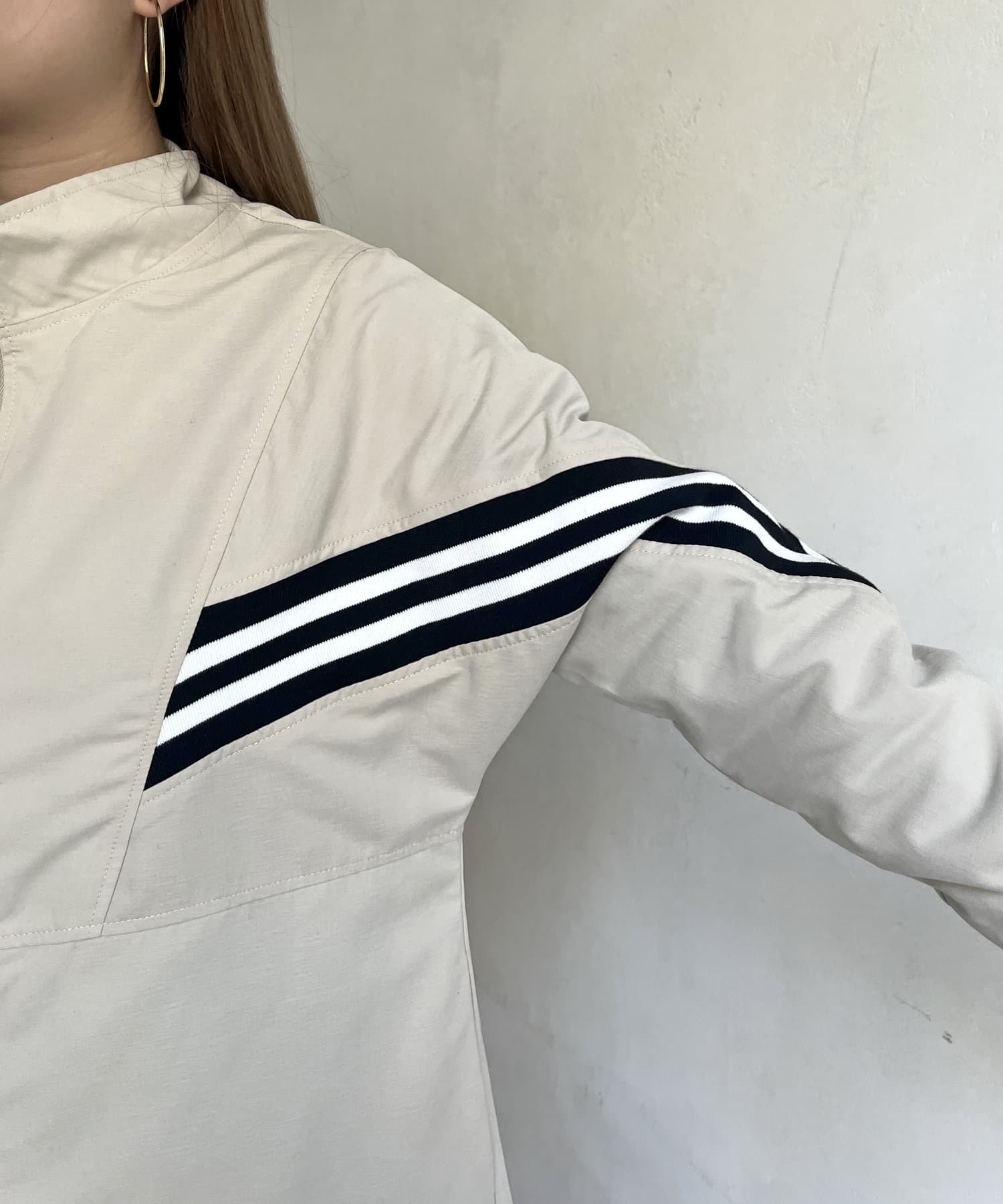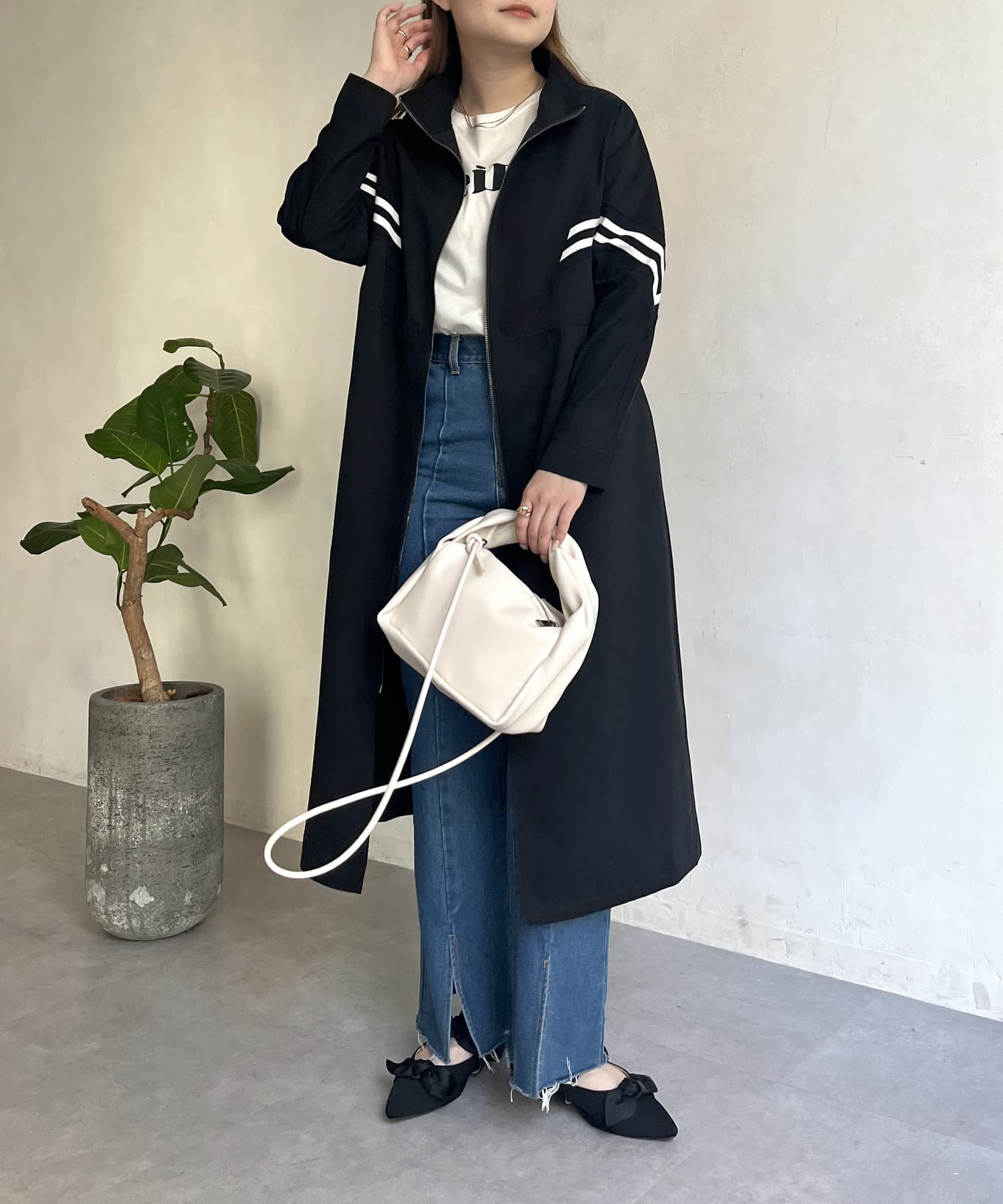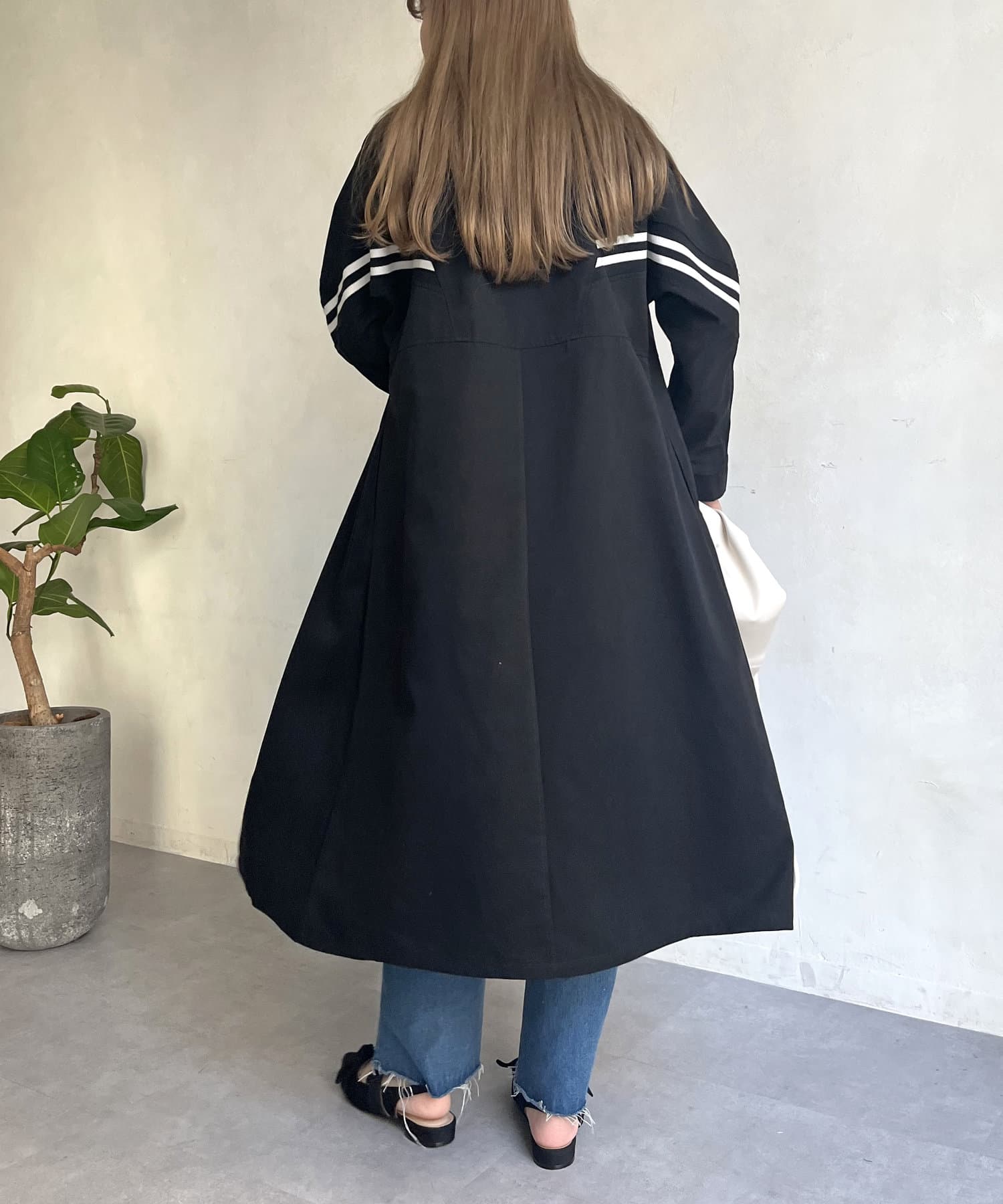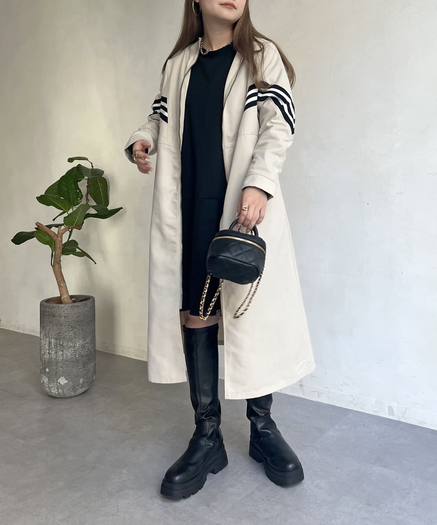 配色テープがアクセントになるスタンドネックロングコート
