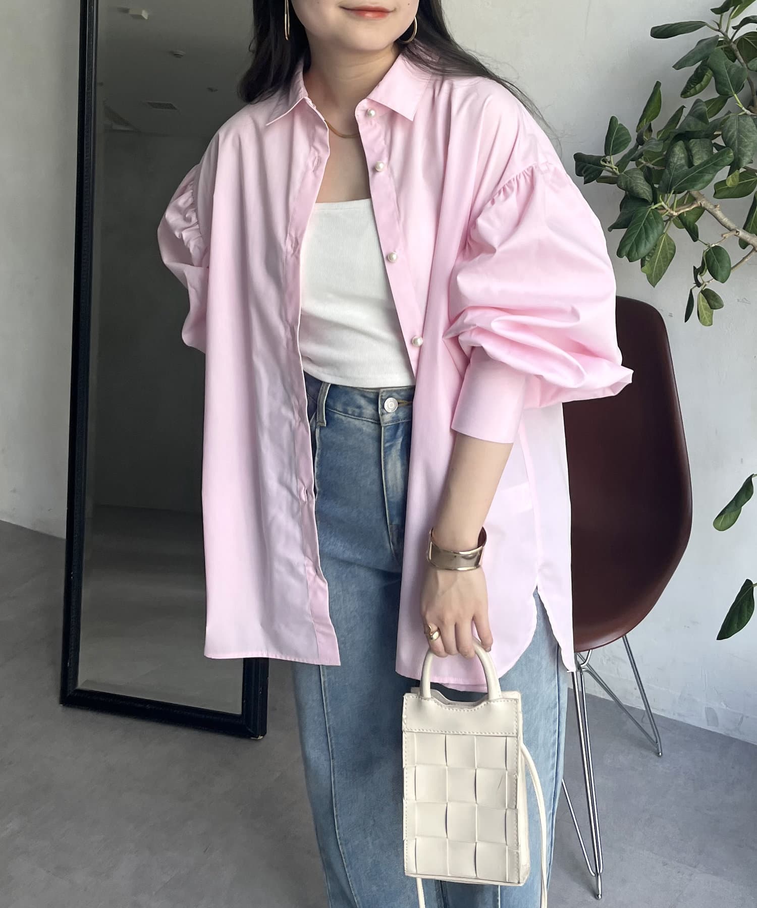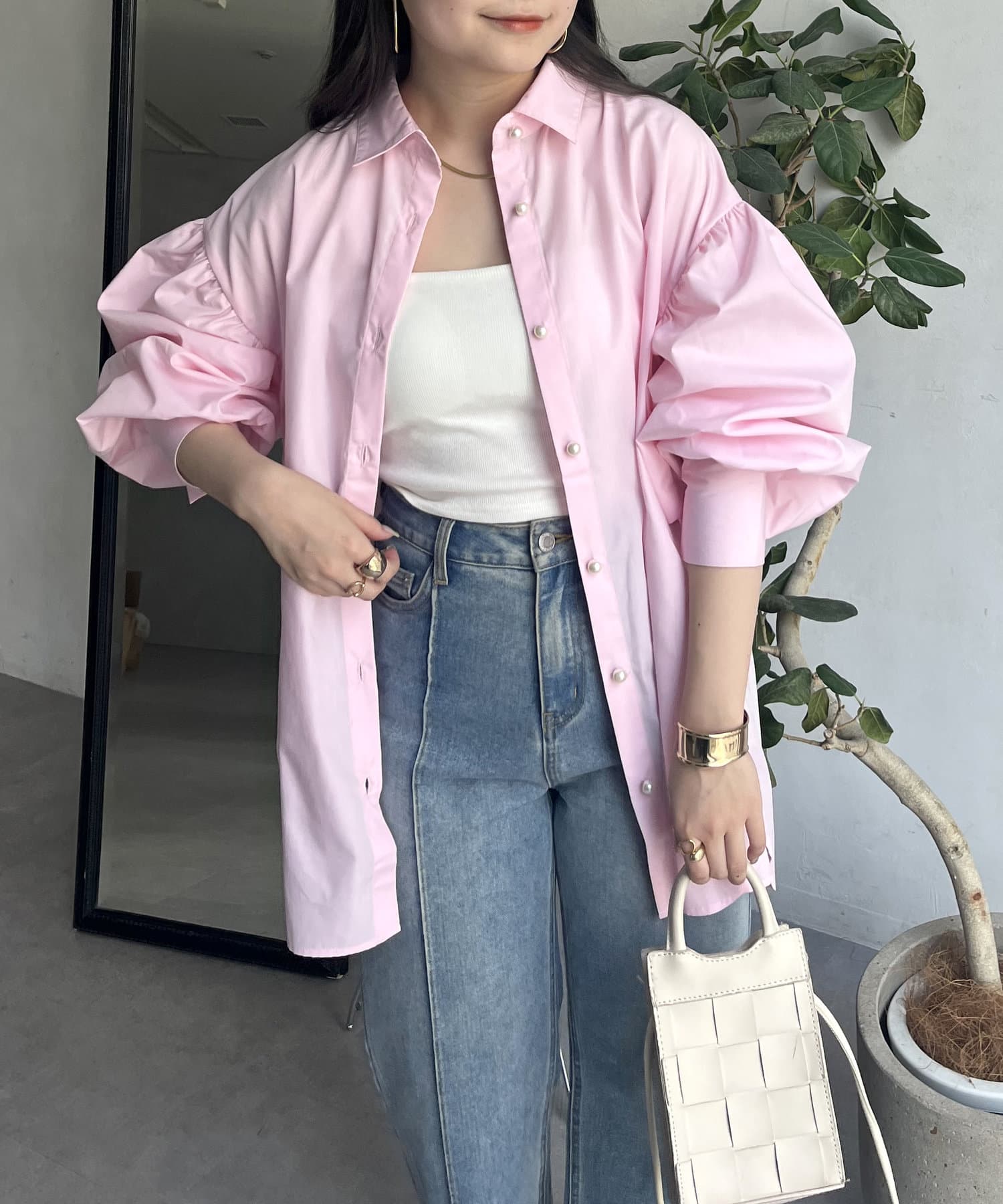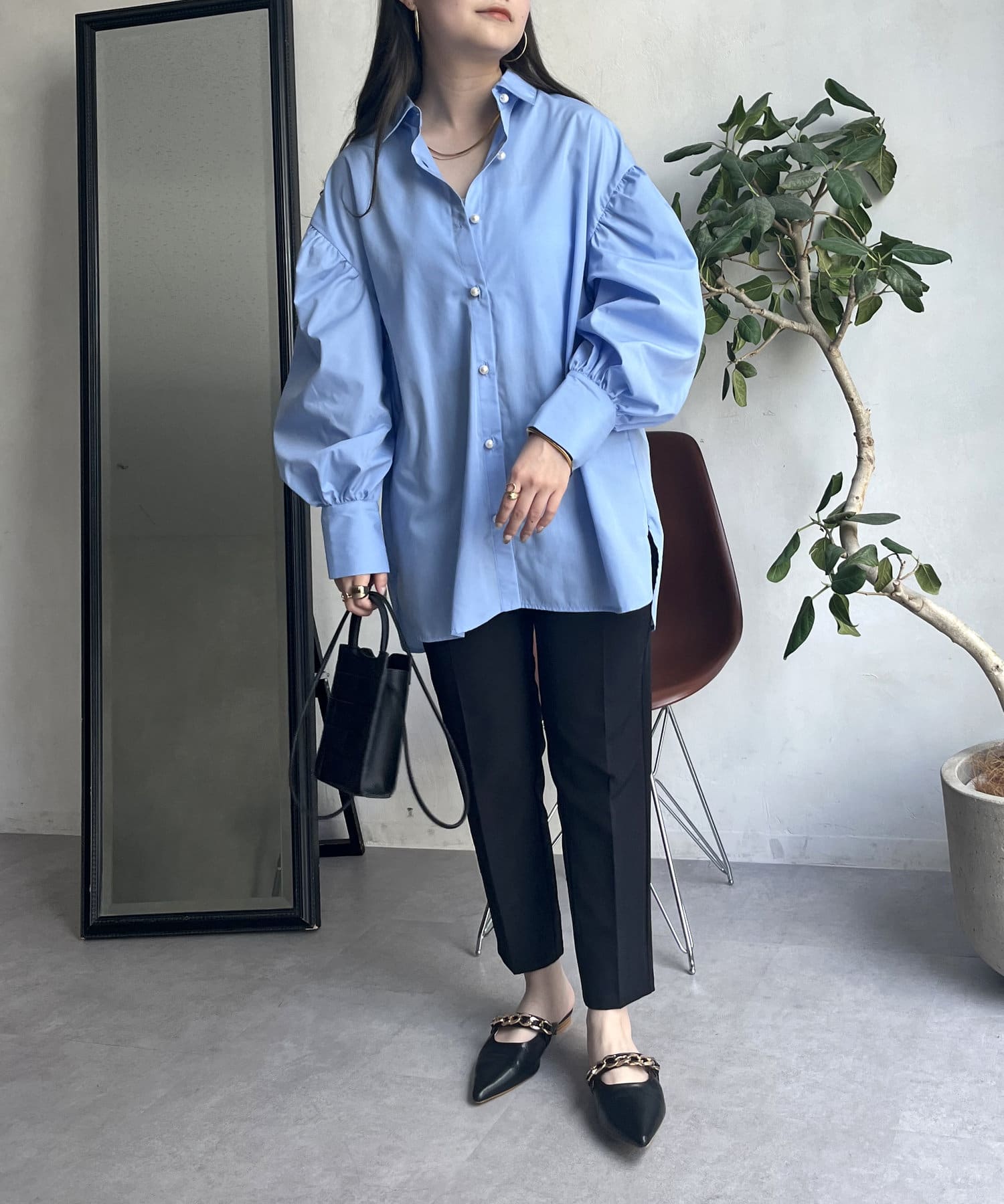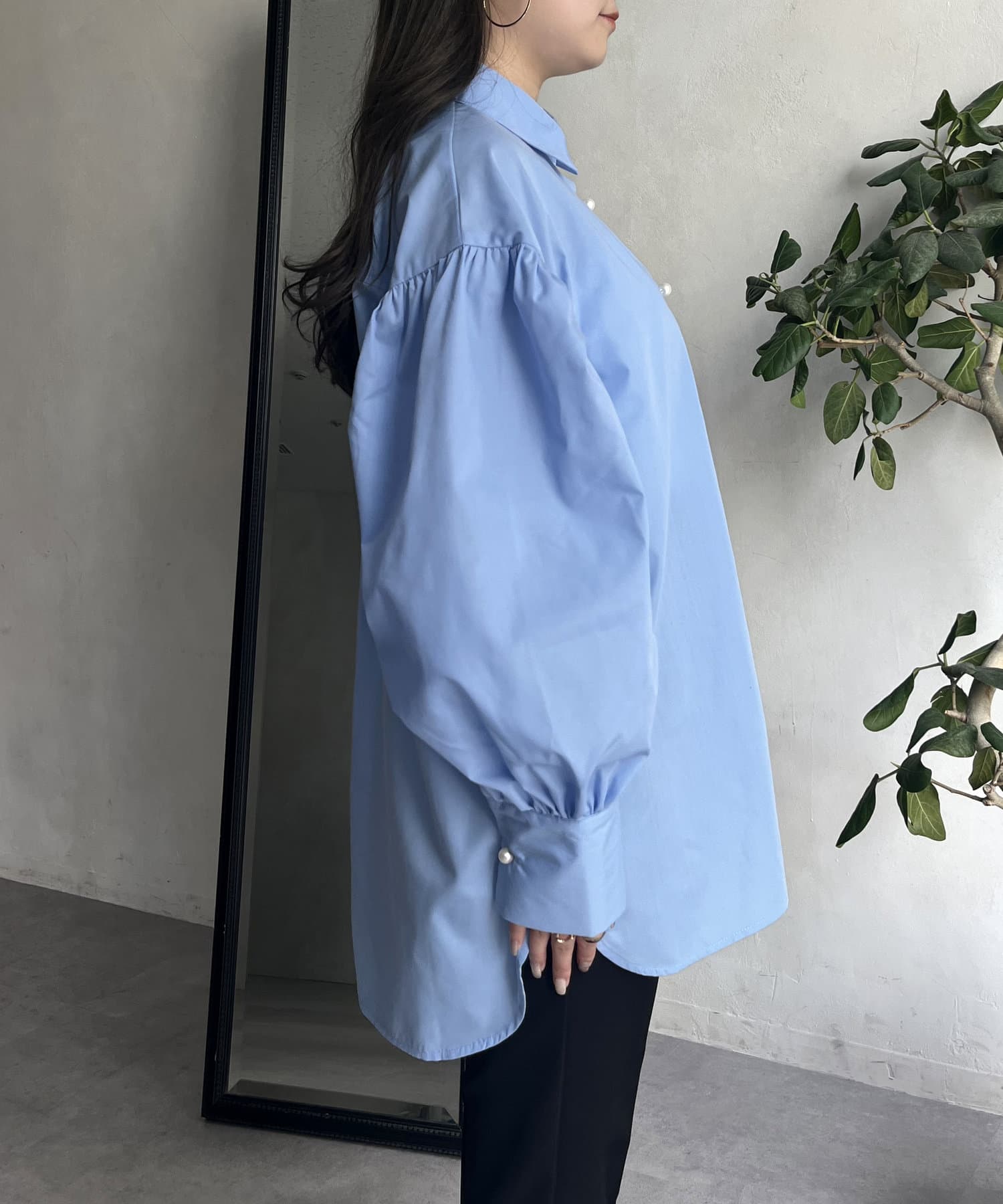 パールボタン袖ボリュームシャツ