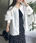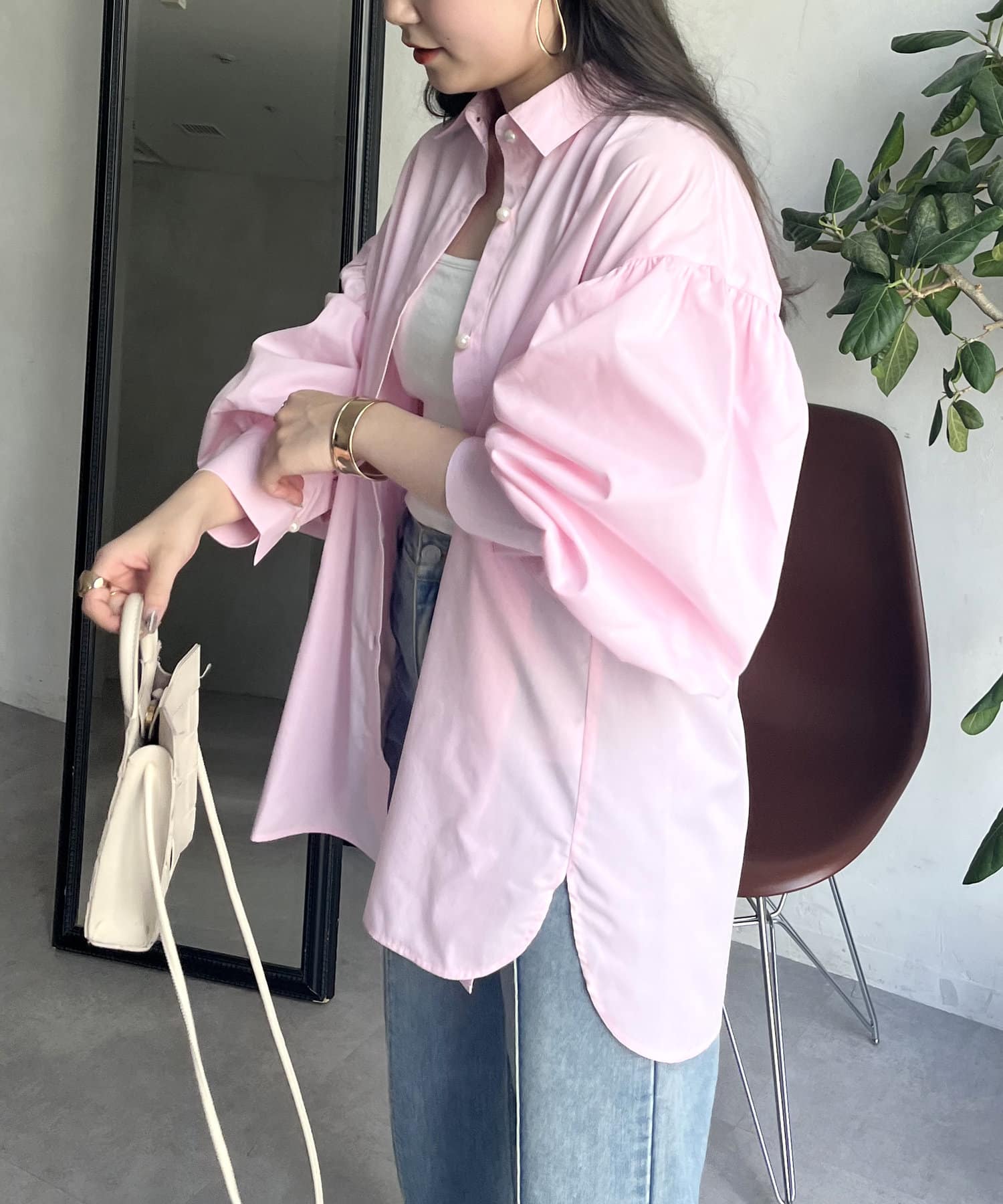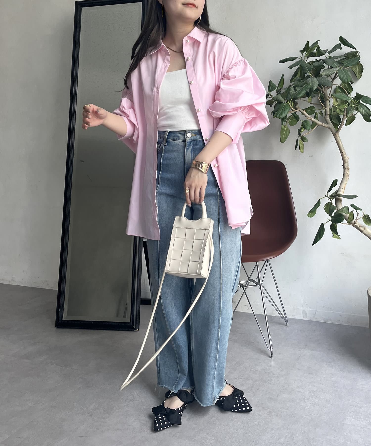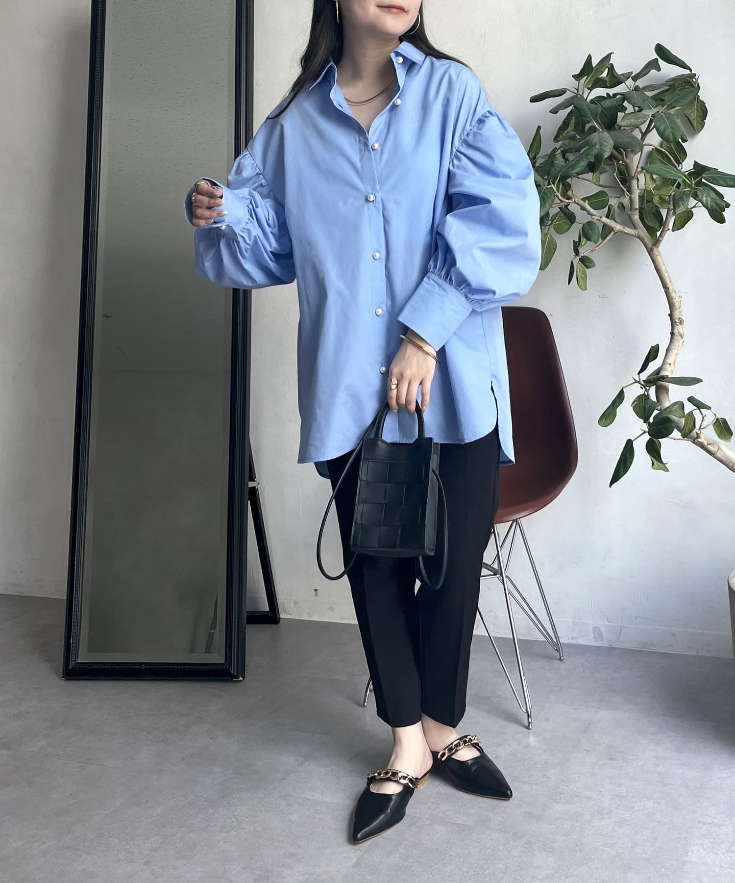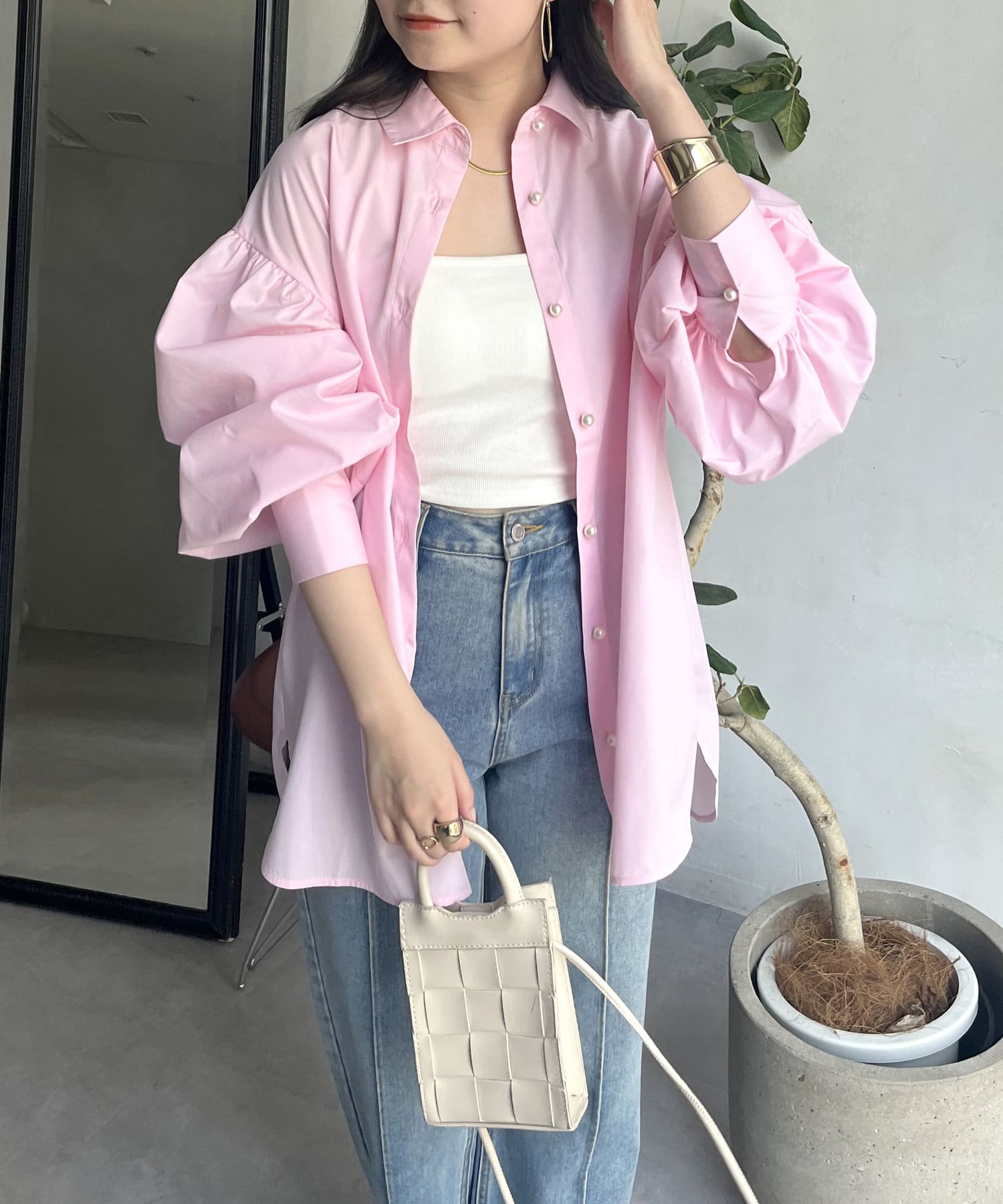 パールボタン袖ボリュームシャツ