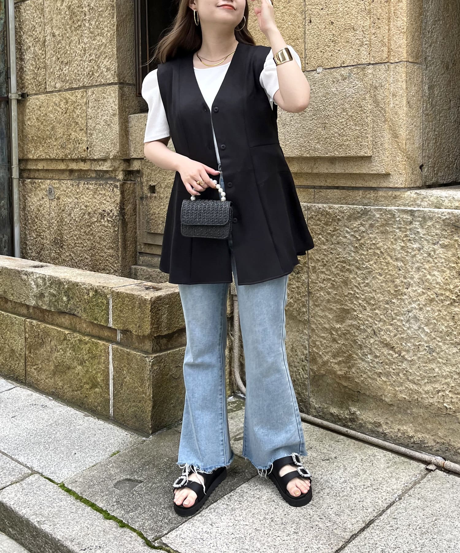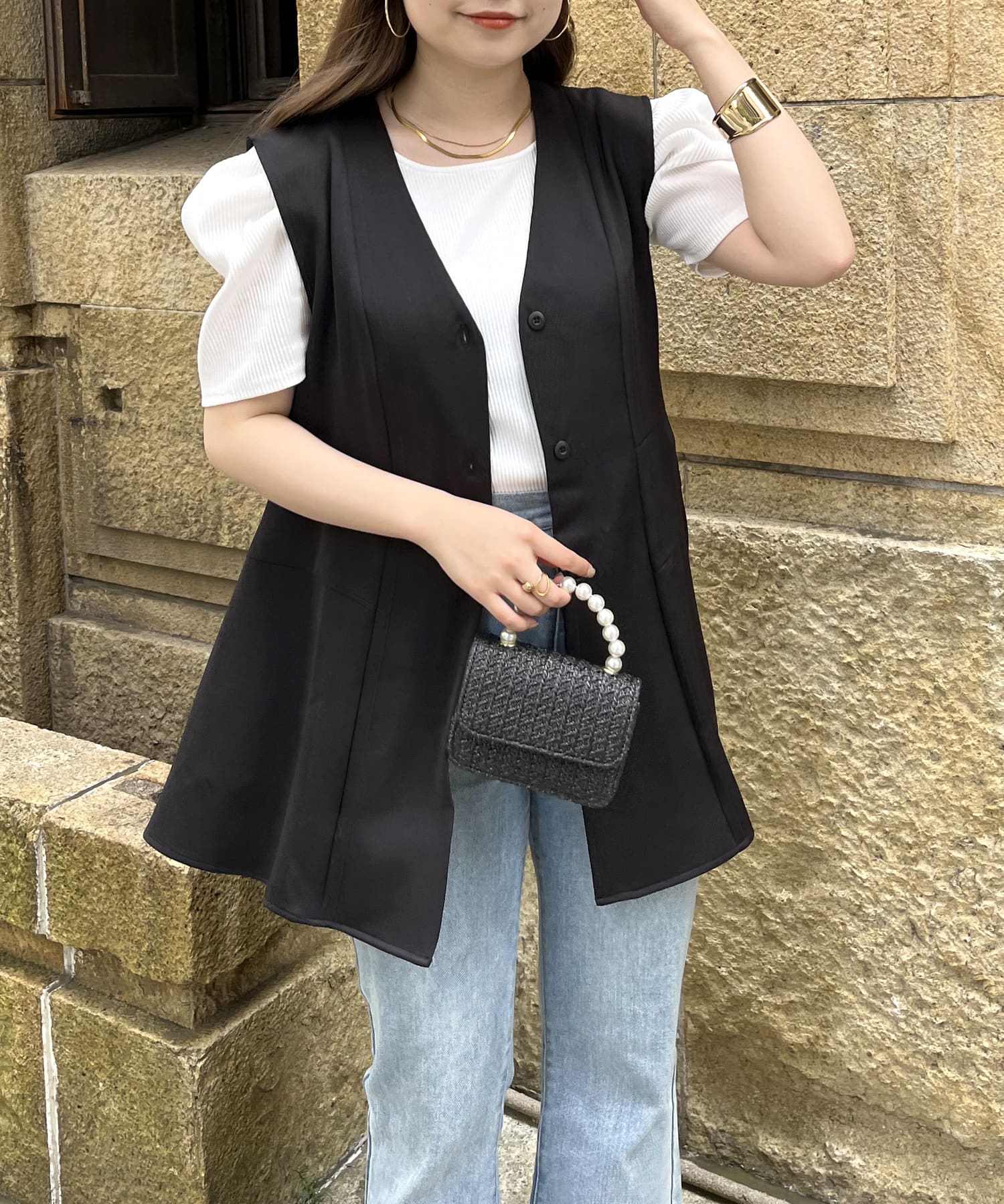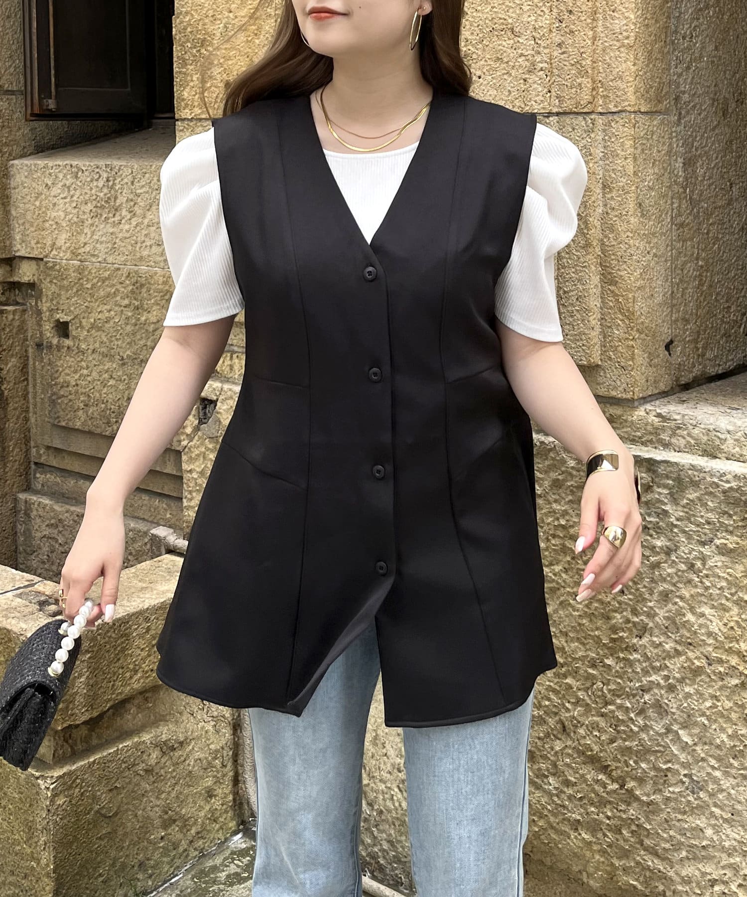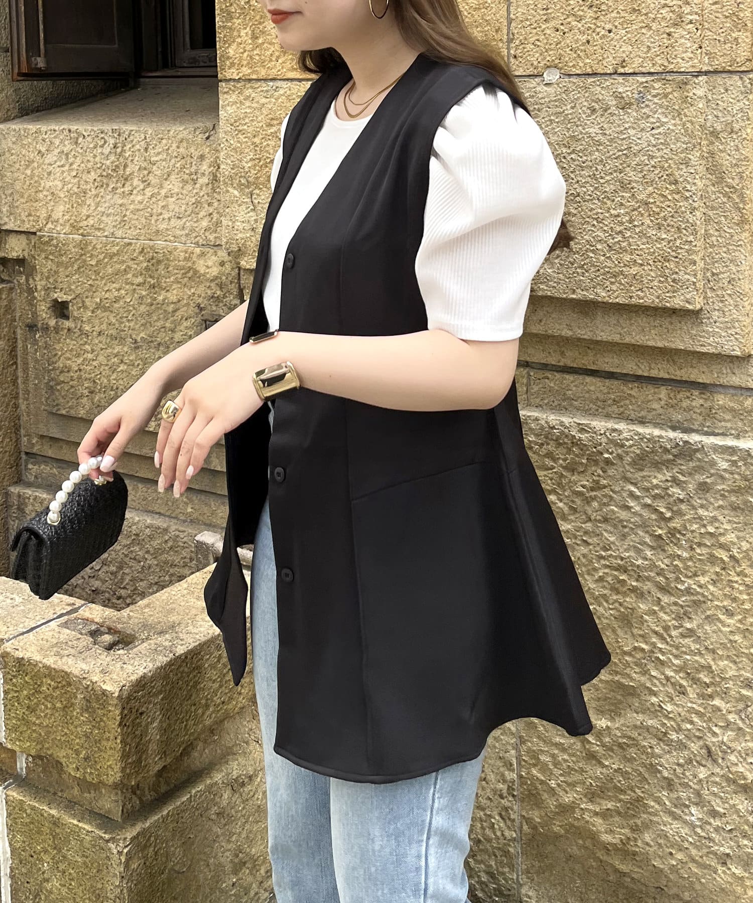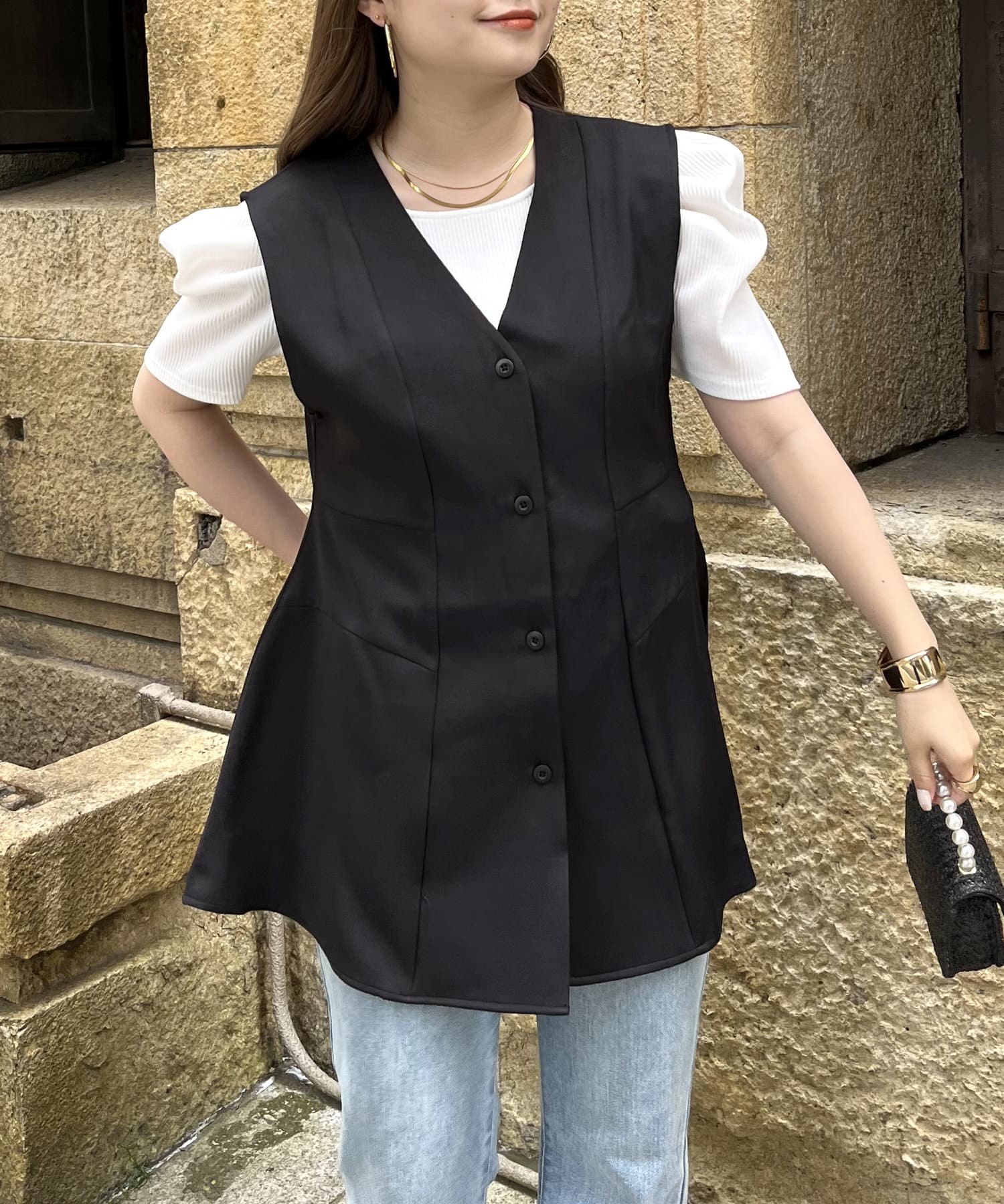 ウエストマークしてくれるVネックペプラムジレ