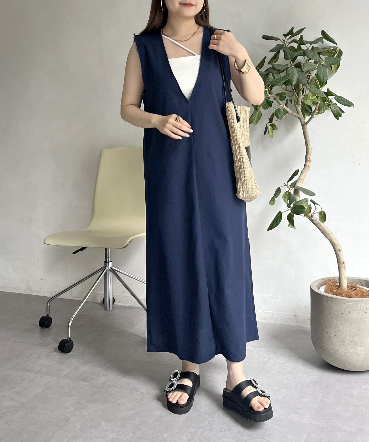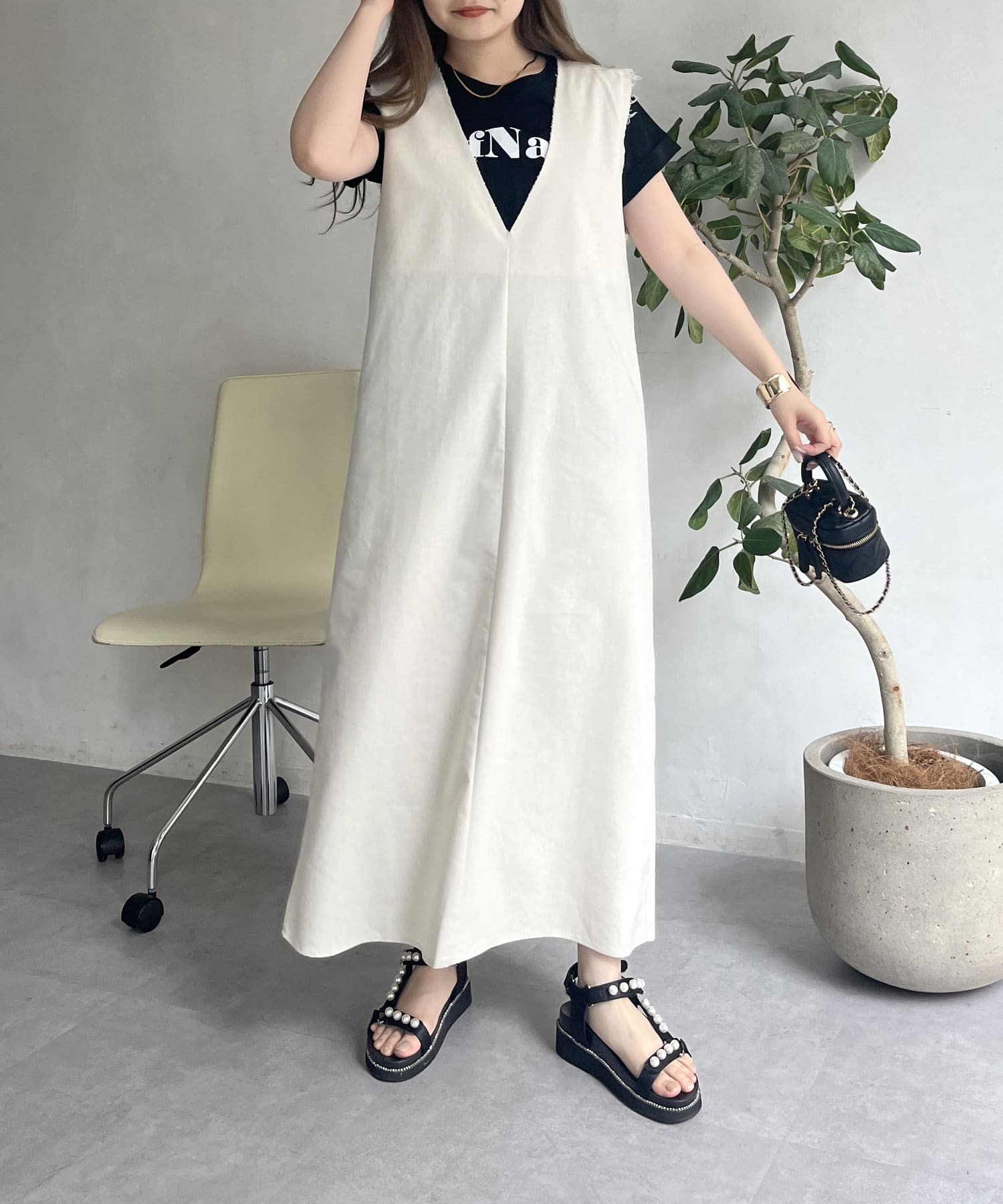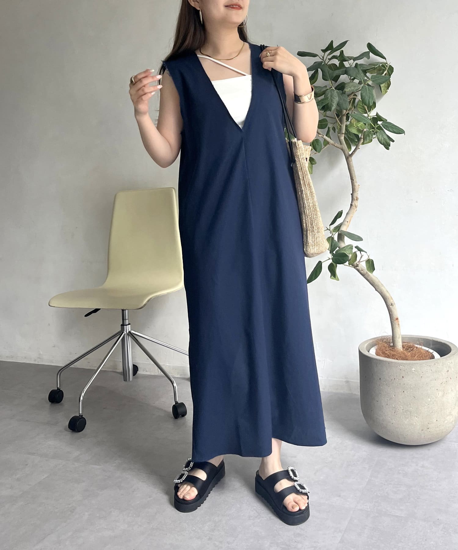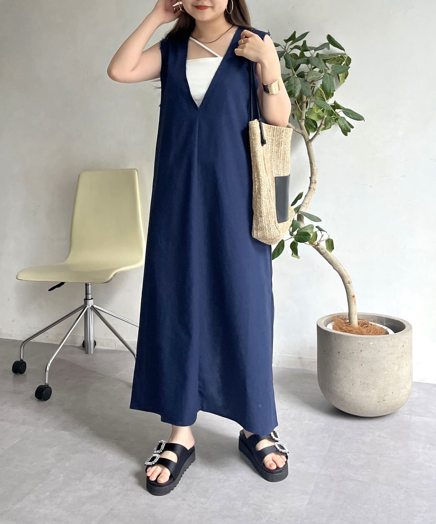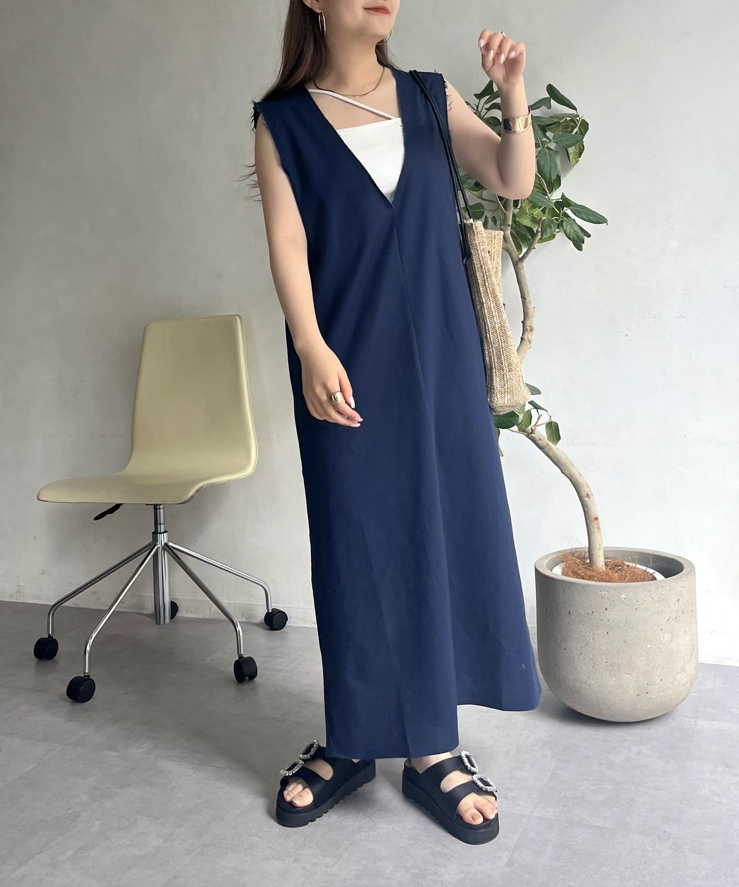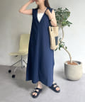 コットンリネン深Vネックワンピース