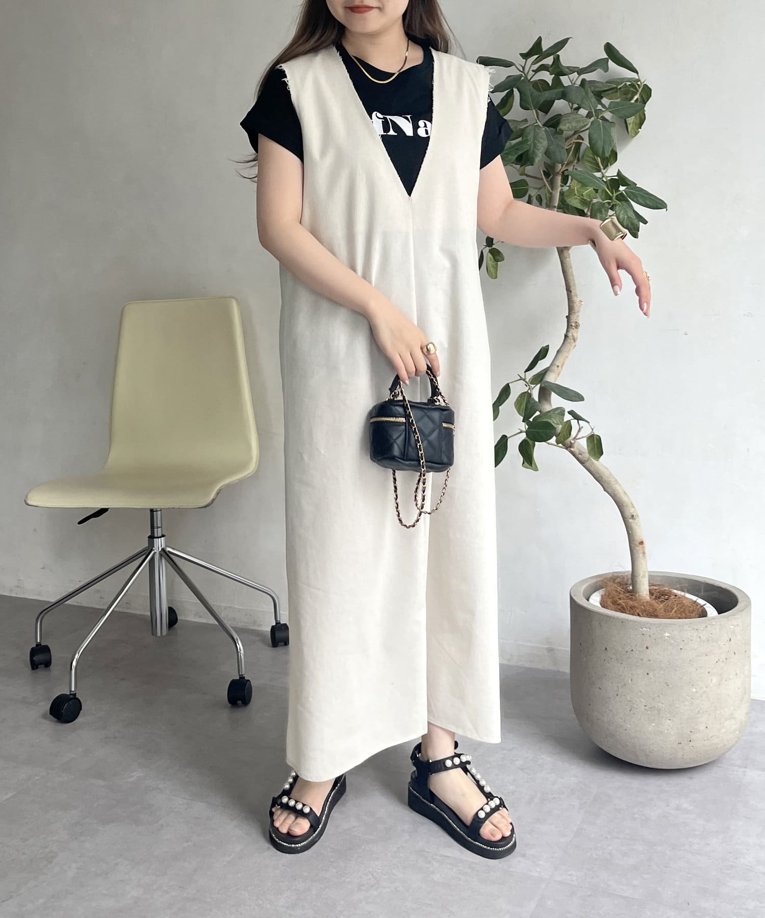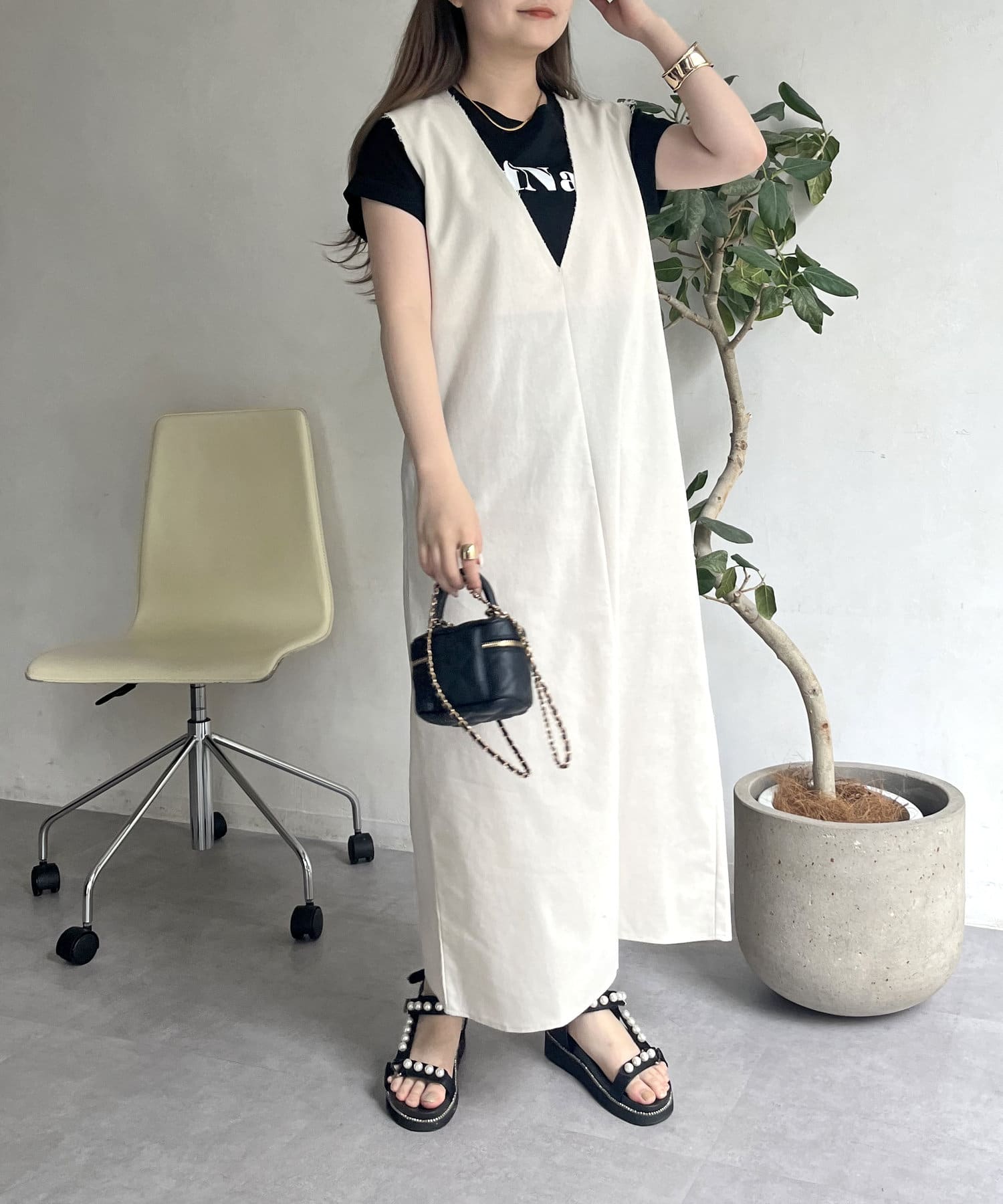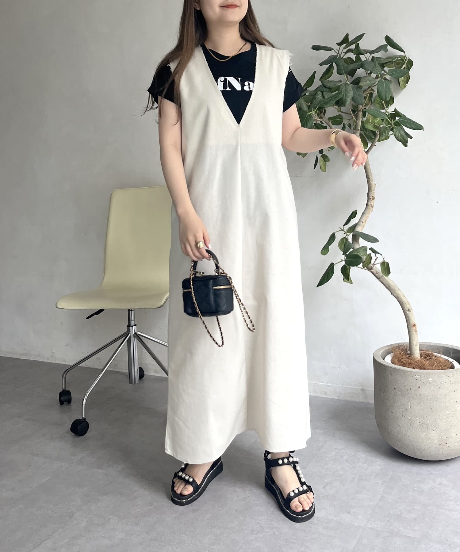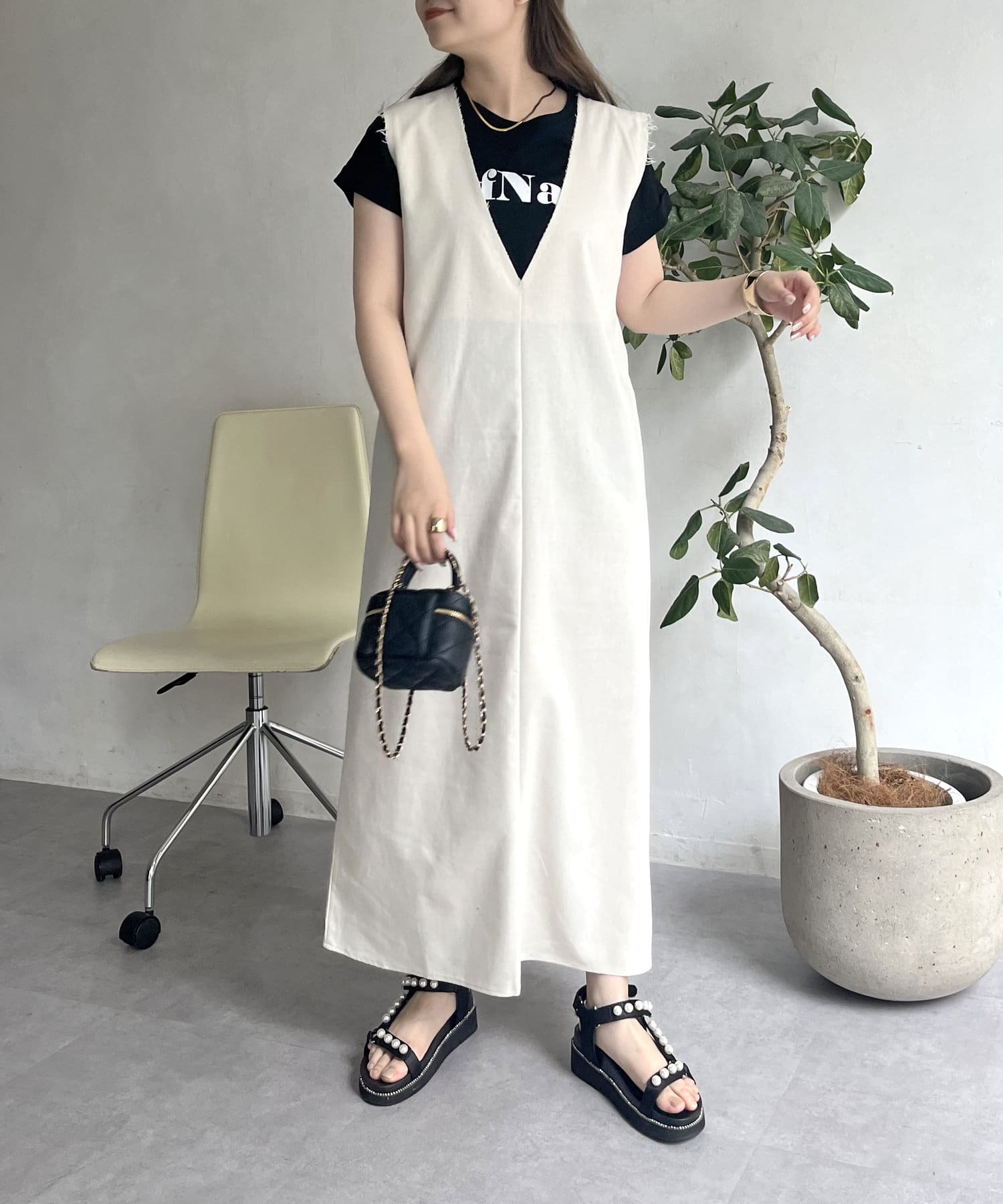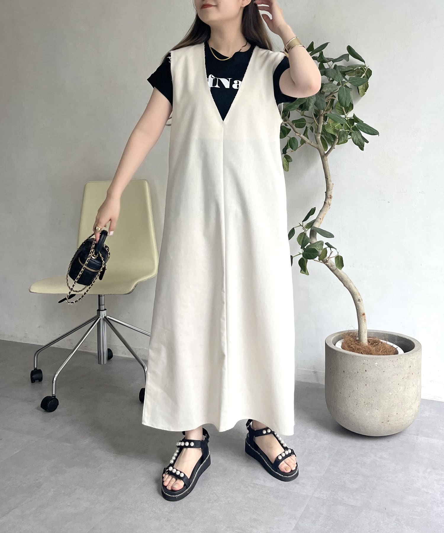 コットンリネン深Vネックワンピース