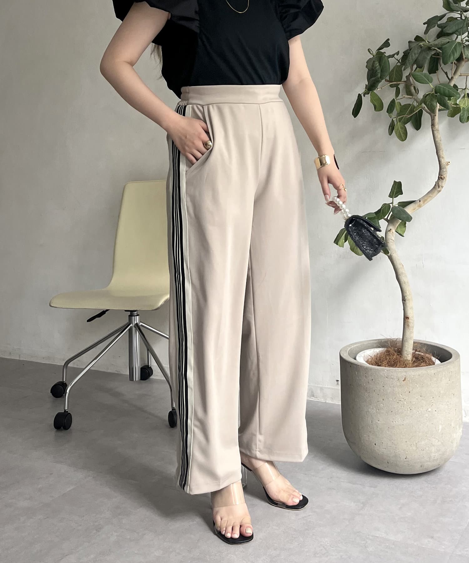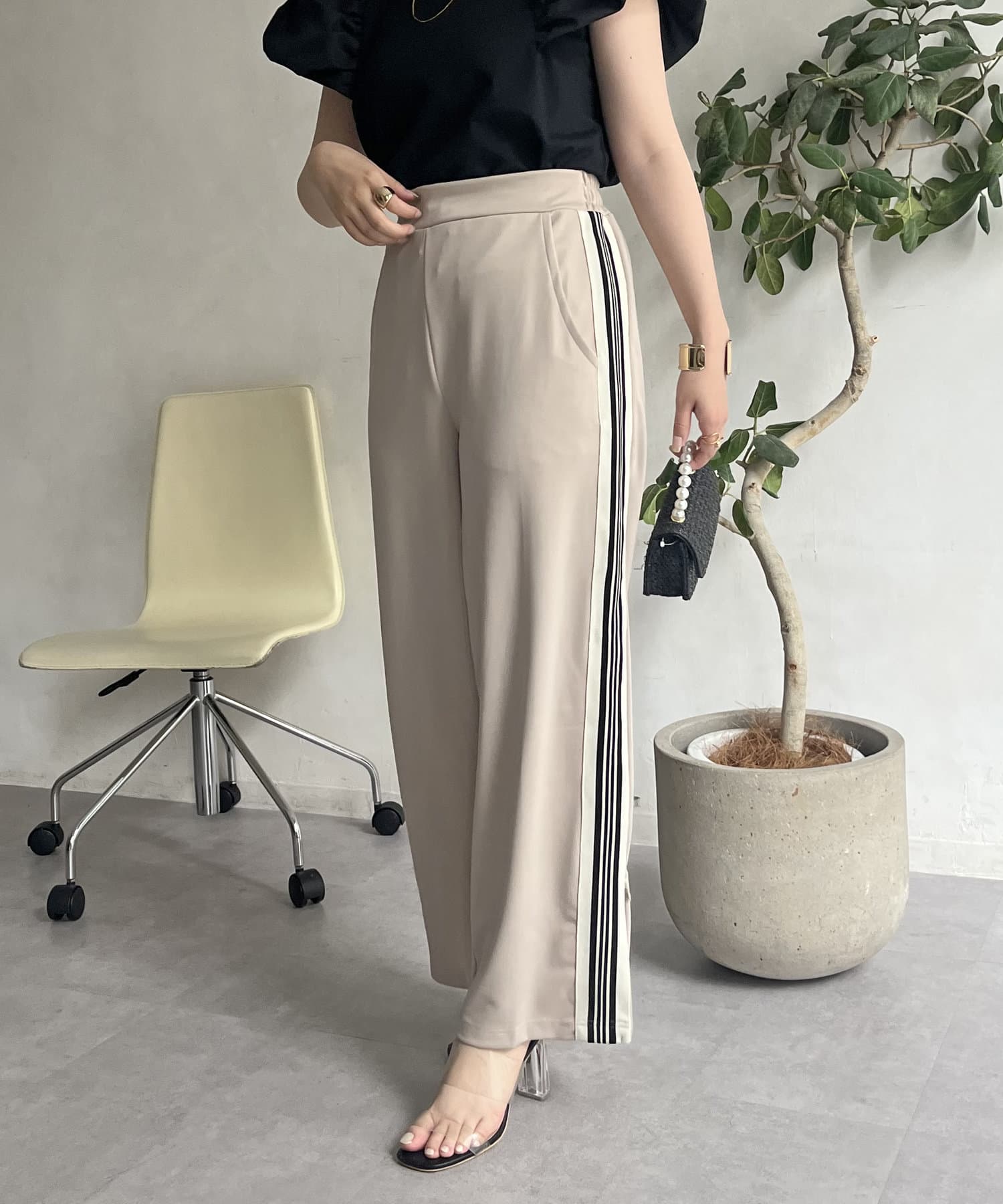 サイドラインがアクセントになるストレッチセンタープレスラインパンツ