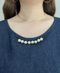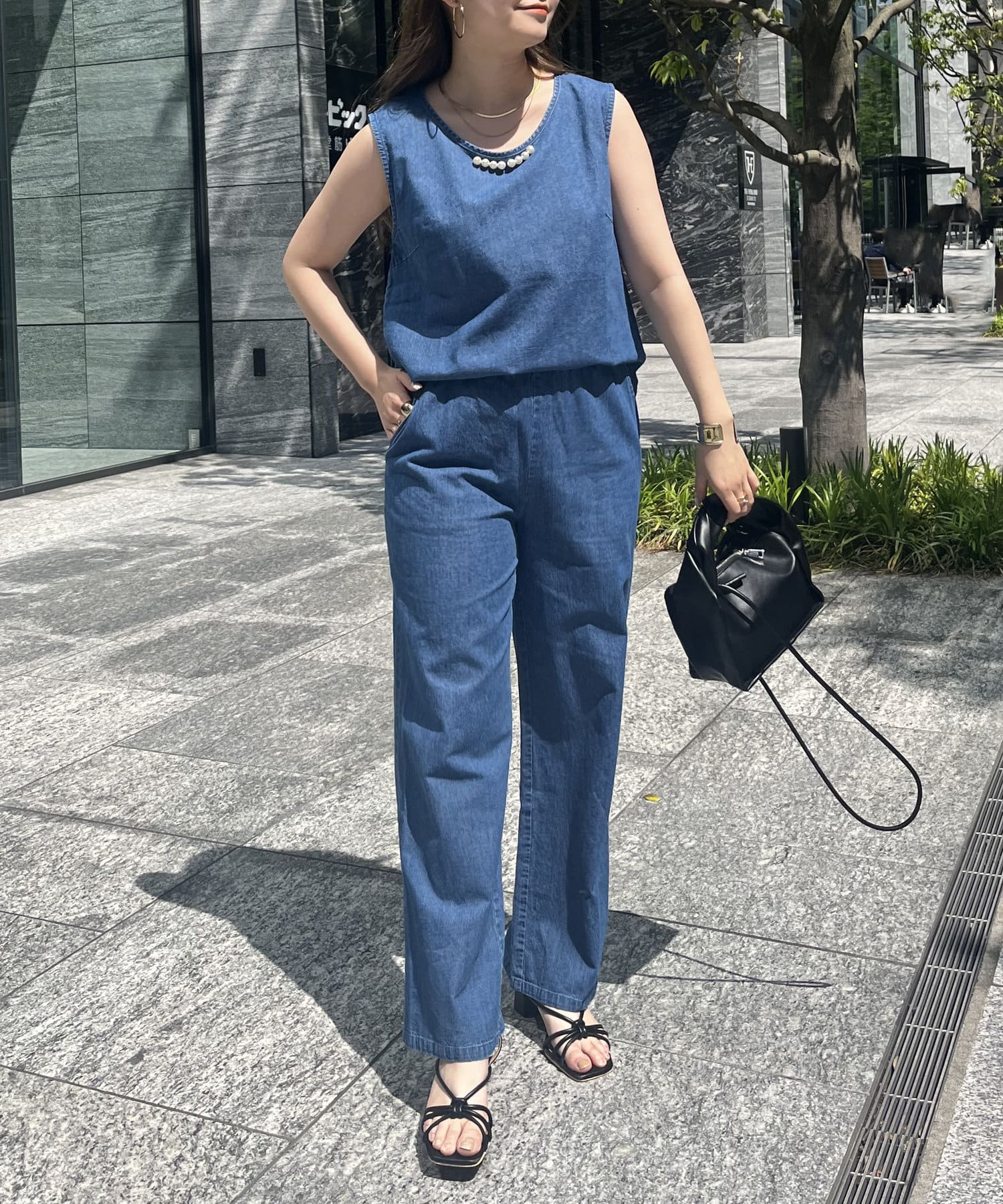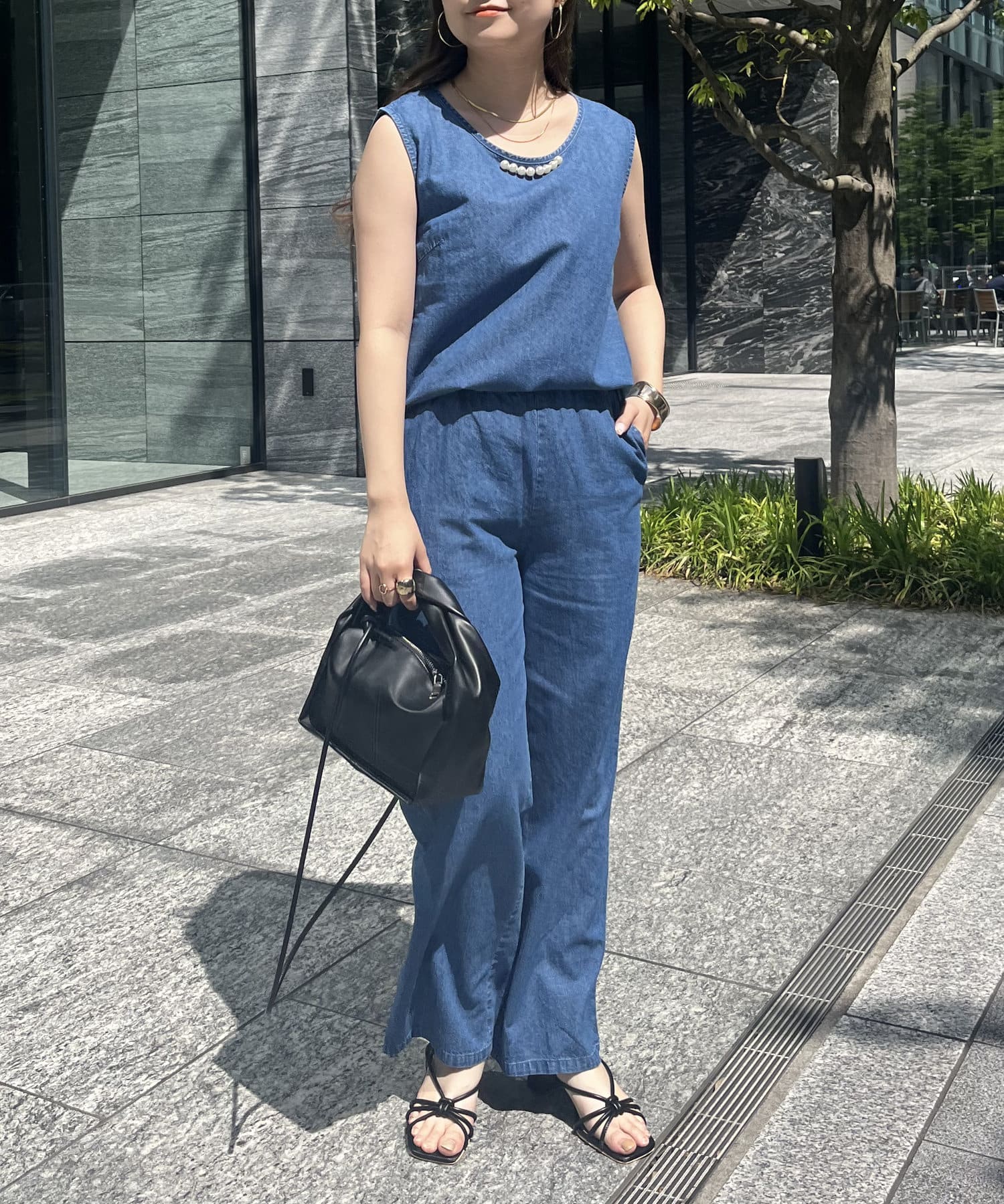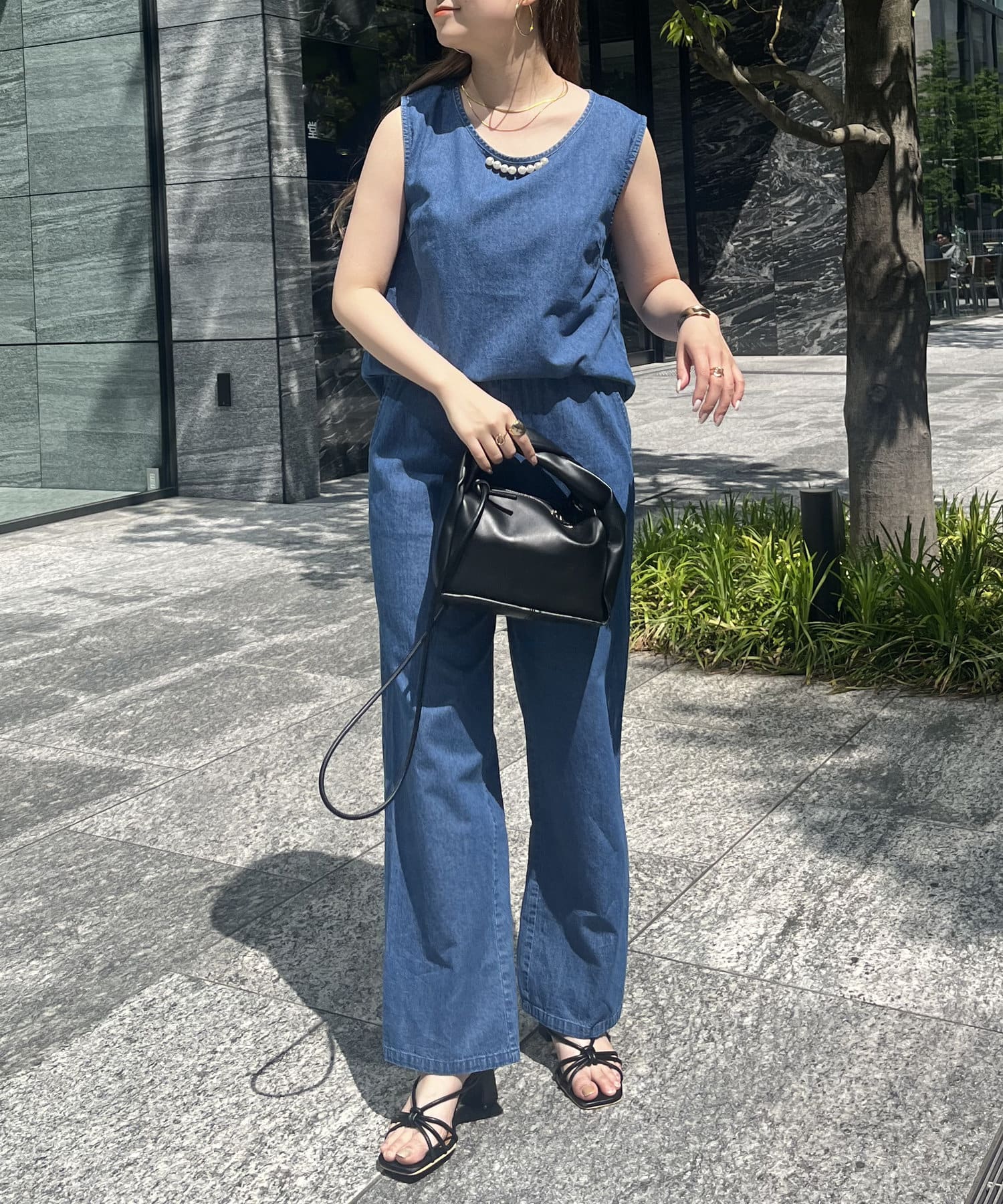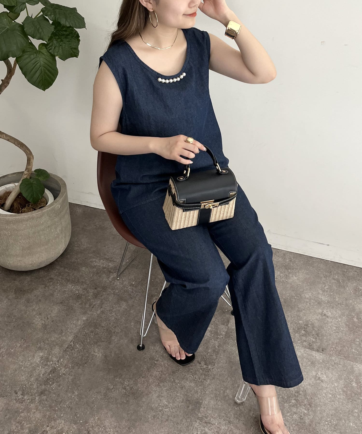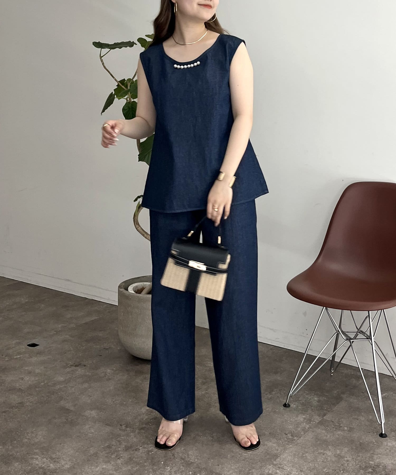 パールがアクセントになるリネン混デニムセットアップ