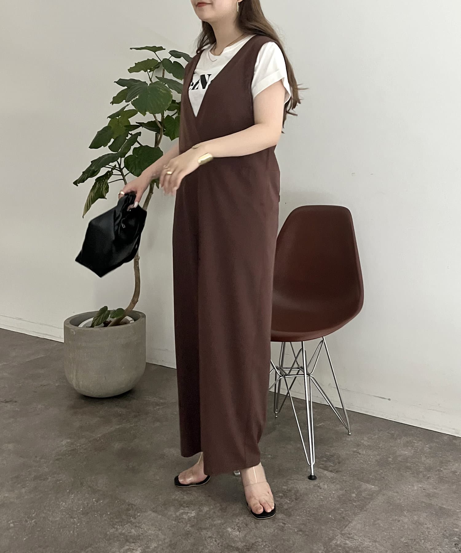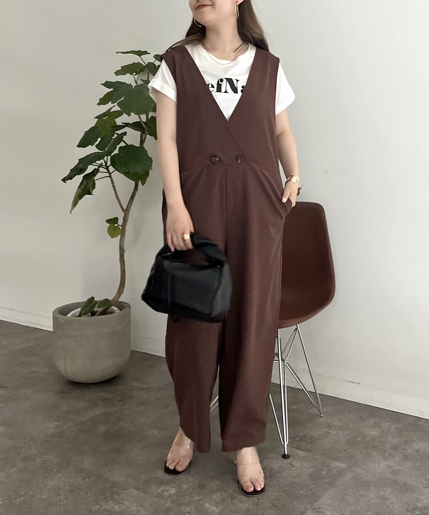 ゆったりとリラックス感のあるフロントボタンオールインワン