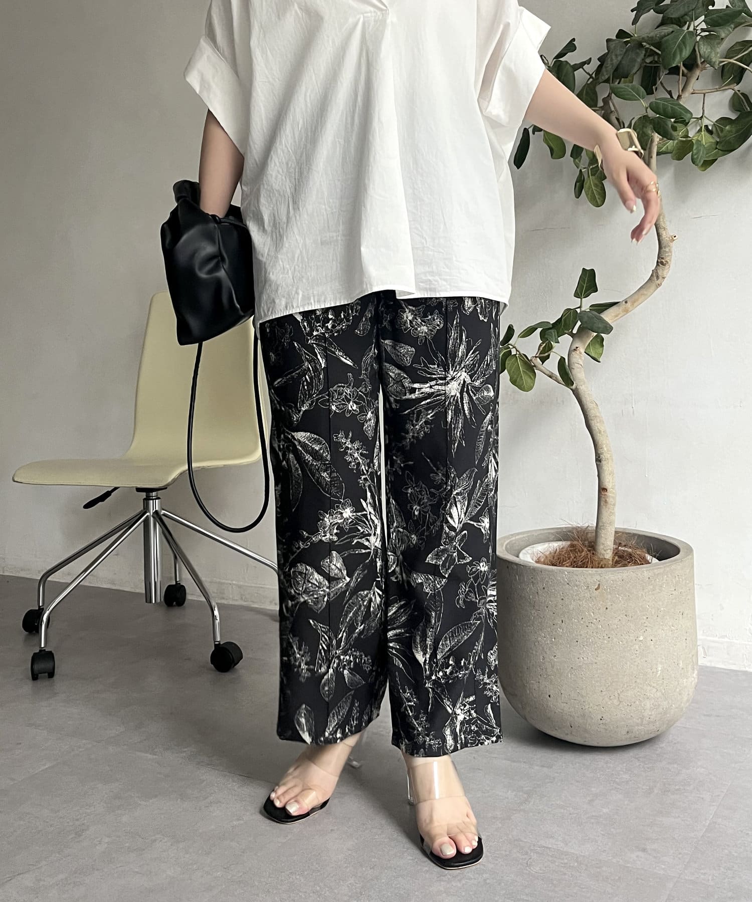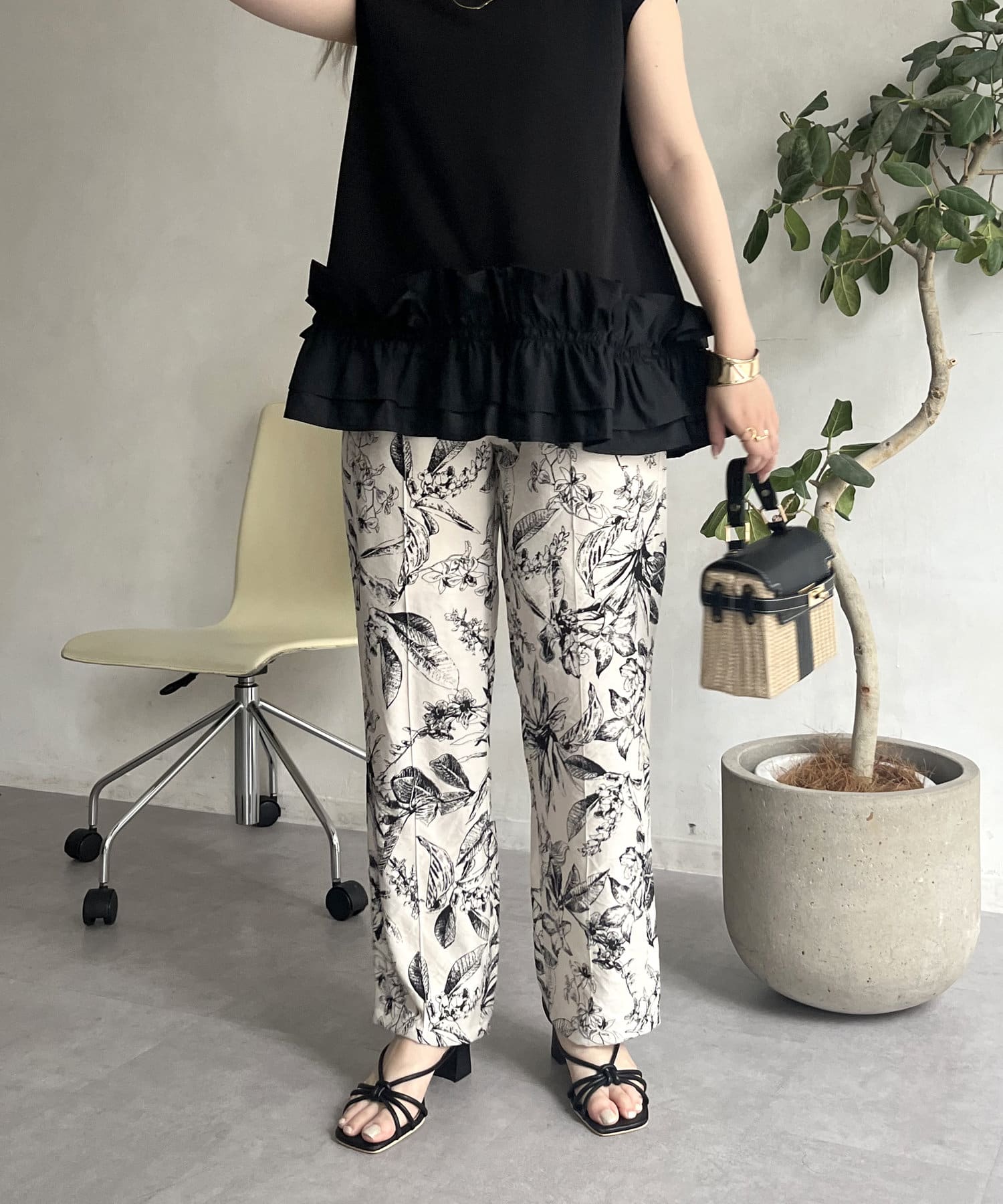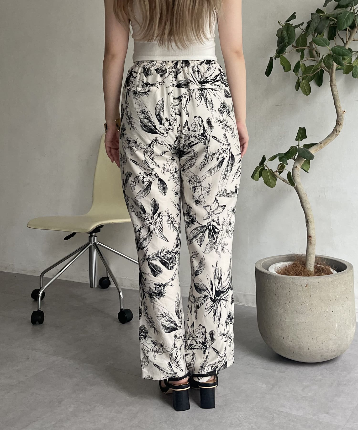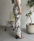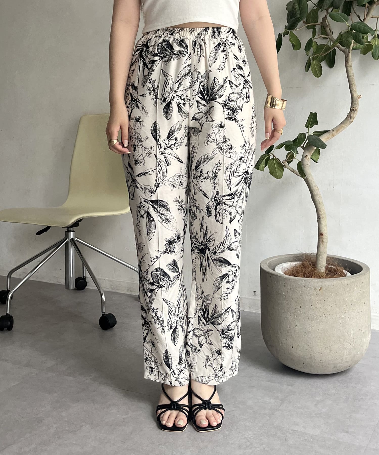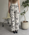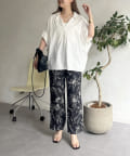 コーディネートのアクセントになるボタニカル柄イージーパンツ