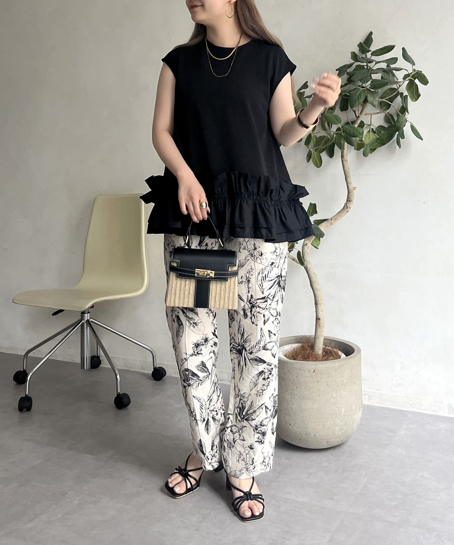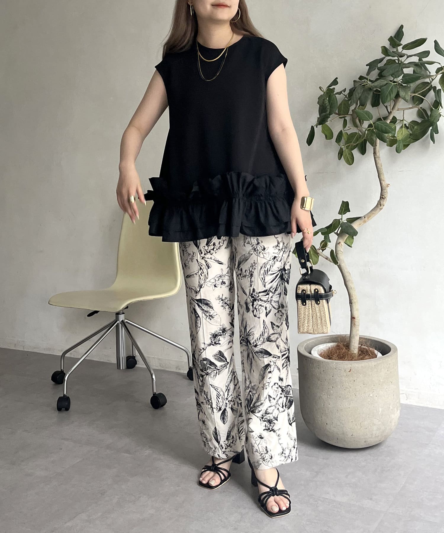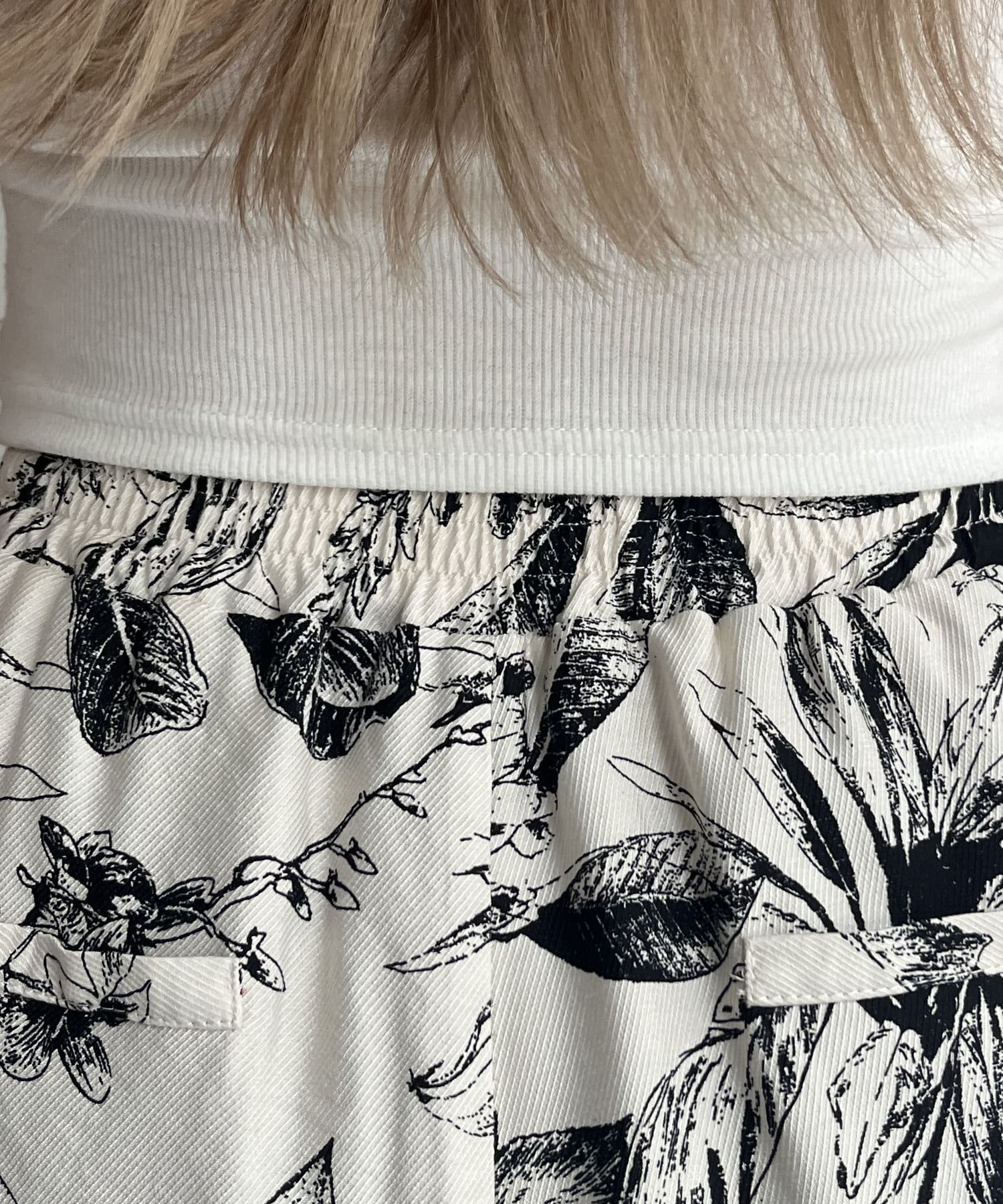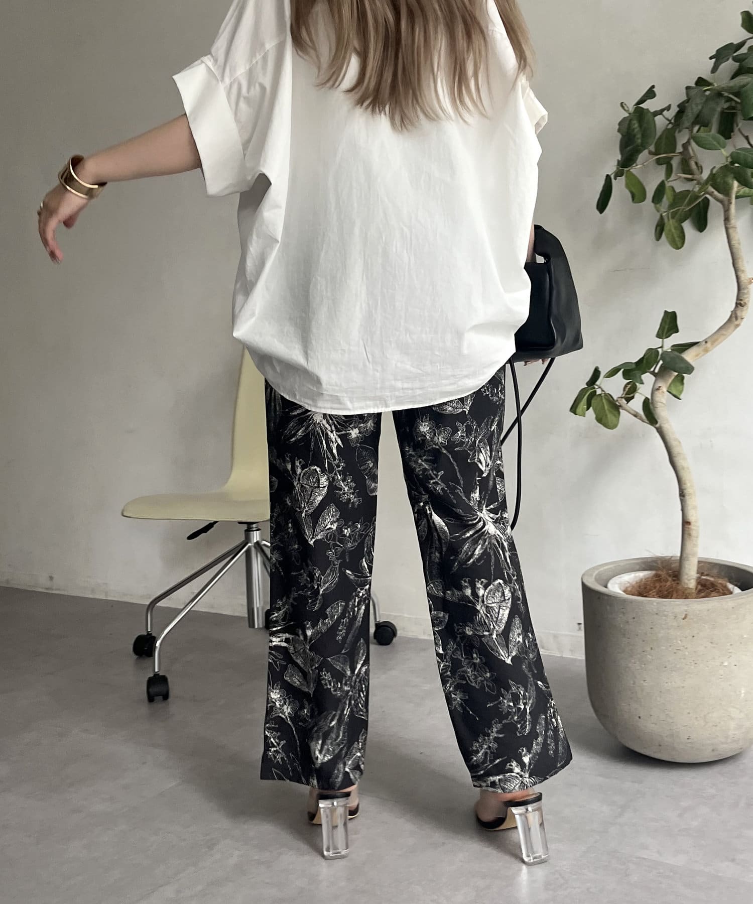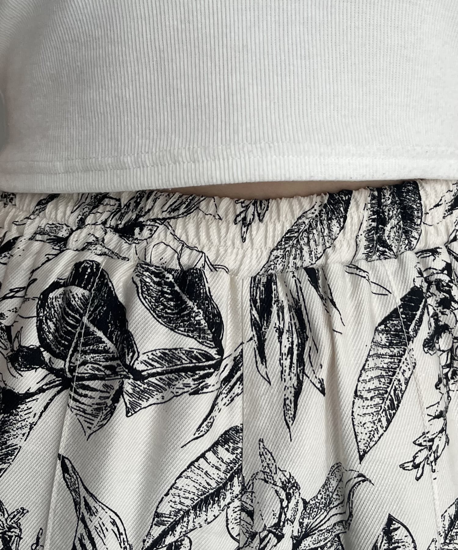 コーディネートのアクセントになるボタニカル柄イージーパンツ