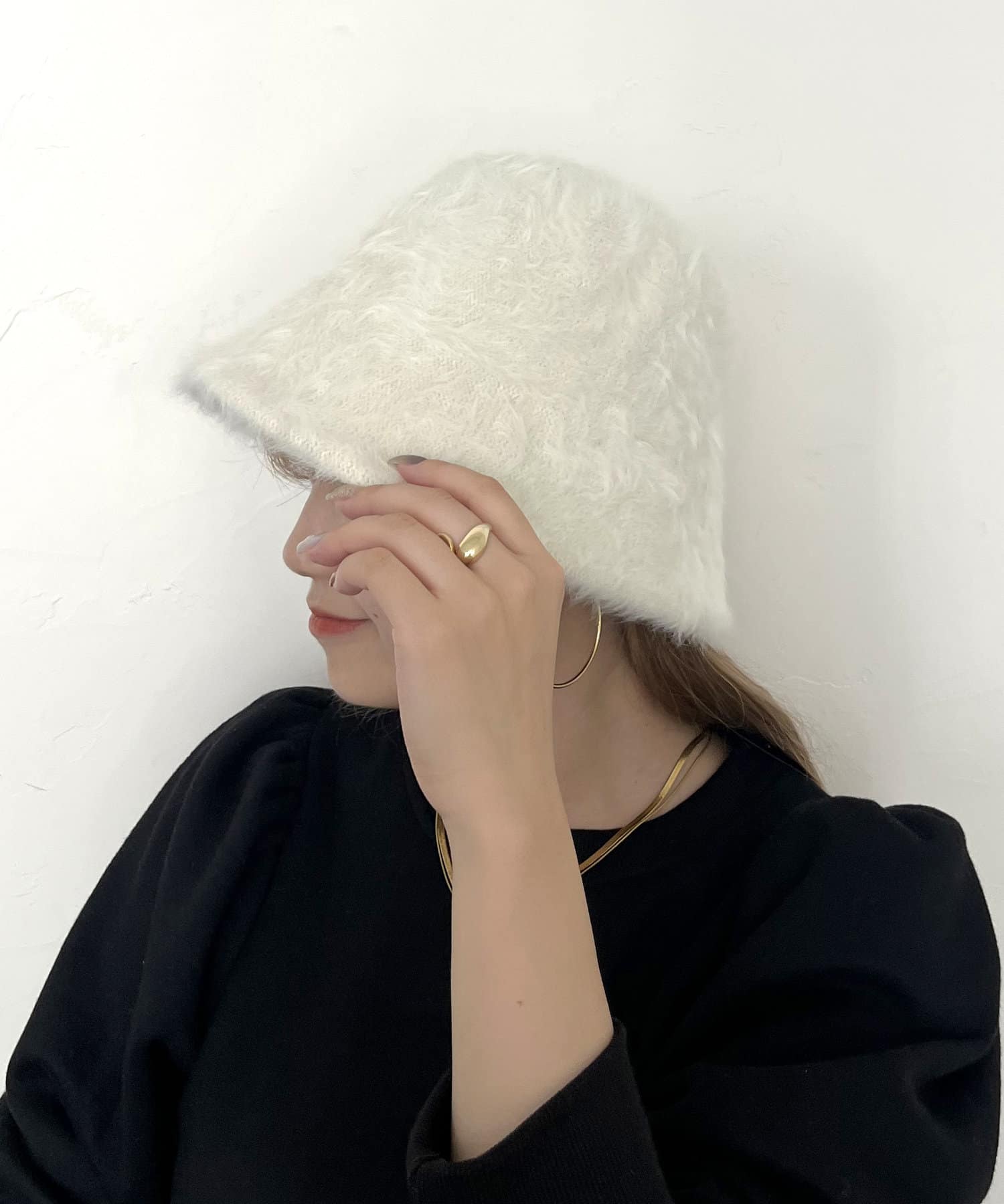 シャギー素材が女の子らしさあふれるバケットハット