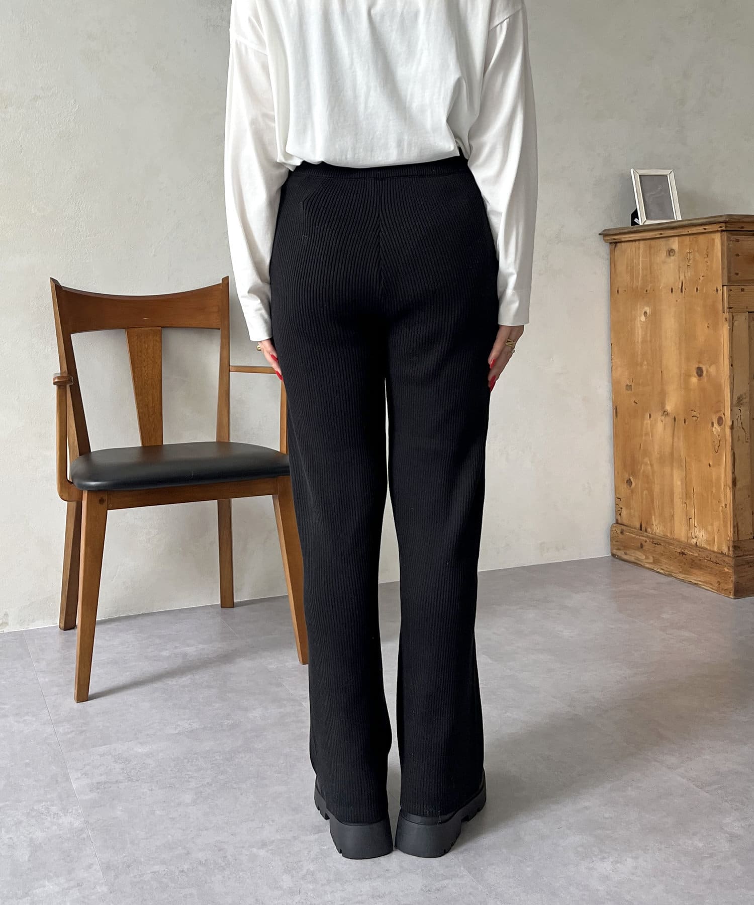 脚を細く魅せてくれるリブニットパンツ