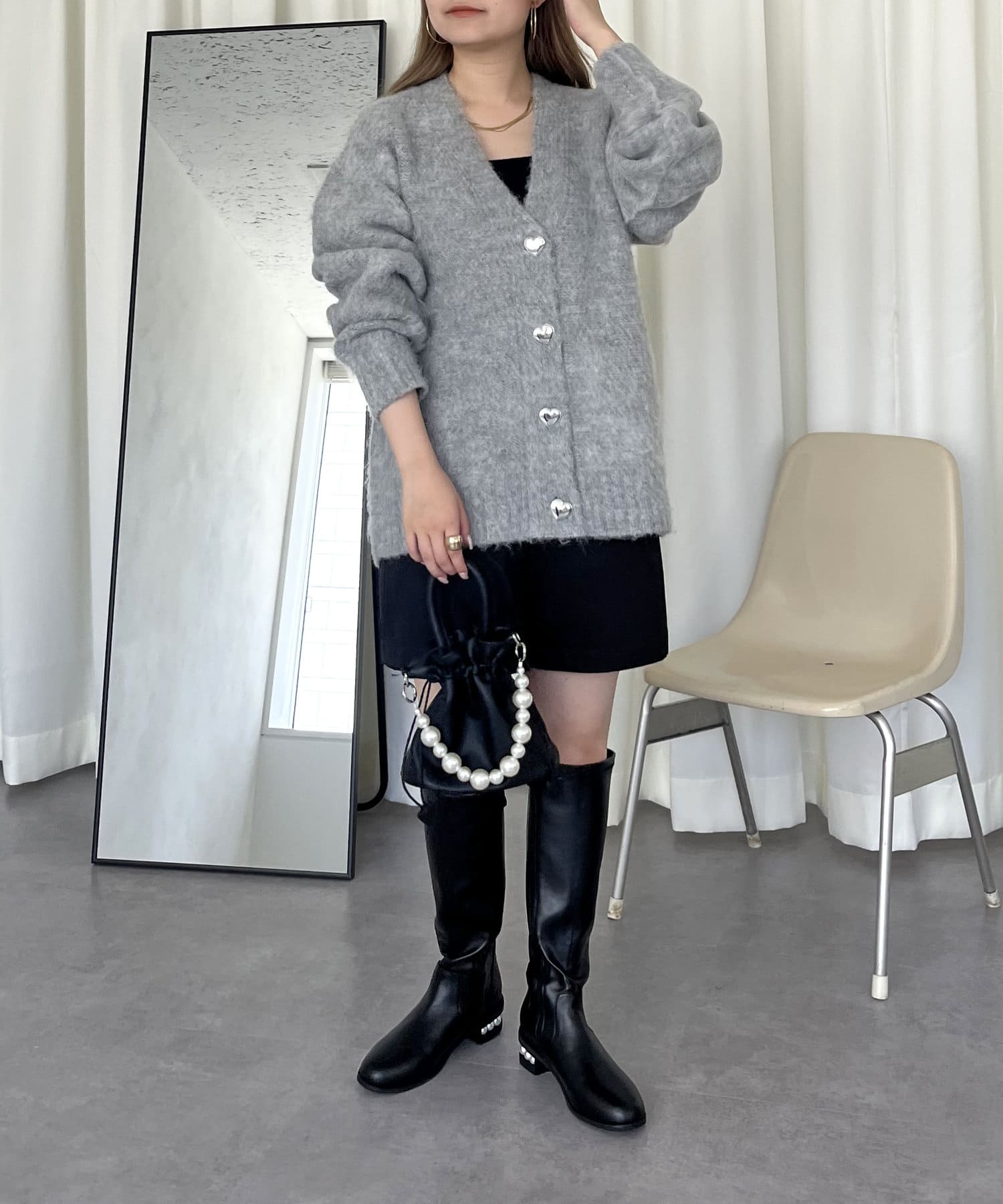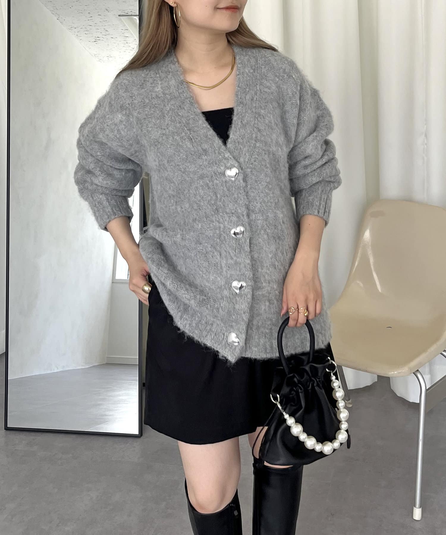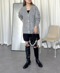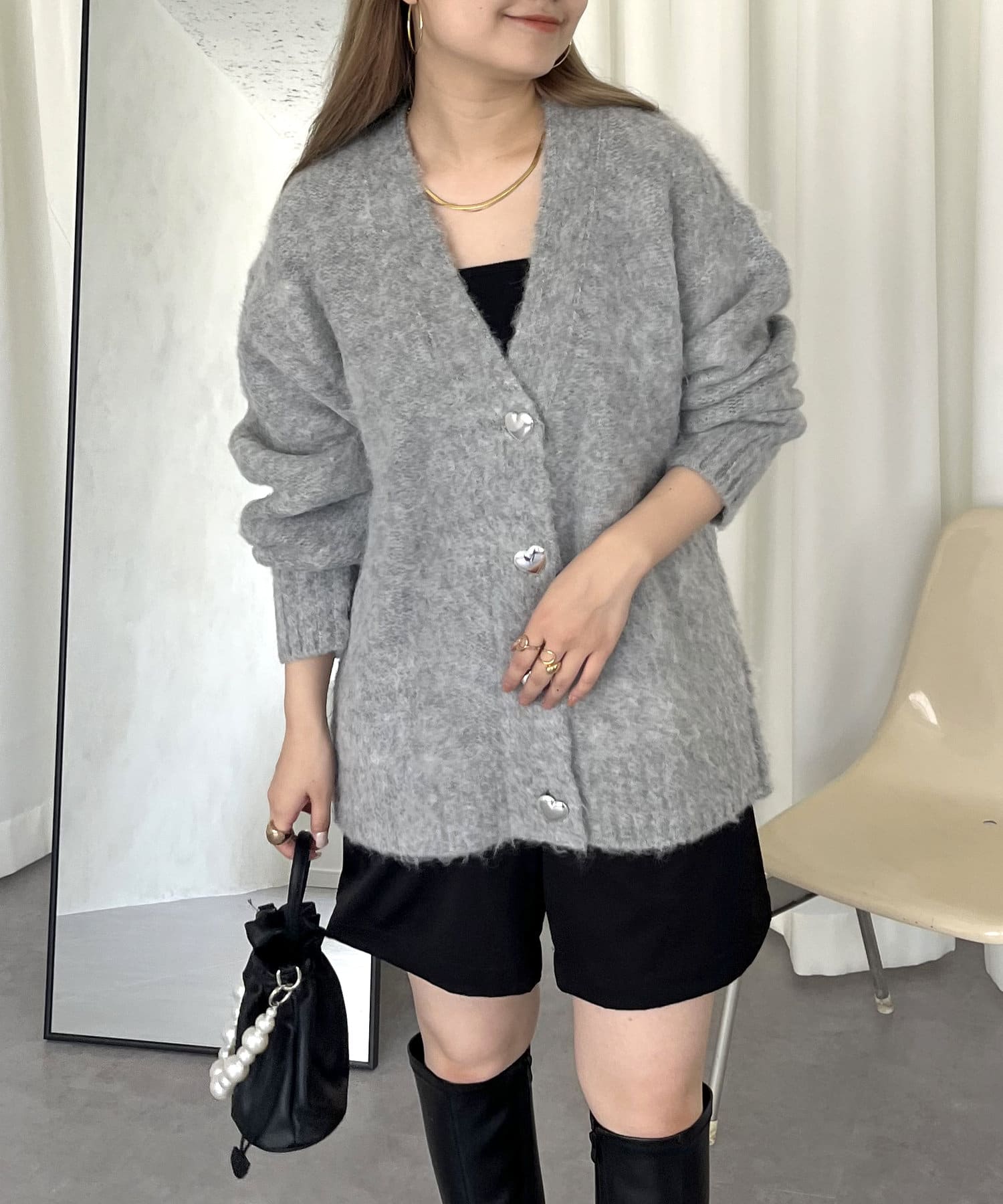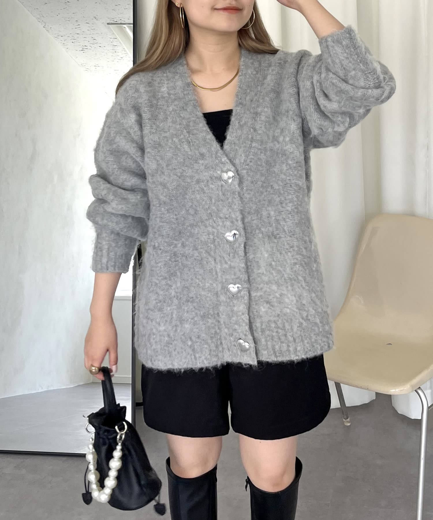 ハートボタンモヘアライクVニットカーデ