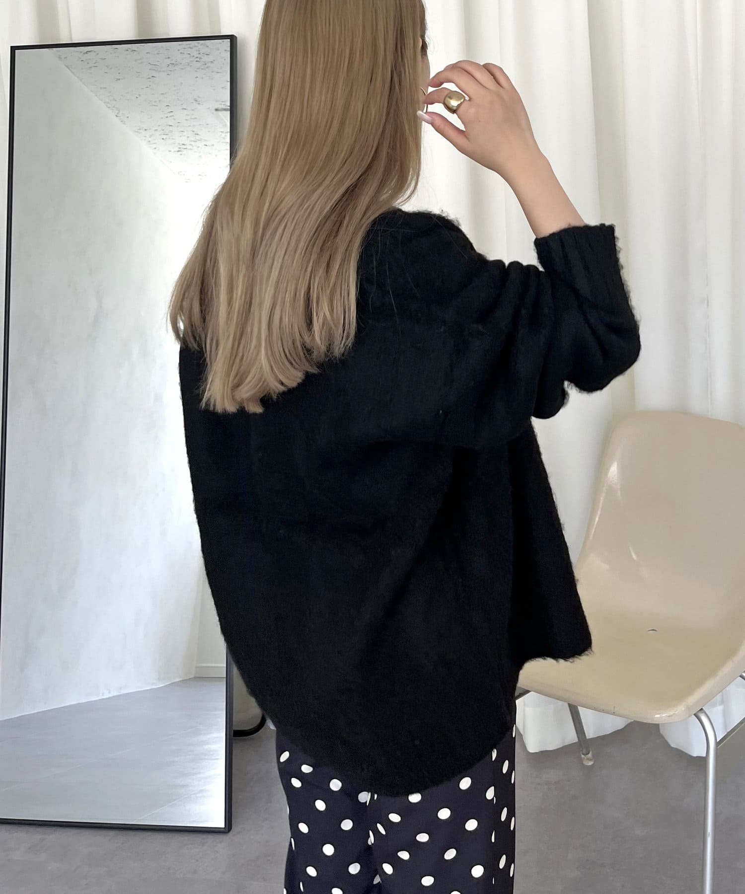 ​​​​​​●深いVネックがハイネックをレイヤードしてもスッキリ見え