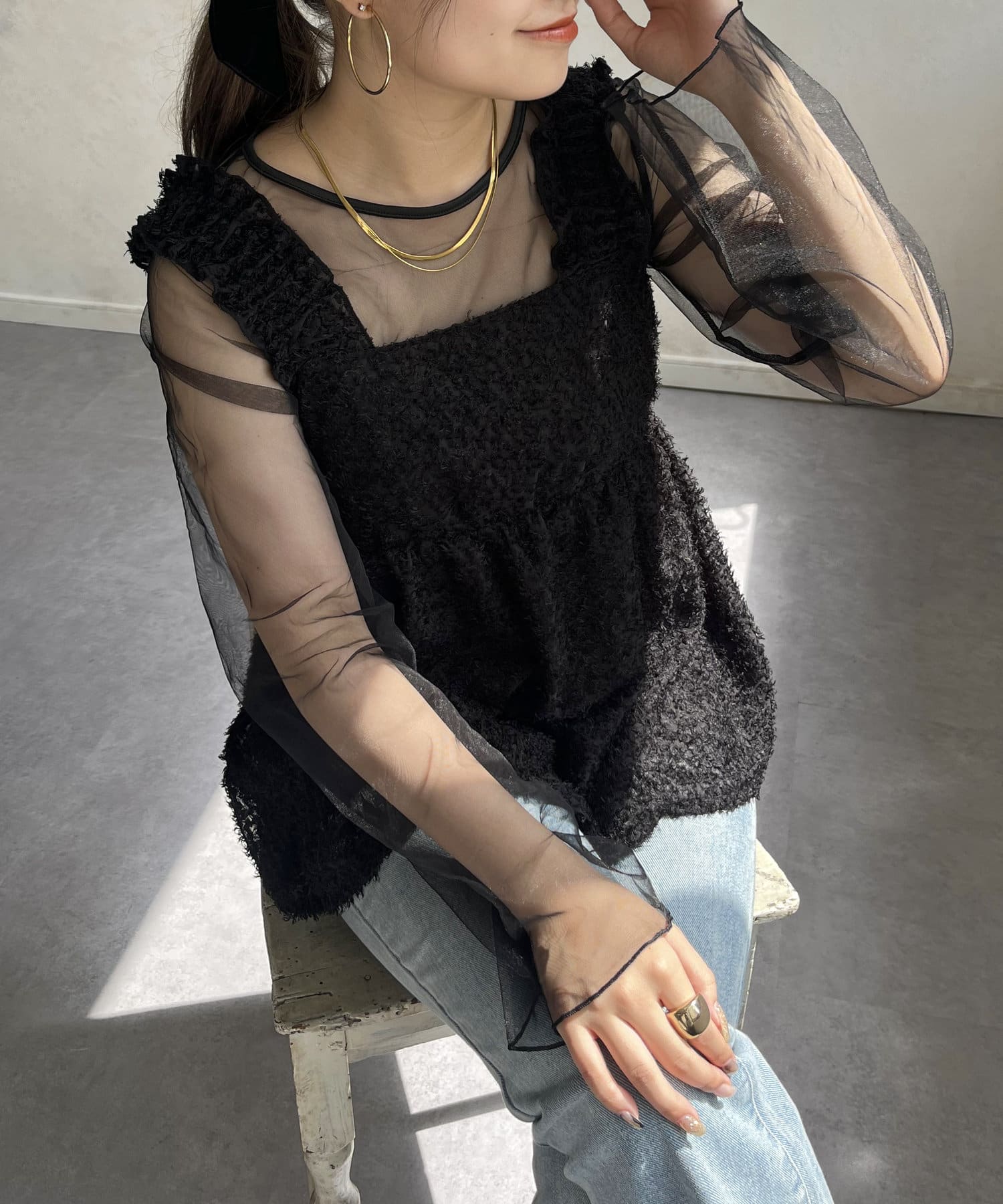 ●長袖のトップスやアウターでも首元・袖から見えるシアーが