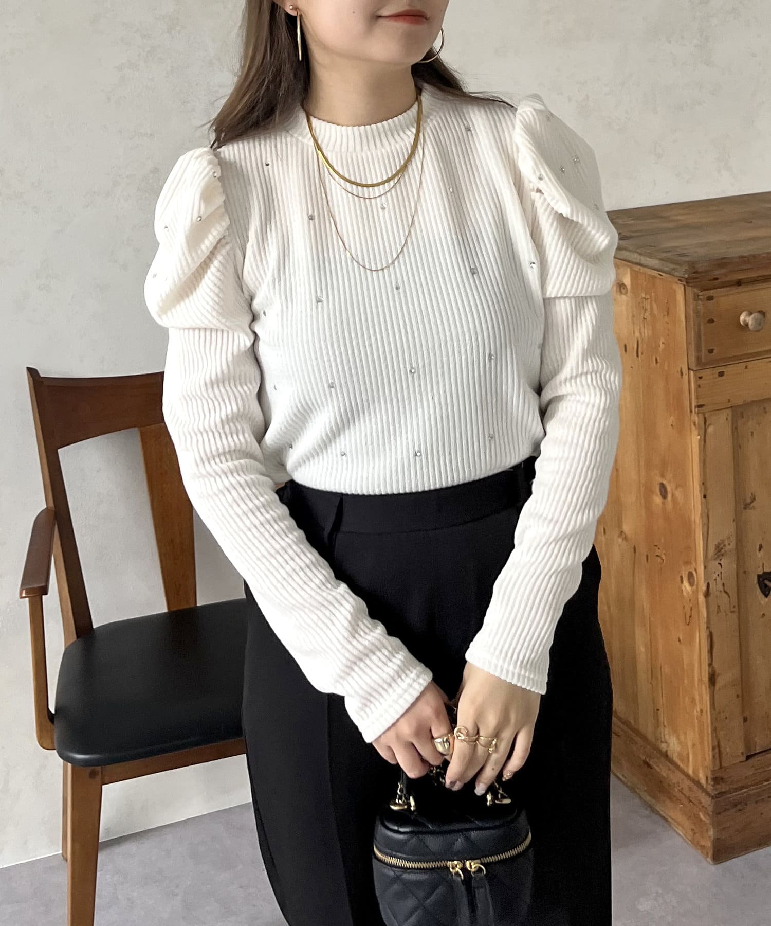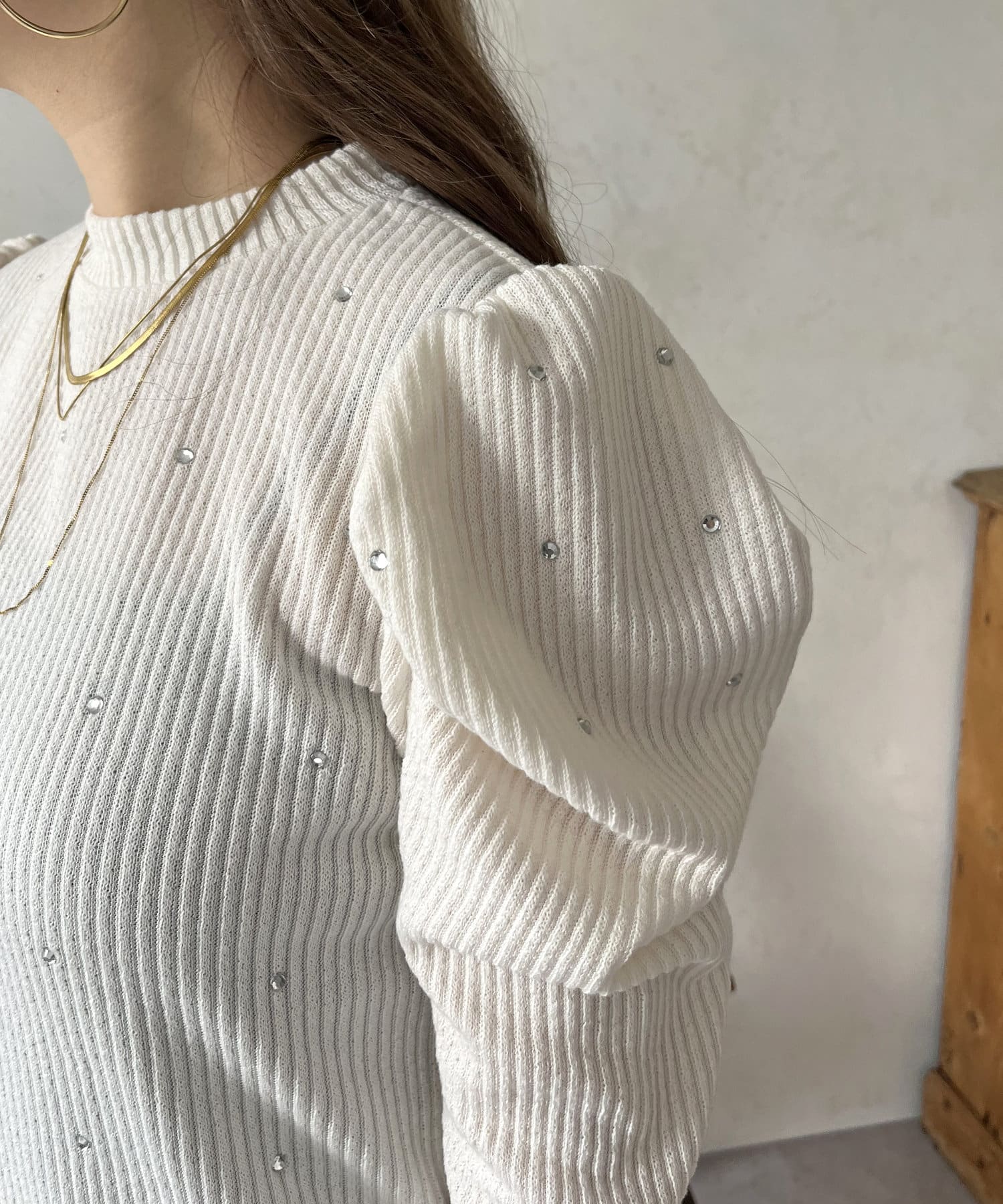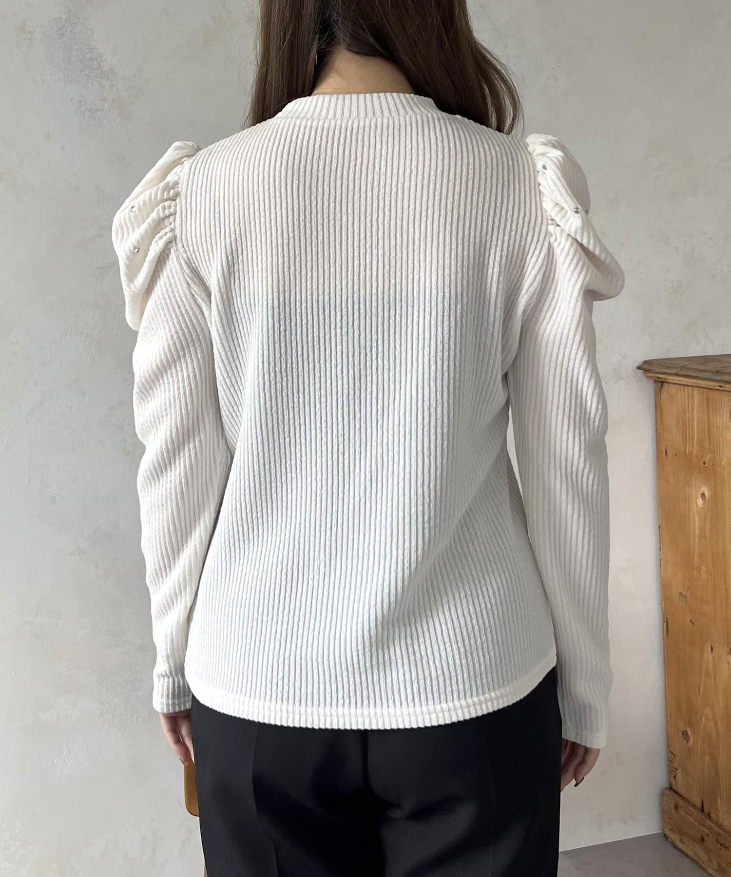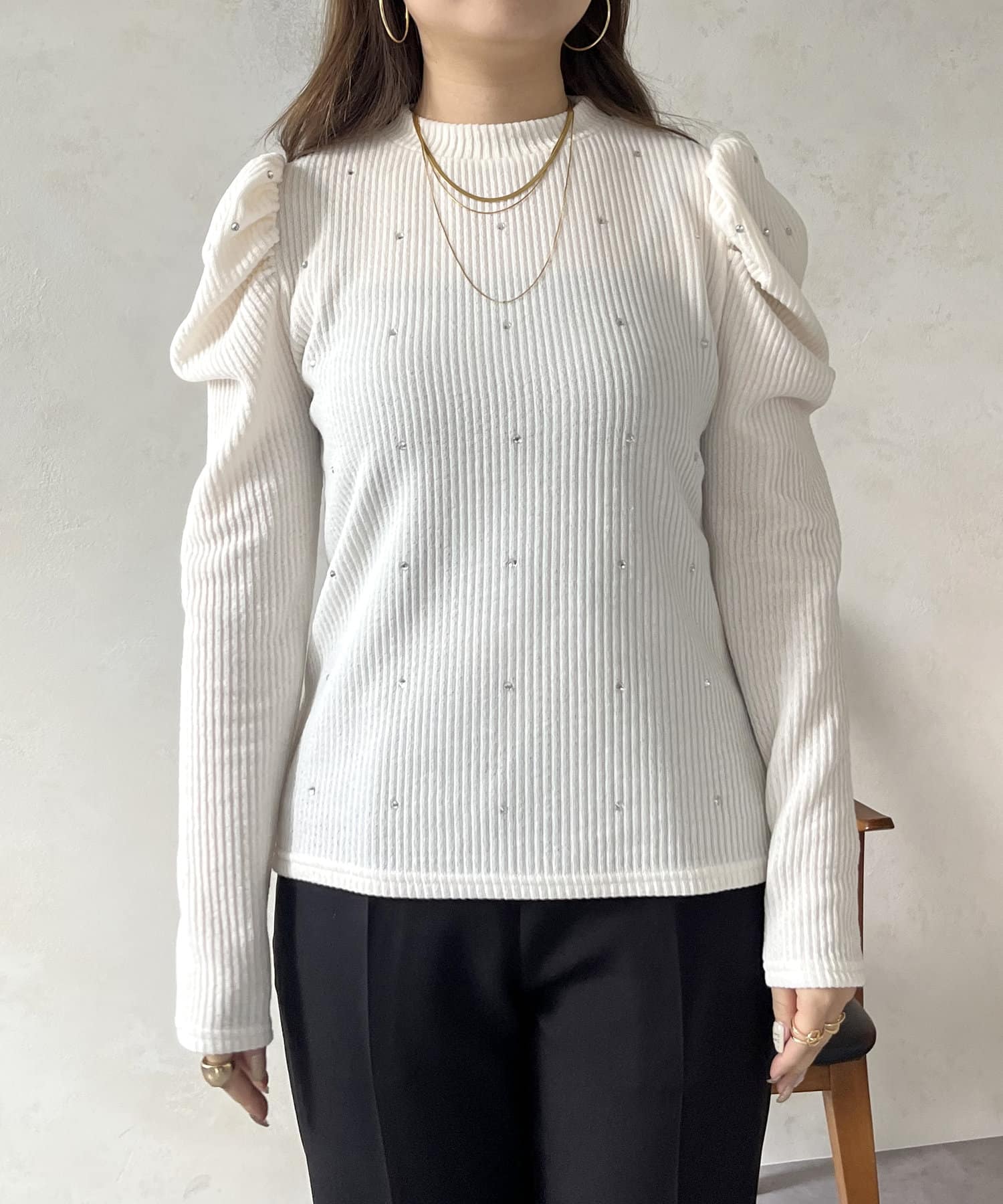 ラインストーンパワショルリブ起毛カットソー