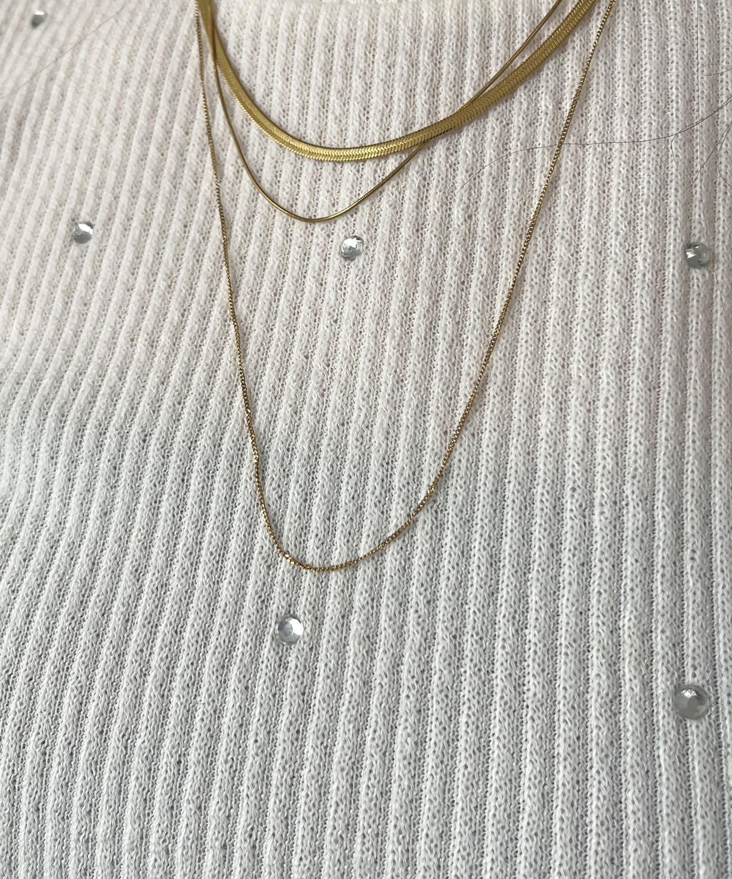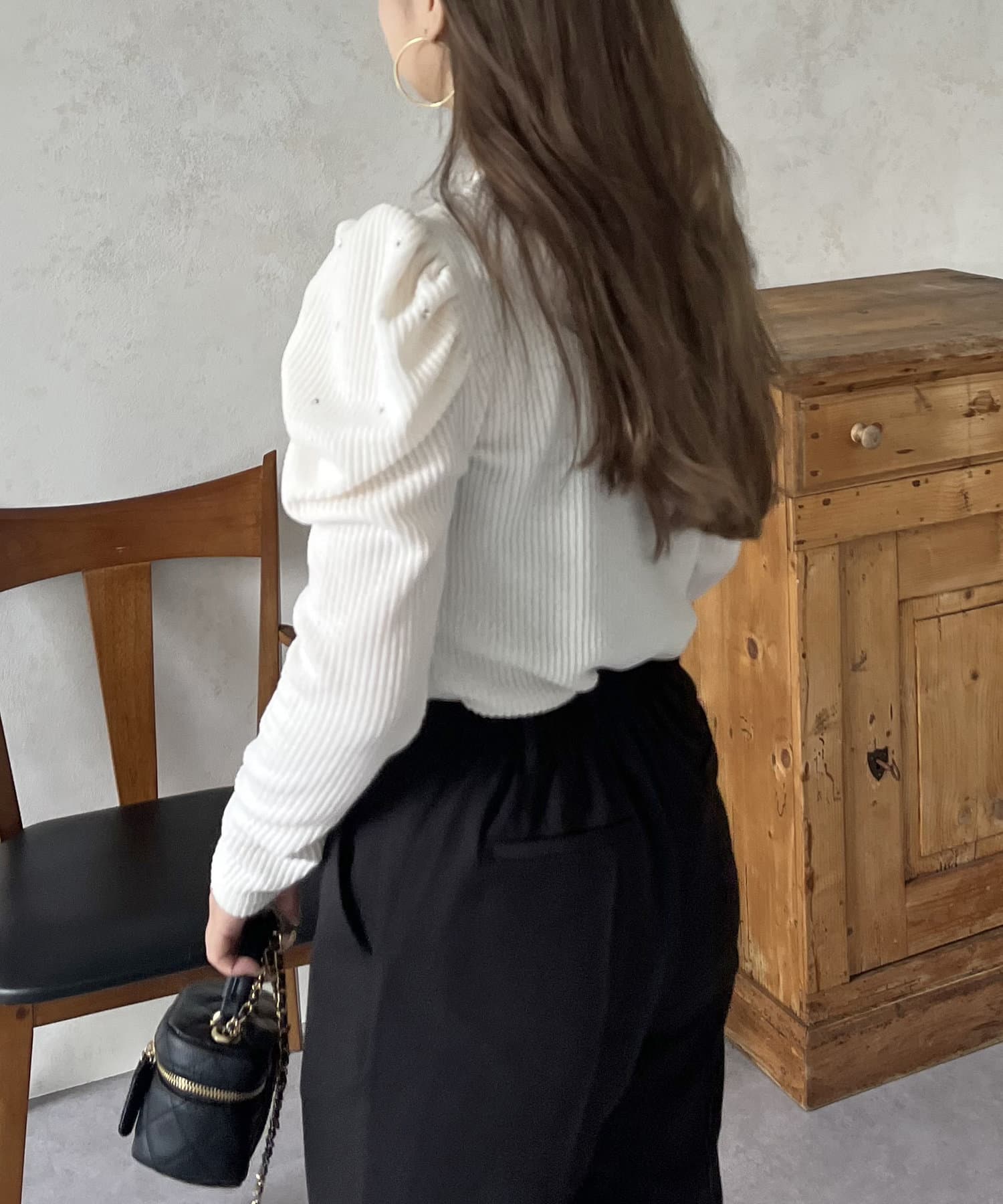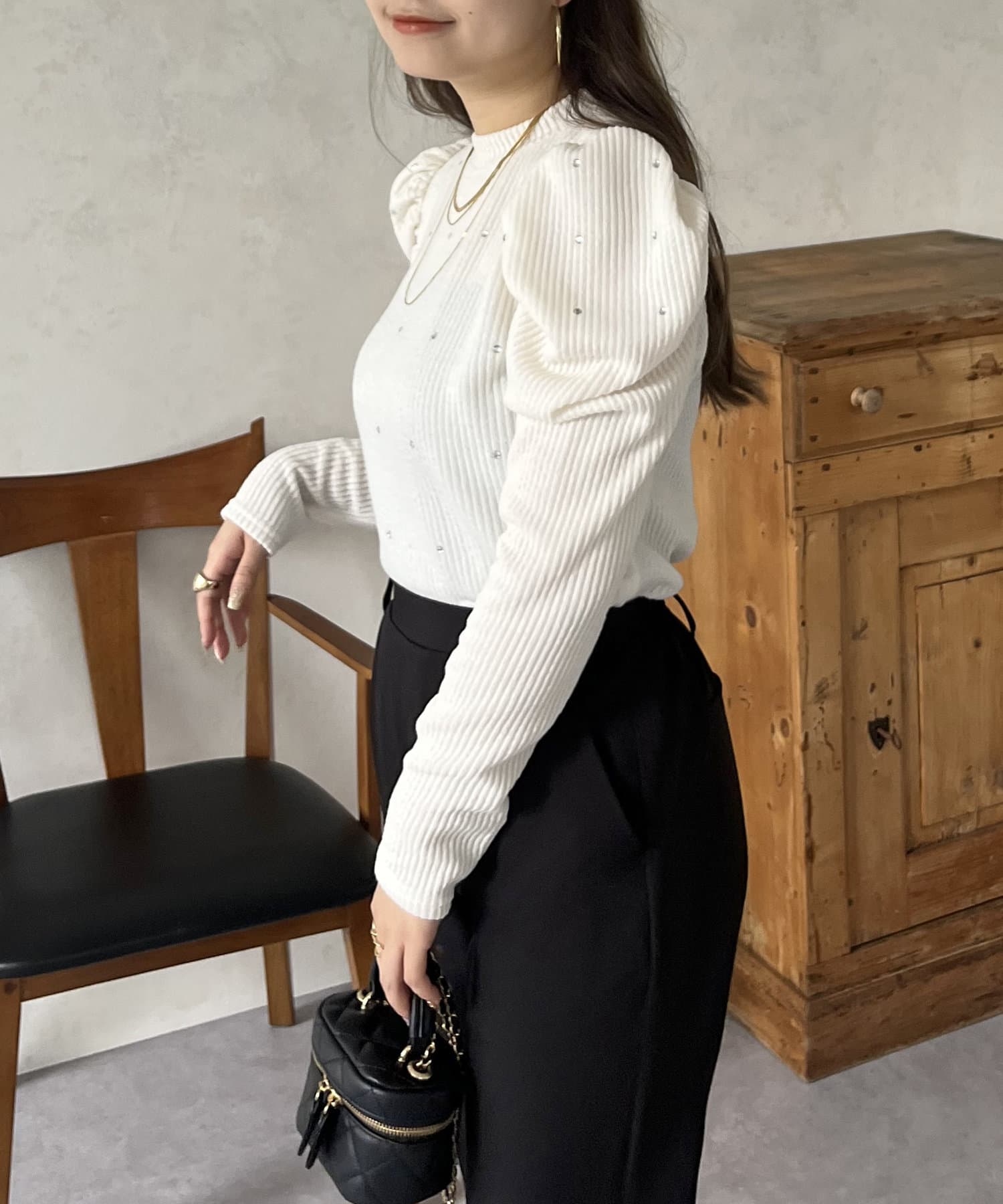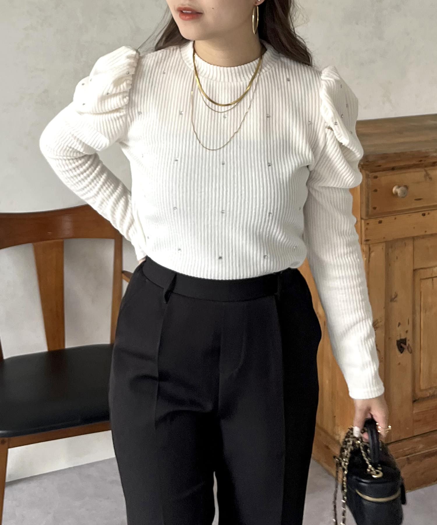 ラインストーンパワショルリブ起毛カットソー