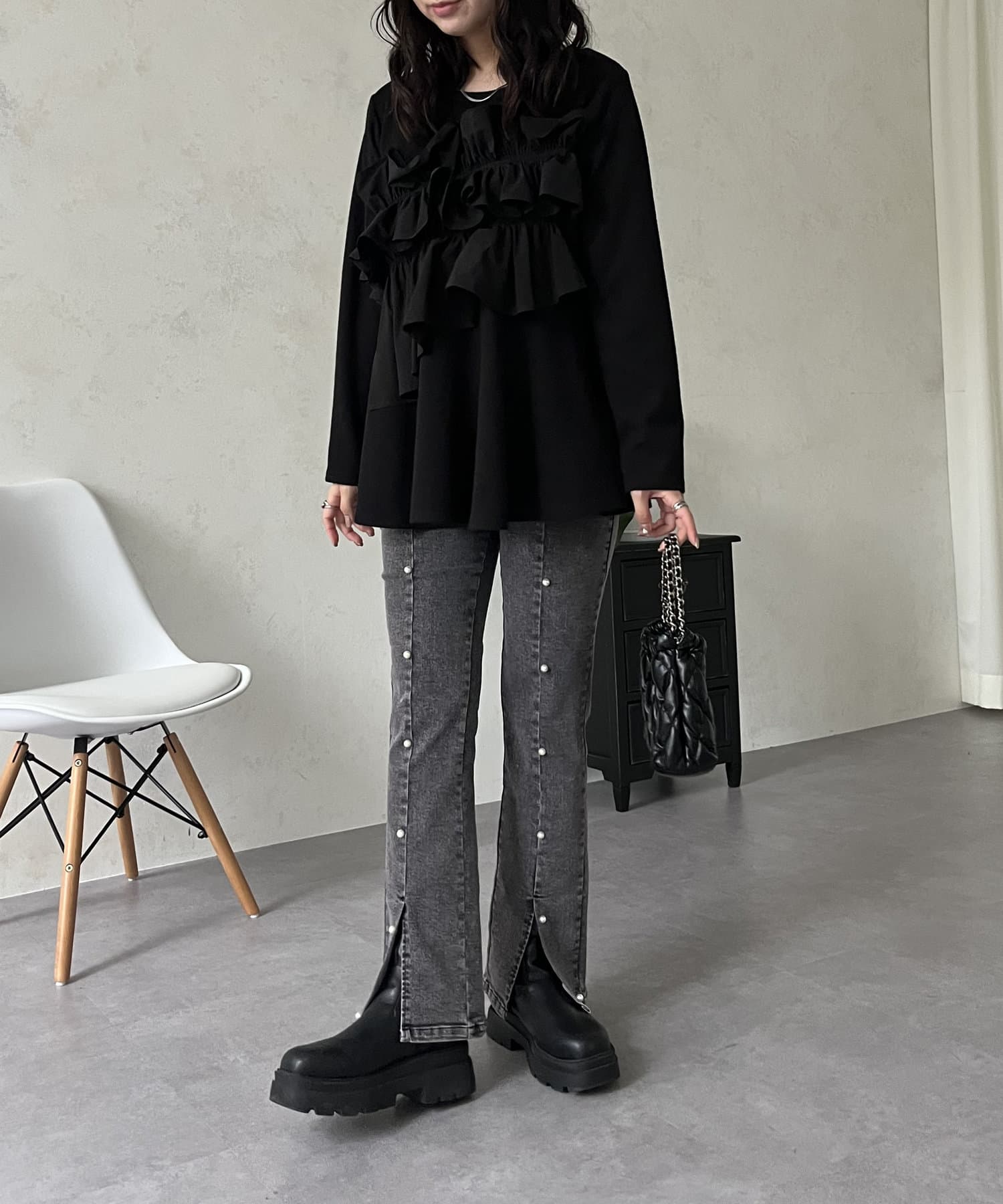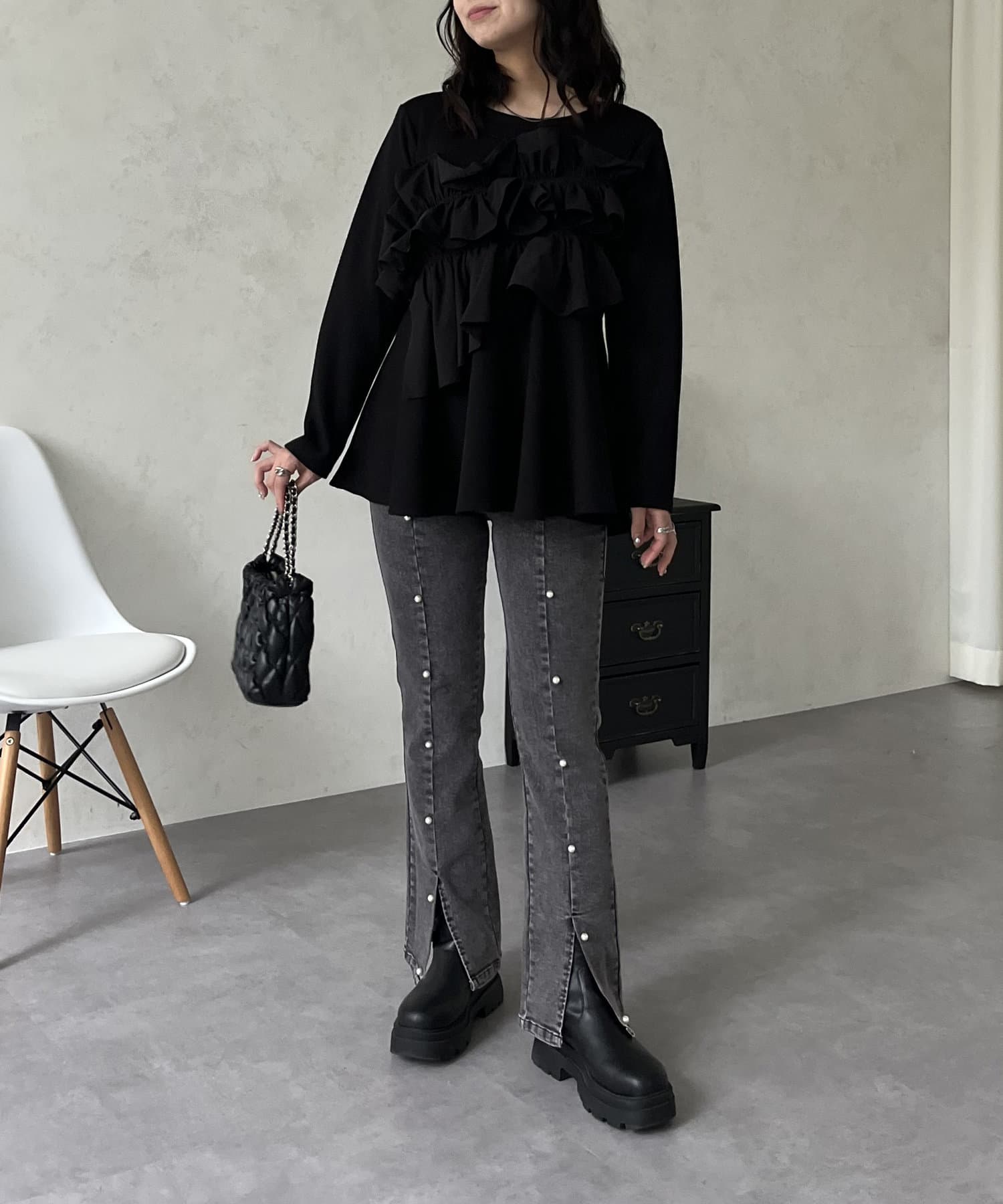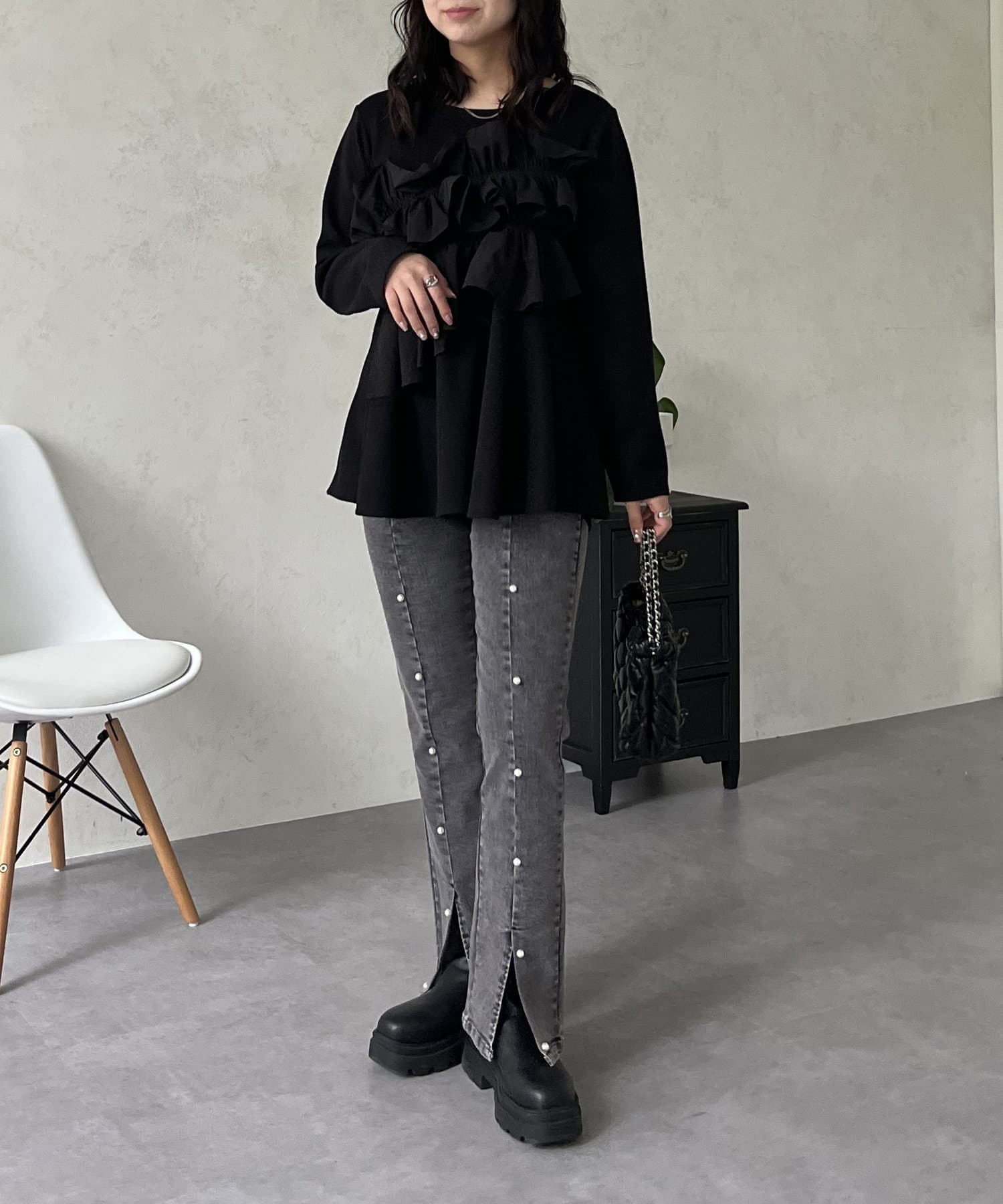 ●パールがあることで女性らしさを持ちつつカジュアルスタイルを楽しめます