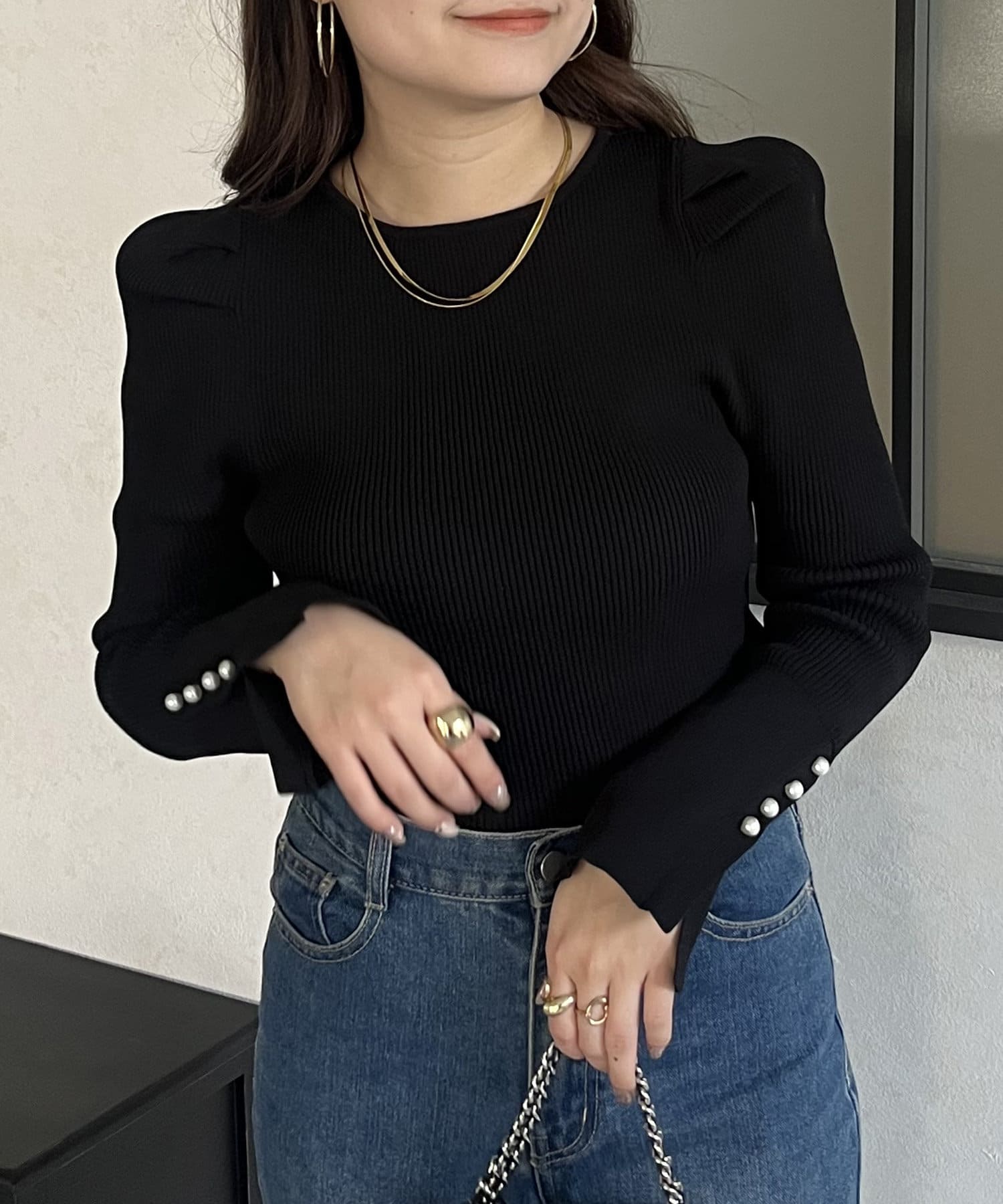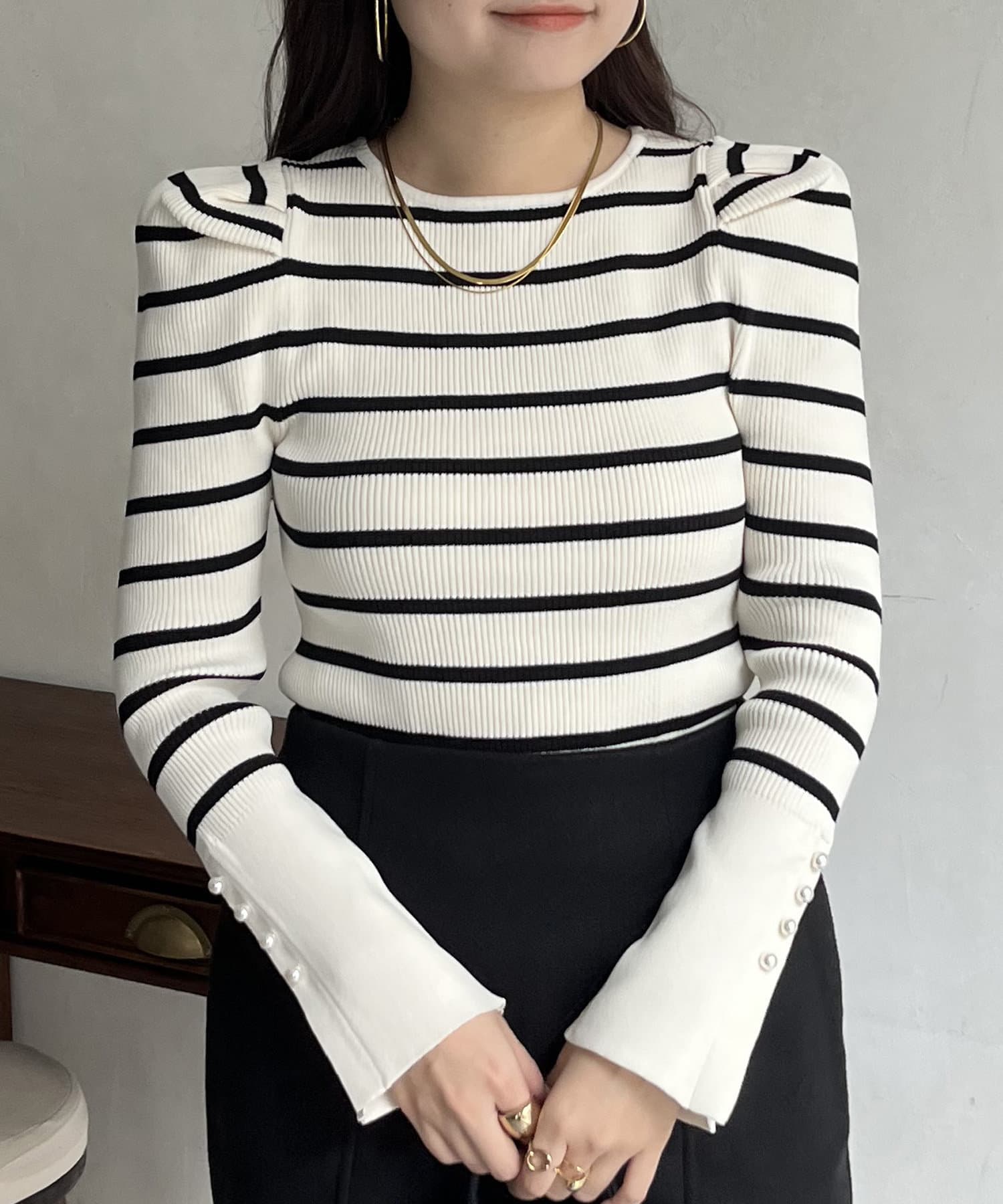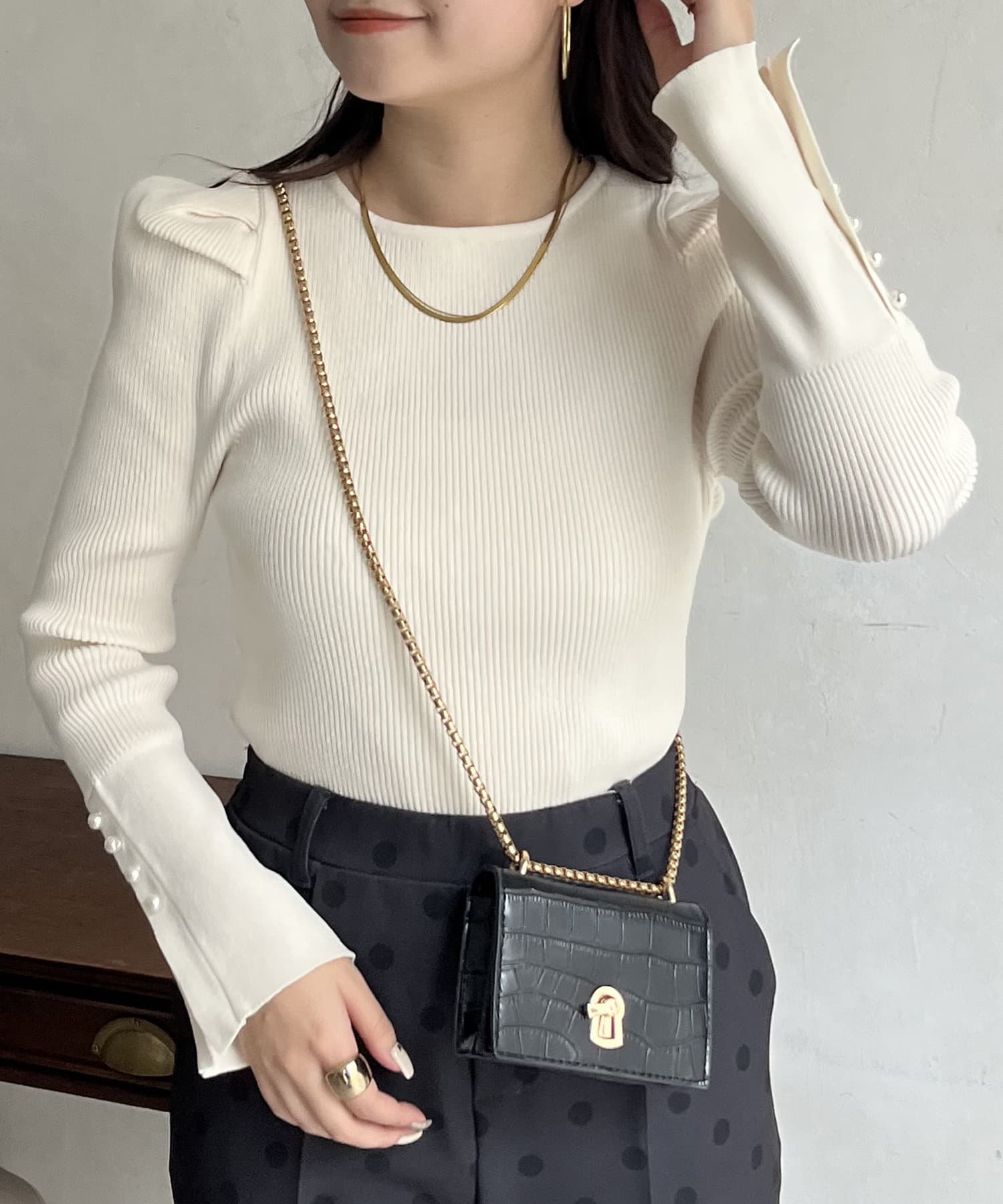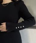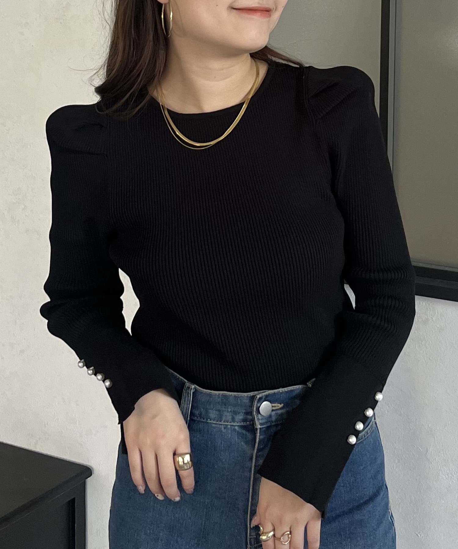 袖のさりげないパールがアクセントなニット