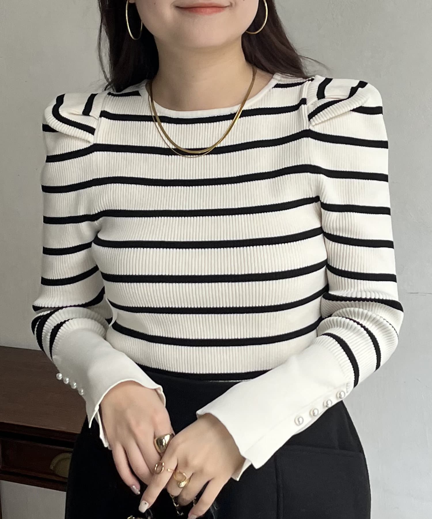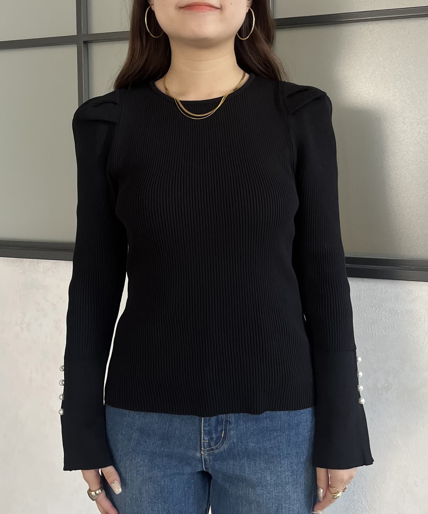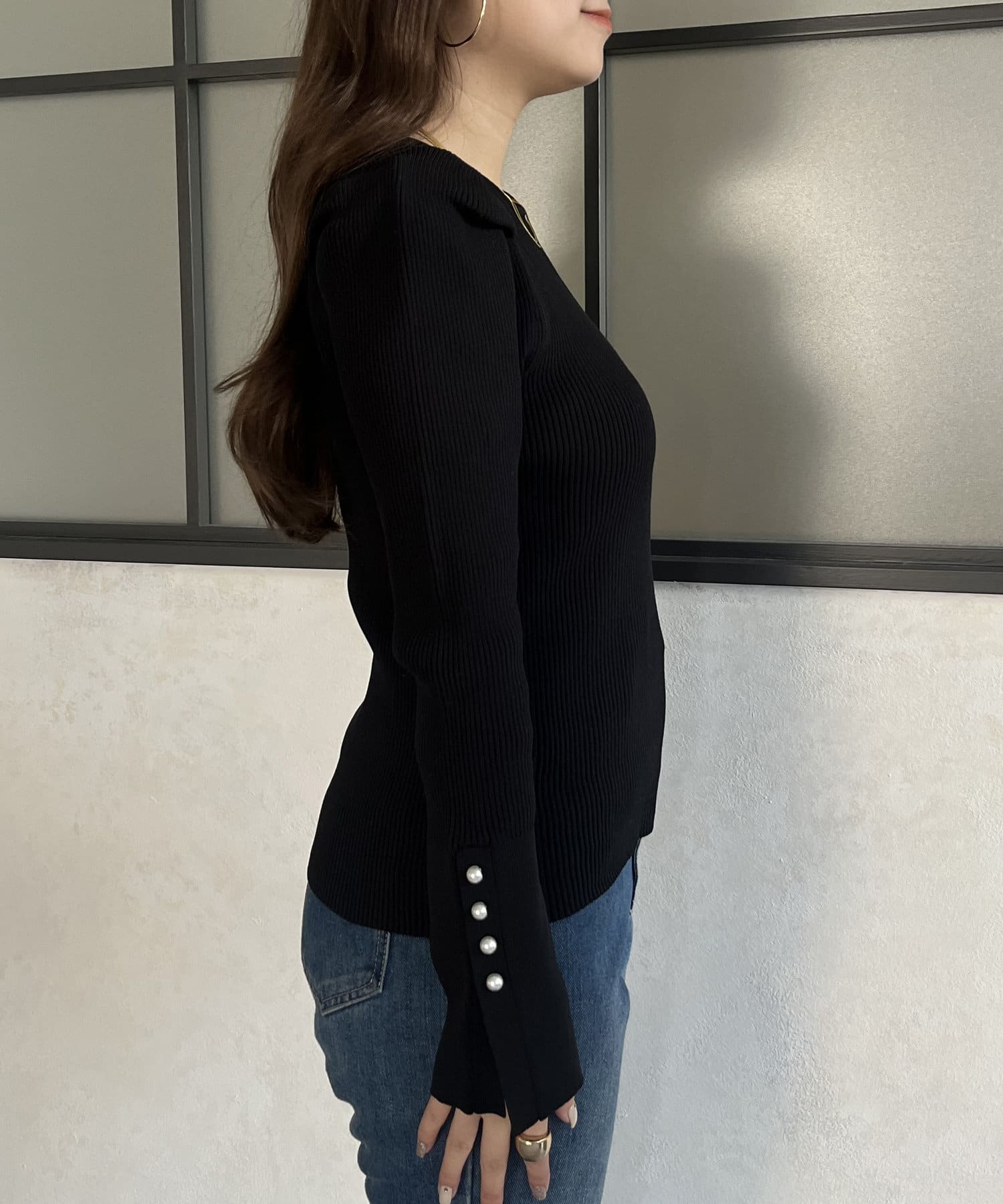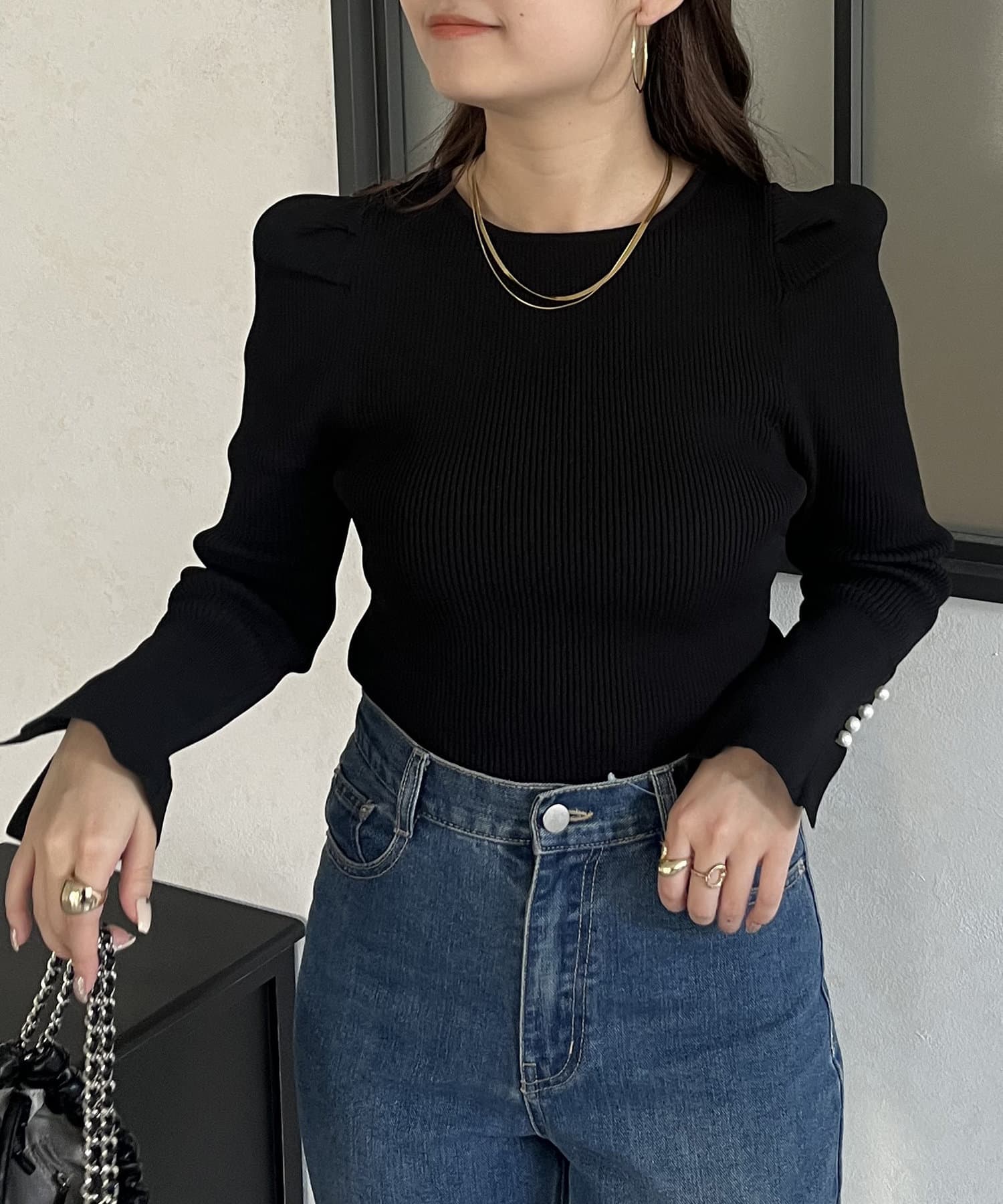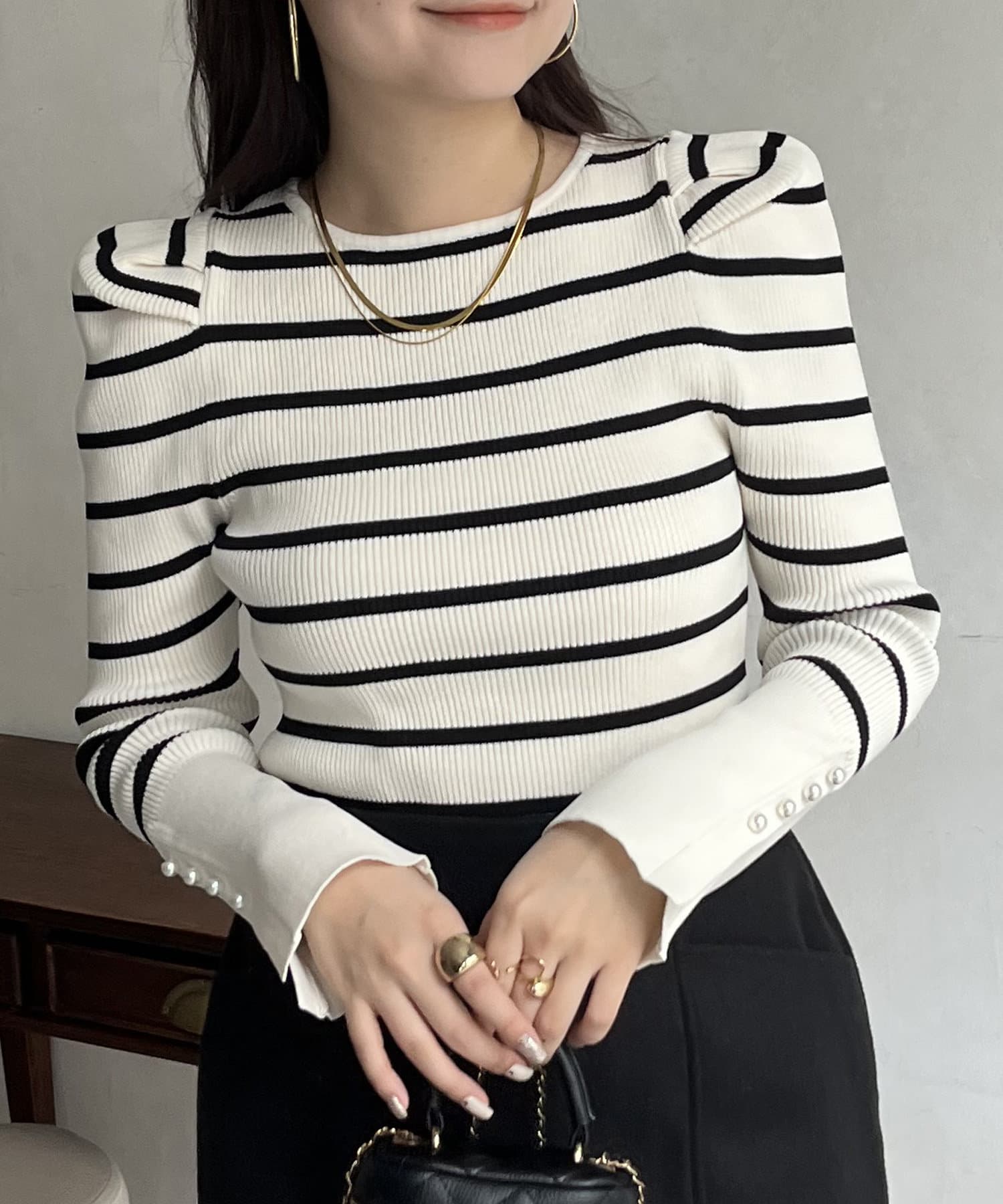 袖のさりげないパールがアクセントなニット