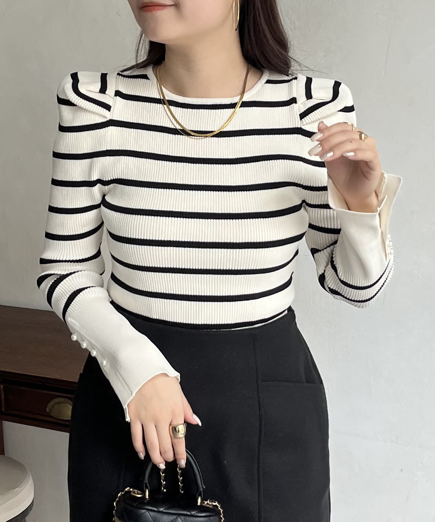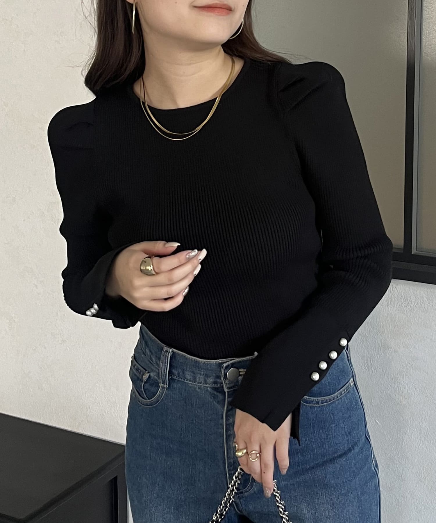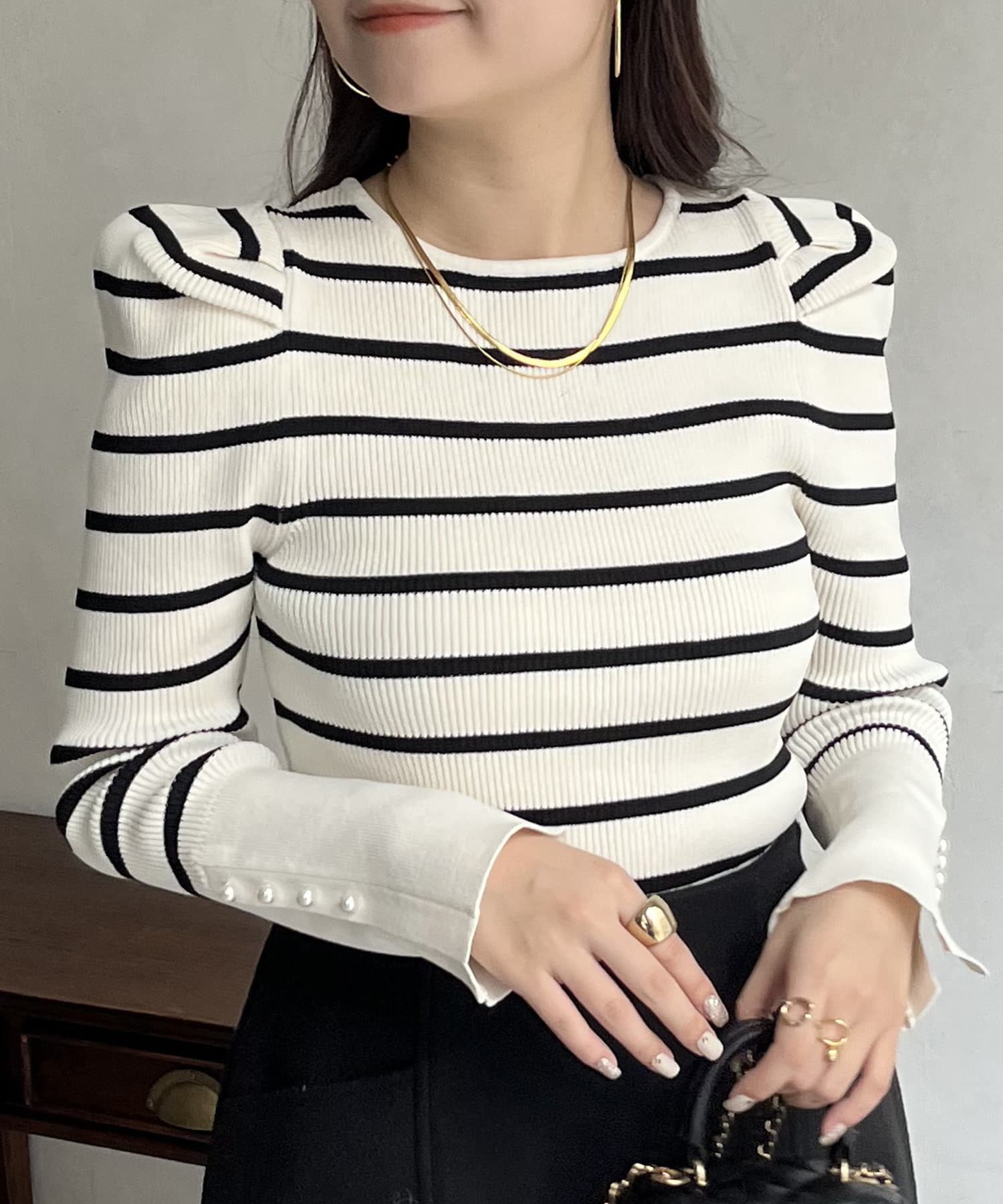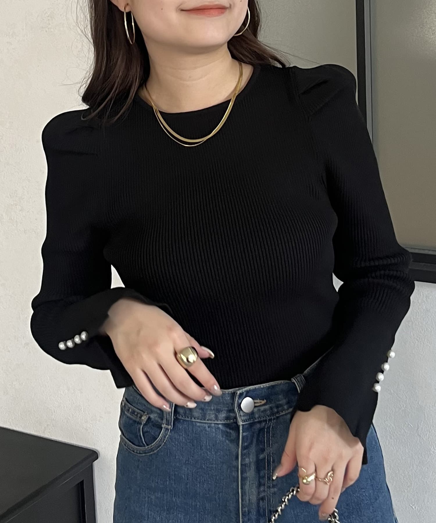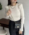 袖のさりげないパールがアクセントなニット