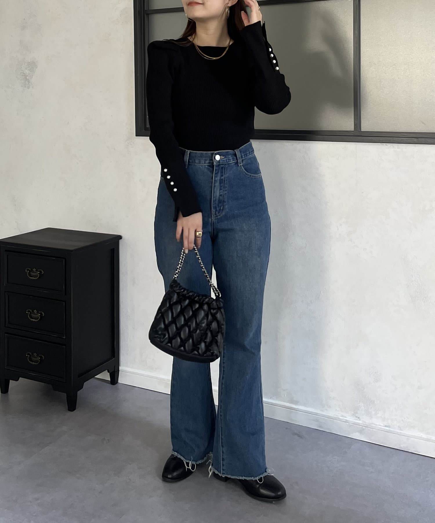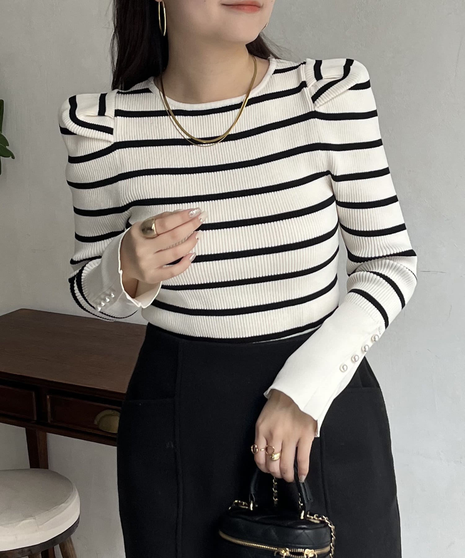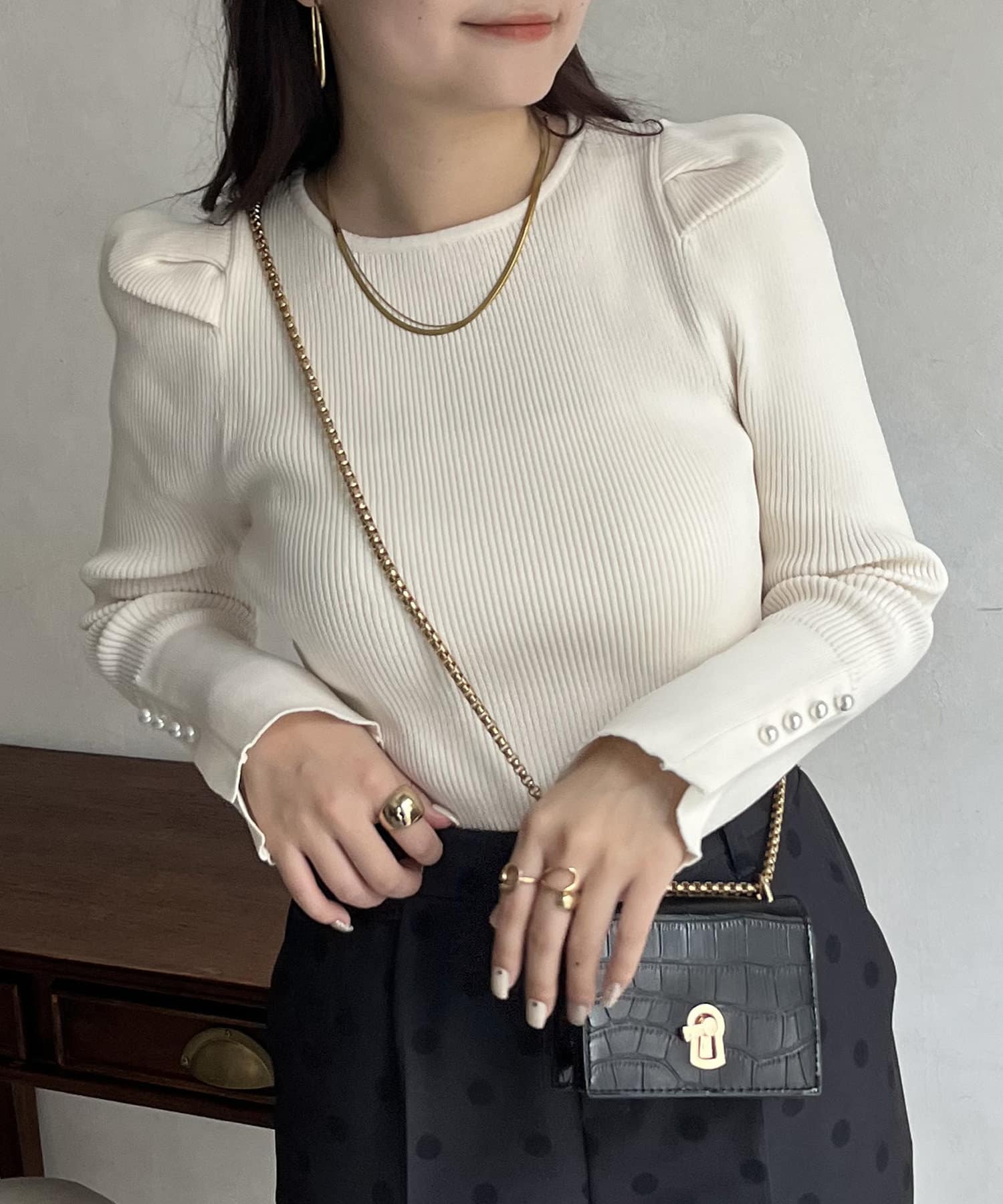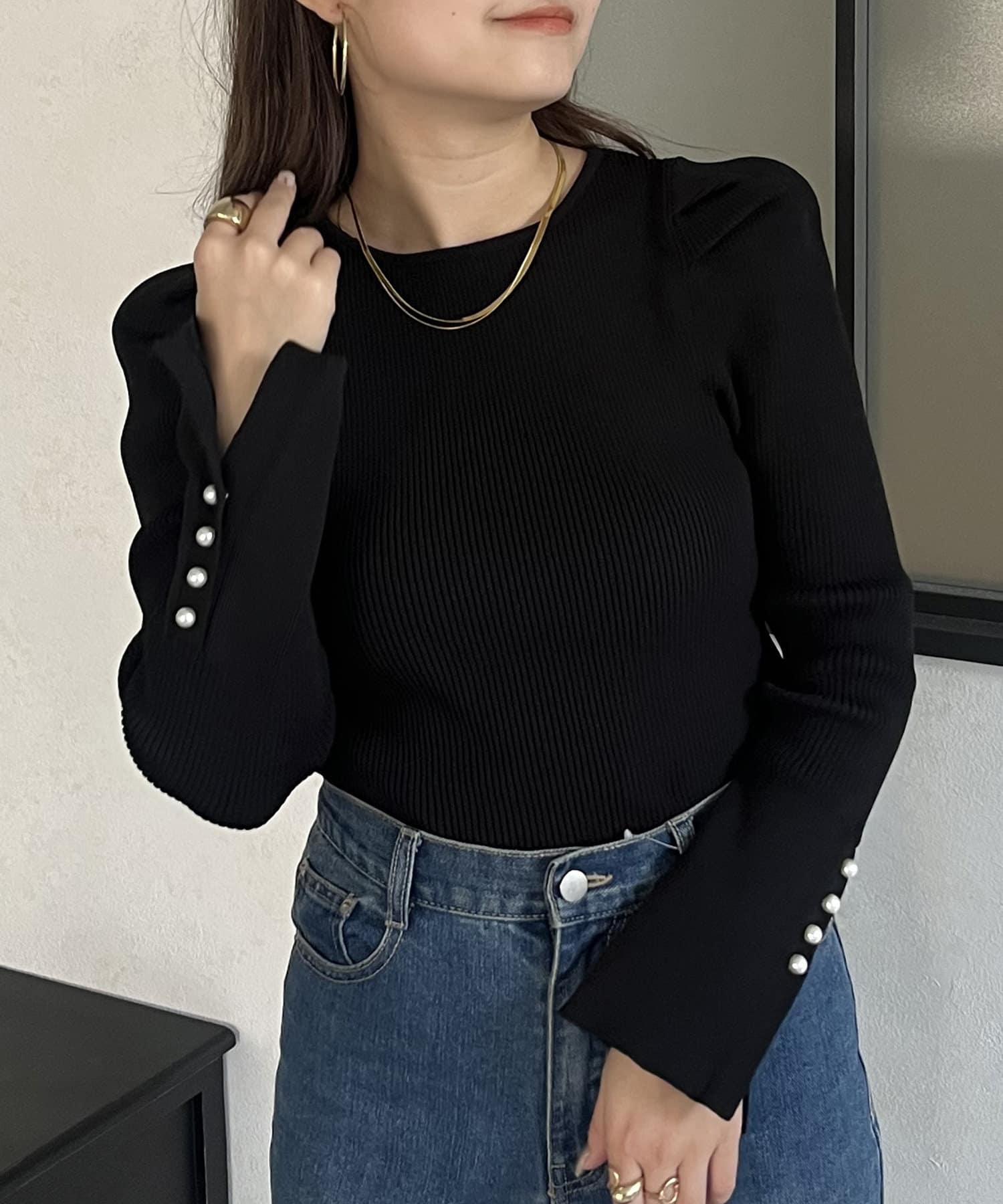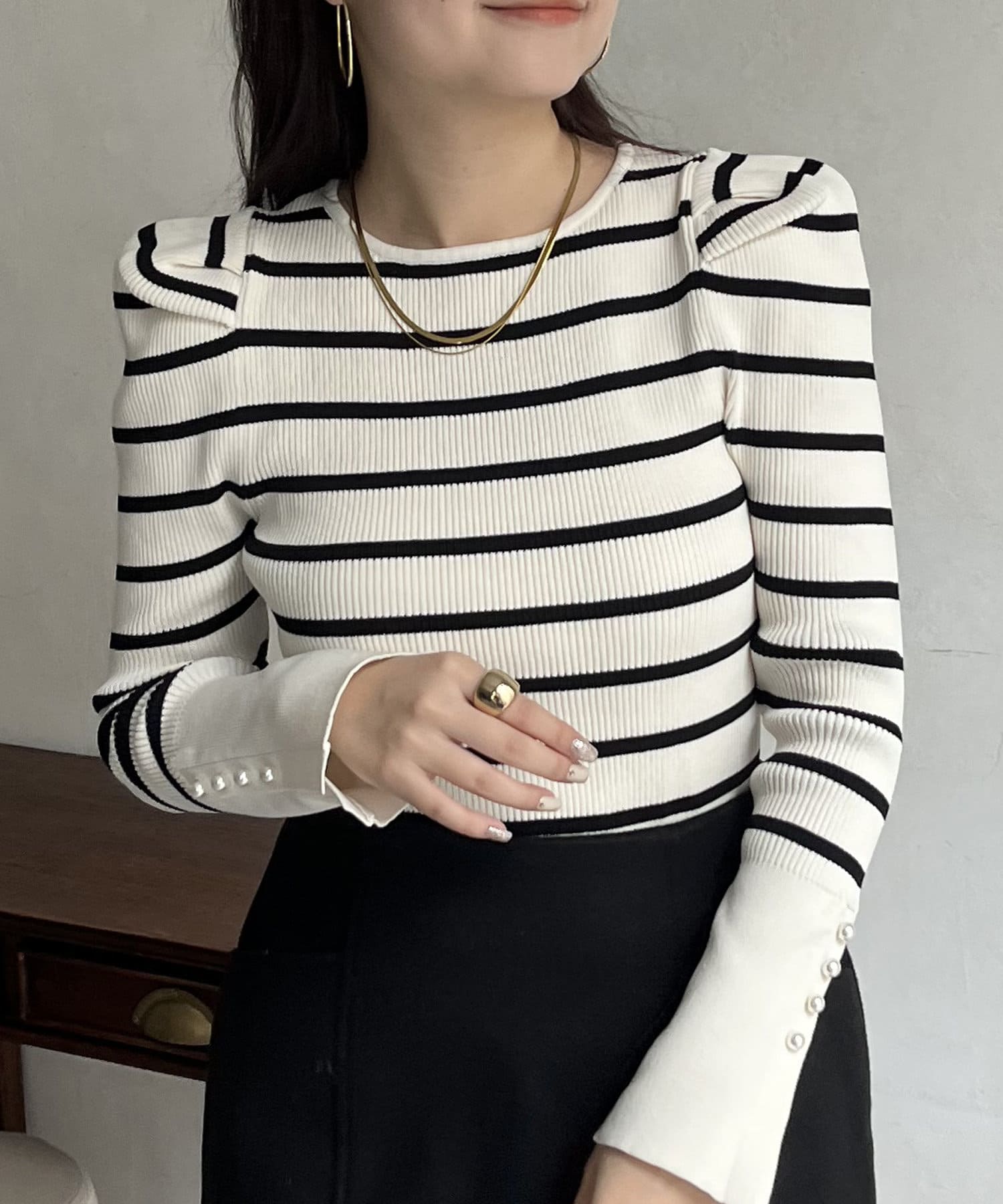 袖のさりげないパールがアクセントなニット