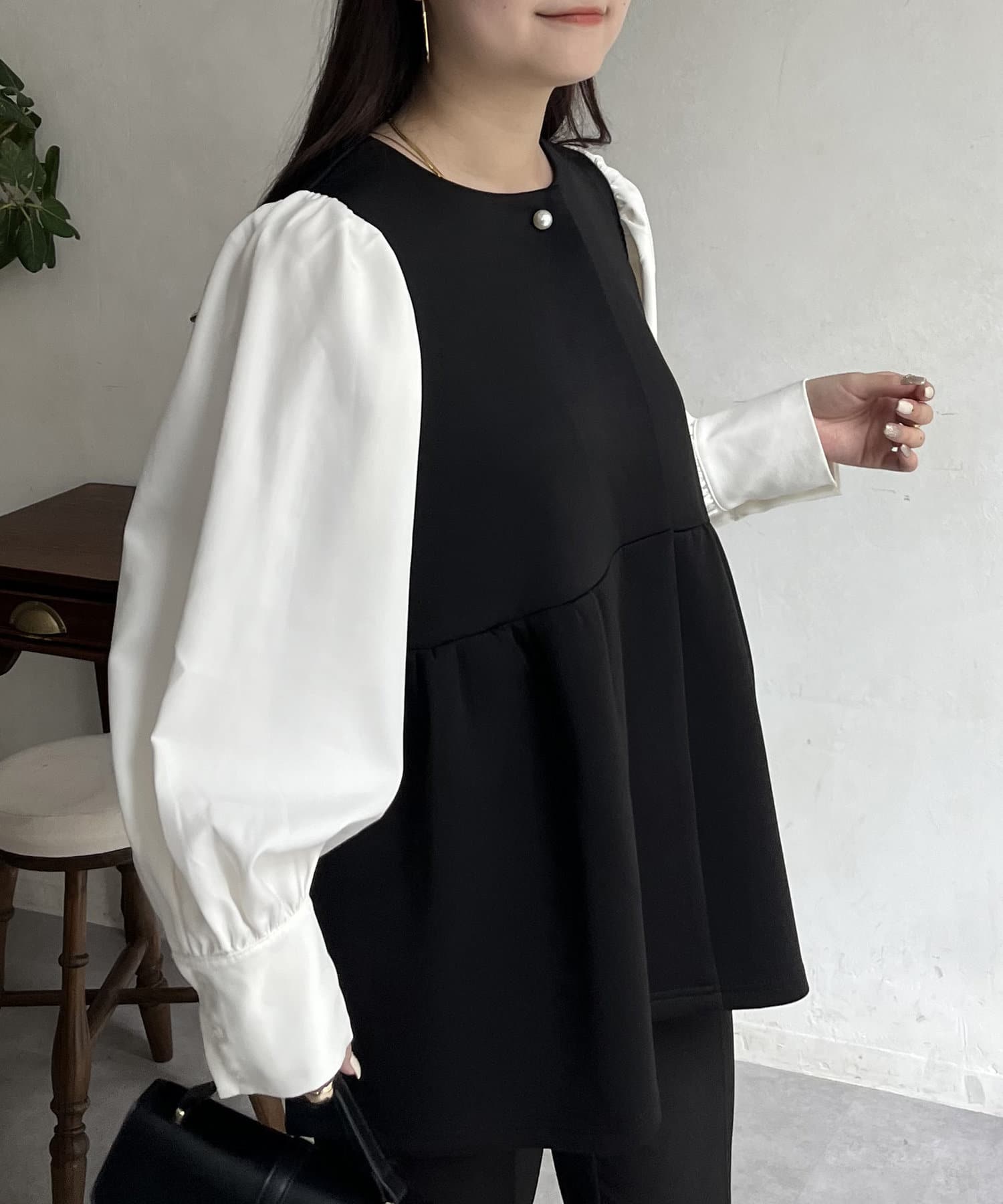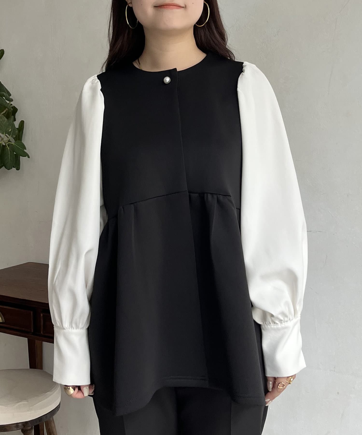 パールボタンシャツドッキングペプラムトップス