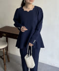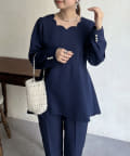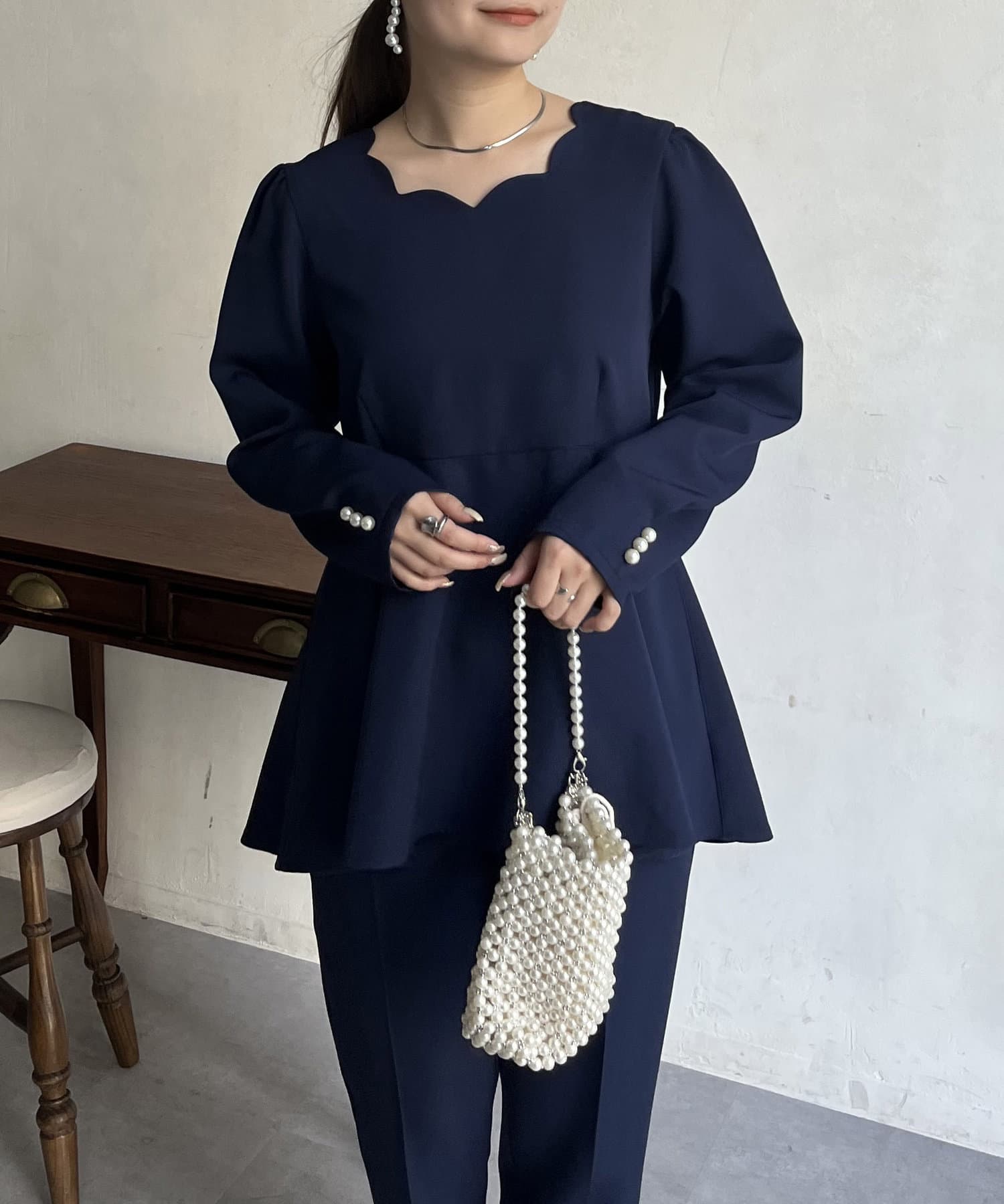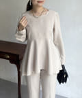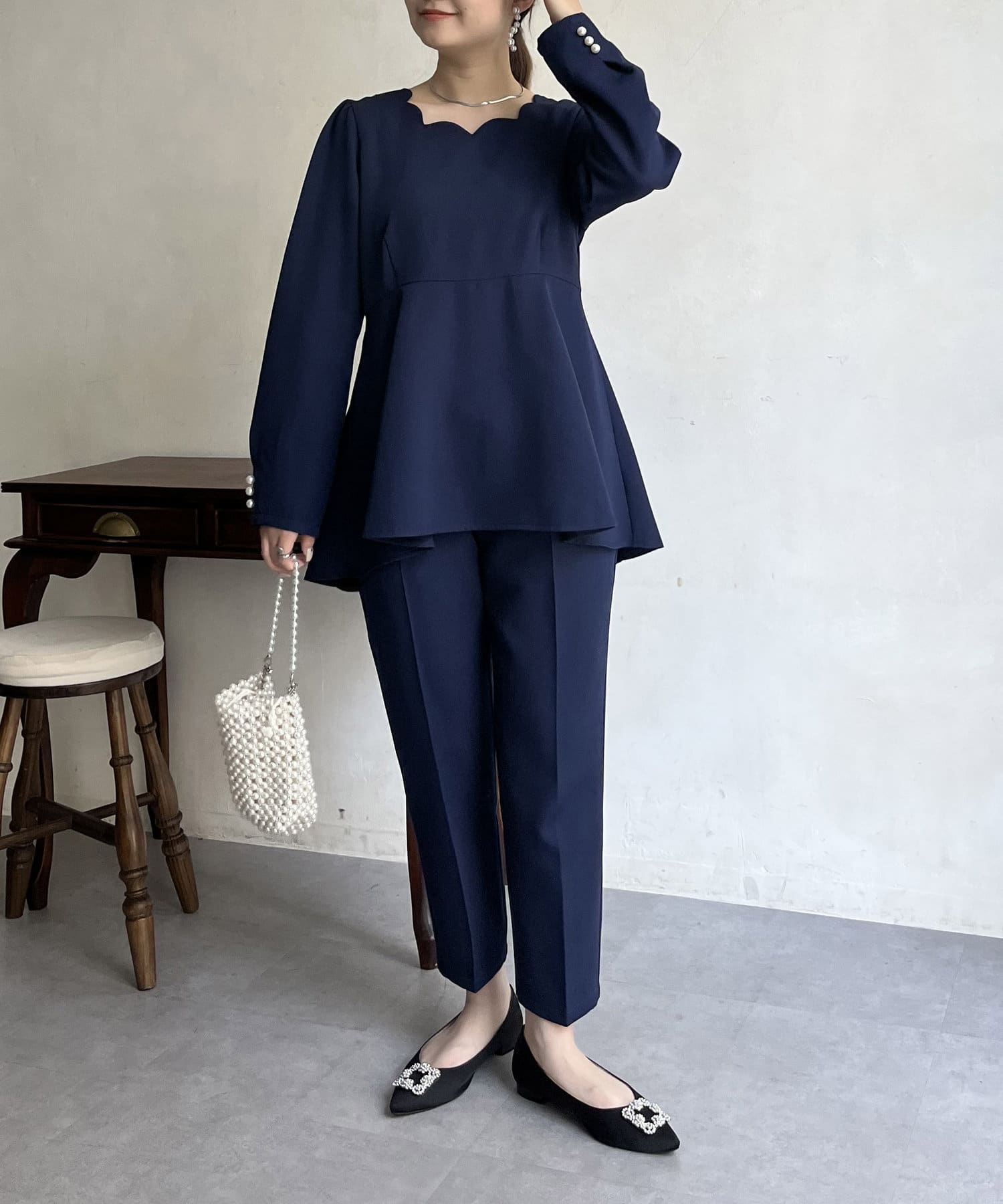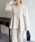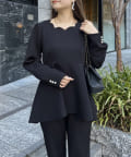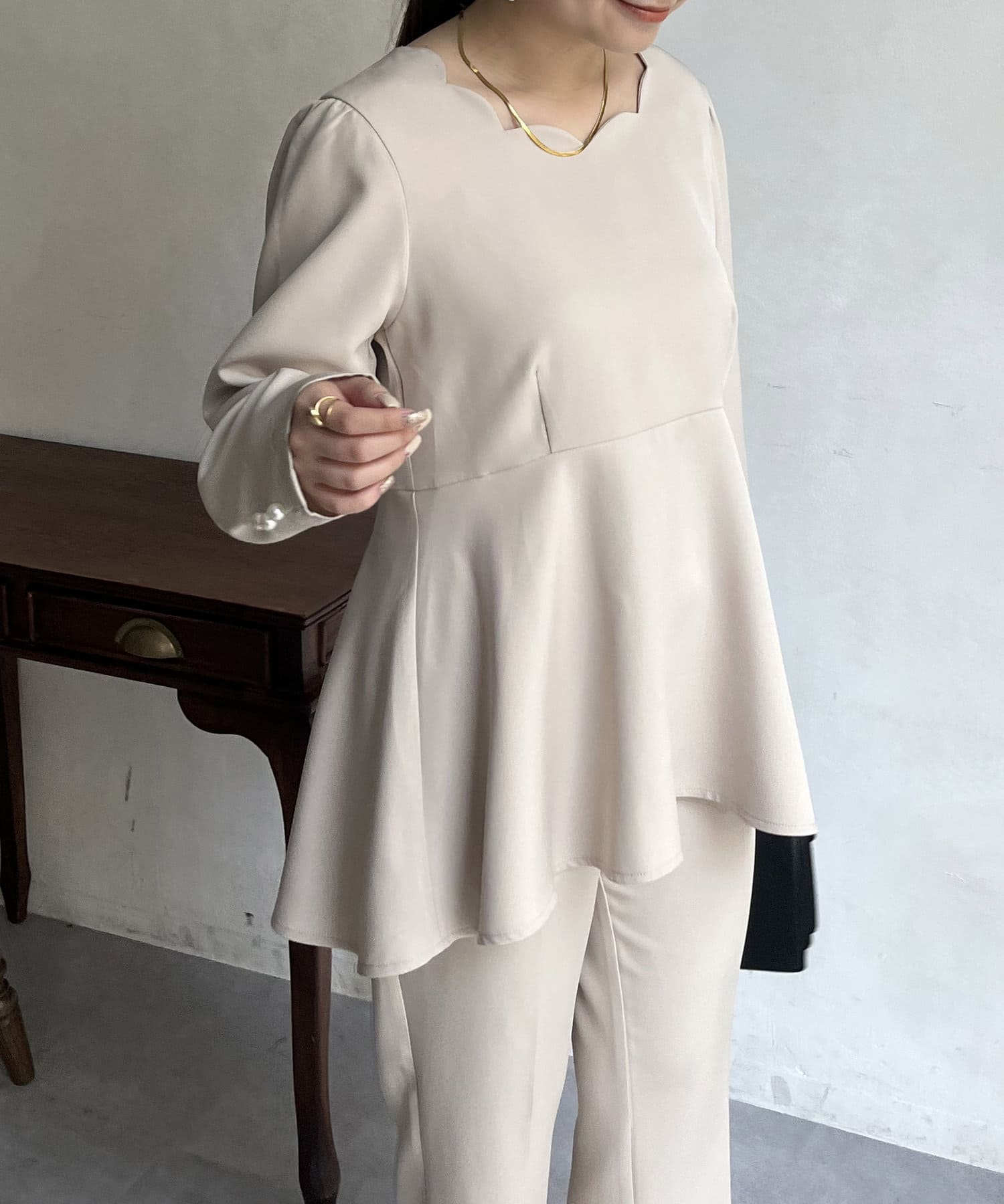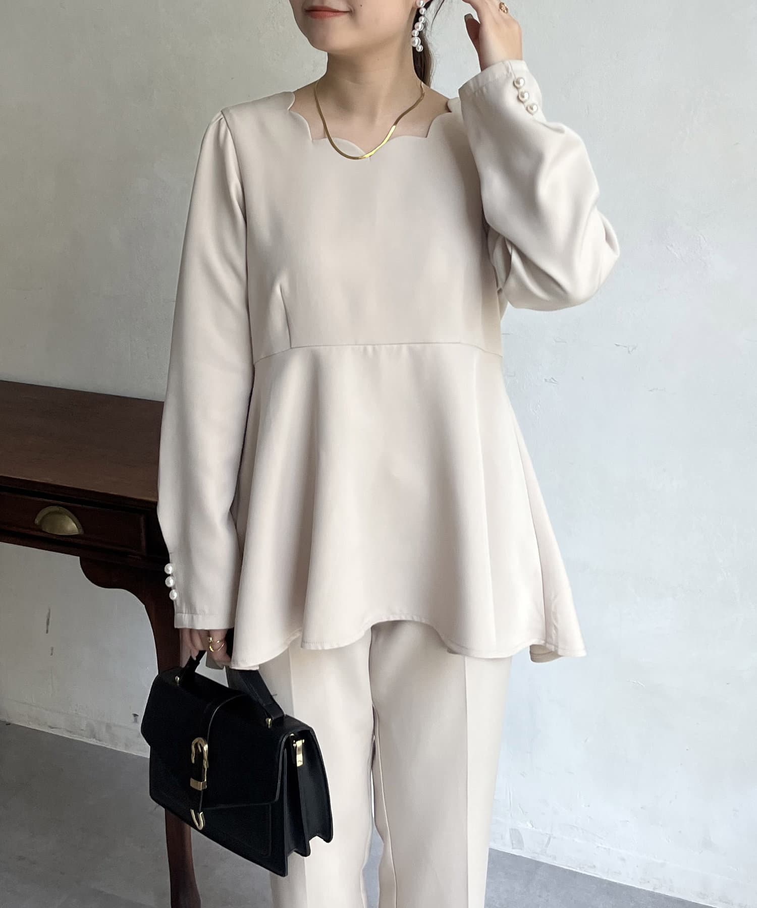 【セットアップ着用可能】袖パールスカラップネックペプラムブラウス