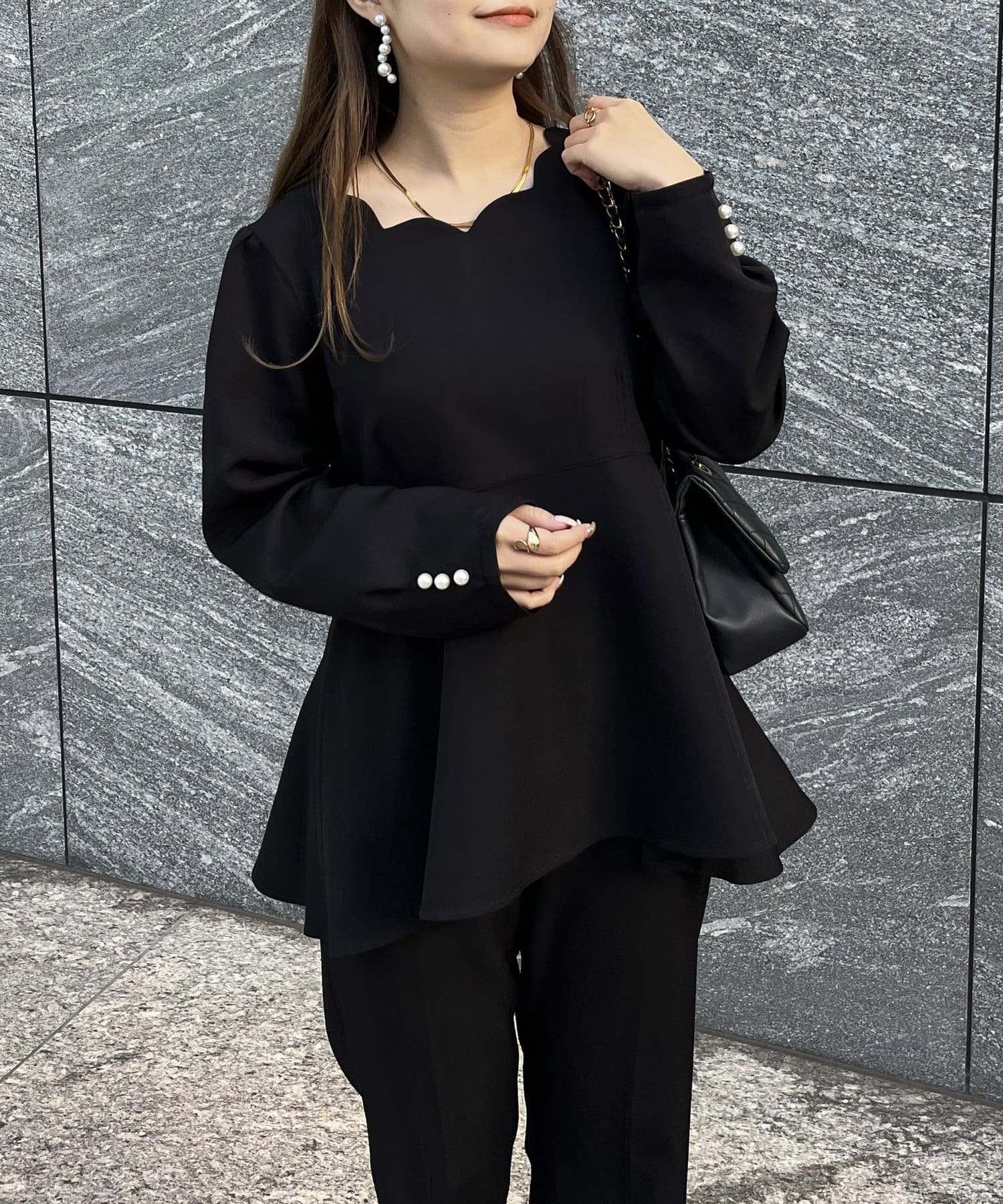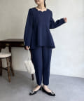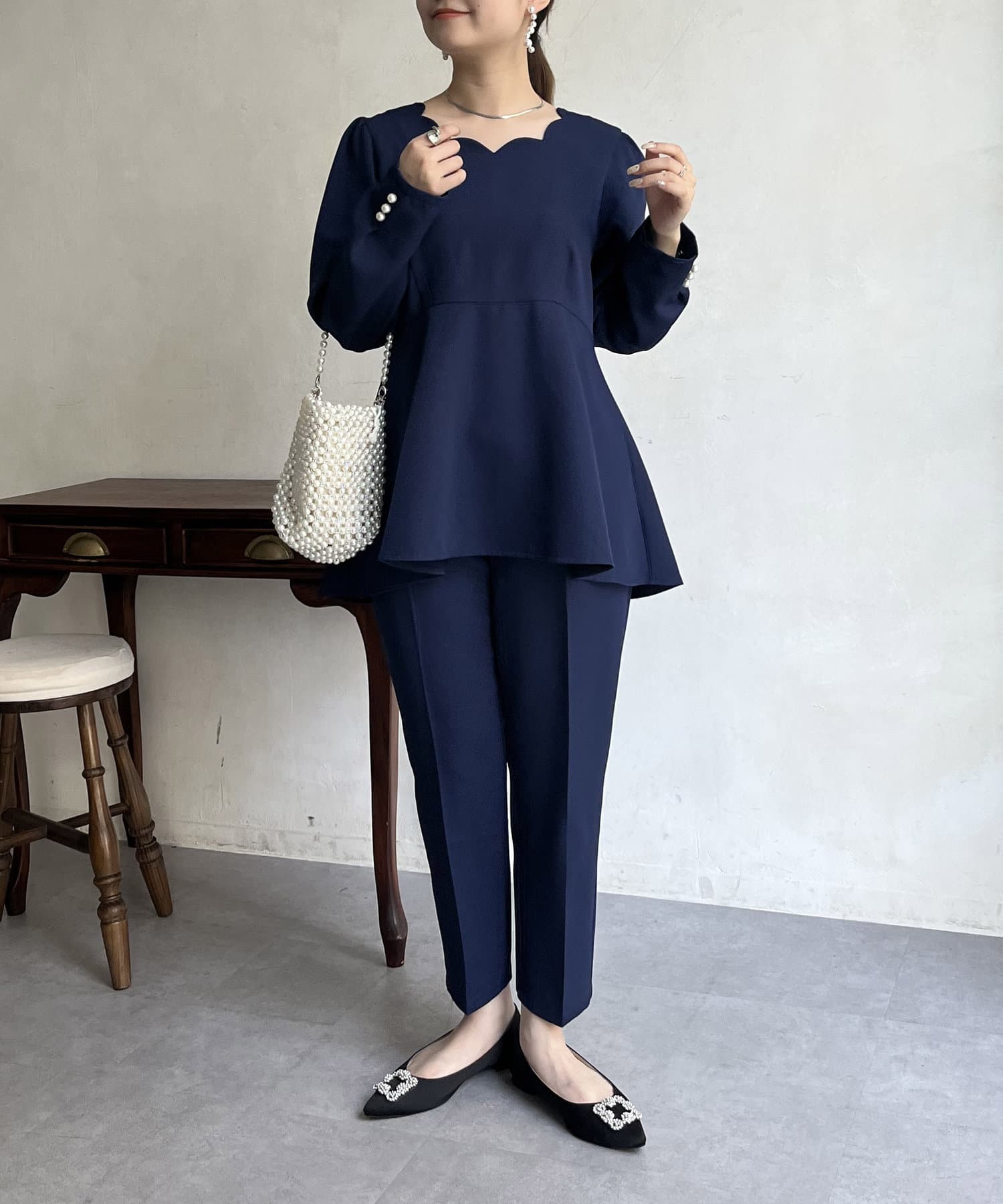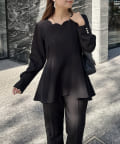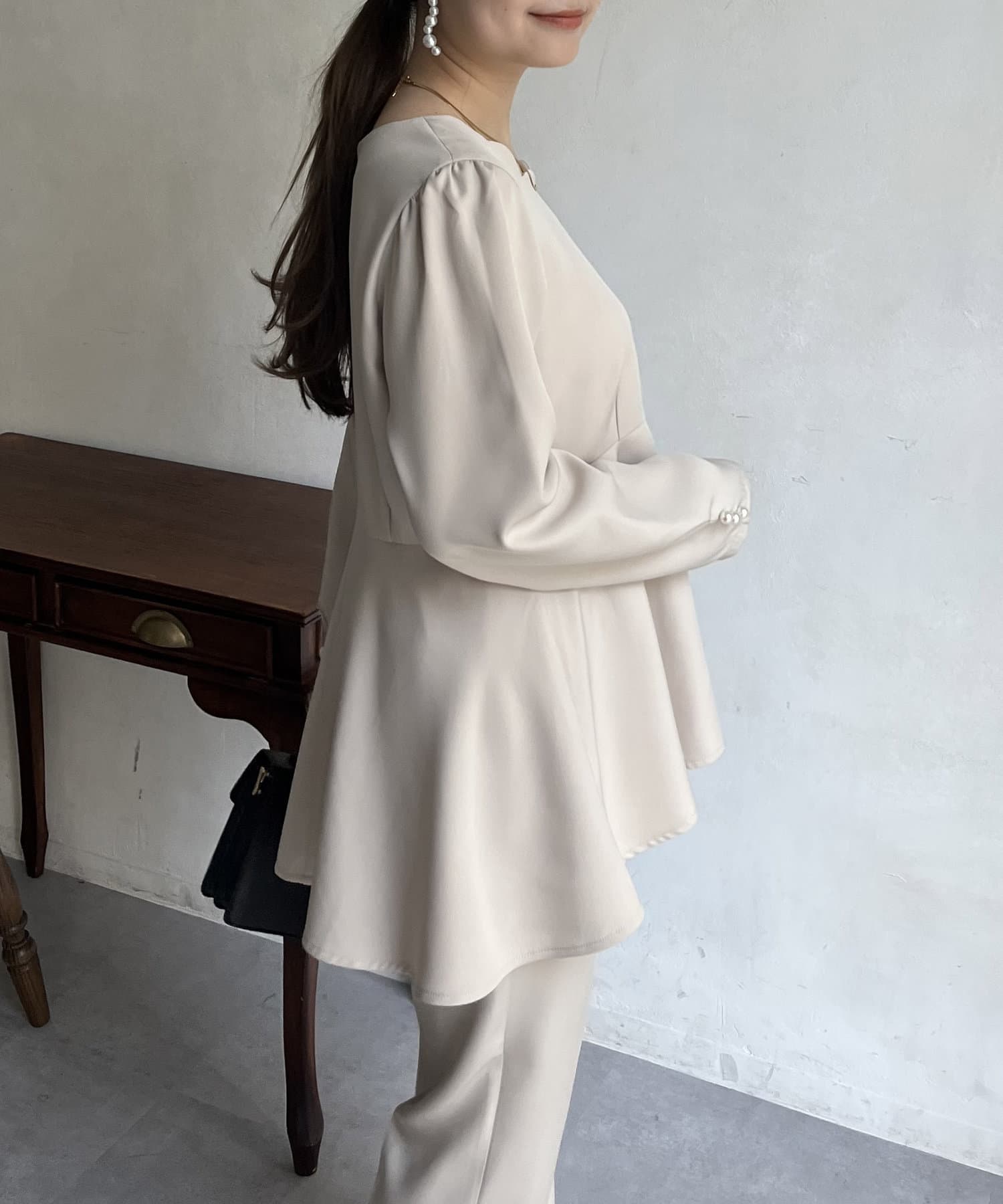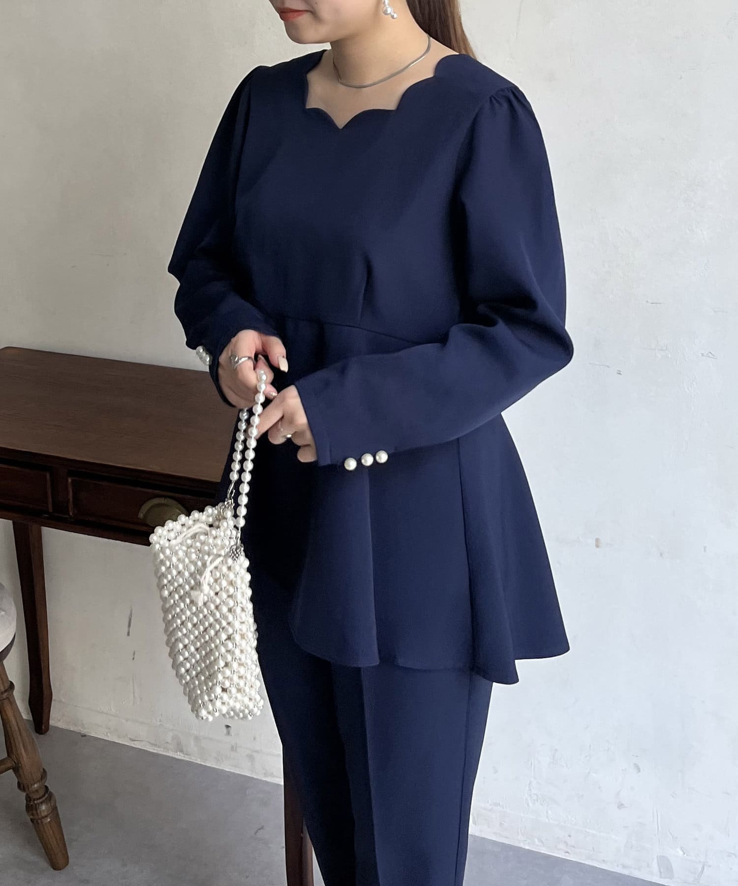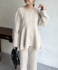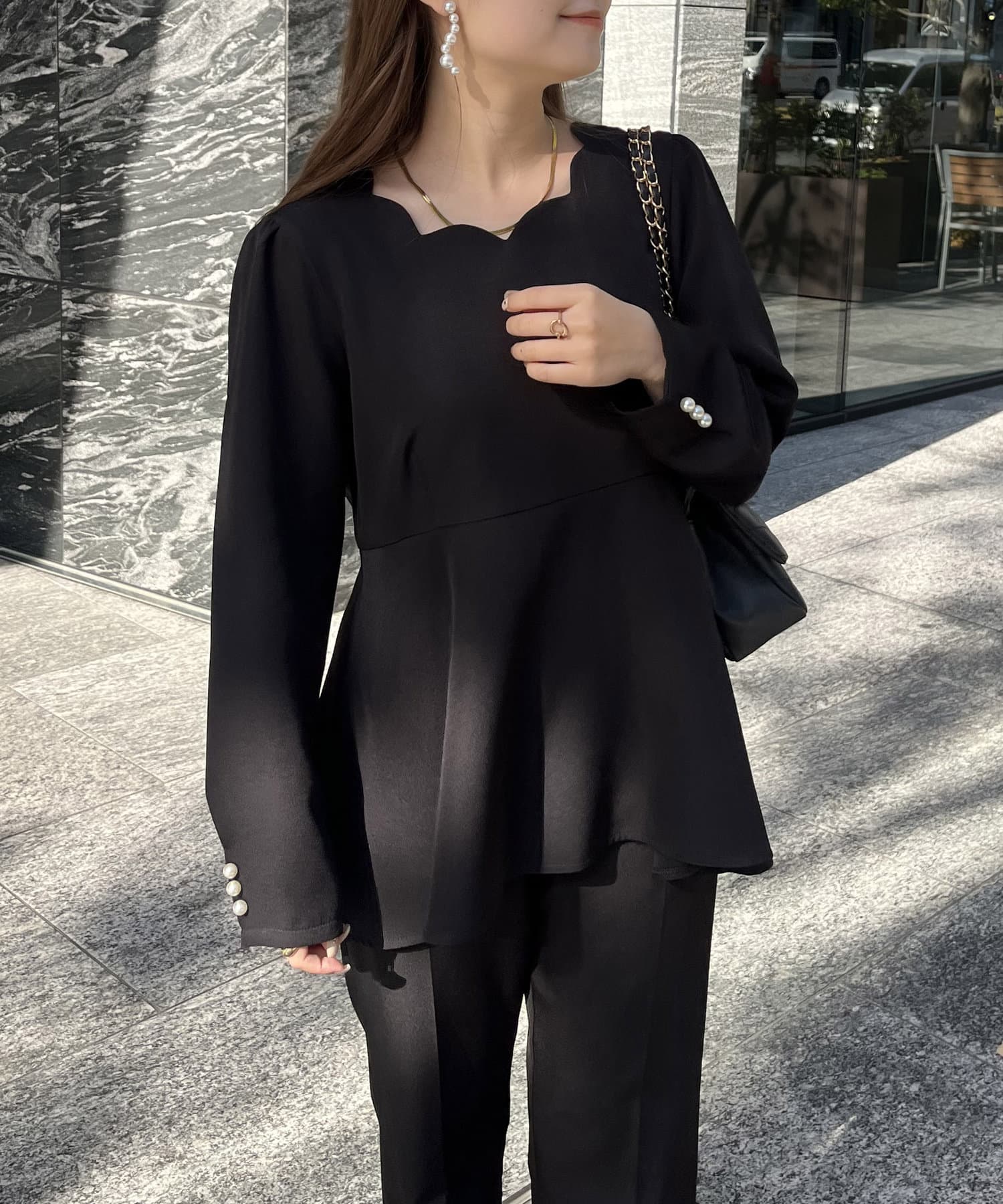 【セットアップ着用可能】袖パールスカラップネックペプラムブラウス
