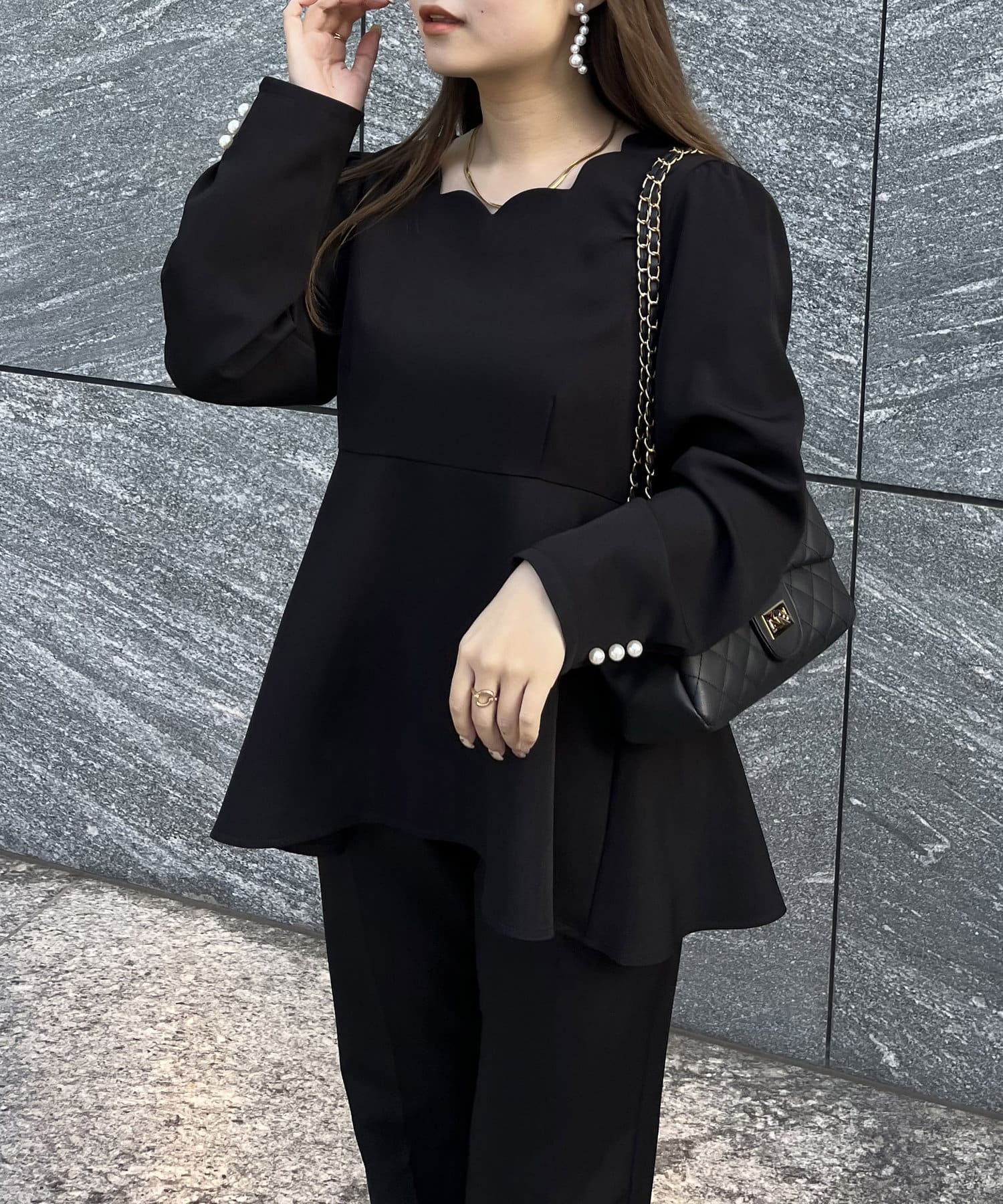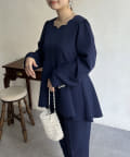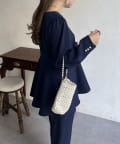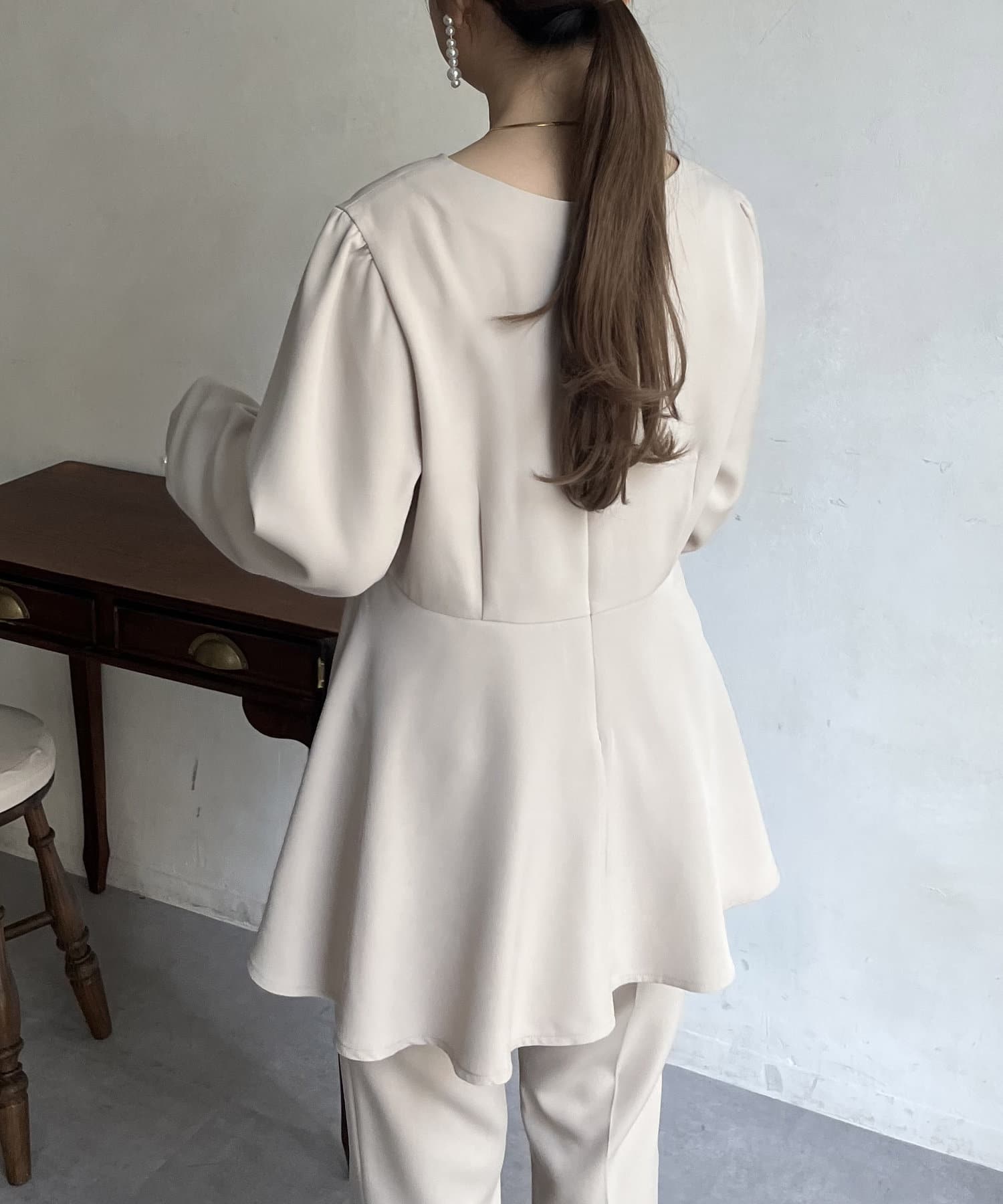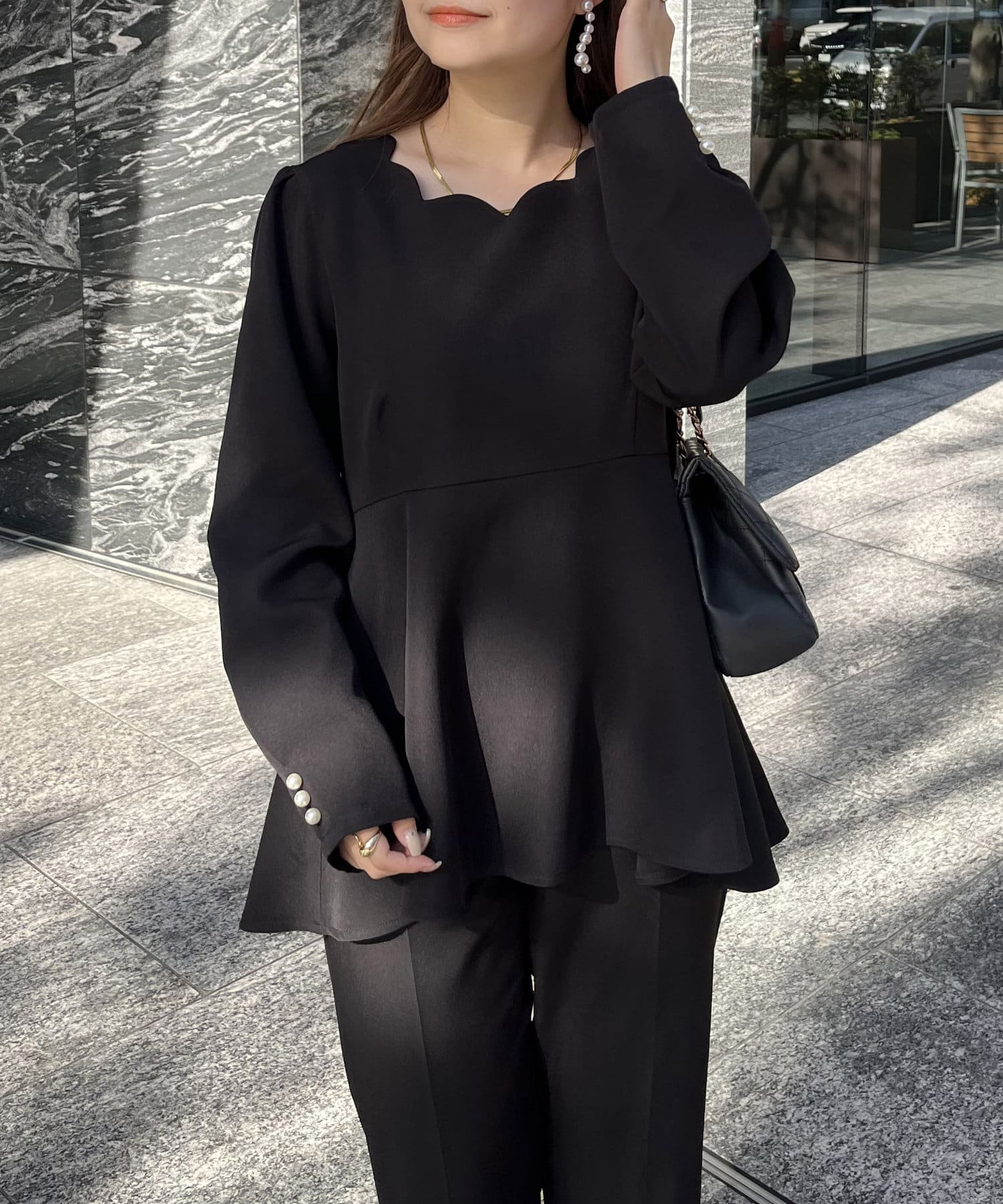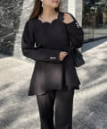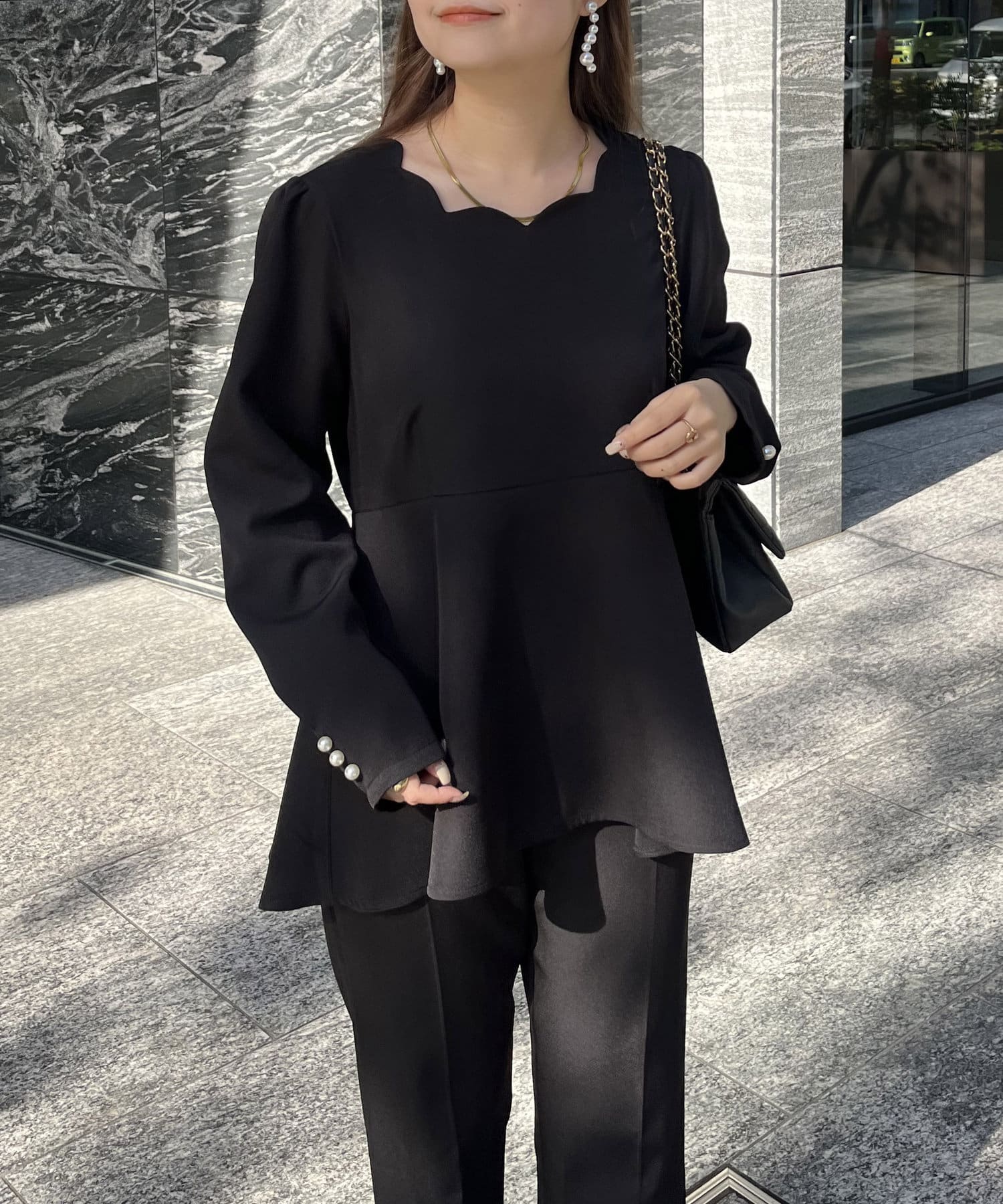 【セットアップ着用可能】袖パールスカラップネックペプラムブラウス