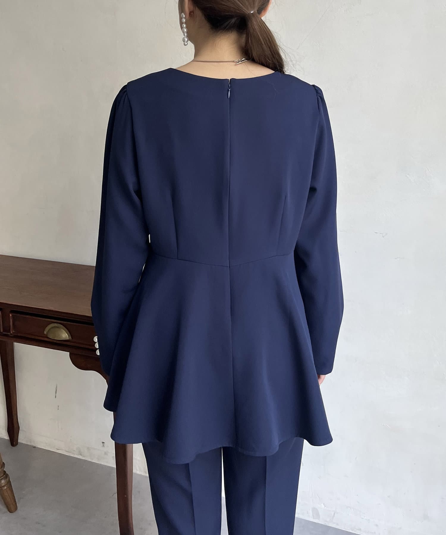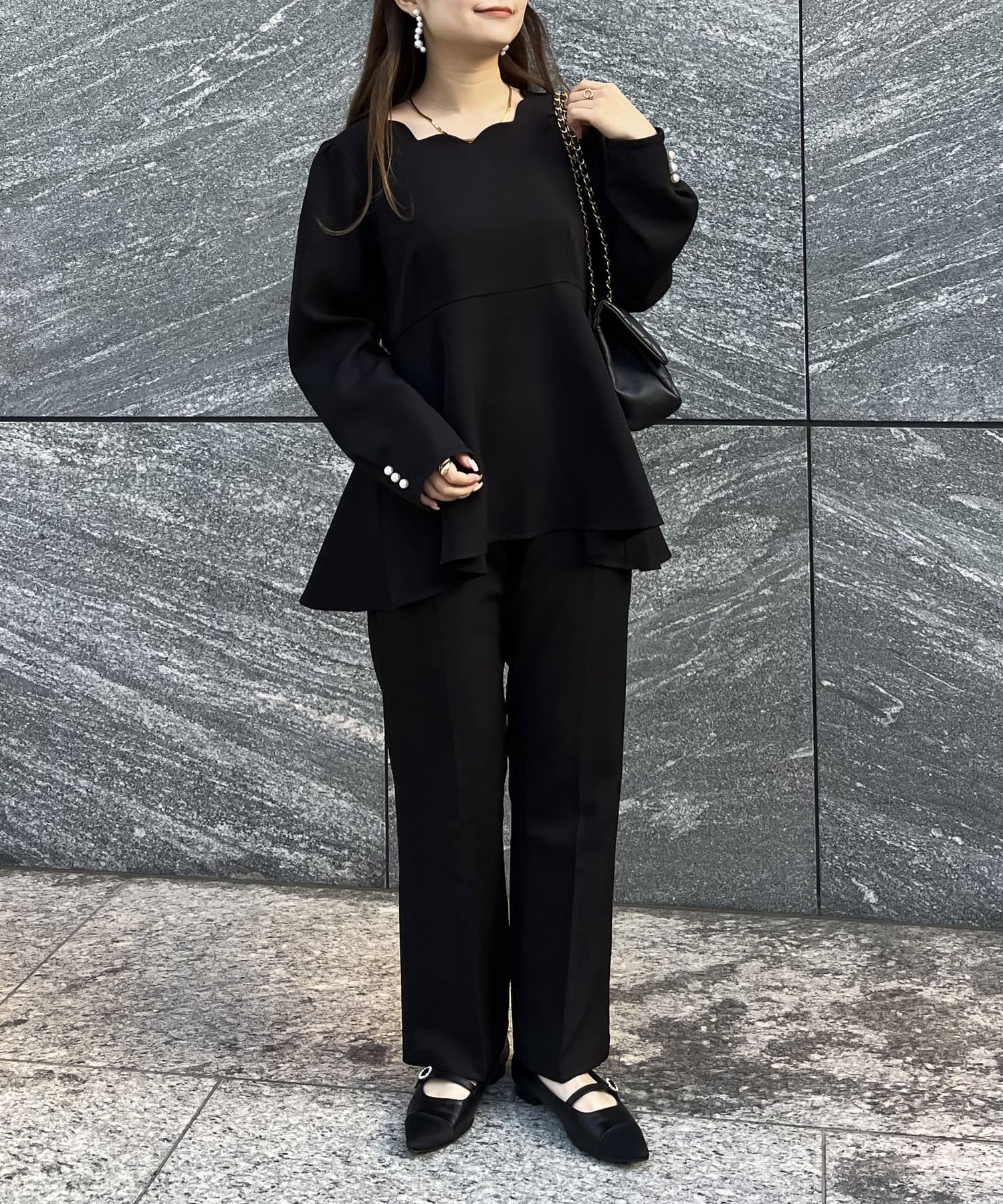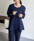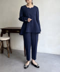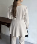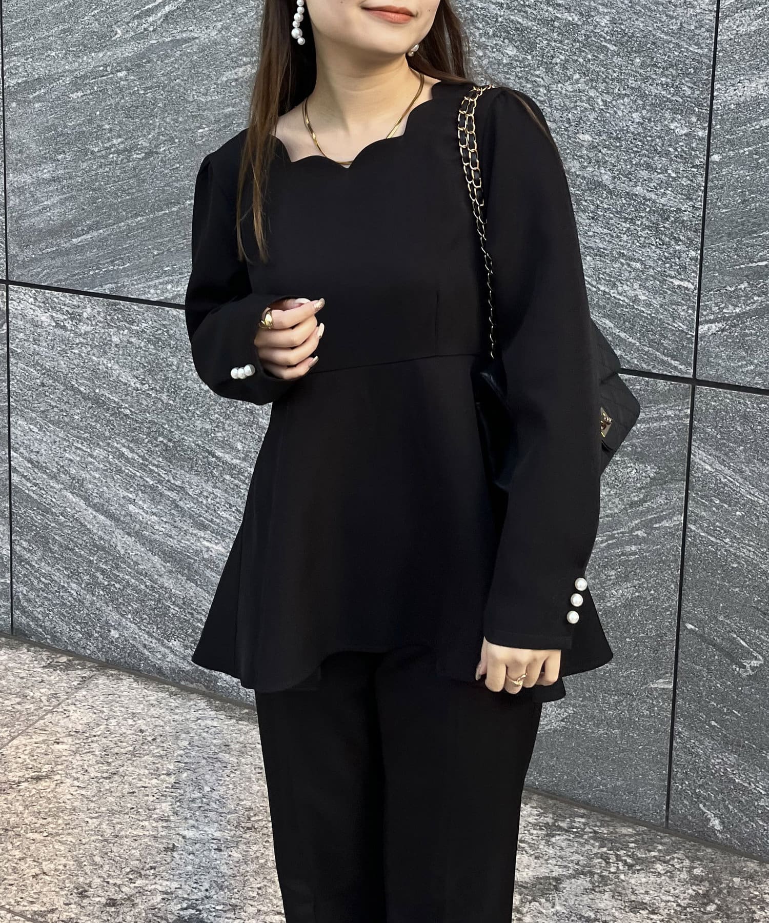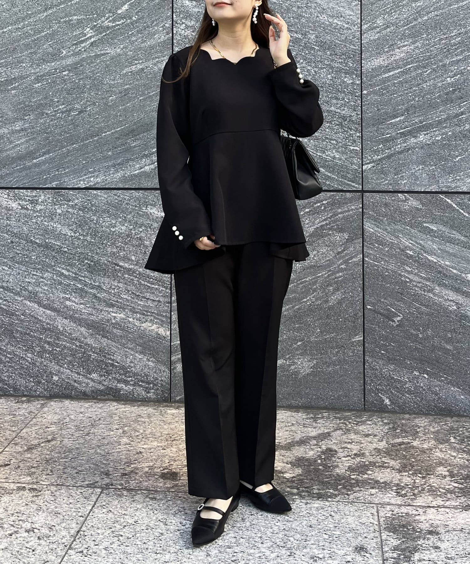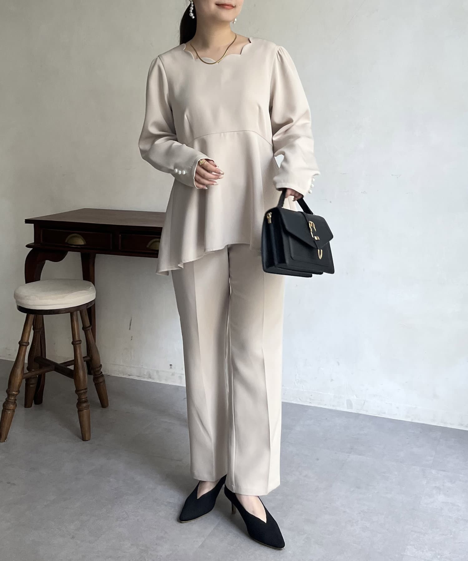 【セットアップ着用可能】袖パールスカラップネックペプラムブラウス