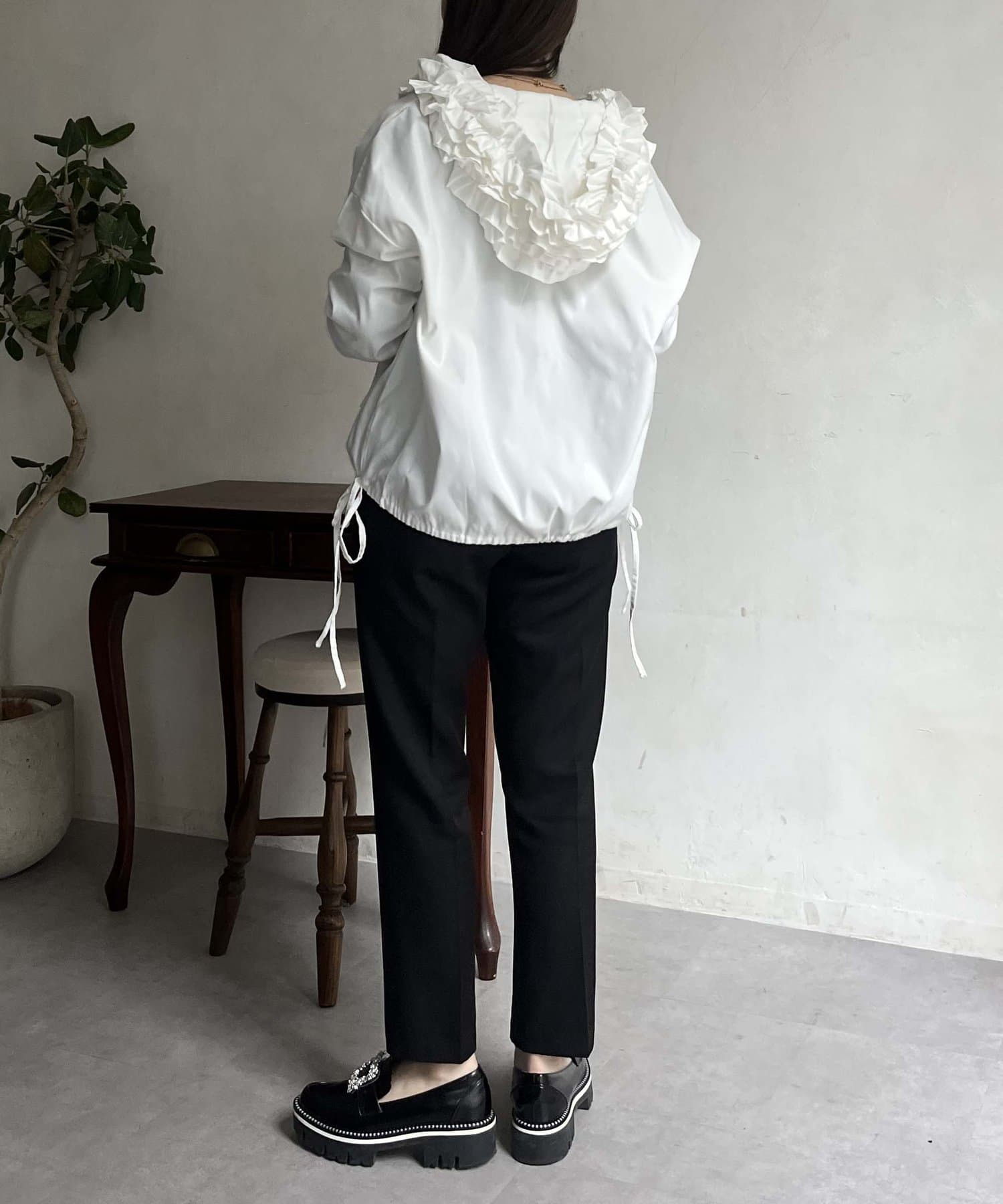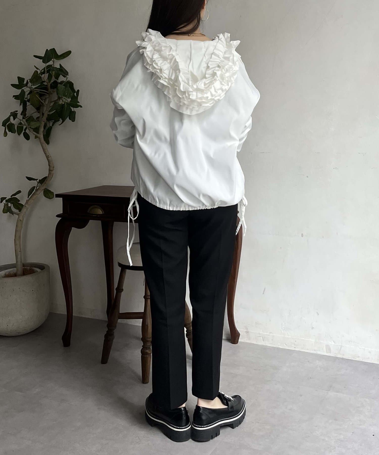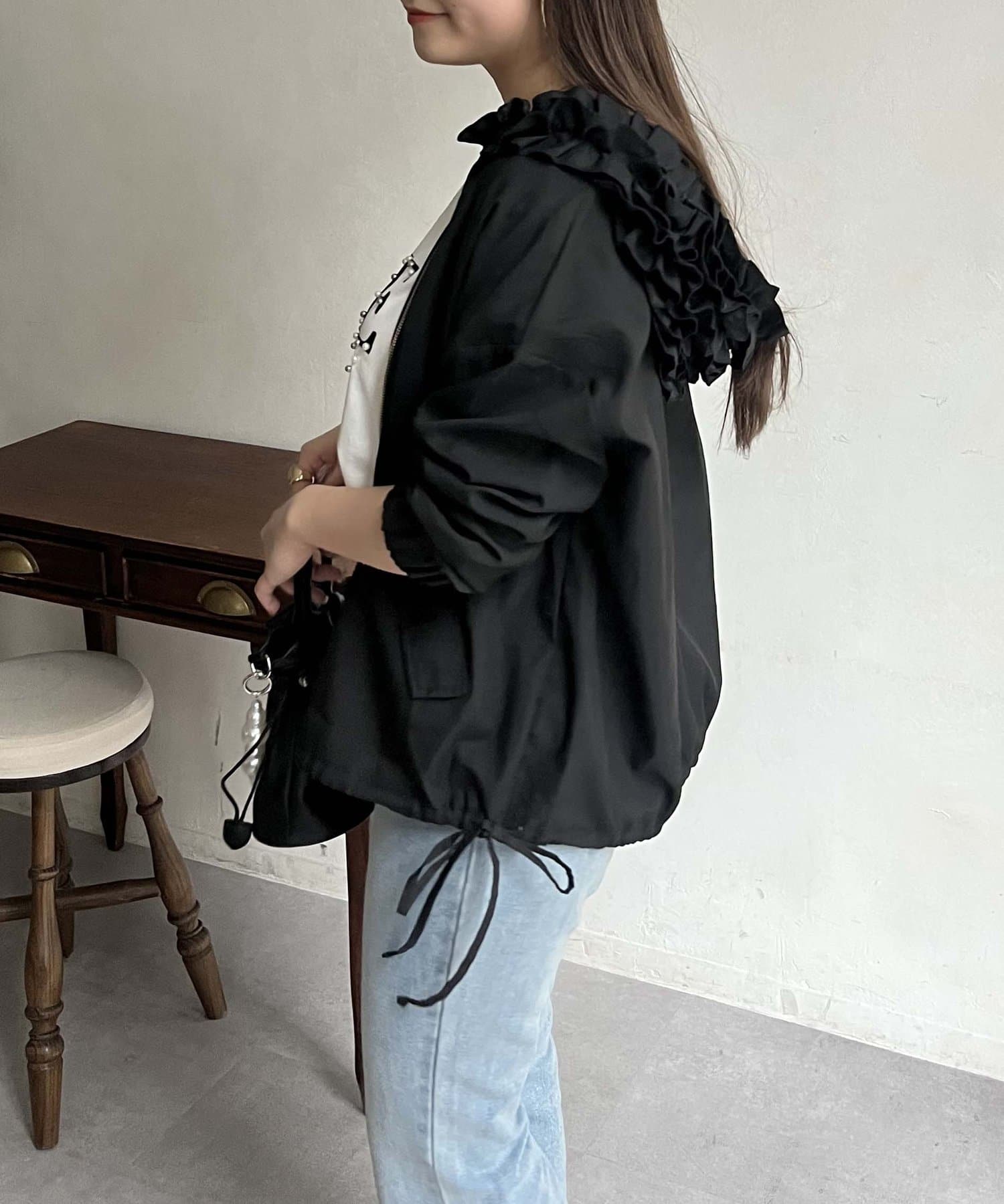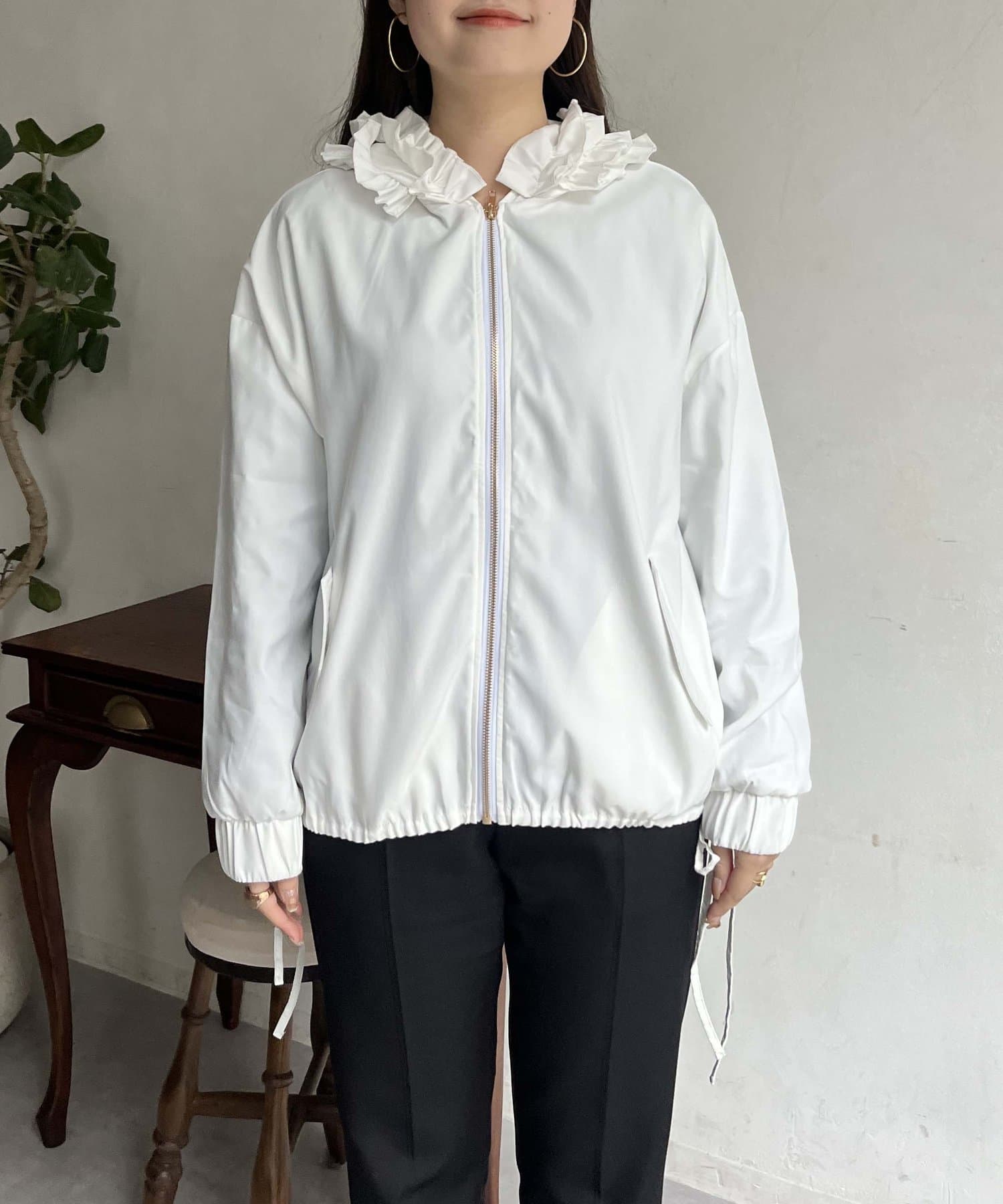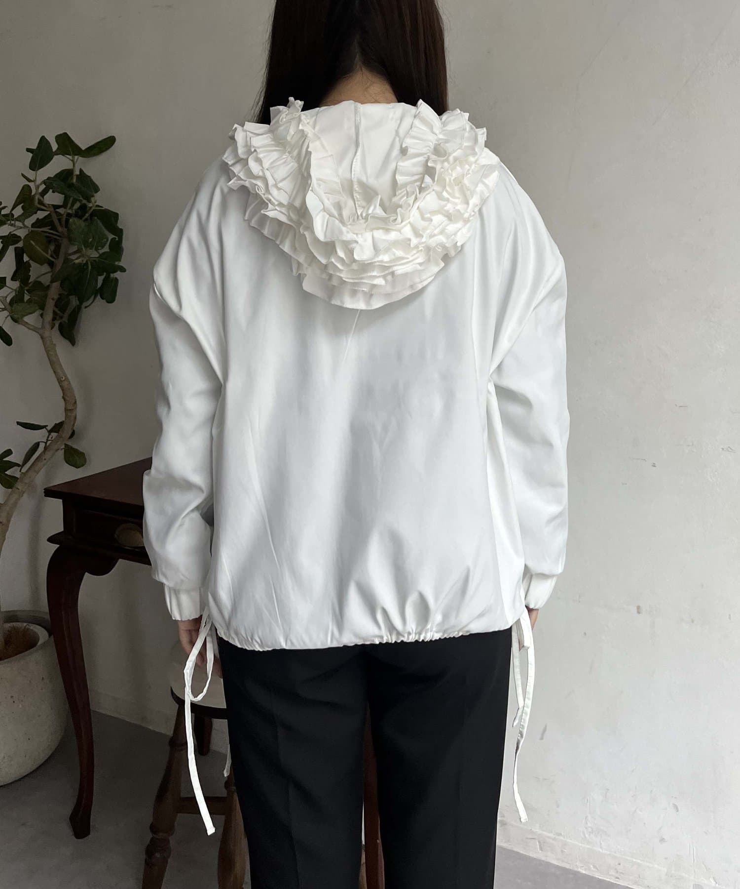 フリルフードが目を惹くパーカー