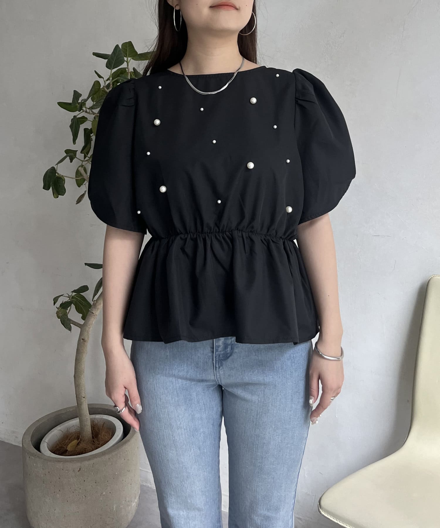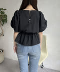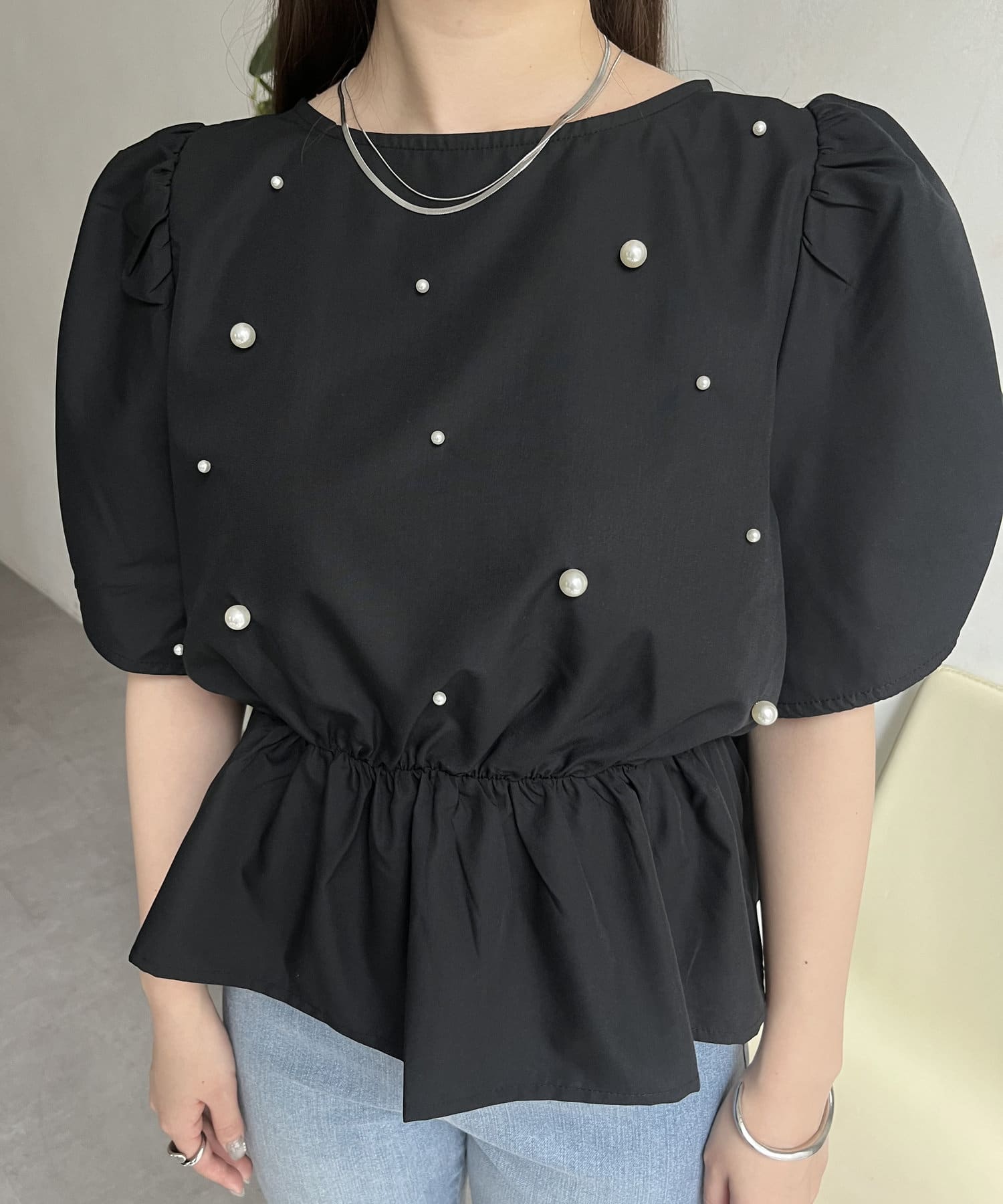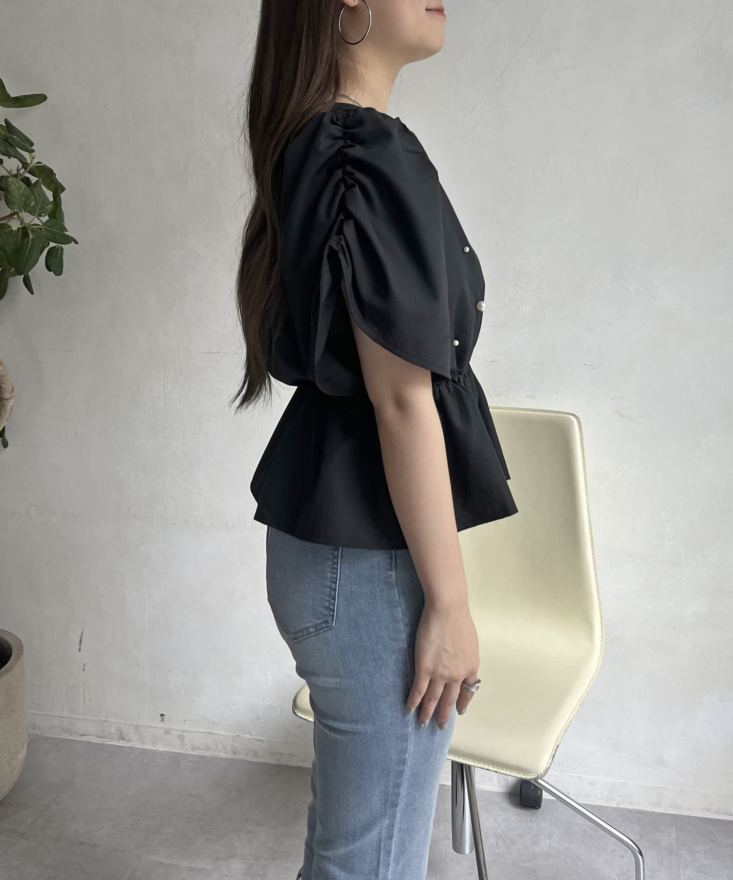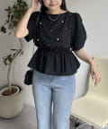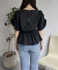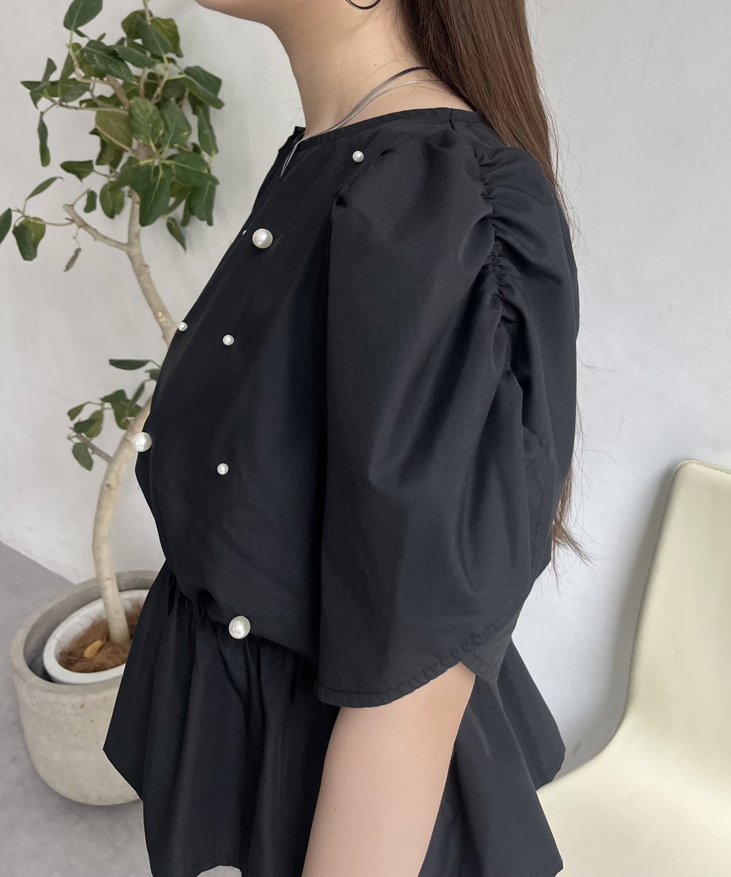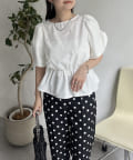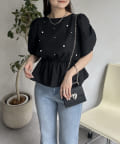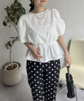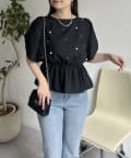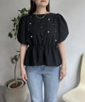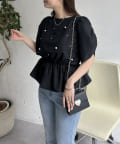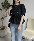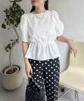 ギャザースリーブパールペプラムブラウス