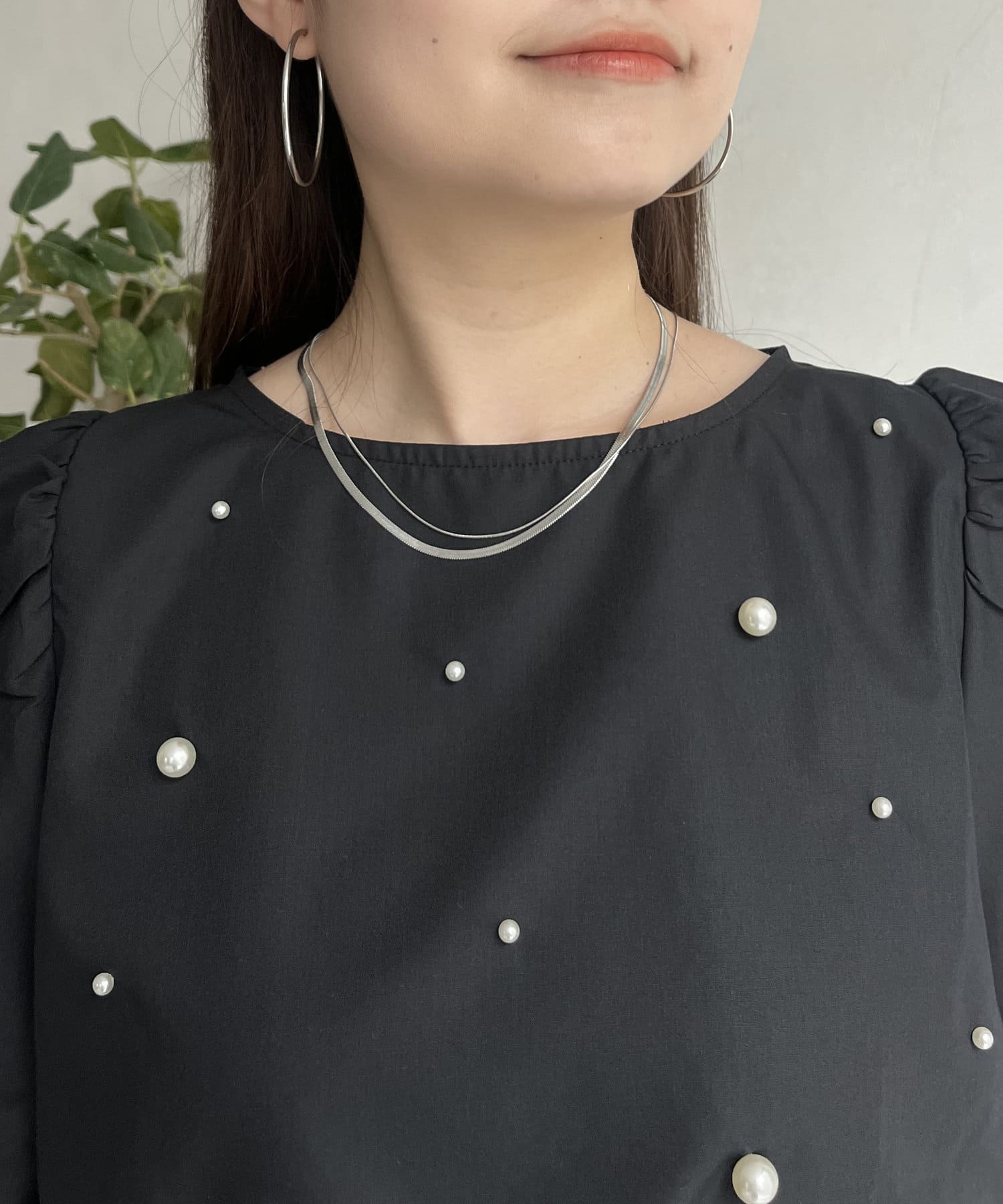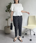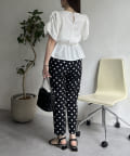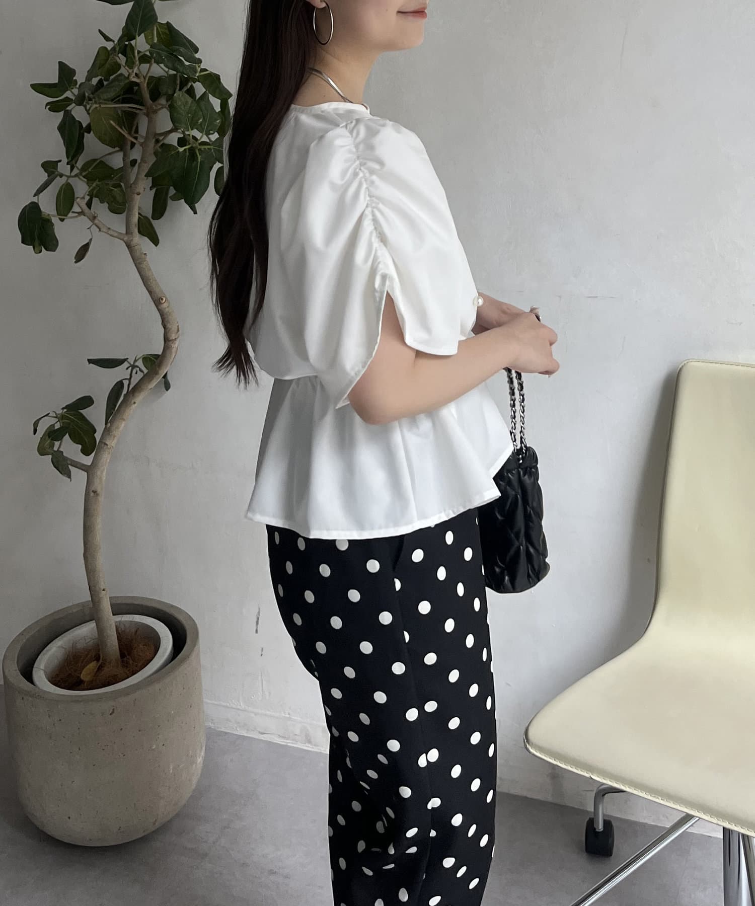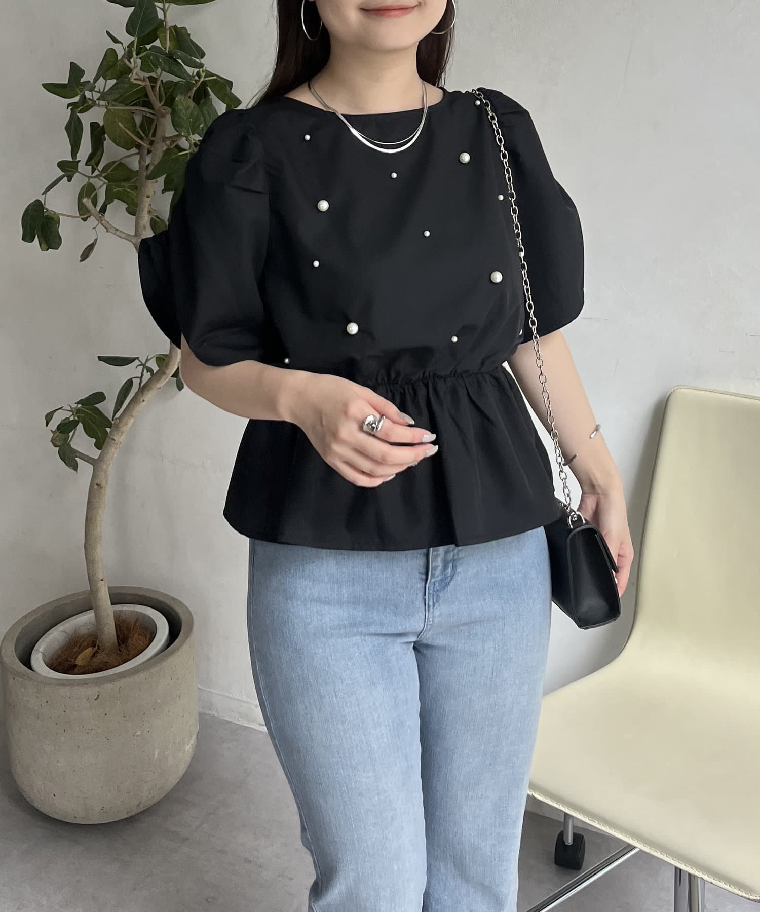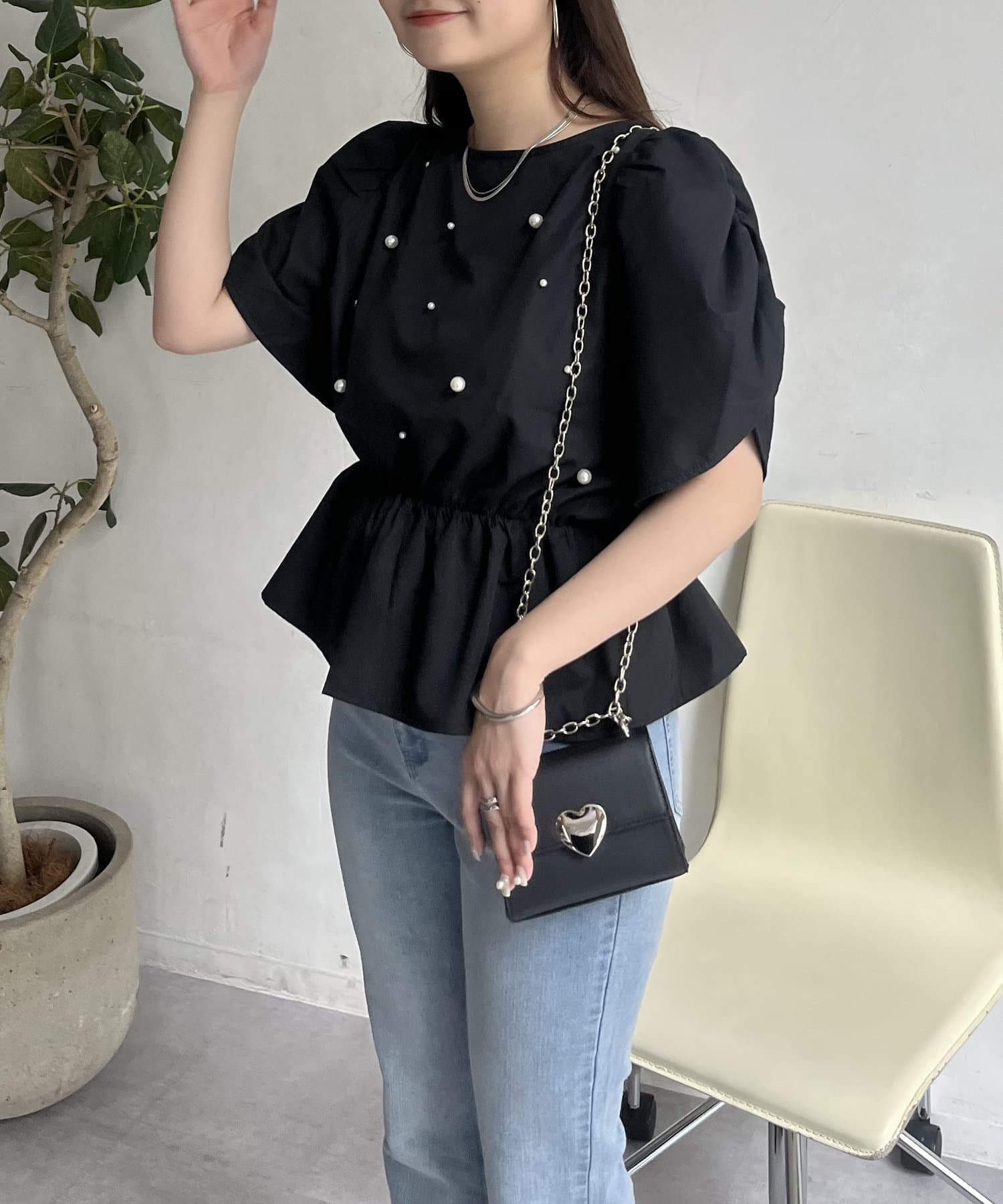 ギャザースリーブパールペプラムブラウス