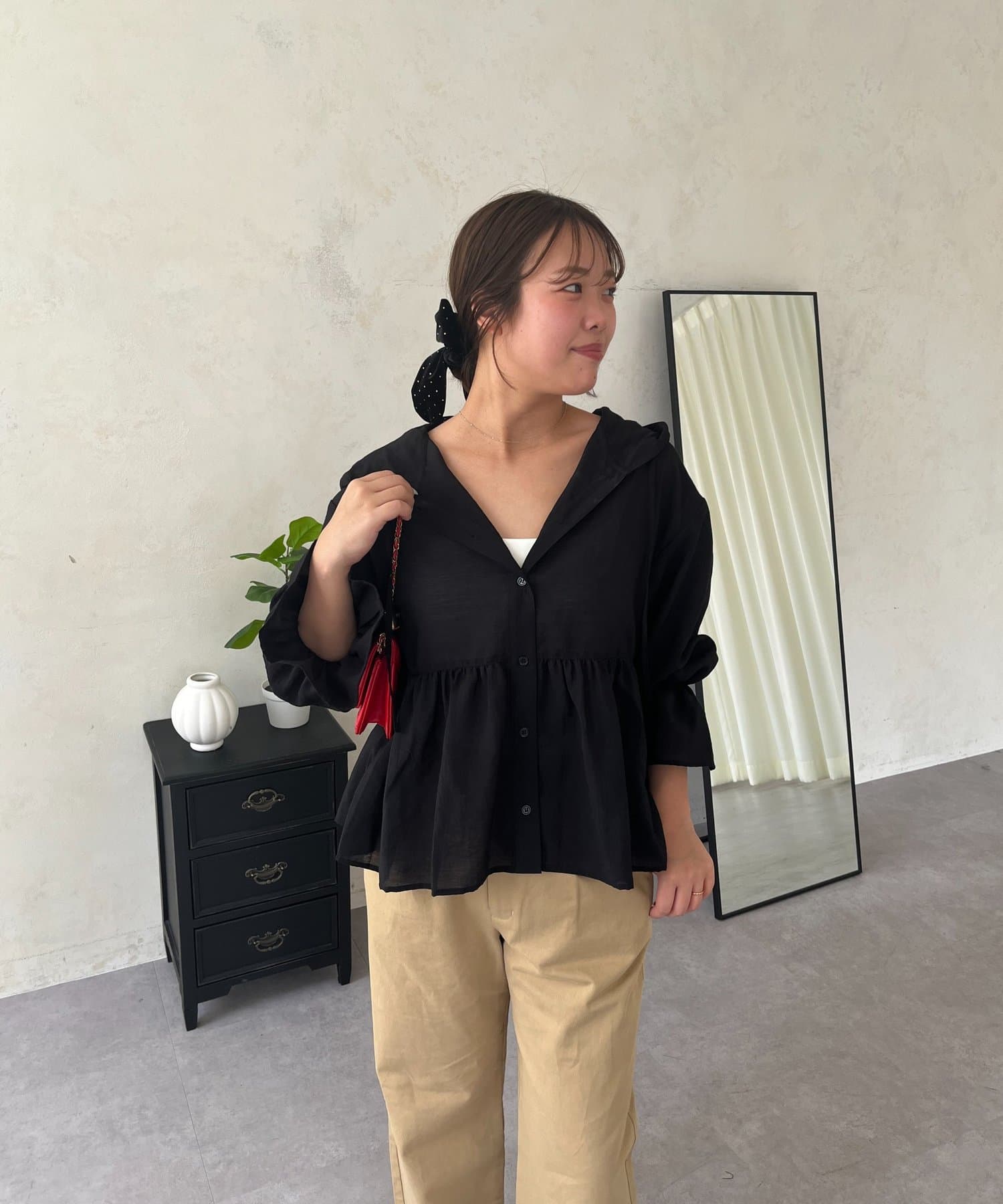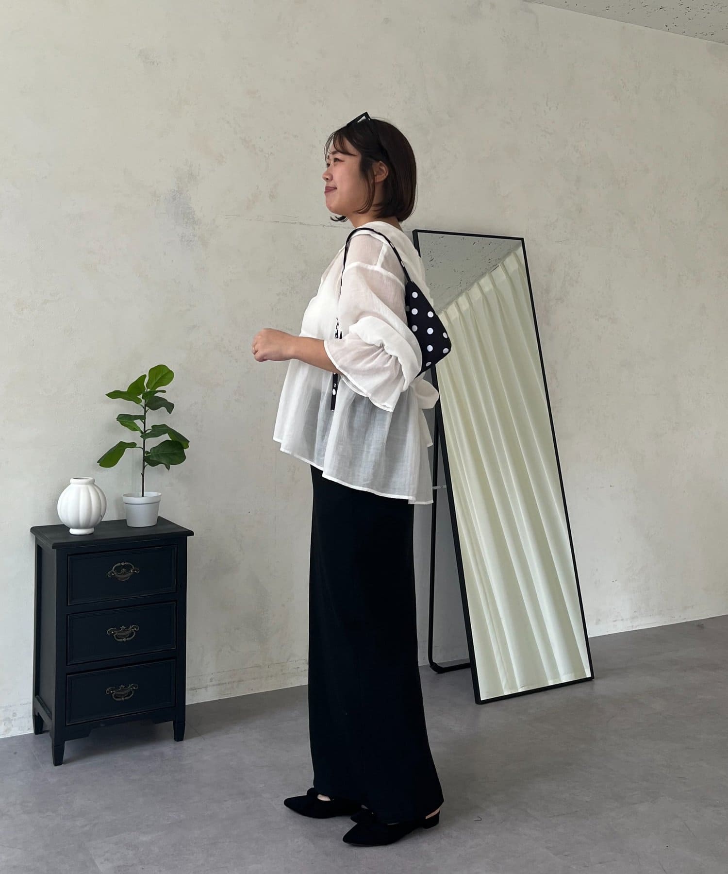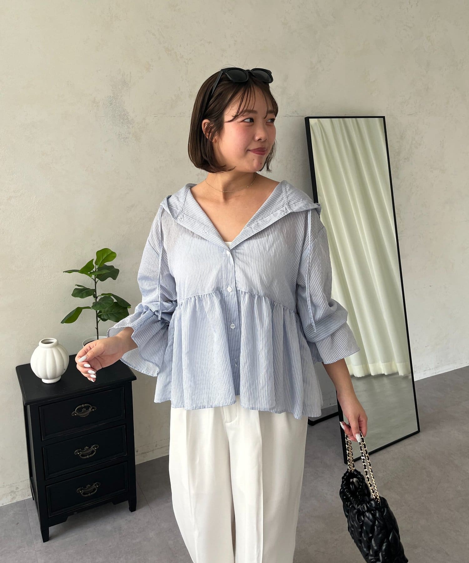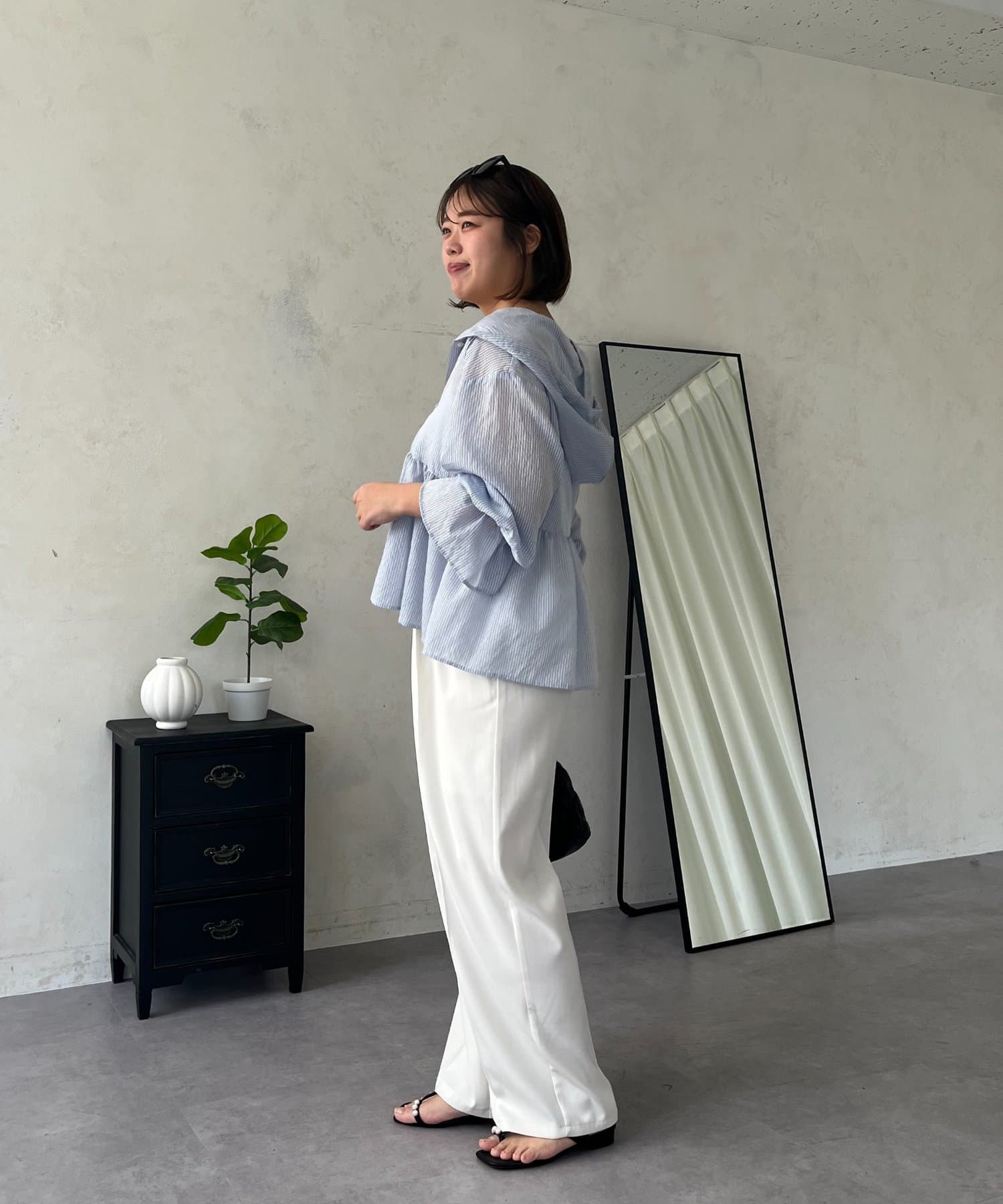 ●夏もさらっと羽織りとして使えるシアーシャツ
