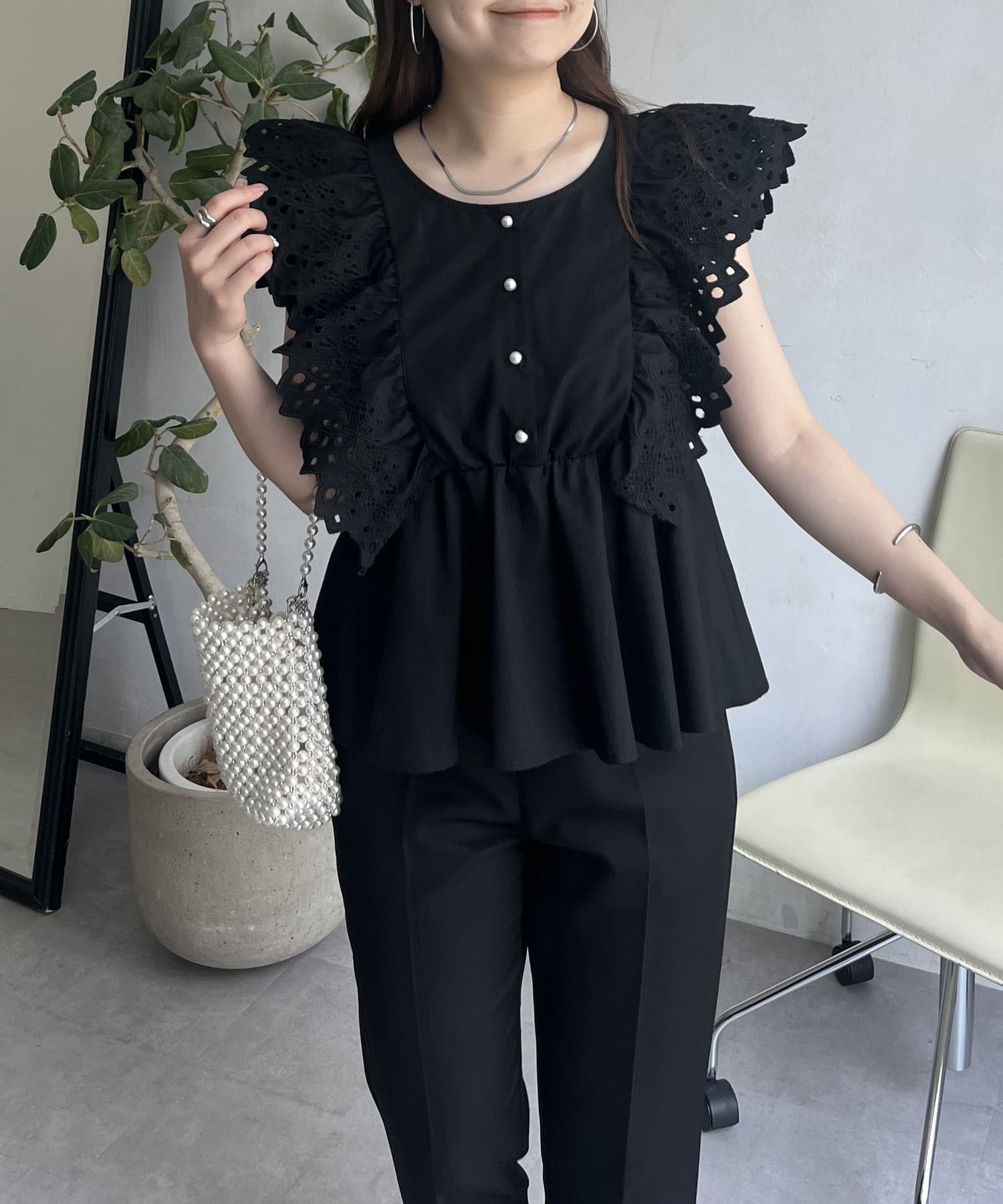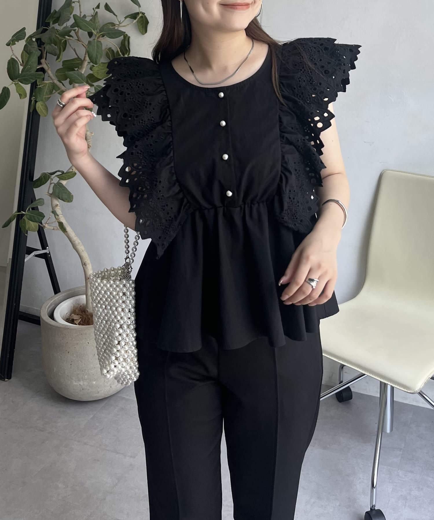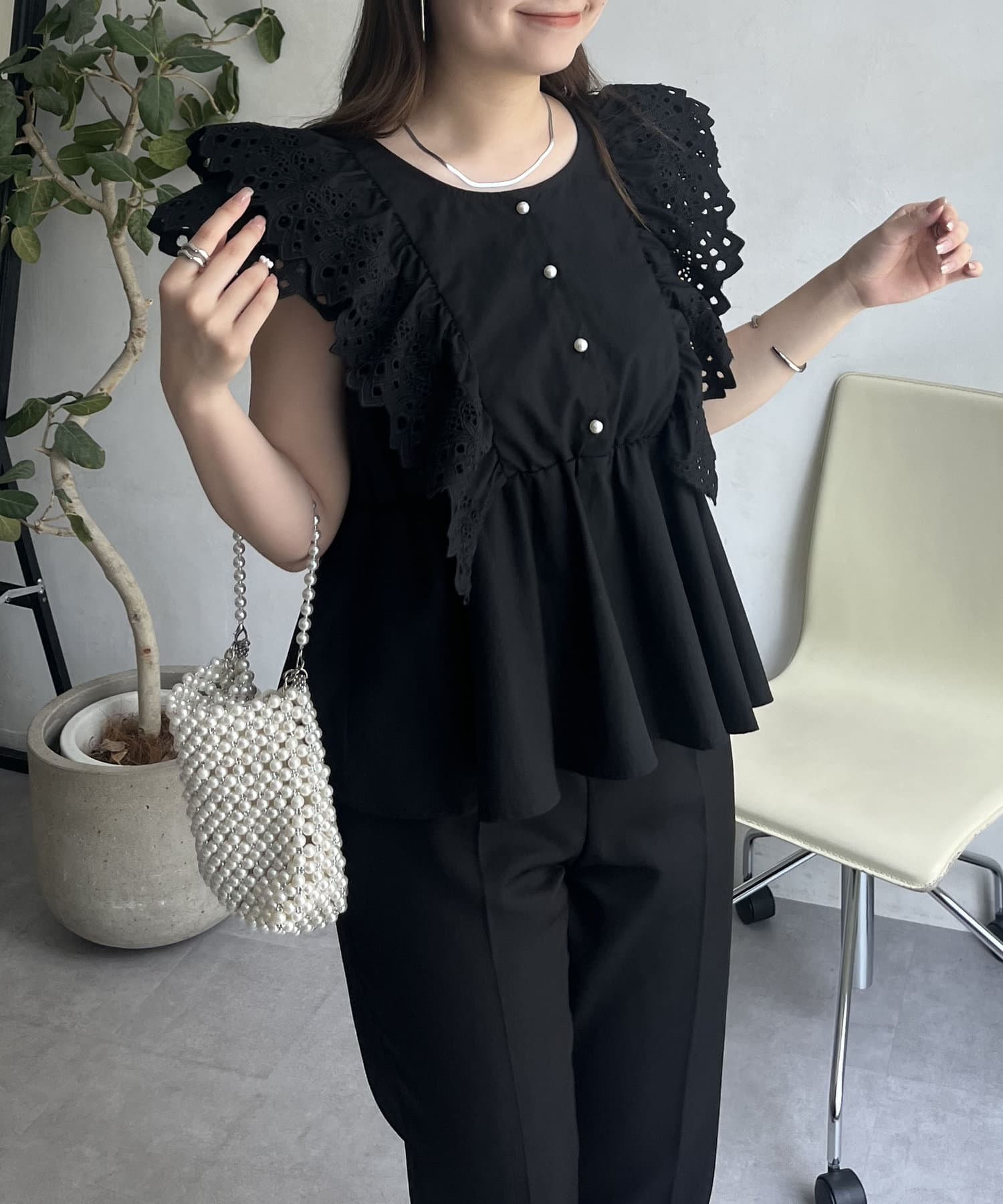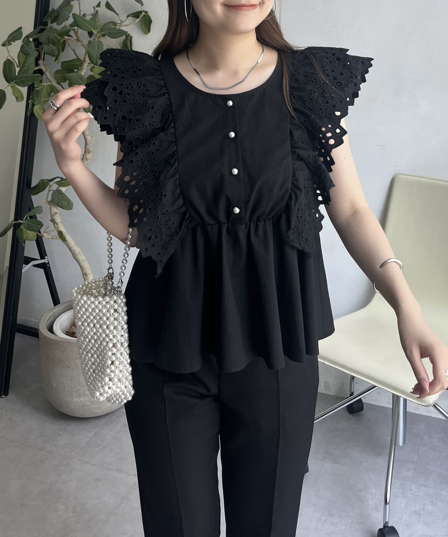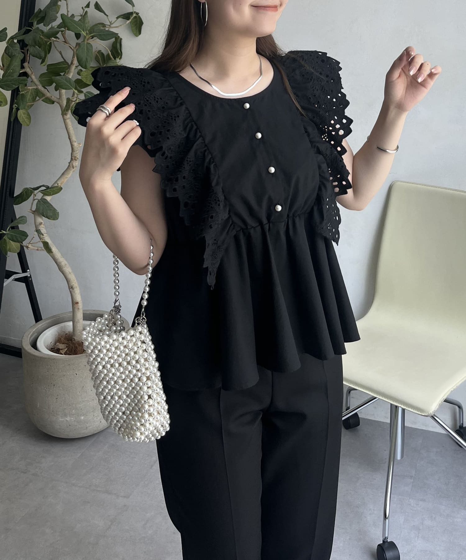 • prose verse(プロズヴェール) フリルレースパールボタンペプラムブラウス