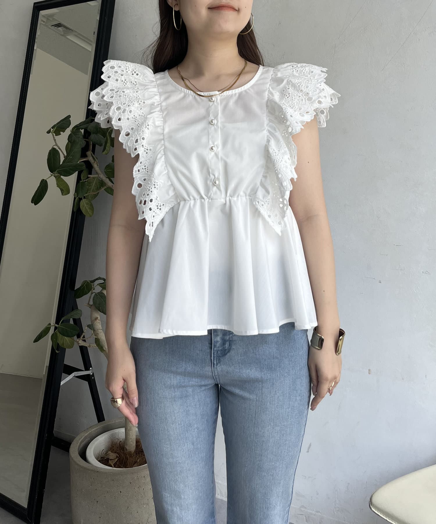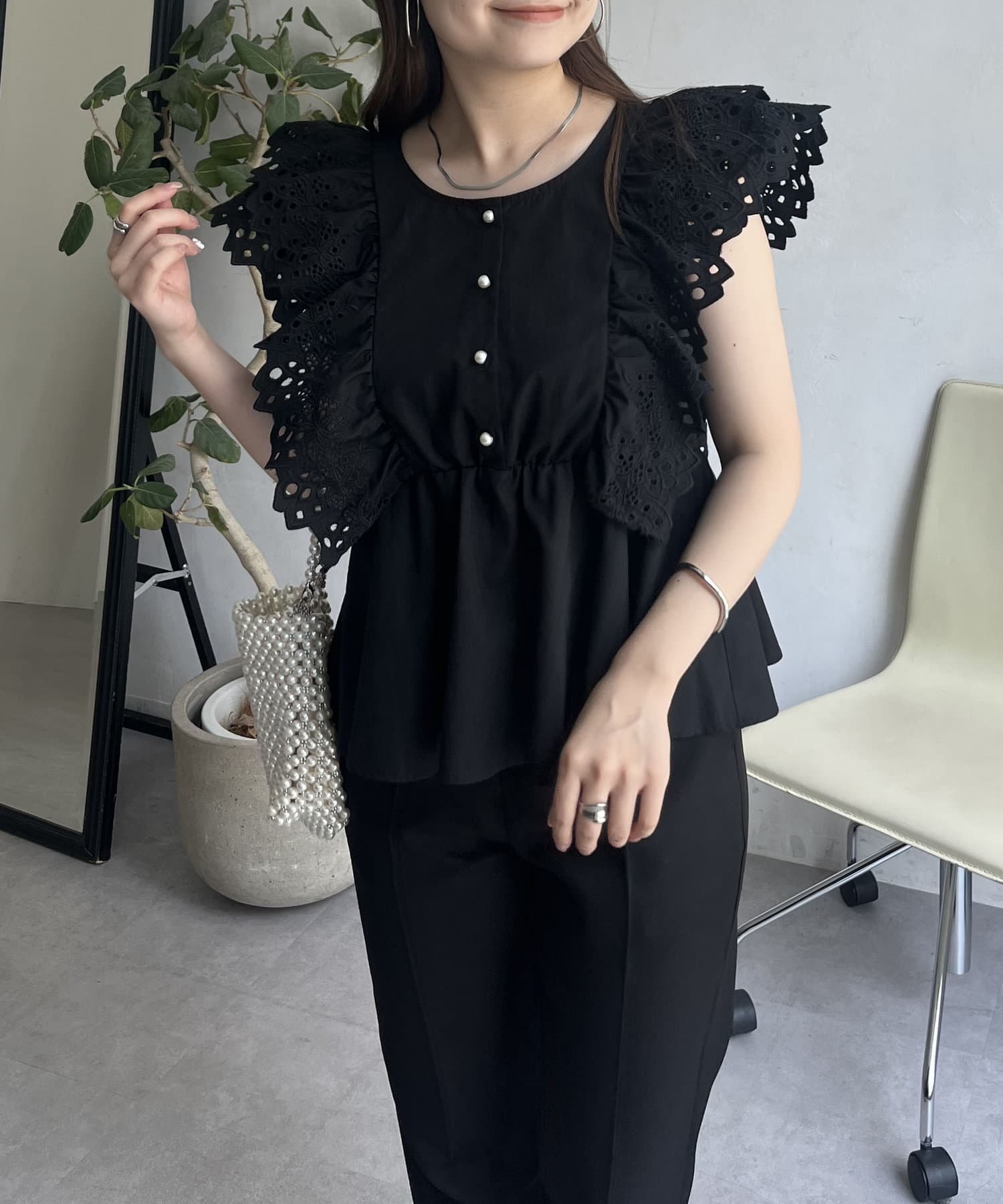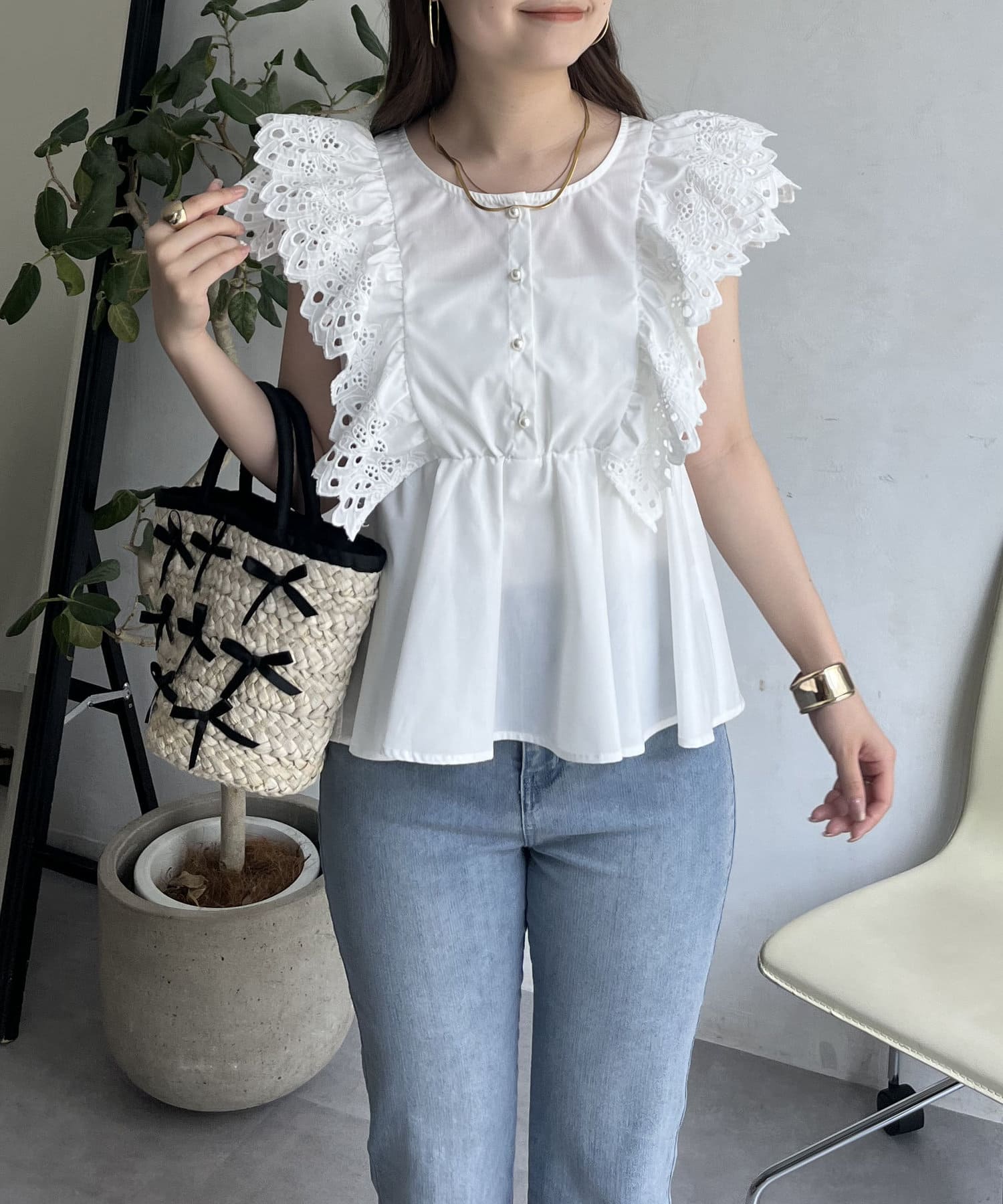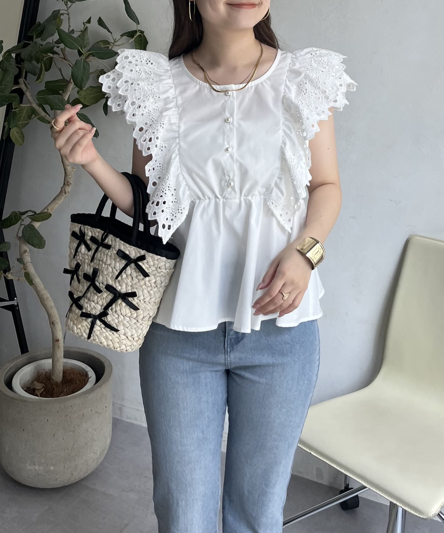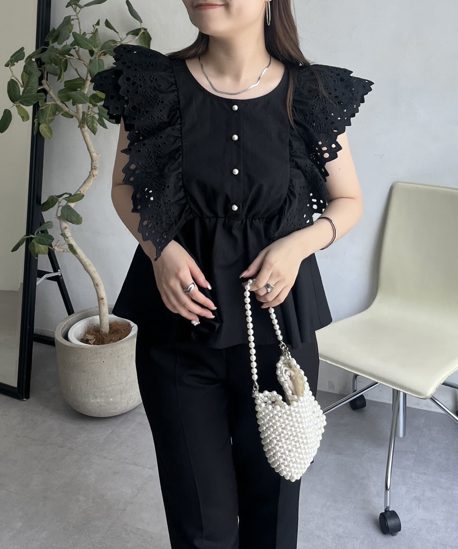 • prose verse(プロズヴェール) フリルレースパールボタンペプラムブラウス
