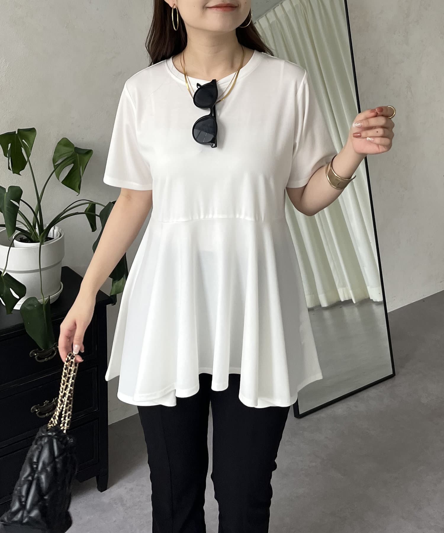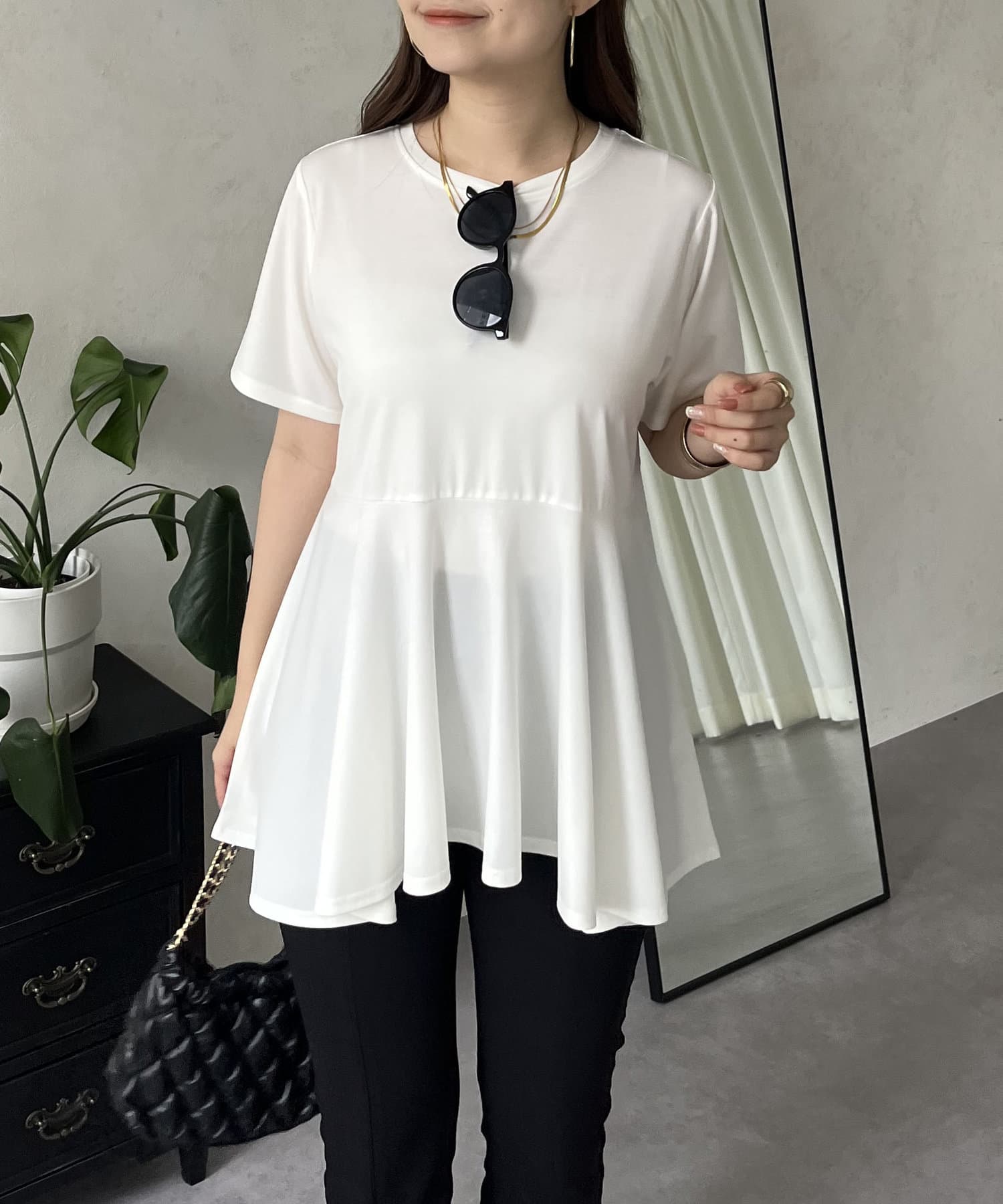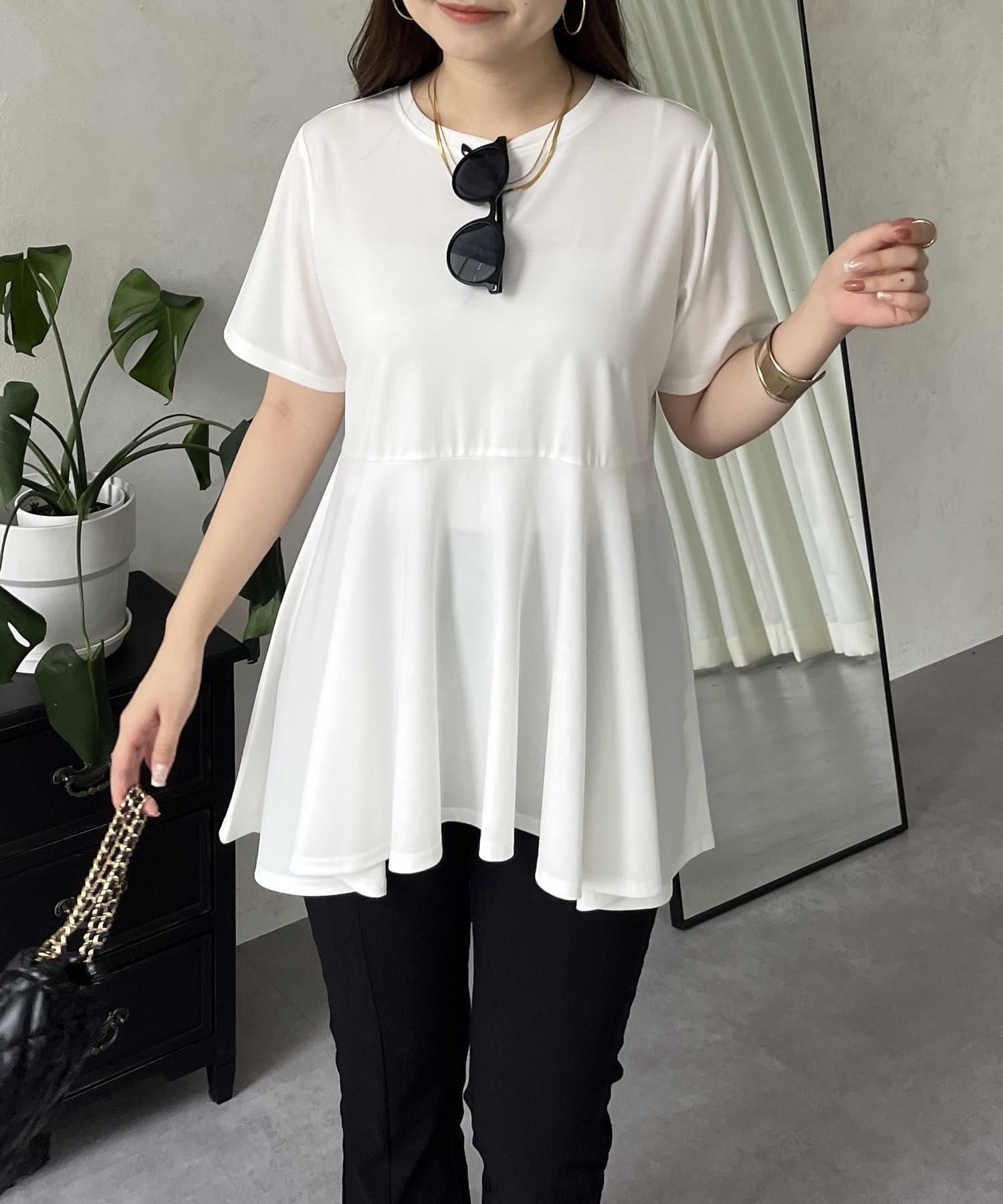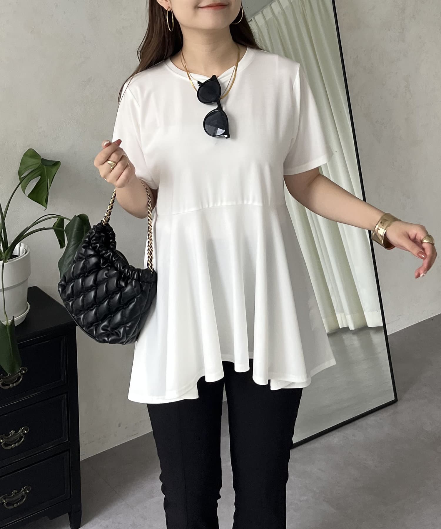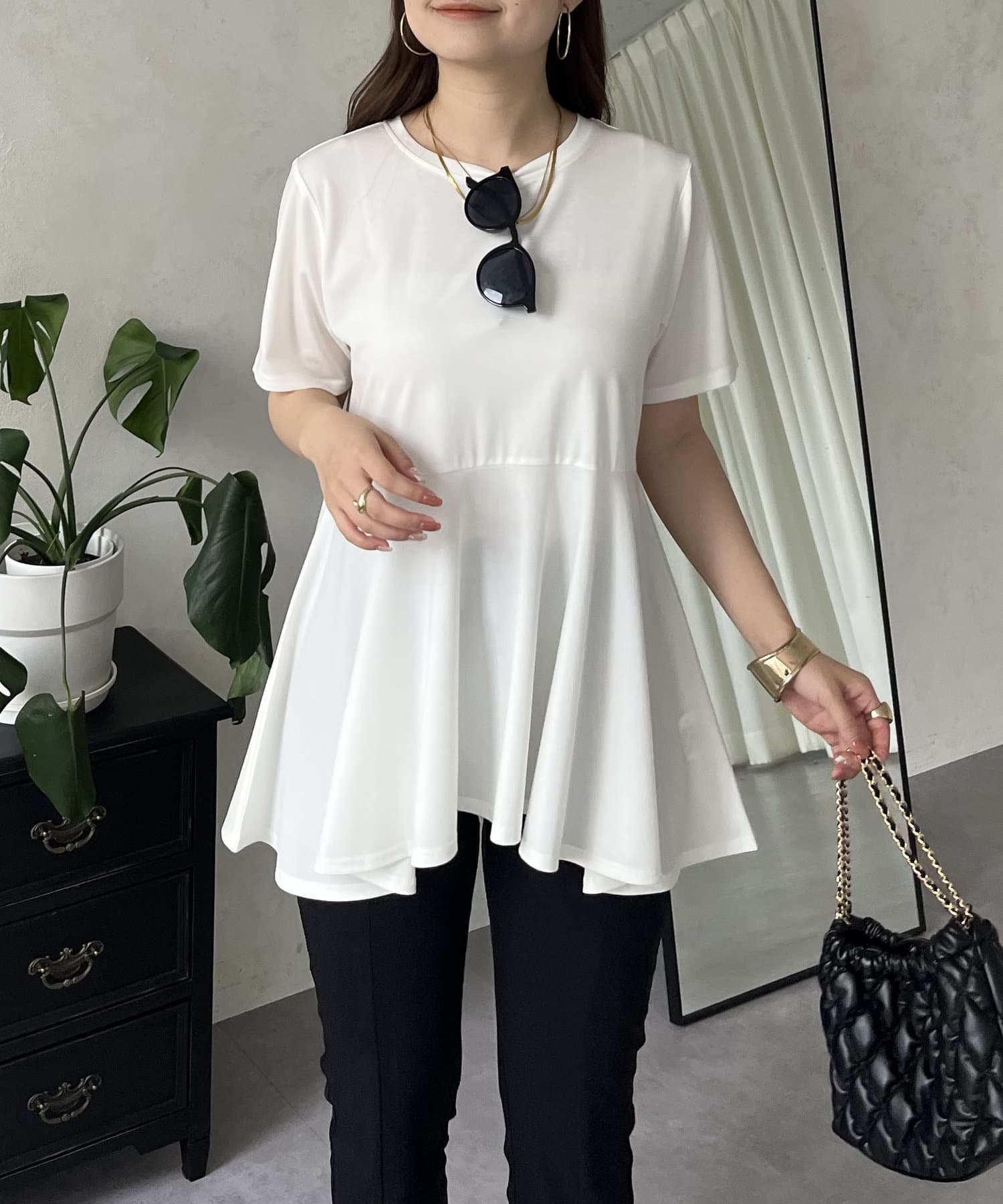 カジュアルとフェミニンをミックスさせたペプラムTシャツ