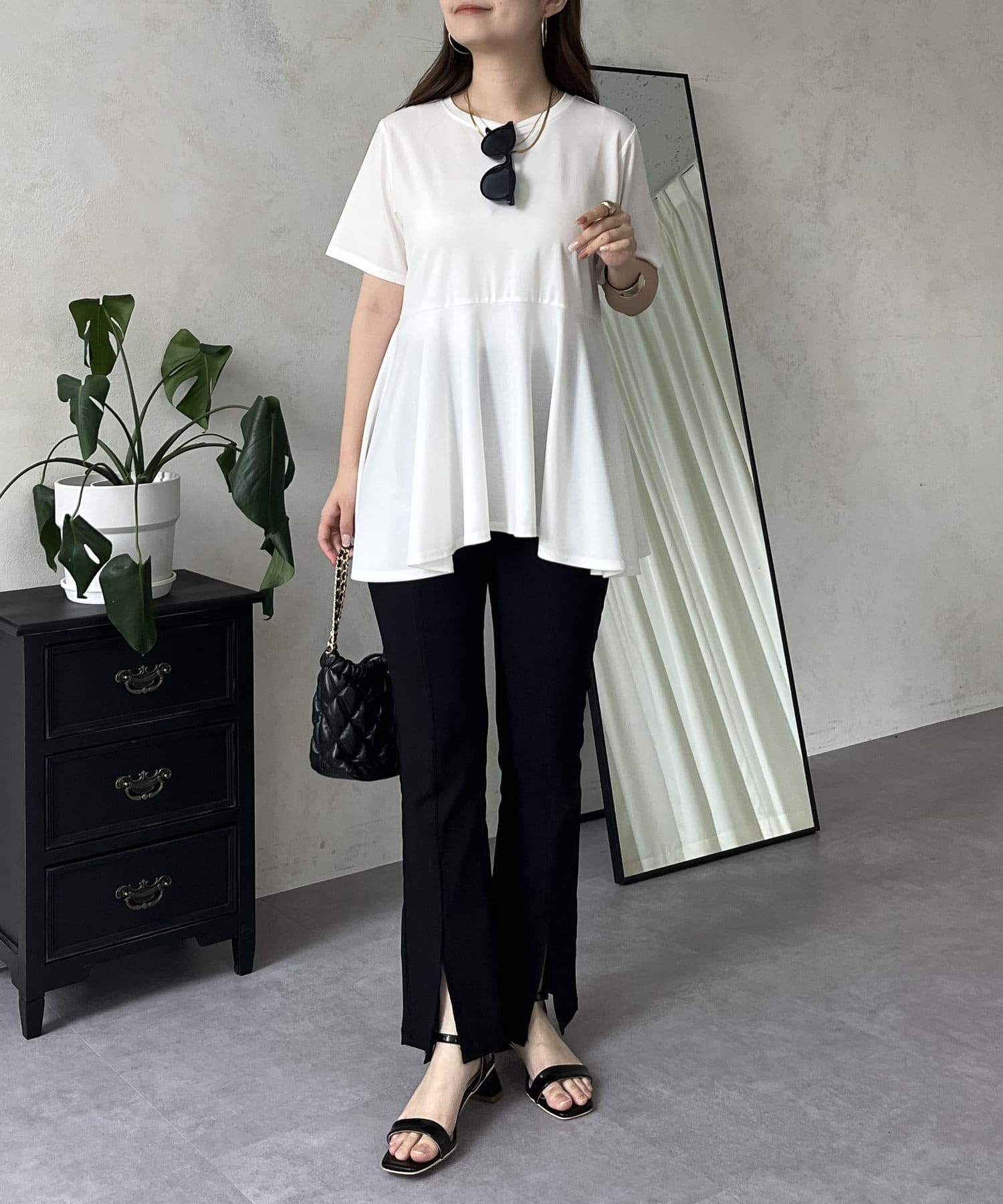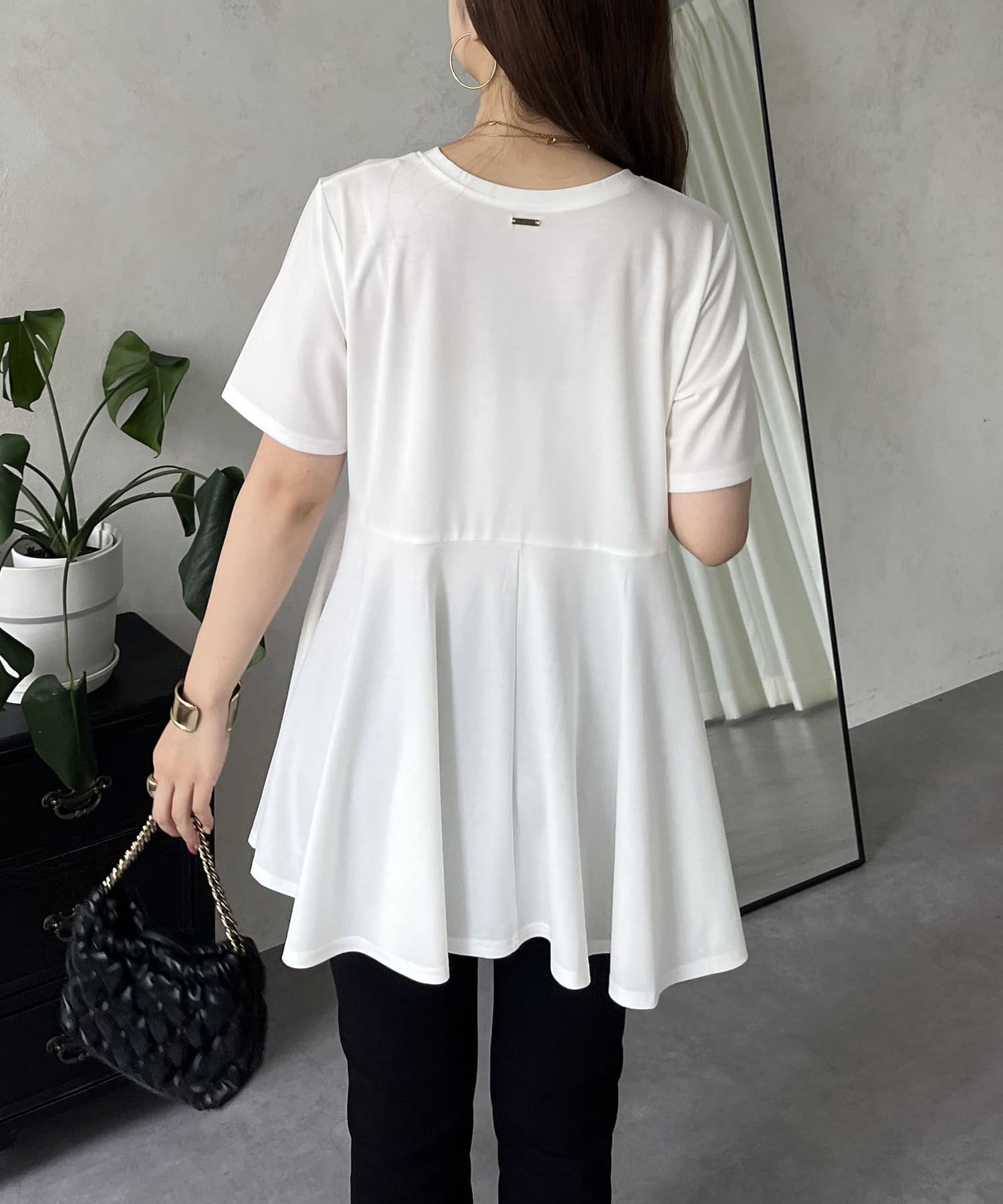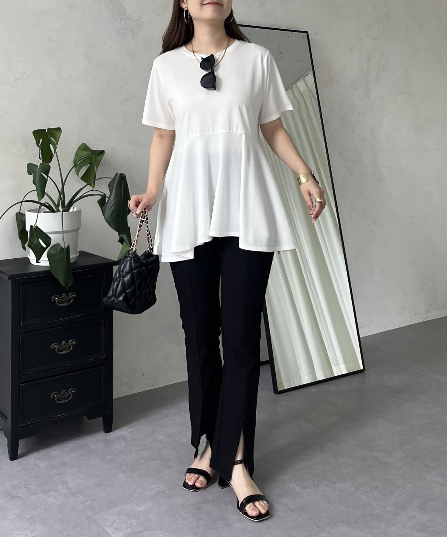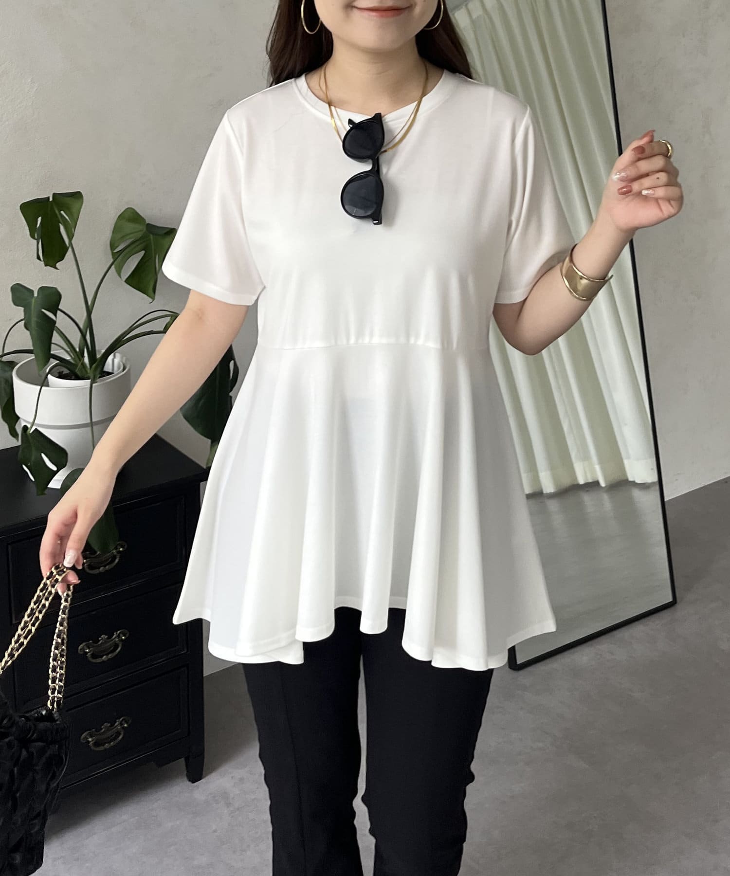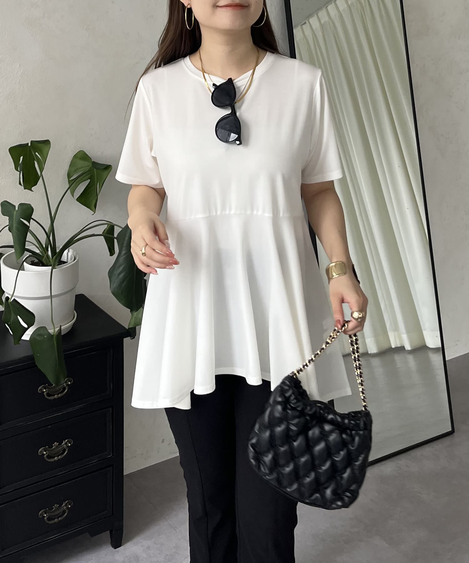 カジュアルとフェミニンをミックスさせたペプラムTシャツ